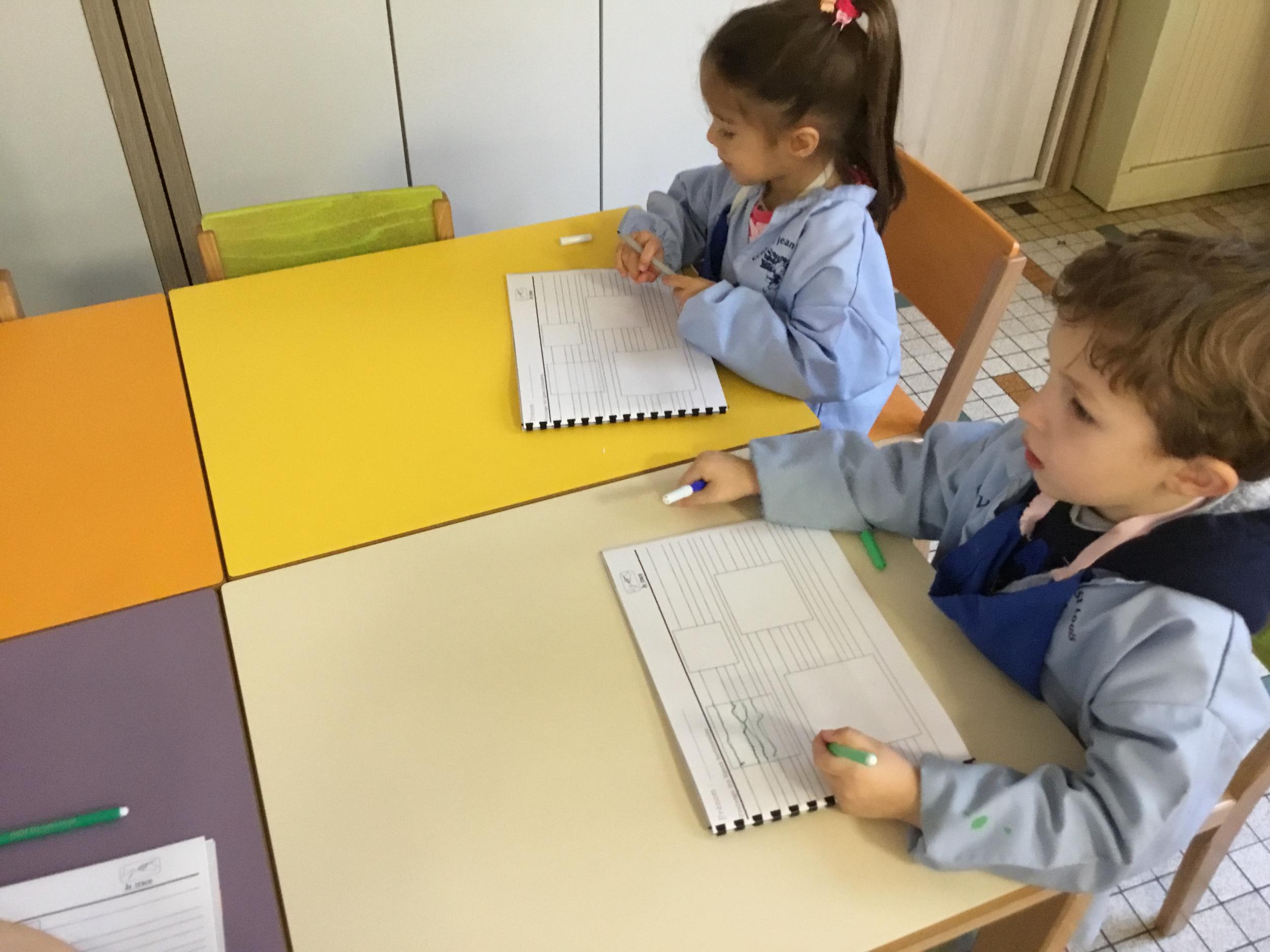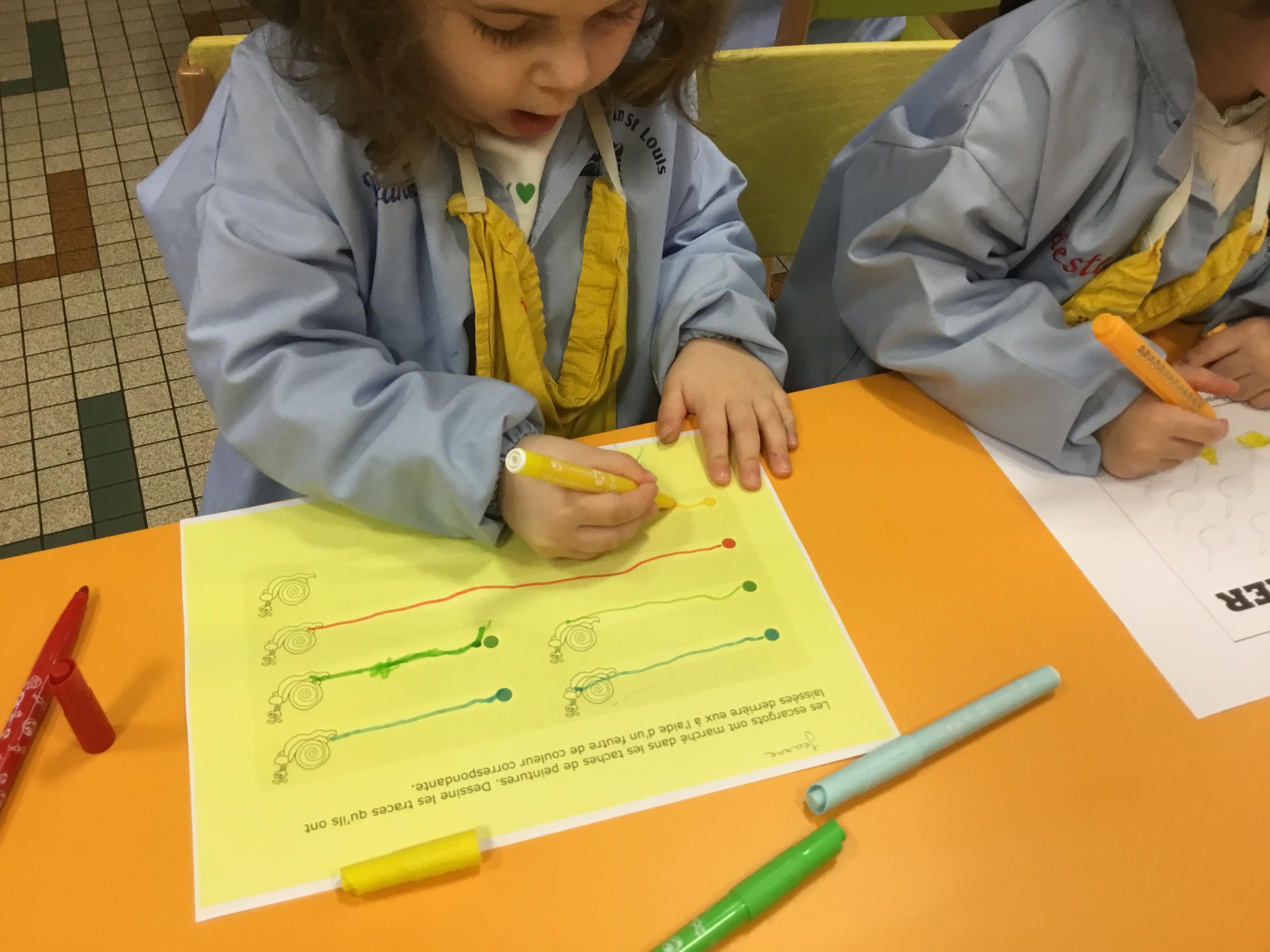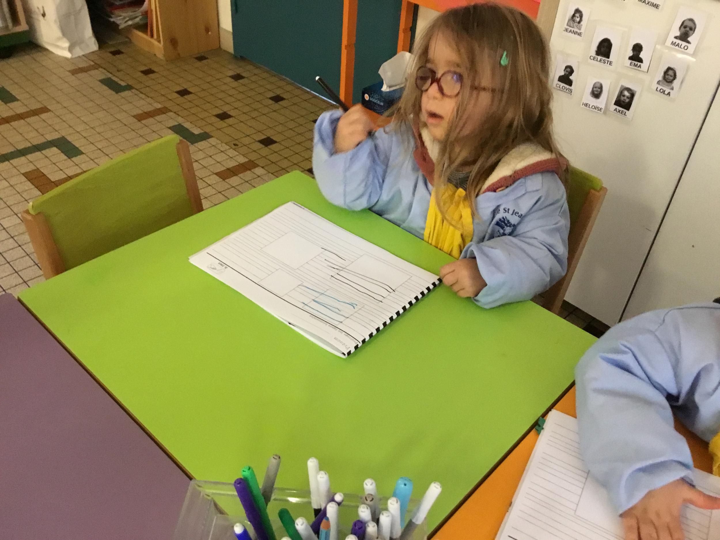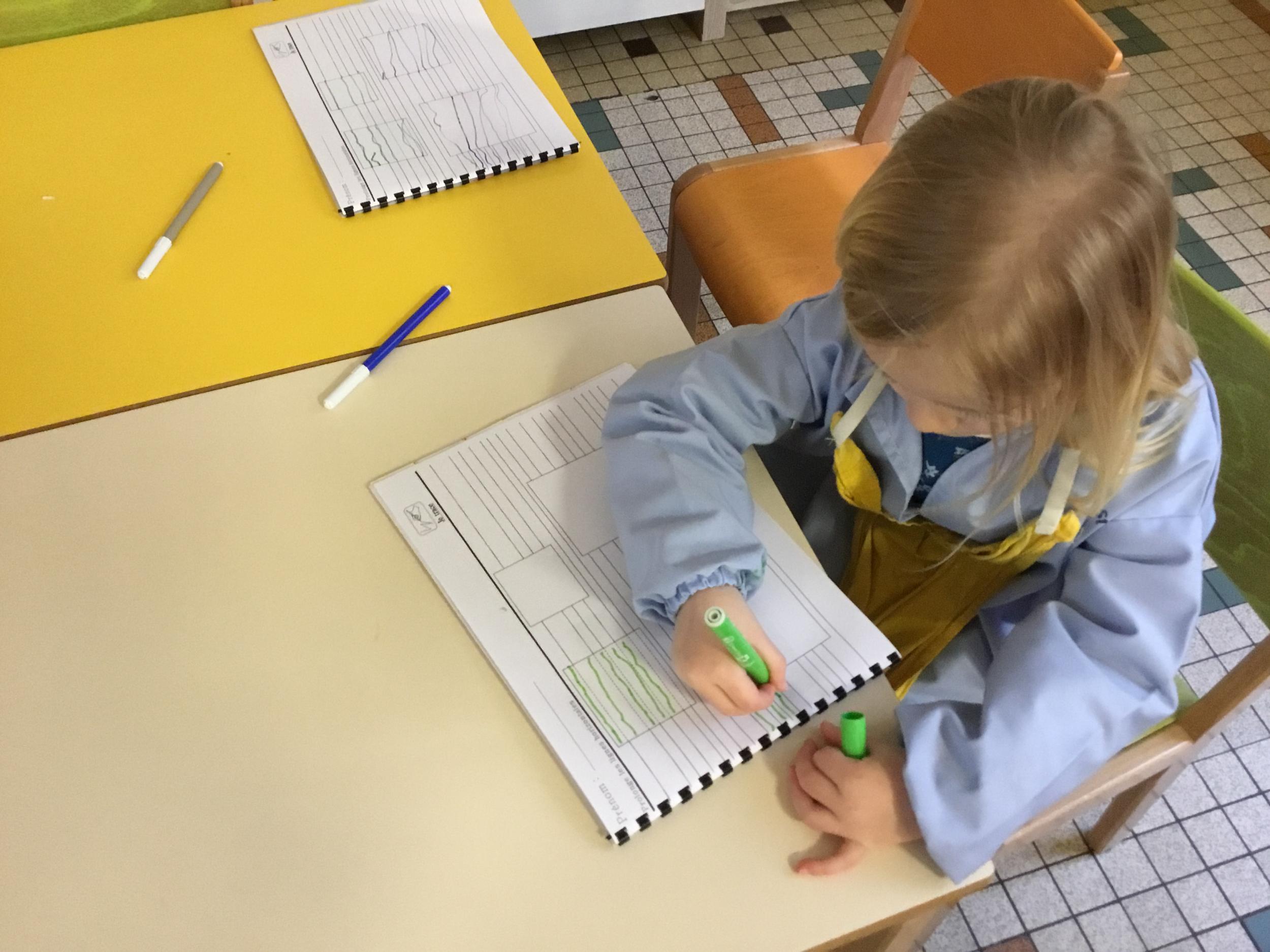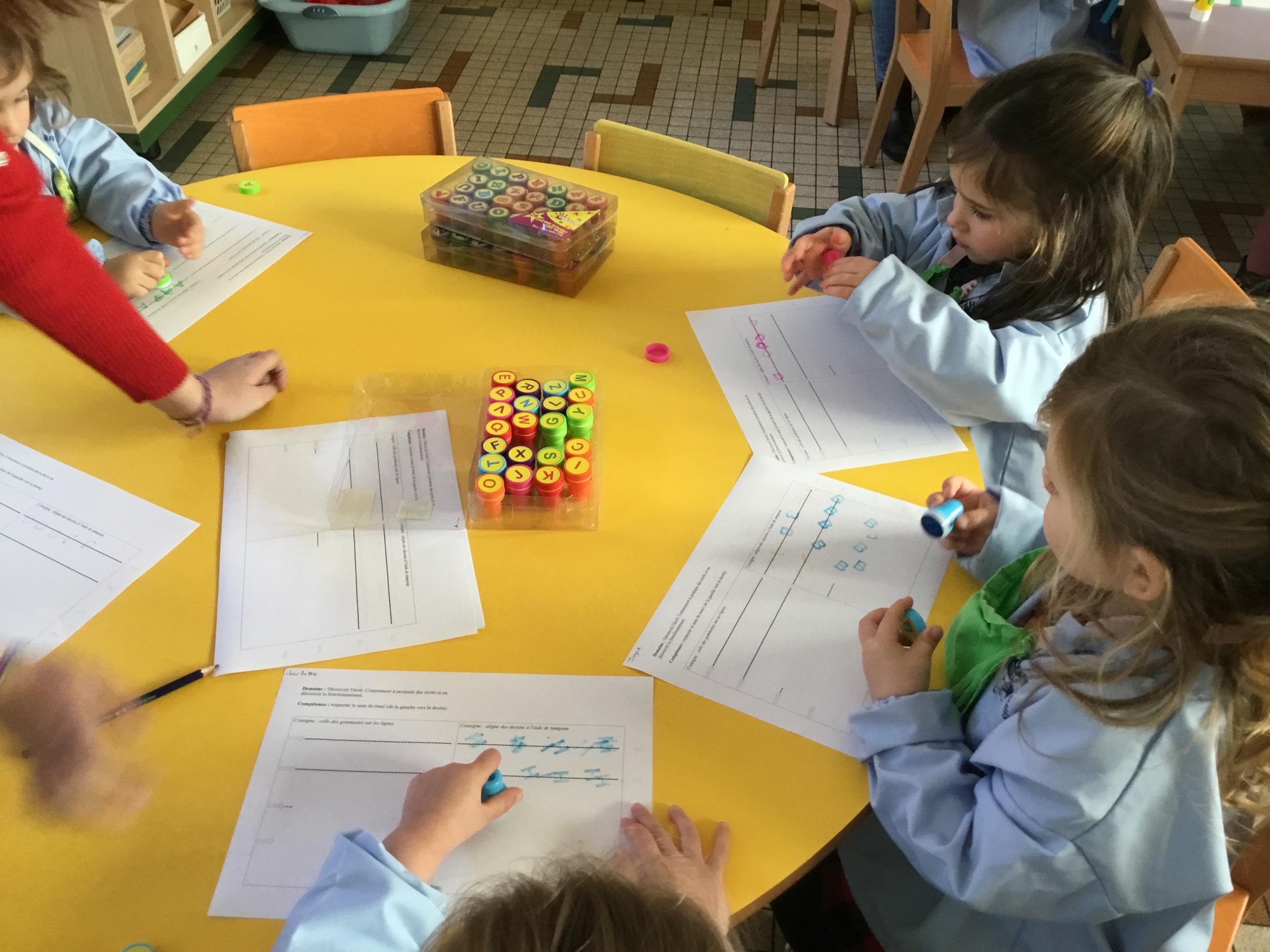 Après le trait vertical, les élèves ont travaillé autour du trait horizontal. Ces séances leur ont permis d’appréhender le sens de l’écrit de la gauche vers la droite et de maîtriser leur geste.