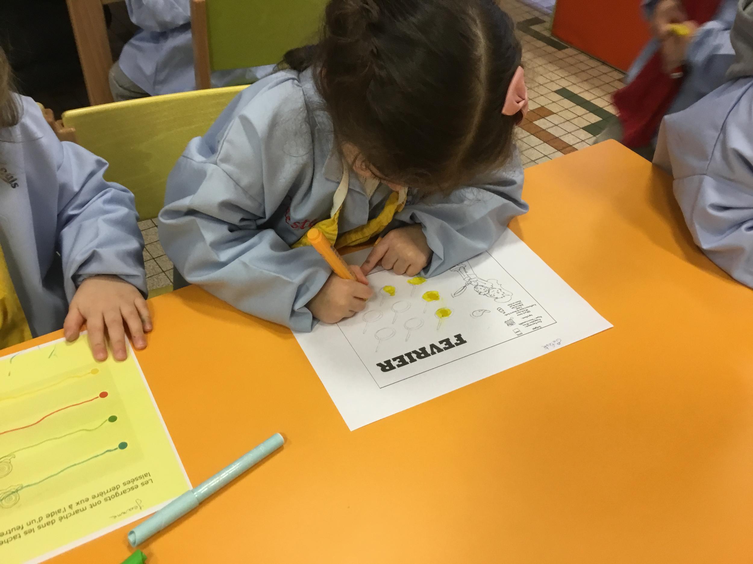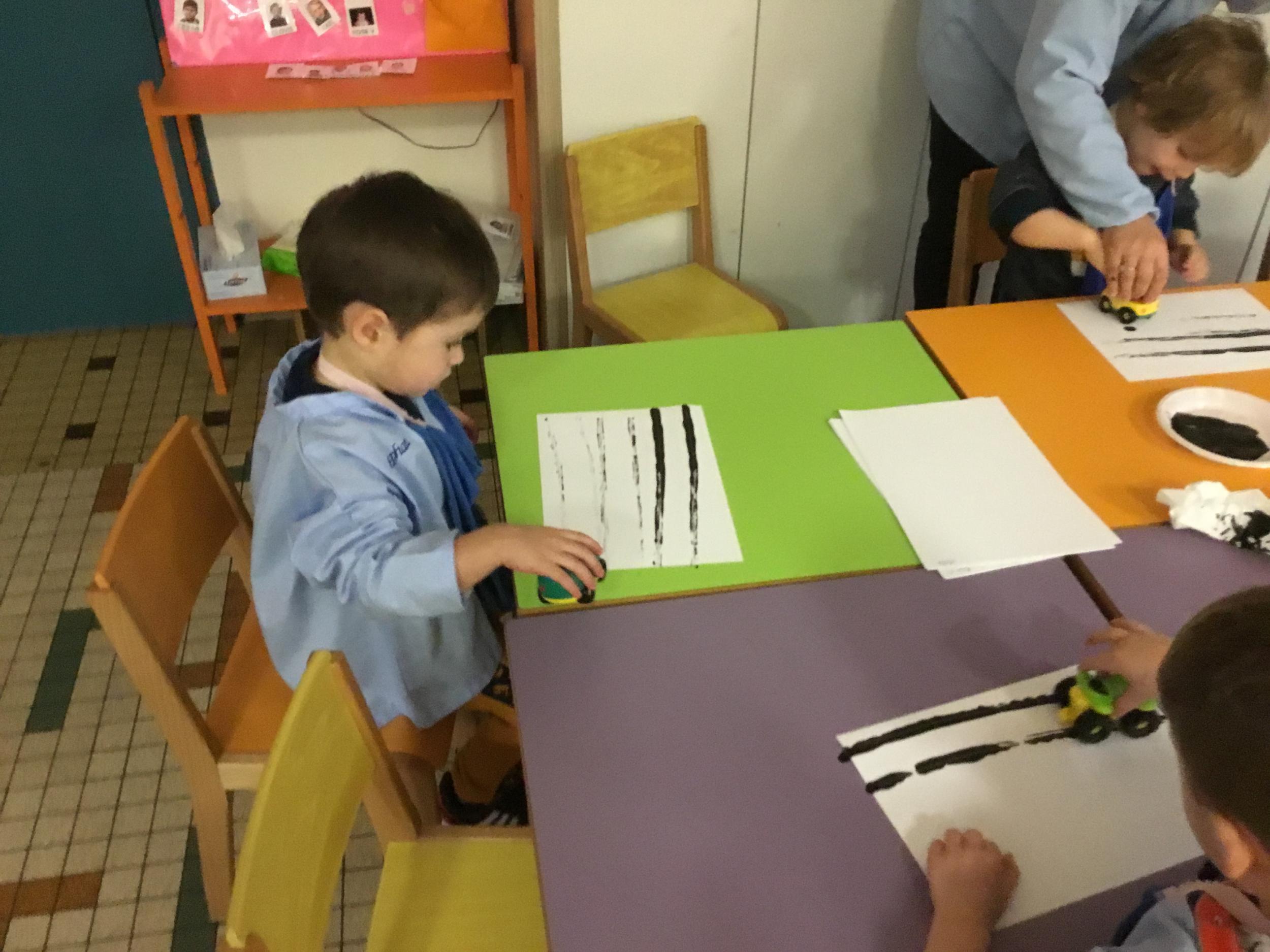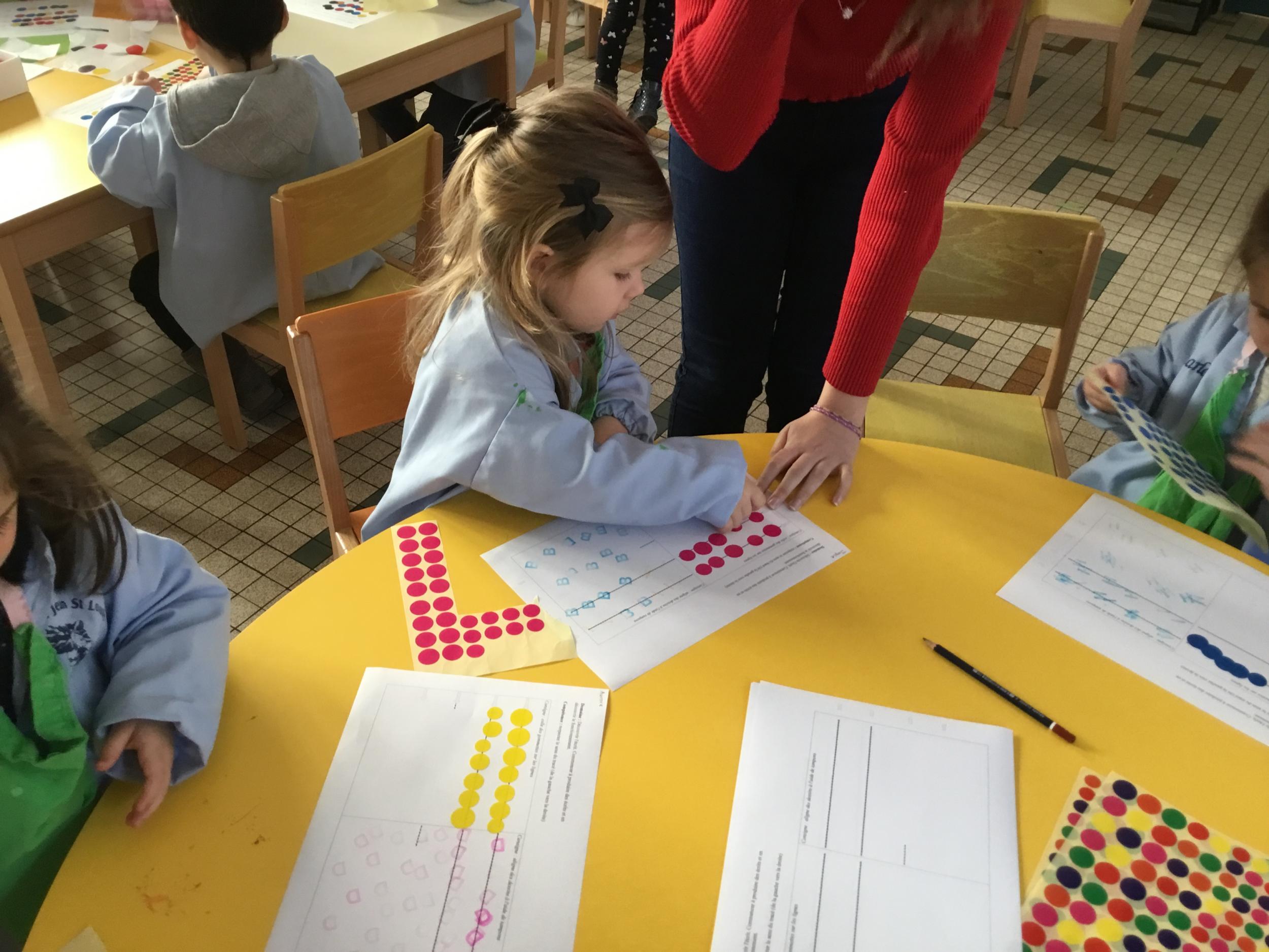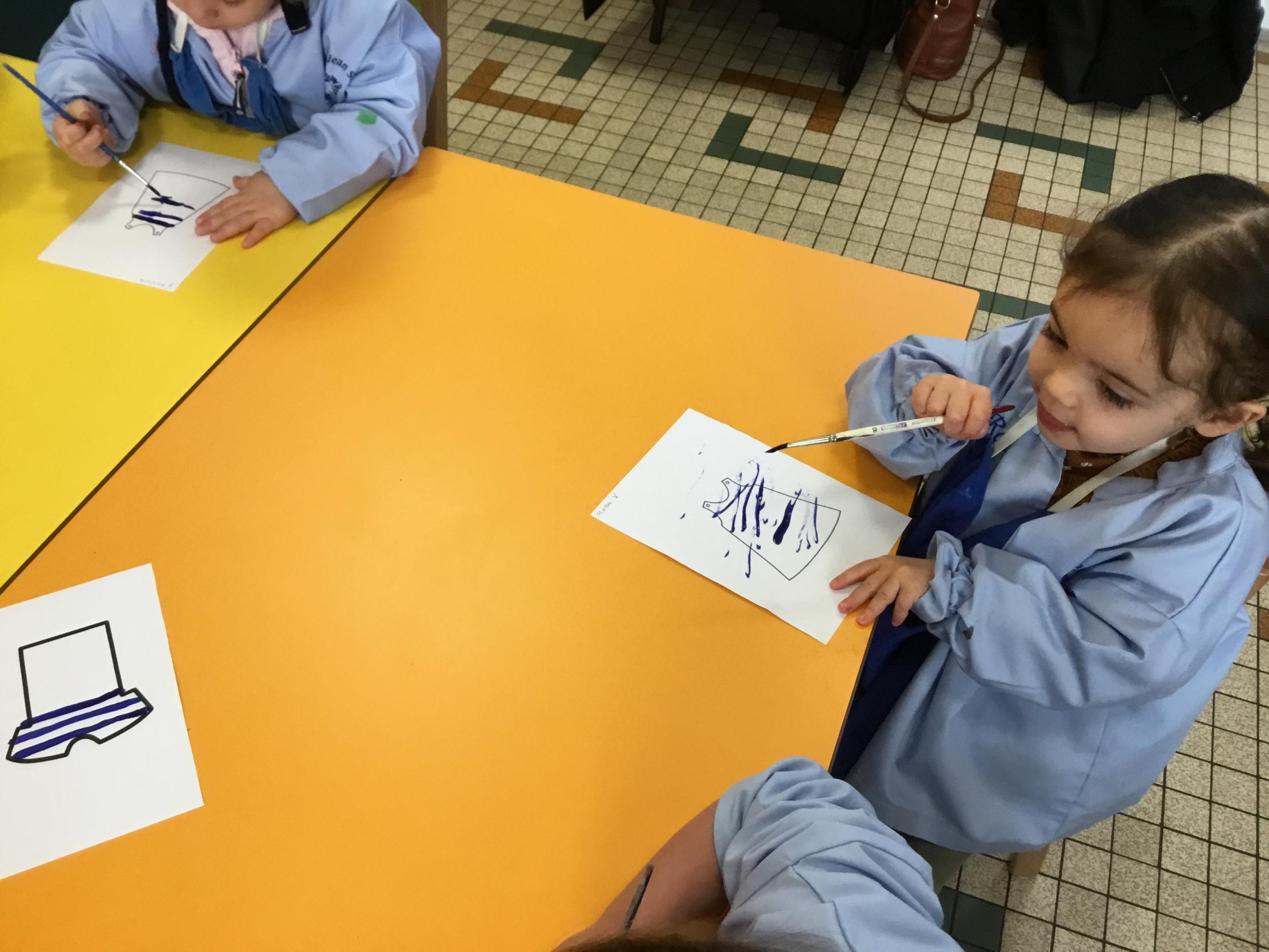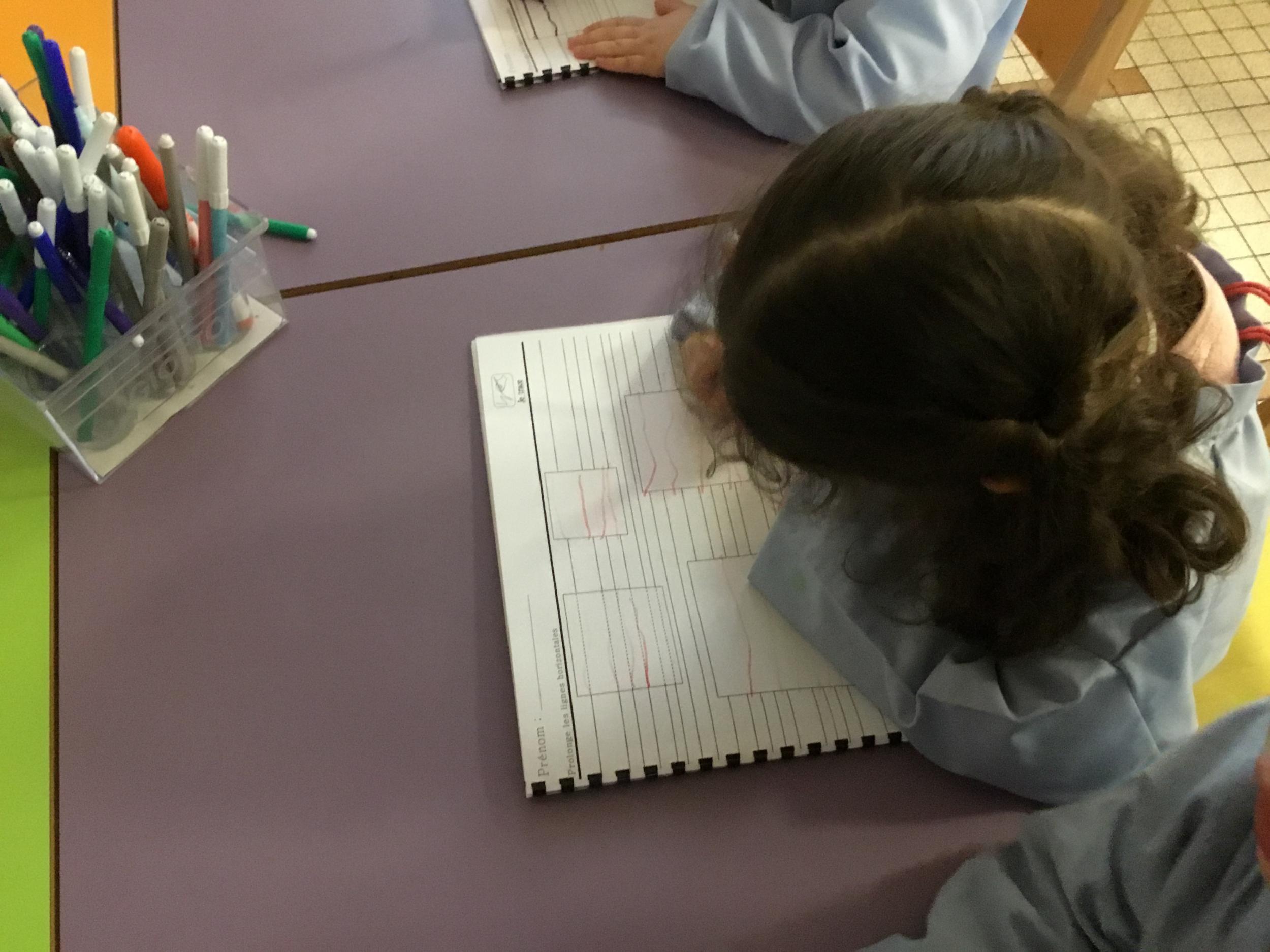 Après le trait vertical, les élèves ont travaillé autour du trait horizontal. Ces séances leur ont permis d’appréhender le sens de l’écrit de la gauche vers la droite et de maîtriser leur geste.