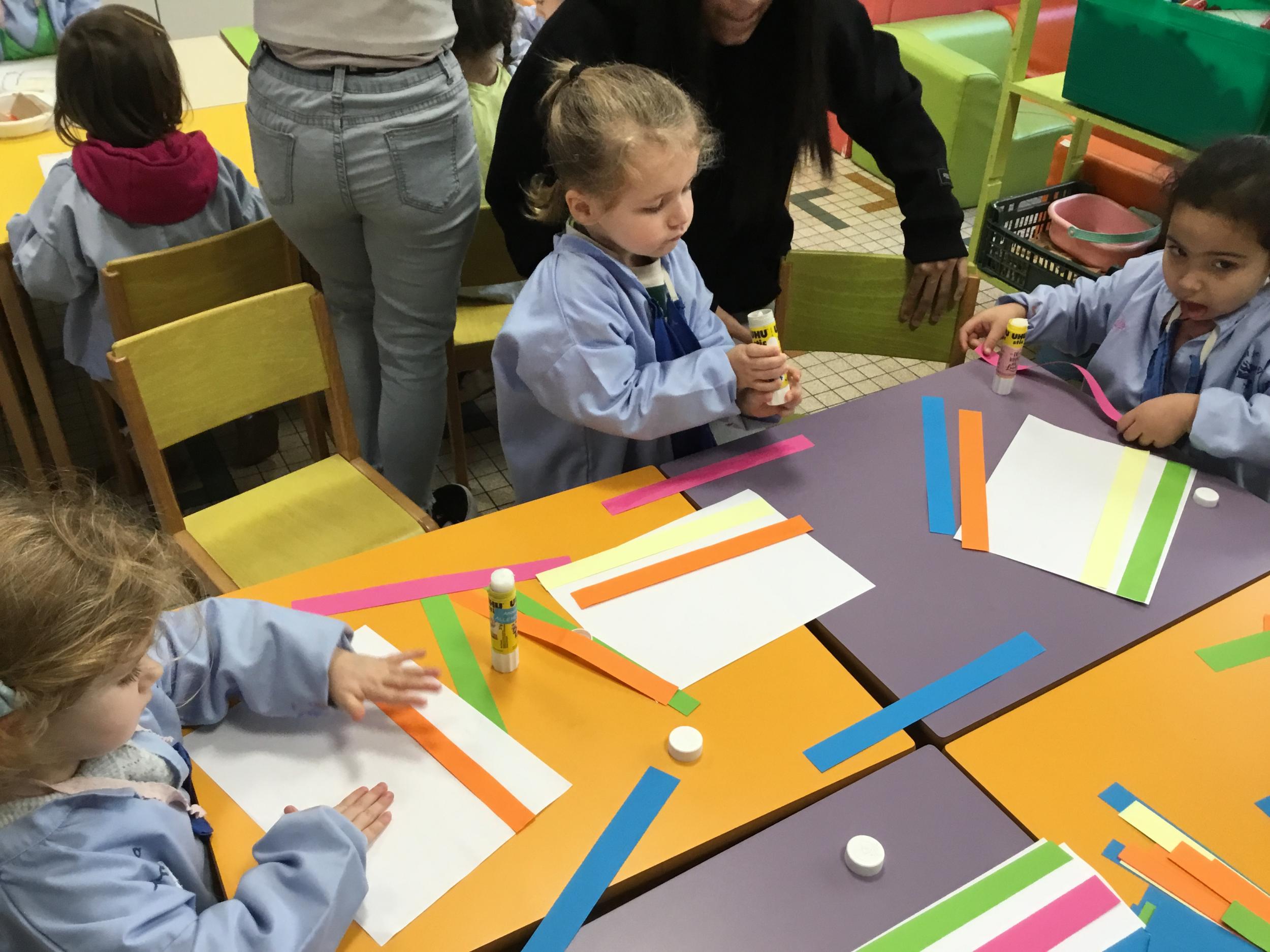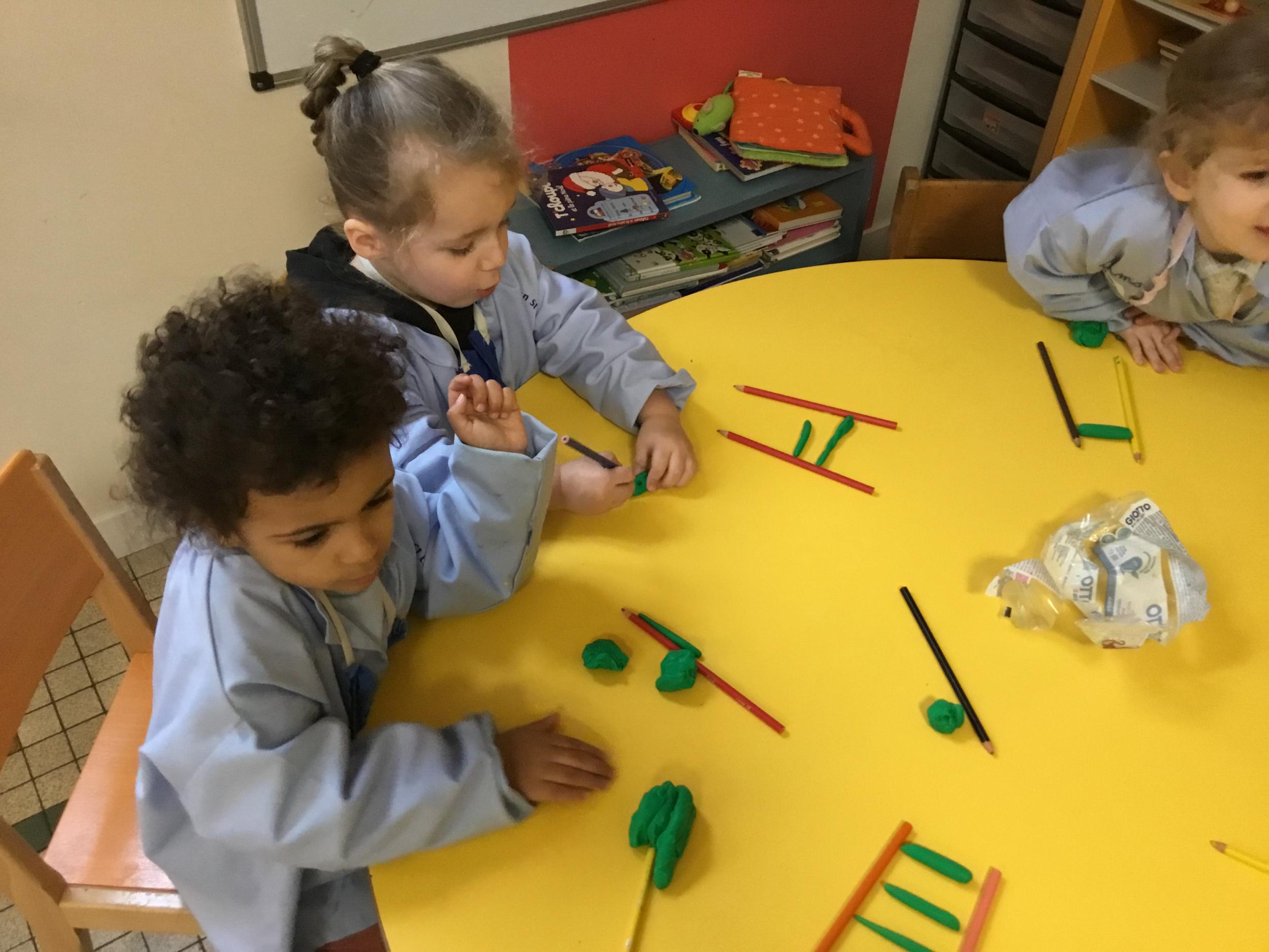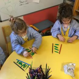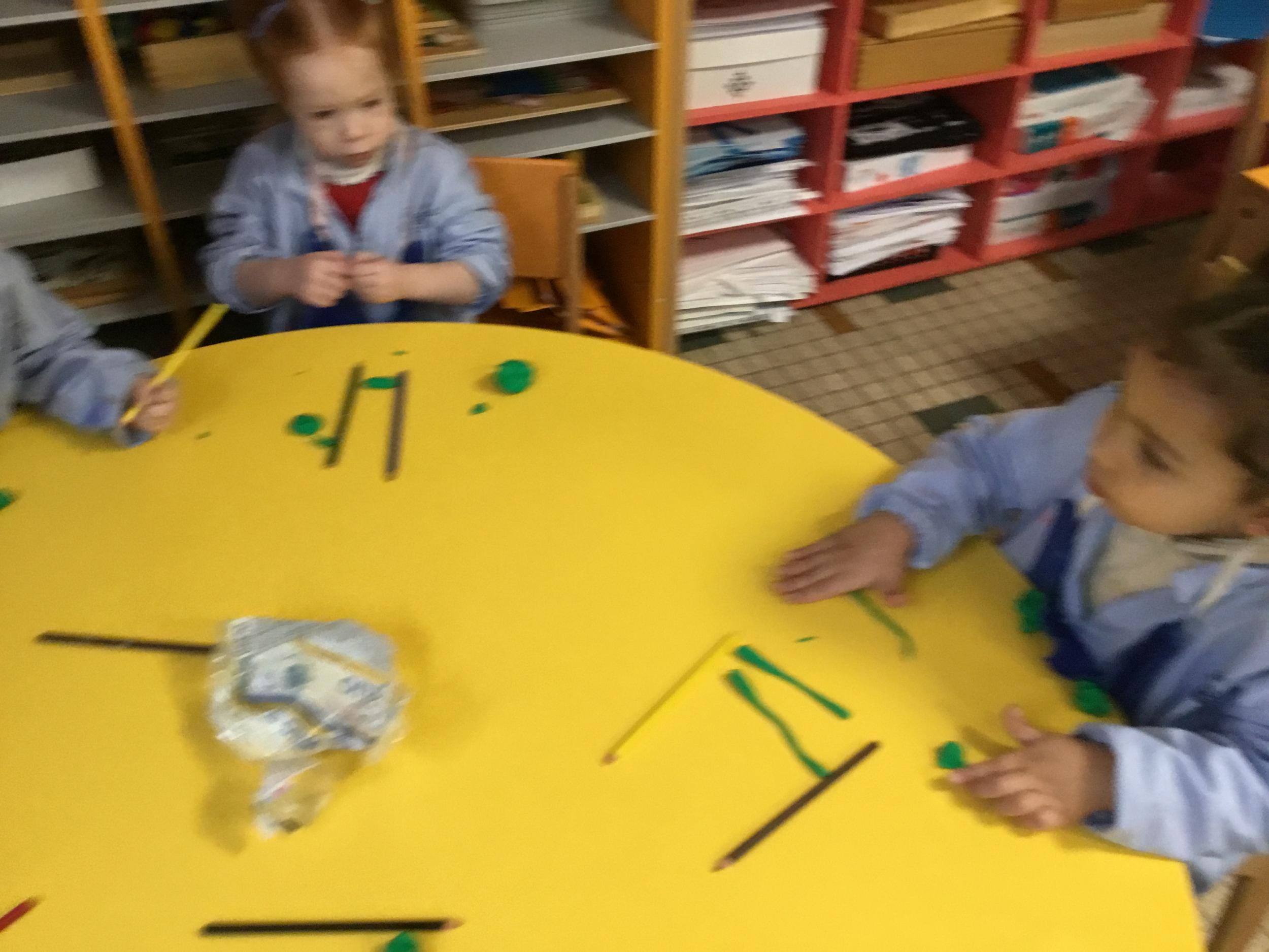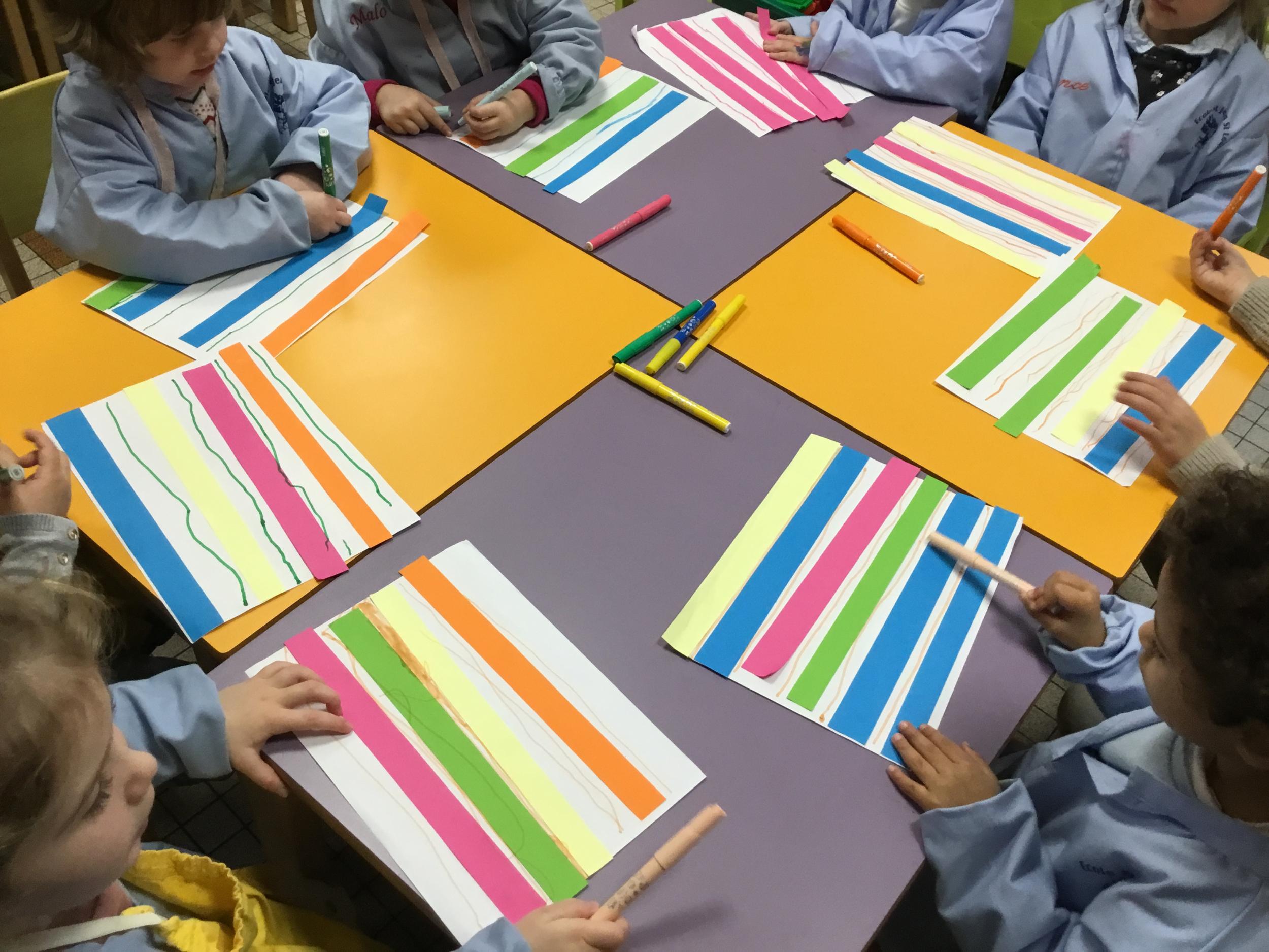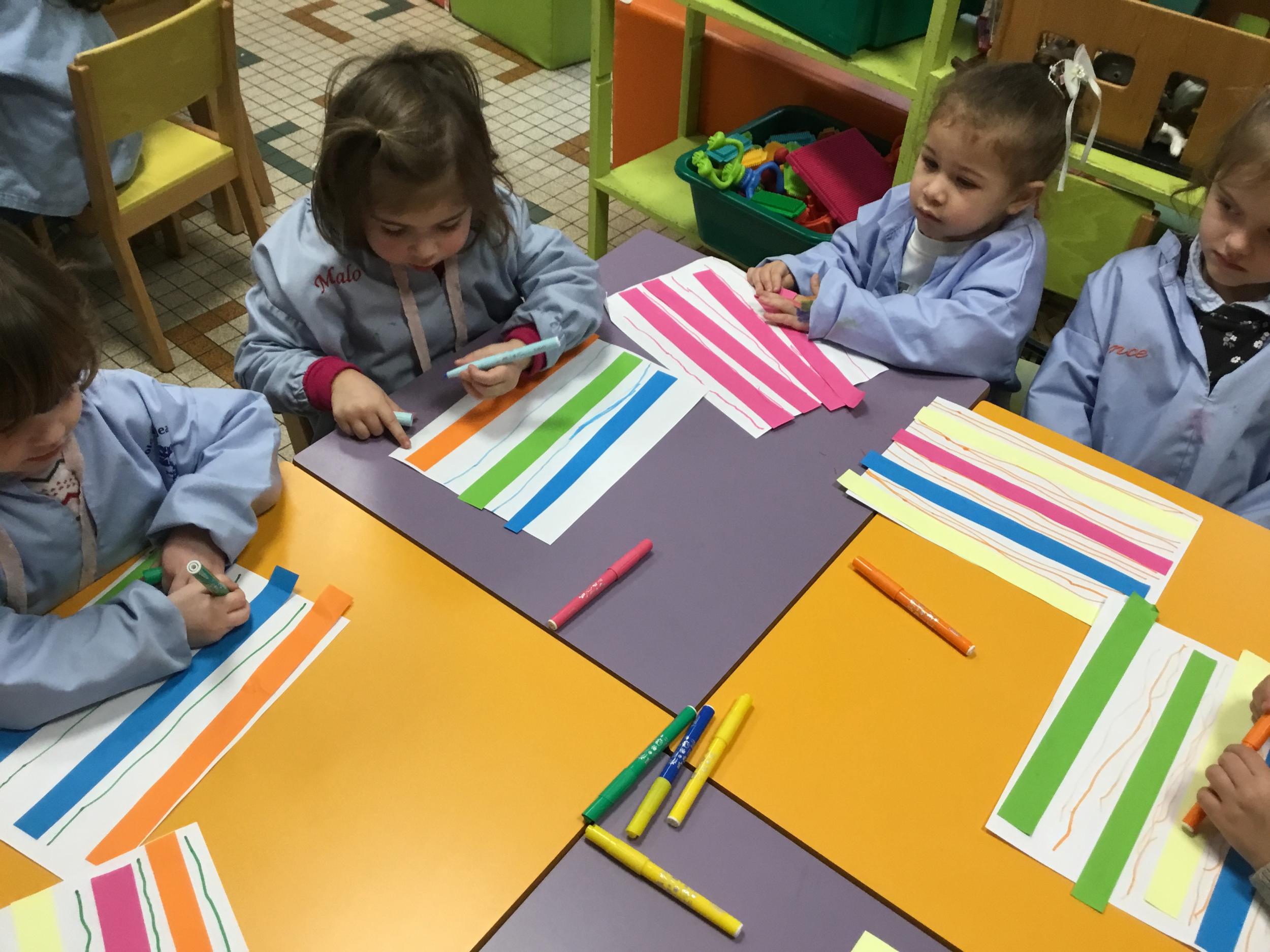 Petite et moyenne section 01/02/2026 Laisser une trace horizontale Coller des bandes papier dans le sens horizontal et tracer un trait horizontal entre chaque bande Modeler des boudins et les ranger de manière horizontale Ranger des objets du plus petit au plus grand Bravo à Victoria et Louna