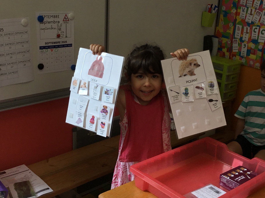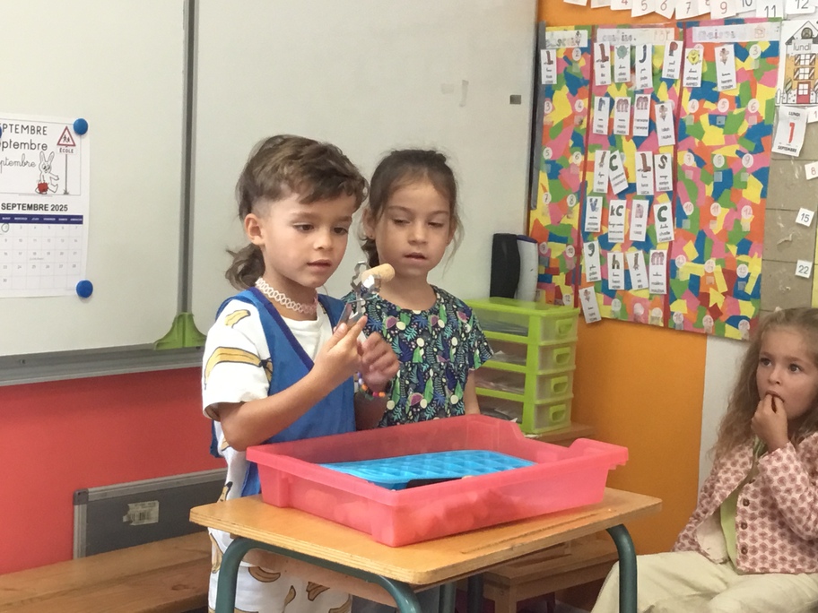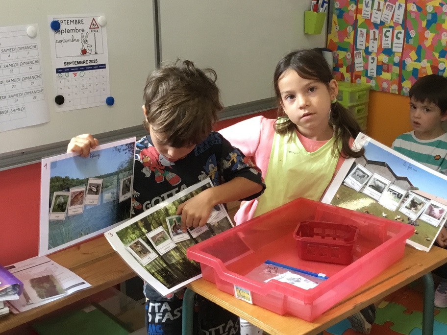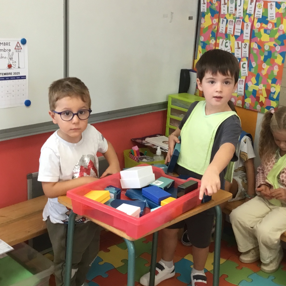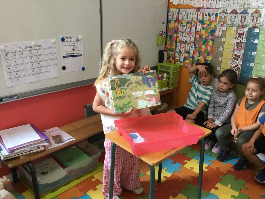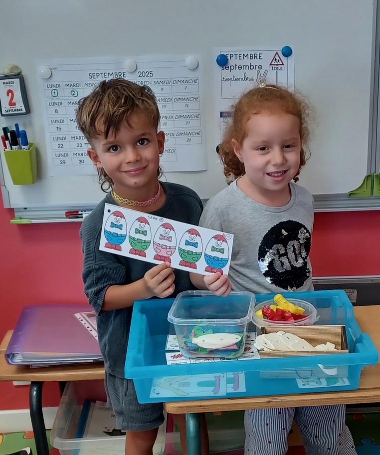 Les élèves ont découvert ces premiers jours les différents ateliers barquettes de type Montessori qu'il y a dans la classe. Nous considérons que les enfants apprennent plus facilement de façon ludique. C'est pour cette raison qu'ils disposent de nombreux ateliers regroupant les différents domaines d'apprentissages. Le matin, plus d'une heure sera consacrée à ces jeux. Les élèves disposeront d'un plan de travail pour se repérer : une grande feuille sur laquelle tous les jeux sont représentés. Ainsi, ils choisissent celui qu'ils ont envie de faire, s'entrainent, puis nous montrent et nous expliquent ce qu'ils ont fait. Si l'on considère l'apprentissage sous-jacent à l'activité suffisamment acquis, les élèves reçoivent un brevet qu'ils vont coller dans leur cahier des brevets. Ce cahier se présente sous la forme d'un répertoire avec un code couleur selon le domaine travaillé : jaune pour tout ce qui touche à la langue orale et le graphisme, blanc pour la découverte du monde, des objets et du vivant, vert pour la construction des nombres, bleu pour le travail dans l'espace et le temps, orange pour l'art visuel, rose pour les activités motrices.