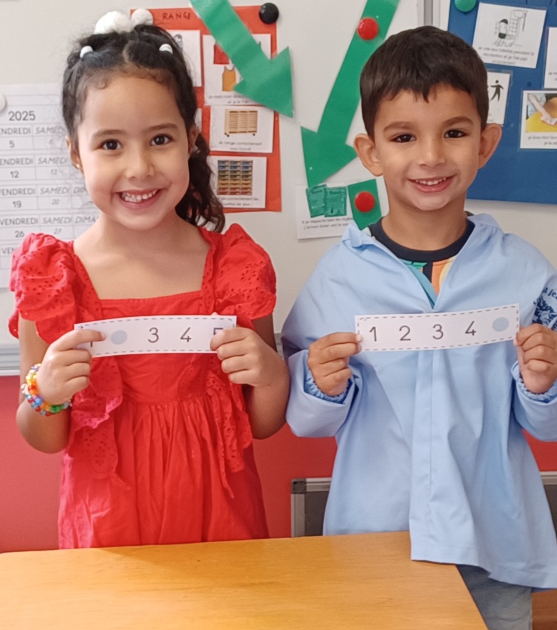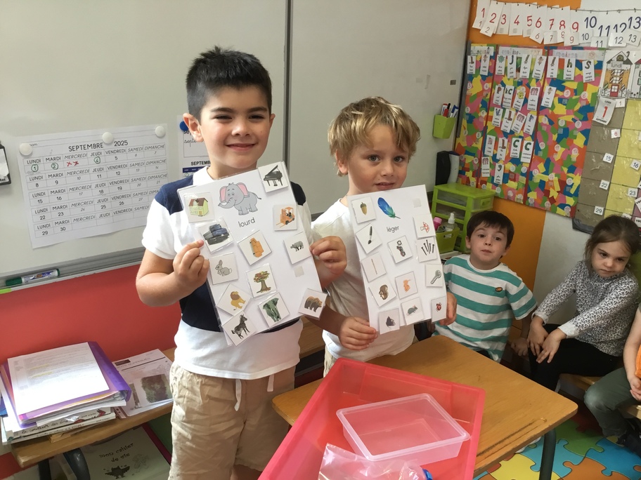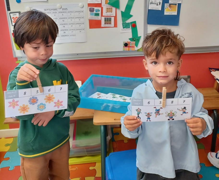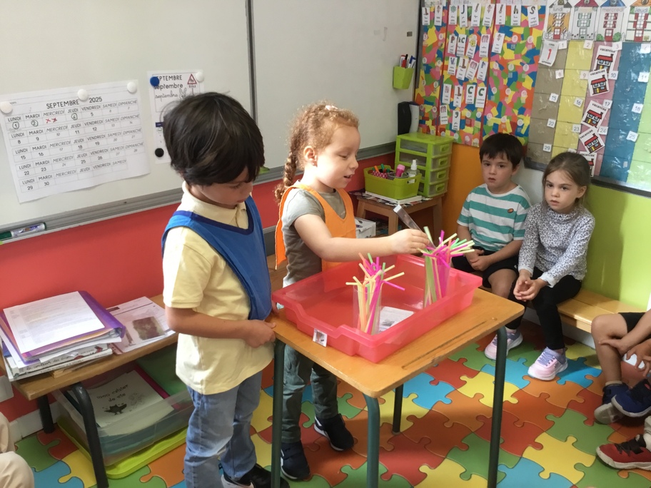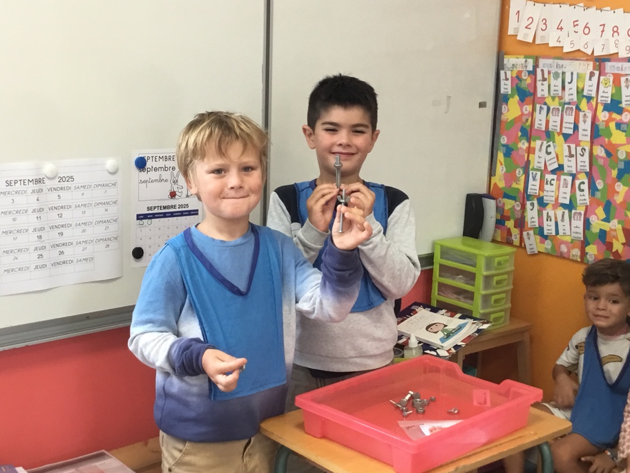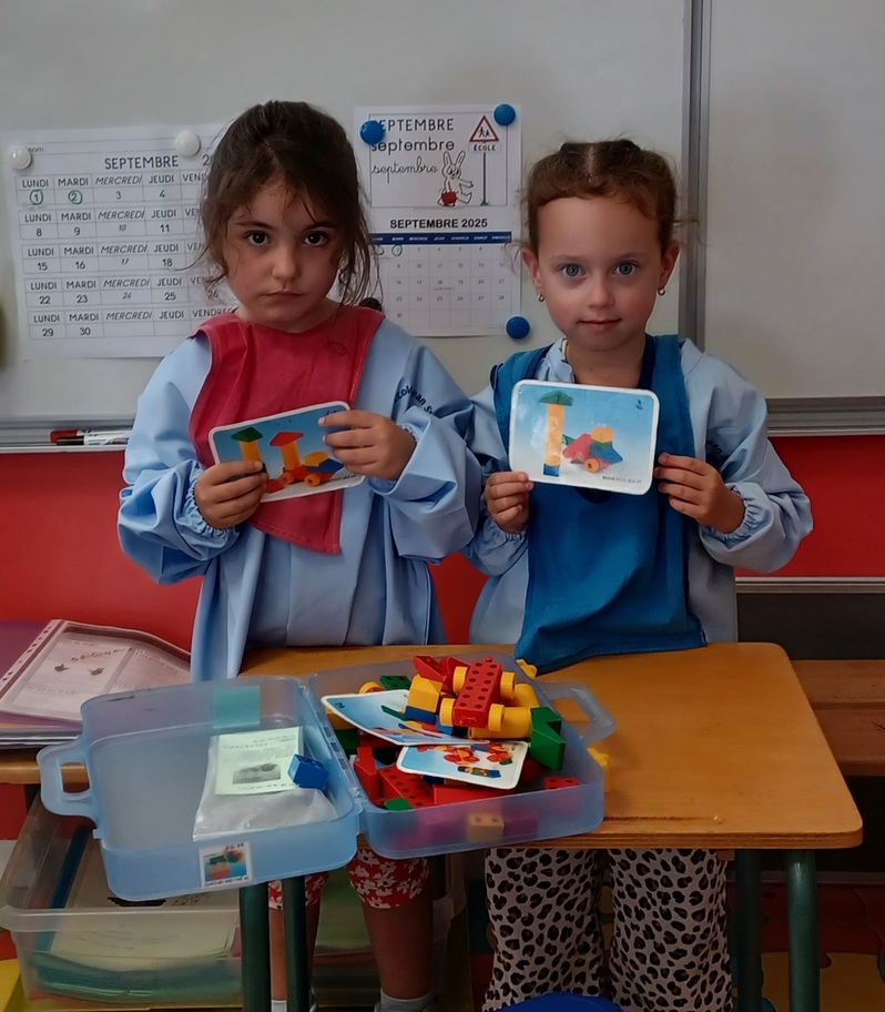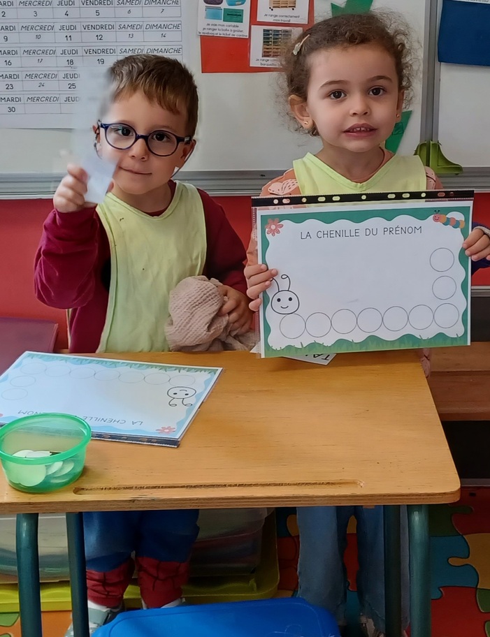 Les élèves ont découvert ces premiers jours les différents ateliers barquettes de type Montessori qu'il y a dans la classe. Nous considérons que les enfants apprennent plus facilement de façon ludique. C'est pour cette raison qu'ils disposent de nombreux ateliers regroupant les différents domaines d'apprentissages. Le matin, plus d'une heure sera consacrée à ces jeux. Les élèves disposeront d'un plan de travail pour se repérer : une grande feuille sur laquelle tous les jeux sont représentés. Ainsi, ils choisissent celui qu'ils ont envie de faire, s'entrainent, puis nous montrent et nous expliquent ce qu'ils ont fait. Si l'on considère l'apprentissage sous-jacent à l'activité suffisamment acquis, les élèves reçoivent un brevet qu'ils vont coller dans leur cahier des brevets. Ce cahier se présente sous la forme d'un répertoire avec un code couleur selon le domaine travaillé : jaune pour tout ce qui touche à la langue orale et le graphisme, blanc pour la découverte du monde, des objets et du vivant, vert pour la construction des nombres, bleu pour le travail dans l'espace et le temps, orange pour l'art visuel, rose pour les activités motrices.