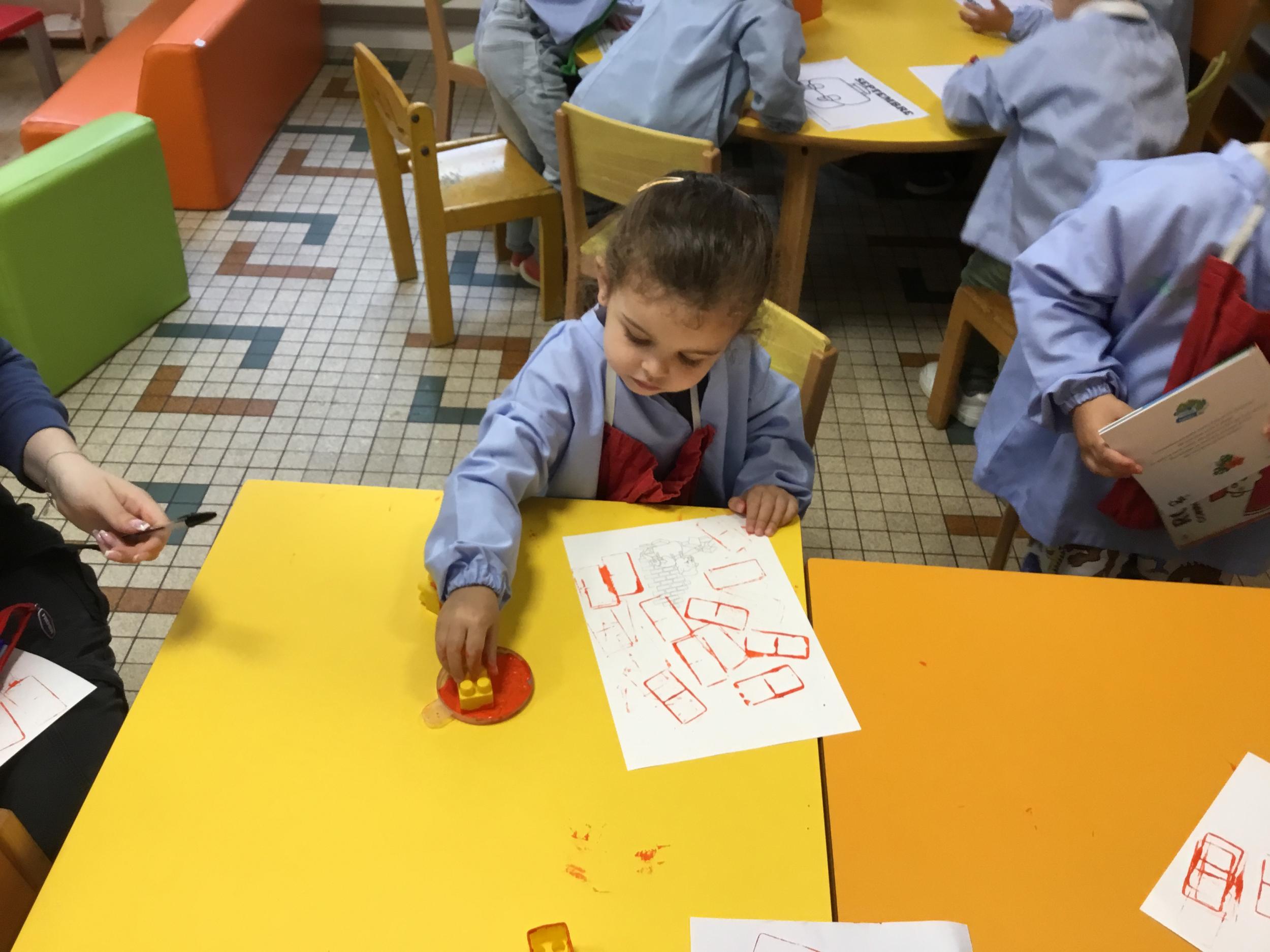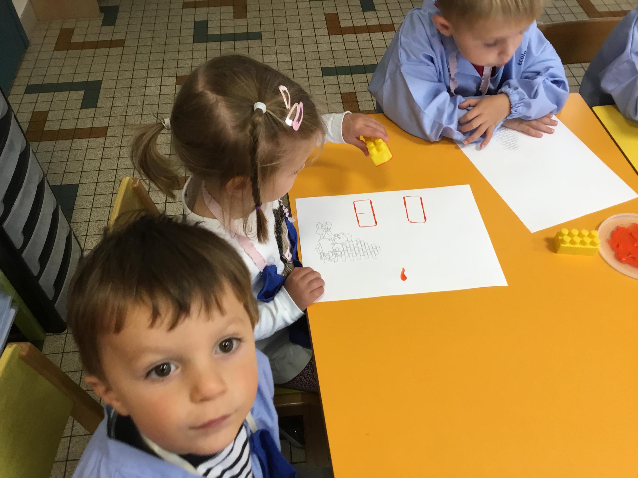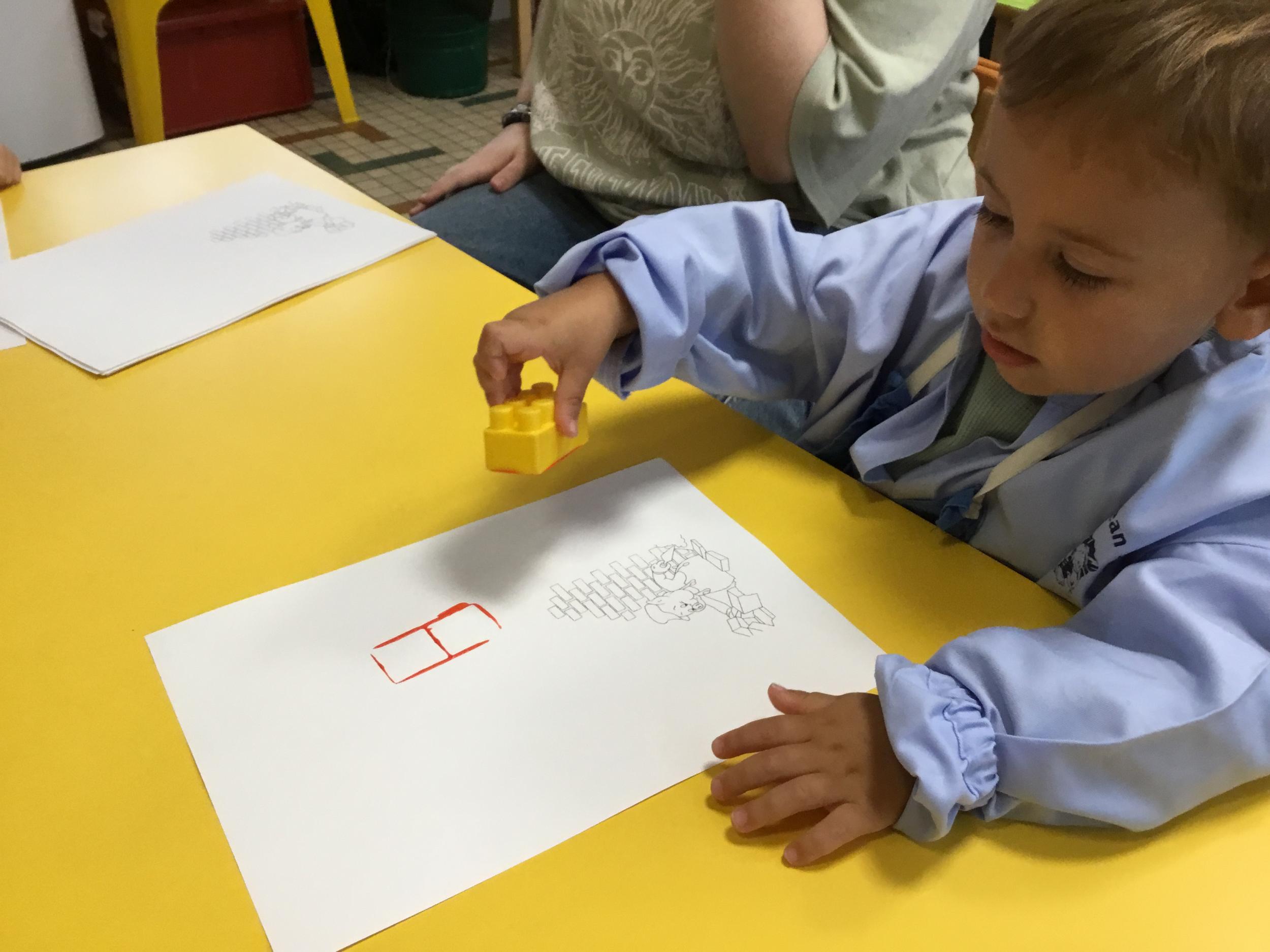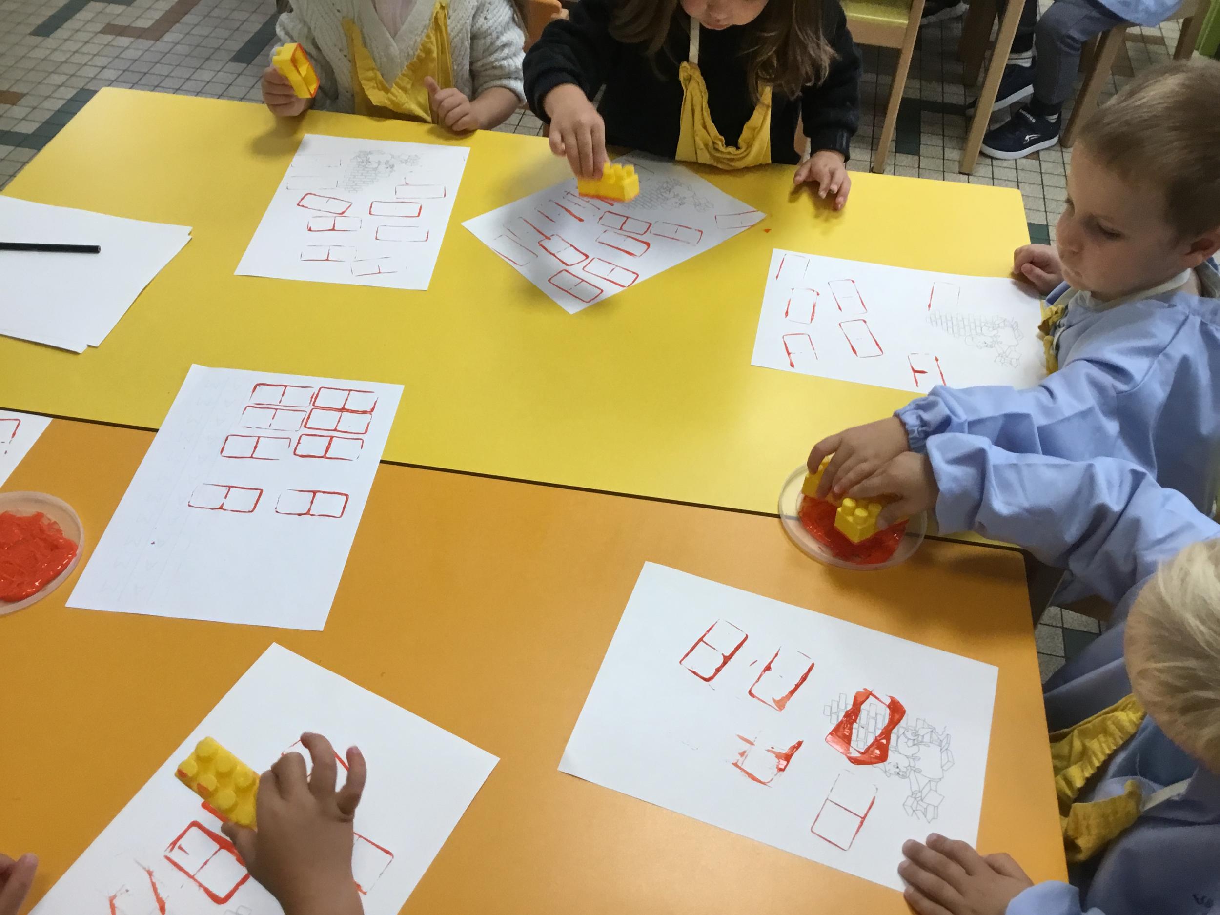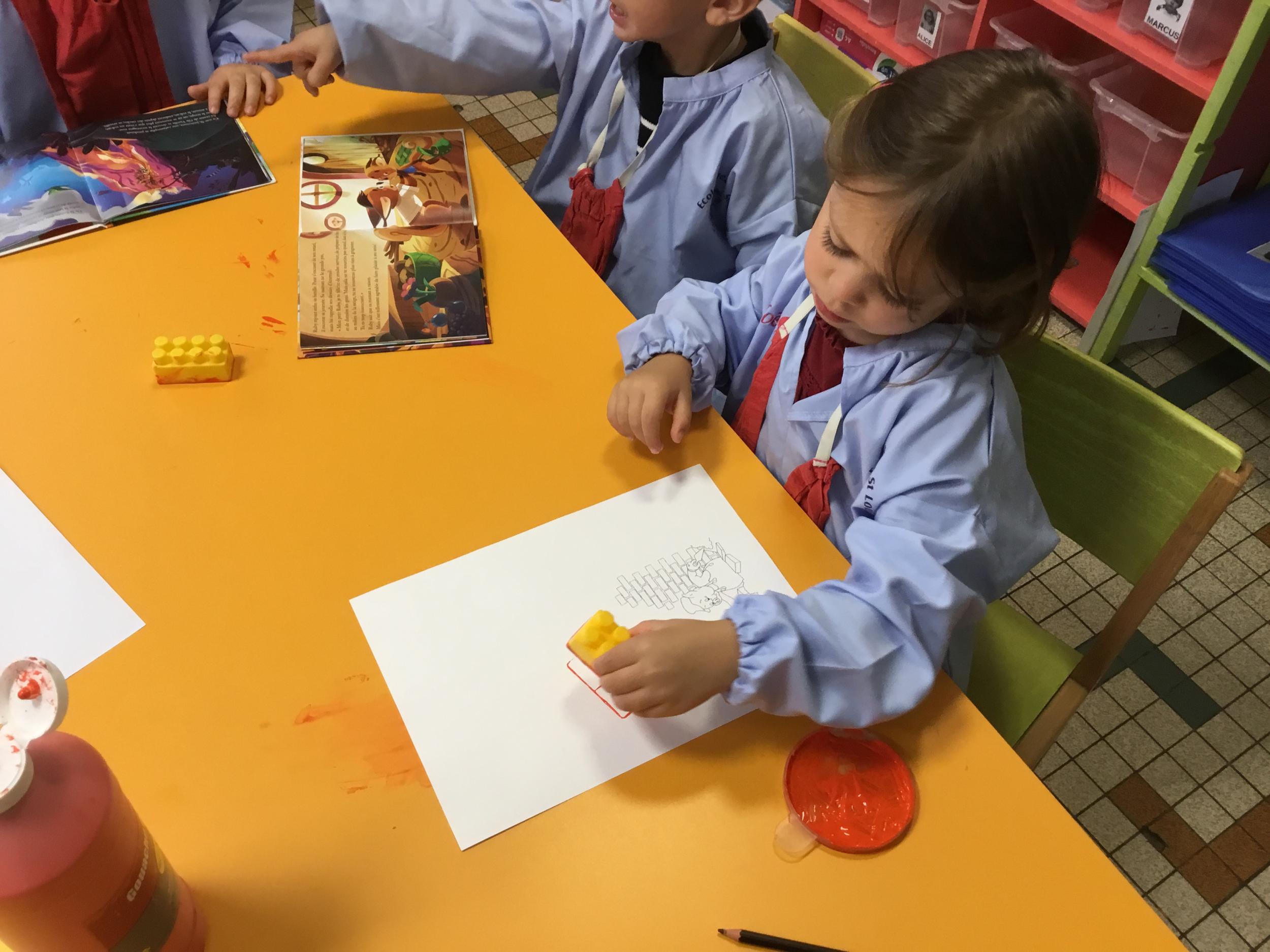 Les élèves ont travaillé autour de l’album lu en classe « je ne veux pas aller à l’école » et, en arts, ils ont commencé un travail sur les traces laissées avec différents outils. La première trace est réalisée à partir d’un légo.