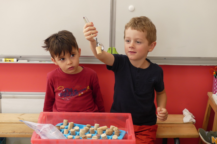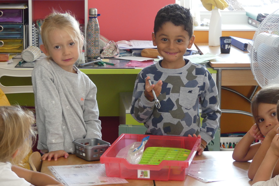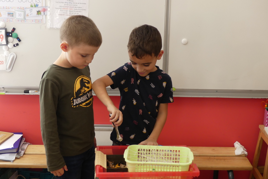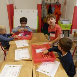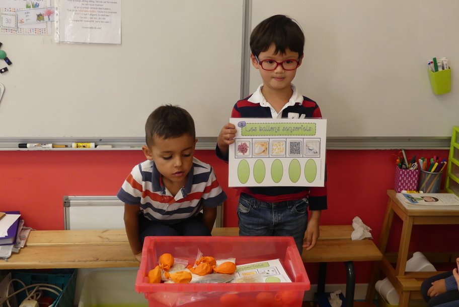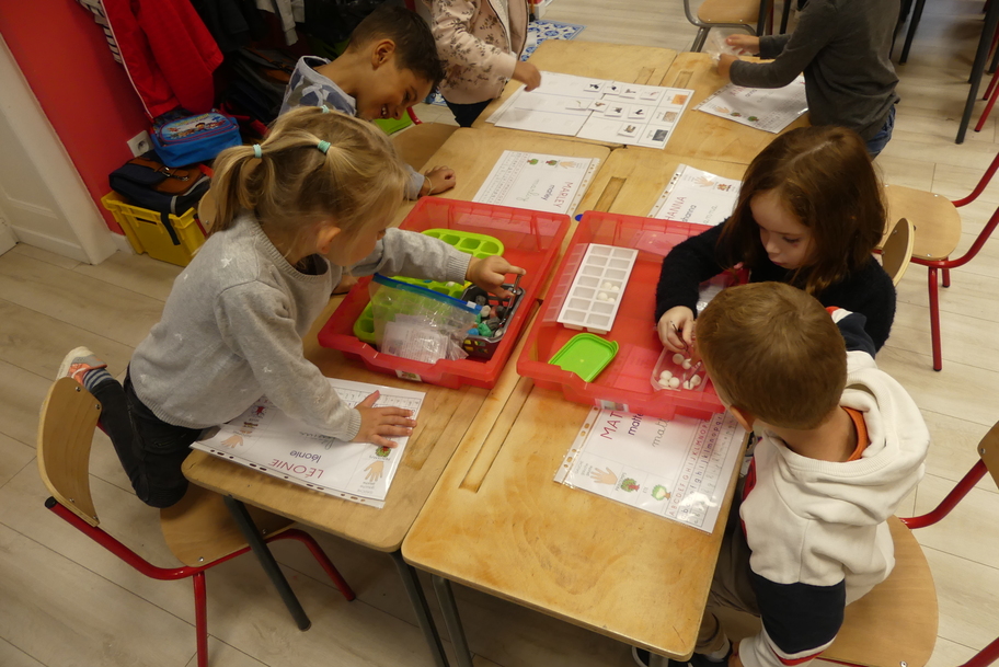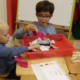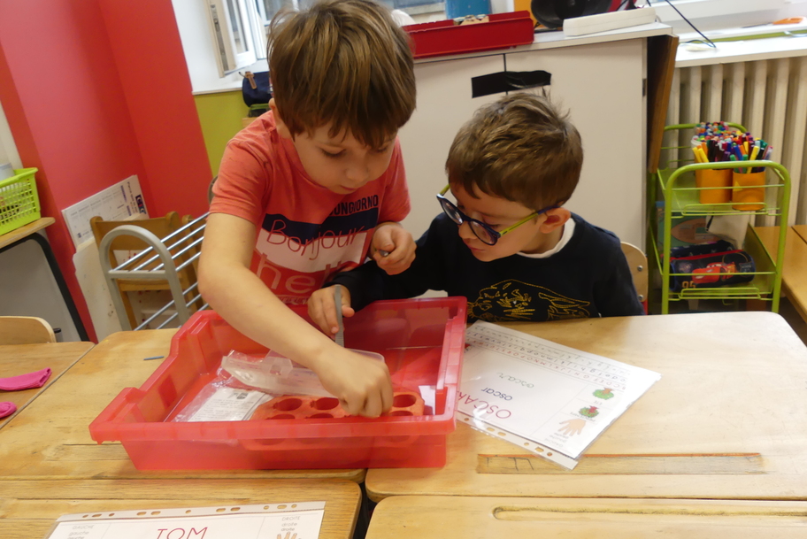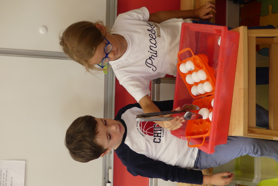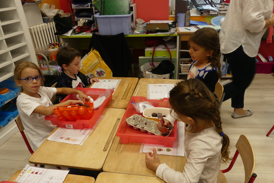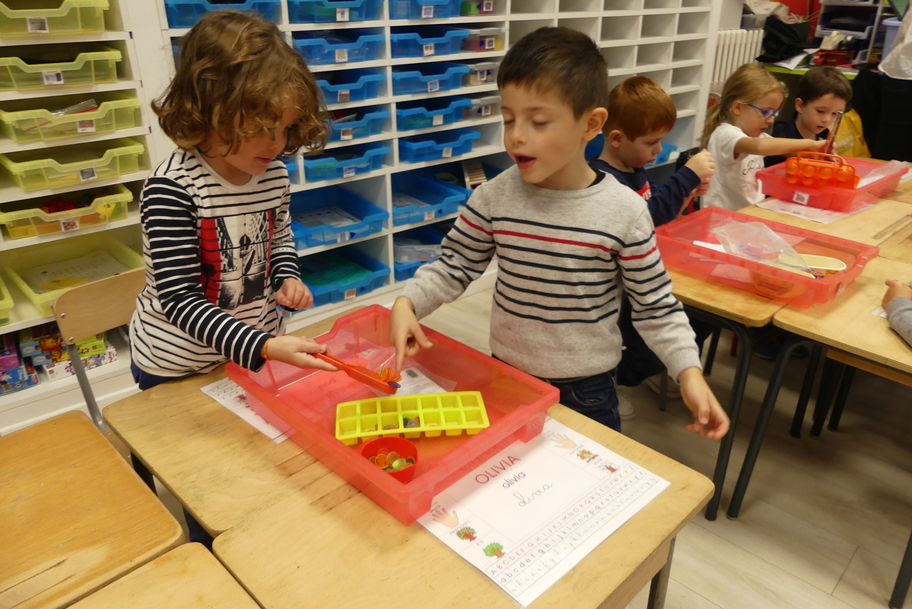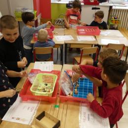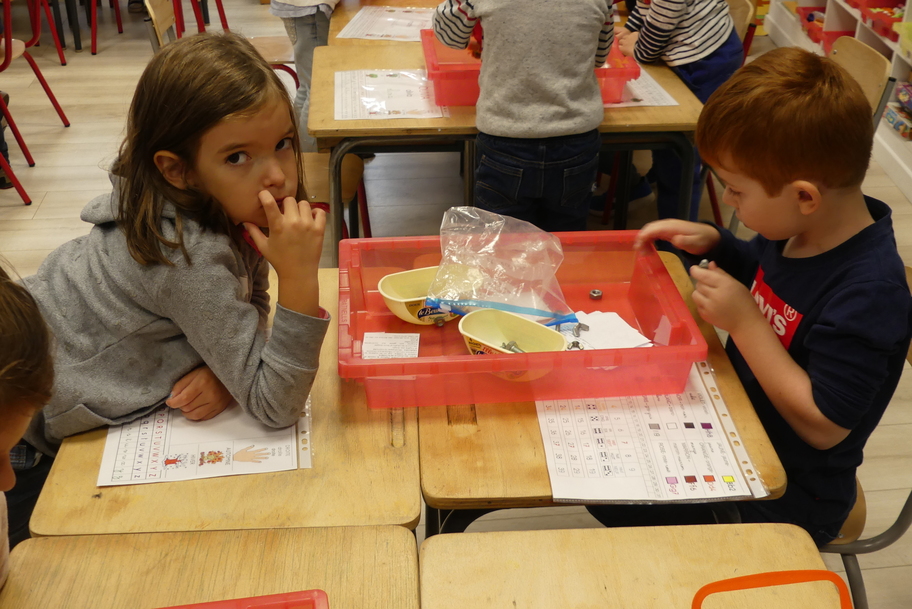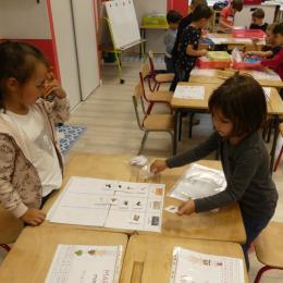 Depuis la rentré, les élèves découvrent les divers ateliers barquettes de style Montessori. Ils recherchent à deux l'utilisation du matériel puis le présentent à la classe et expliquent ce qu'ils ont compris.
