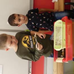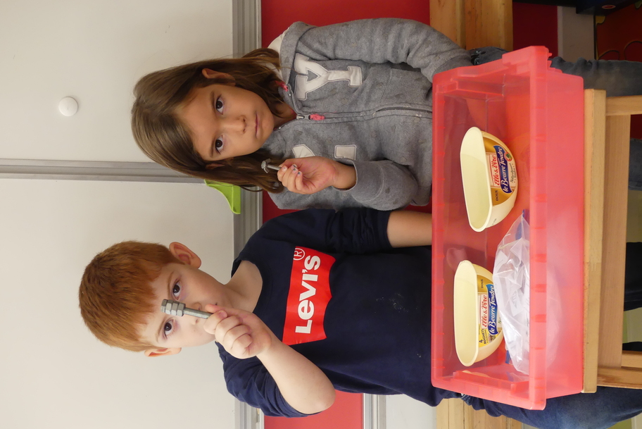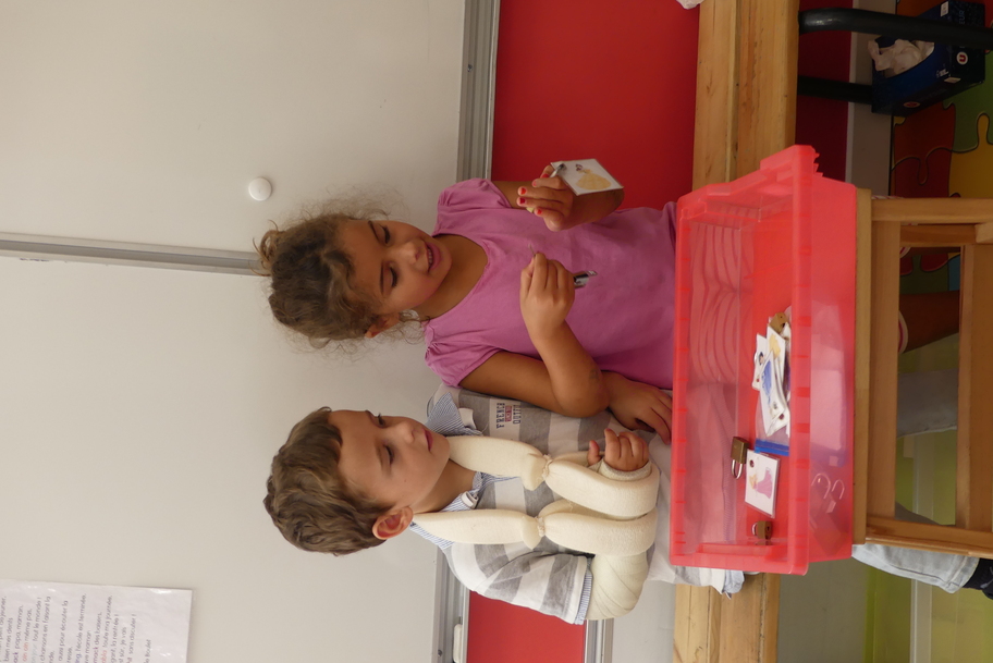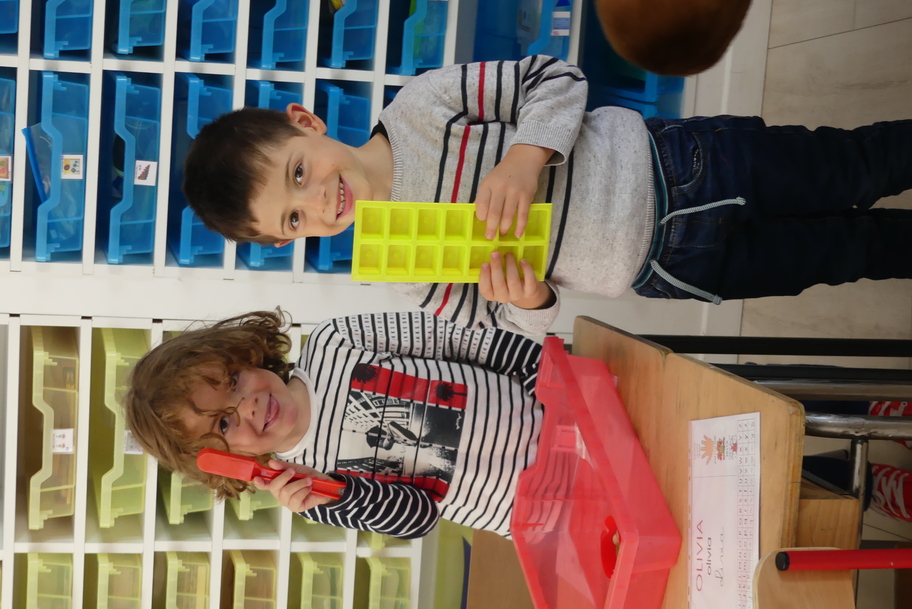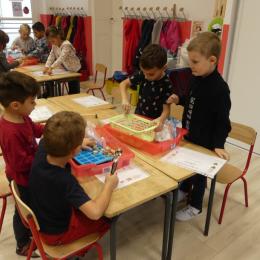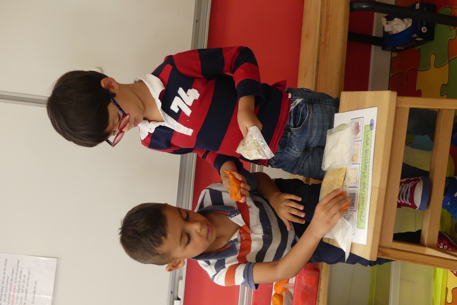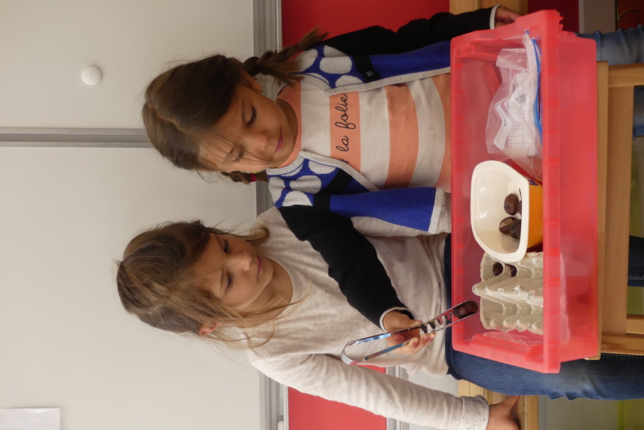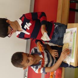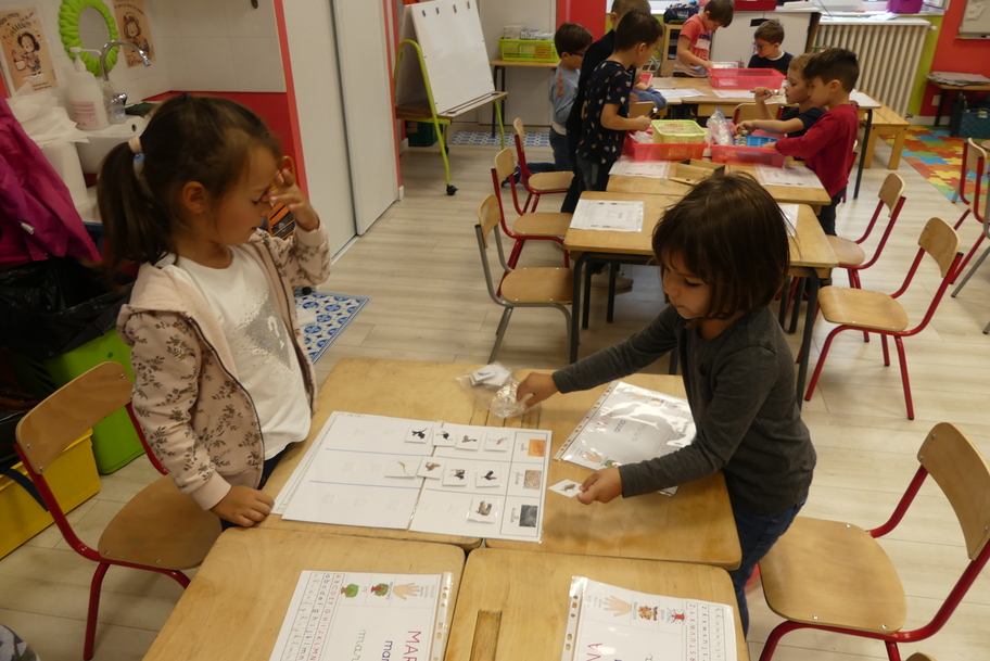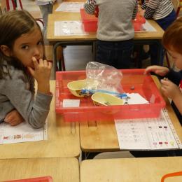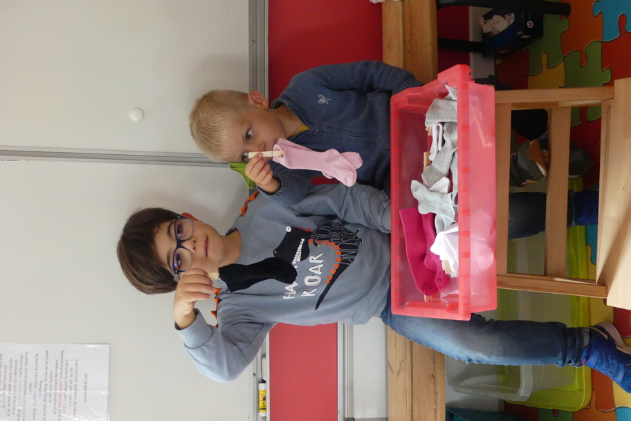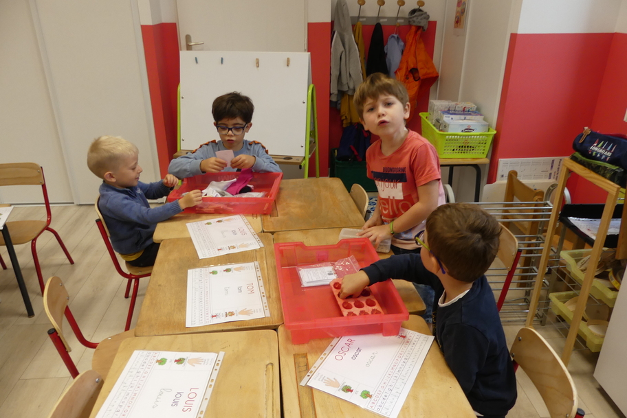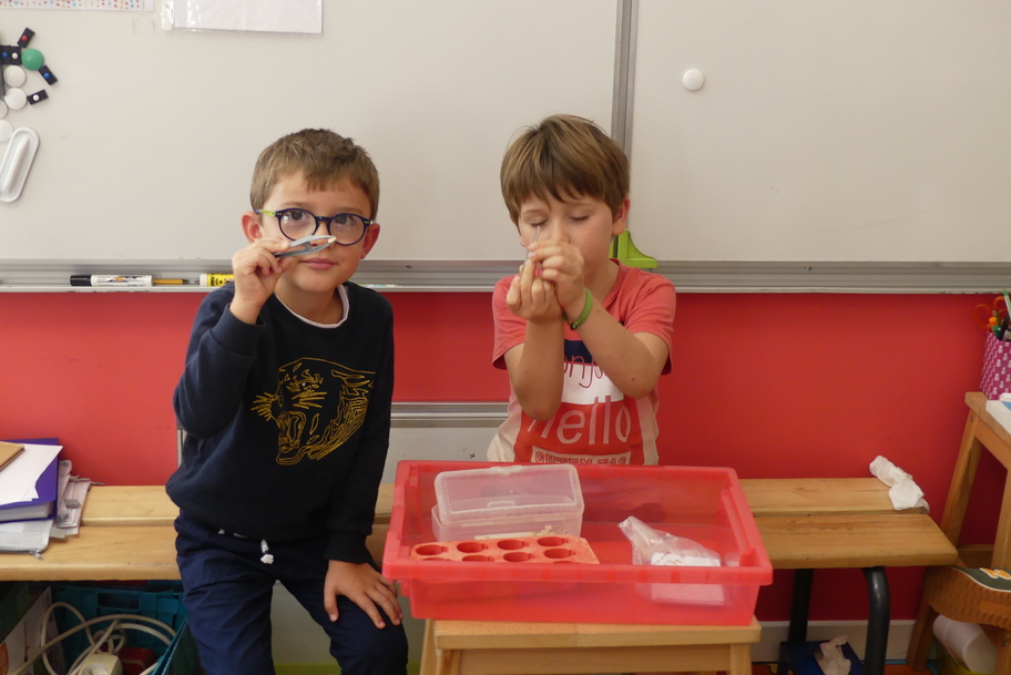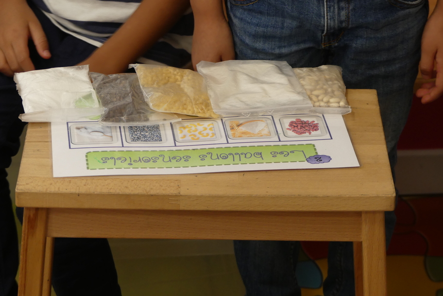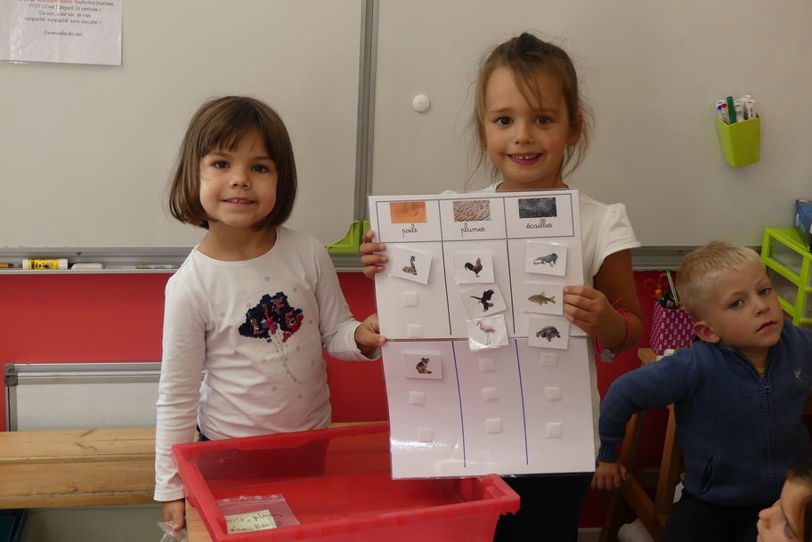 Depuis la rentré, les élèves découvrent les divers ateliers barquettes de style Montessori. Ils recherchent à deux l'utilisation du matériel puis le présentent à la classe et expliquent ce qu'ils ont compris.