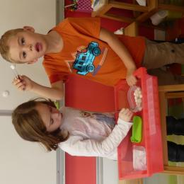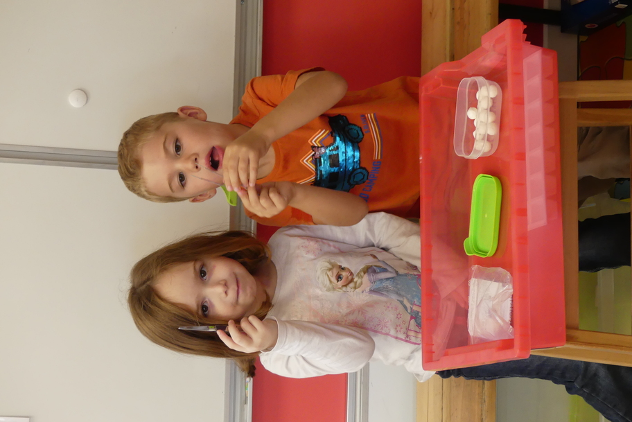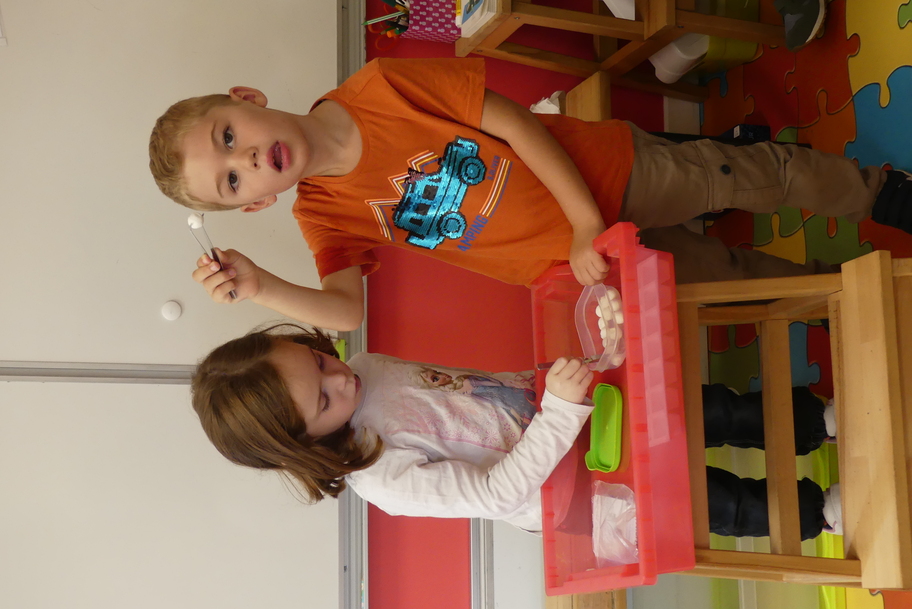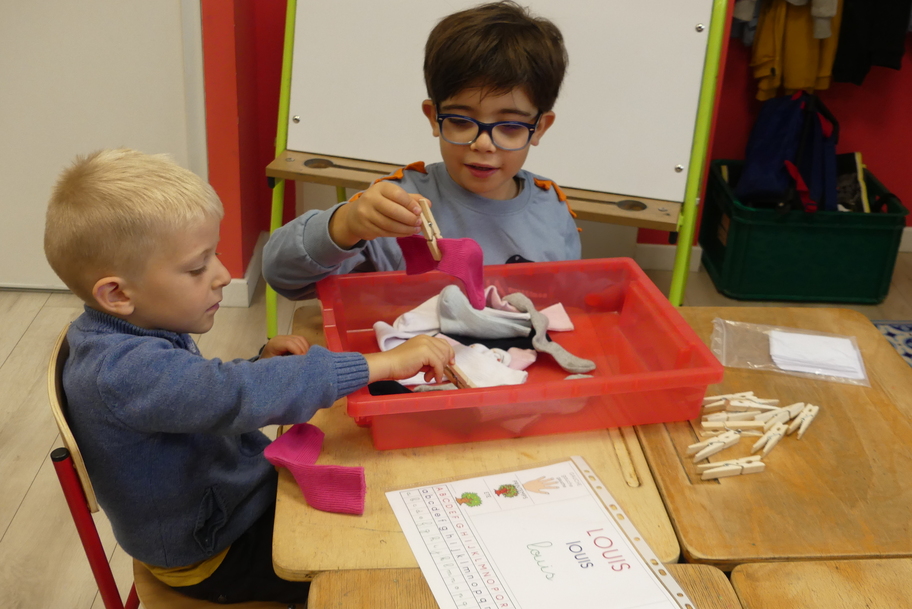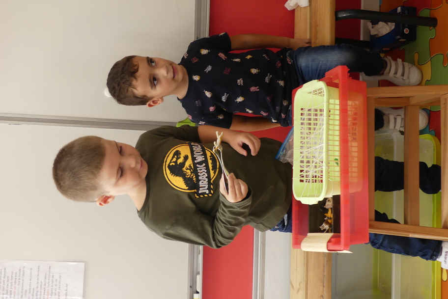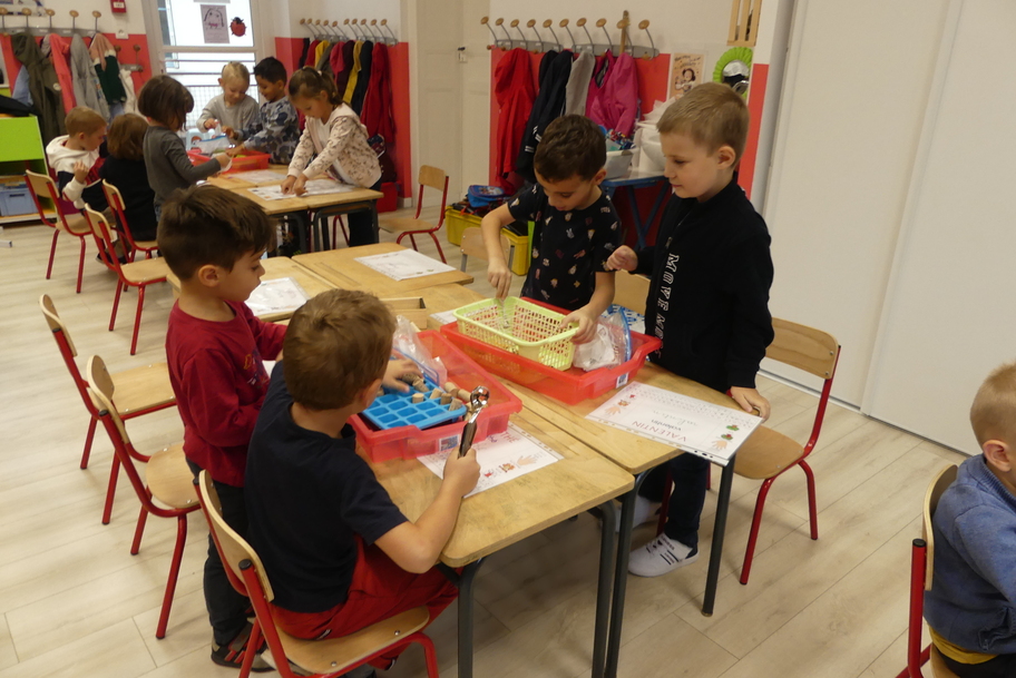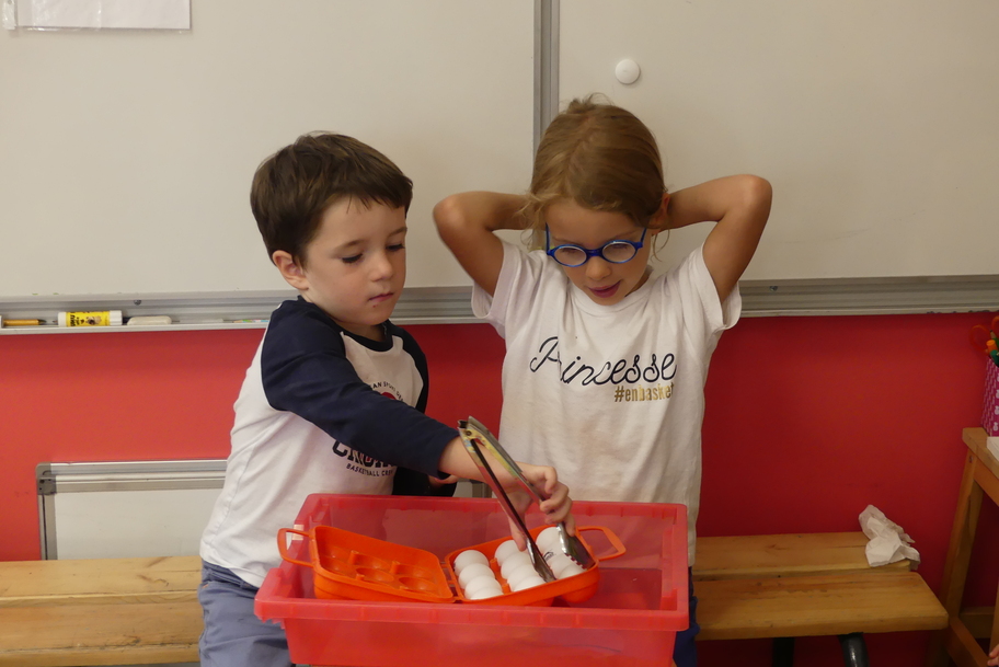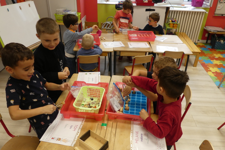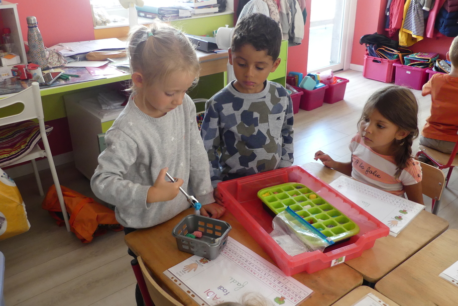 Nous avons commencé par les ateliers de découverte du monde de la matière et du vivant, avec beaucoup de jeux utilisant des pinces très diverses pour attraper des objets très différents. Ces manipulations aident à muscler la main et participent ainsi à une meilleure tenue du crayon pour l'écriture.