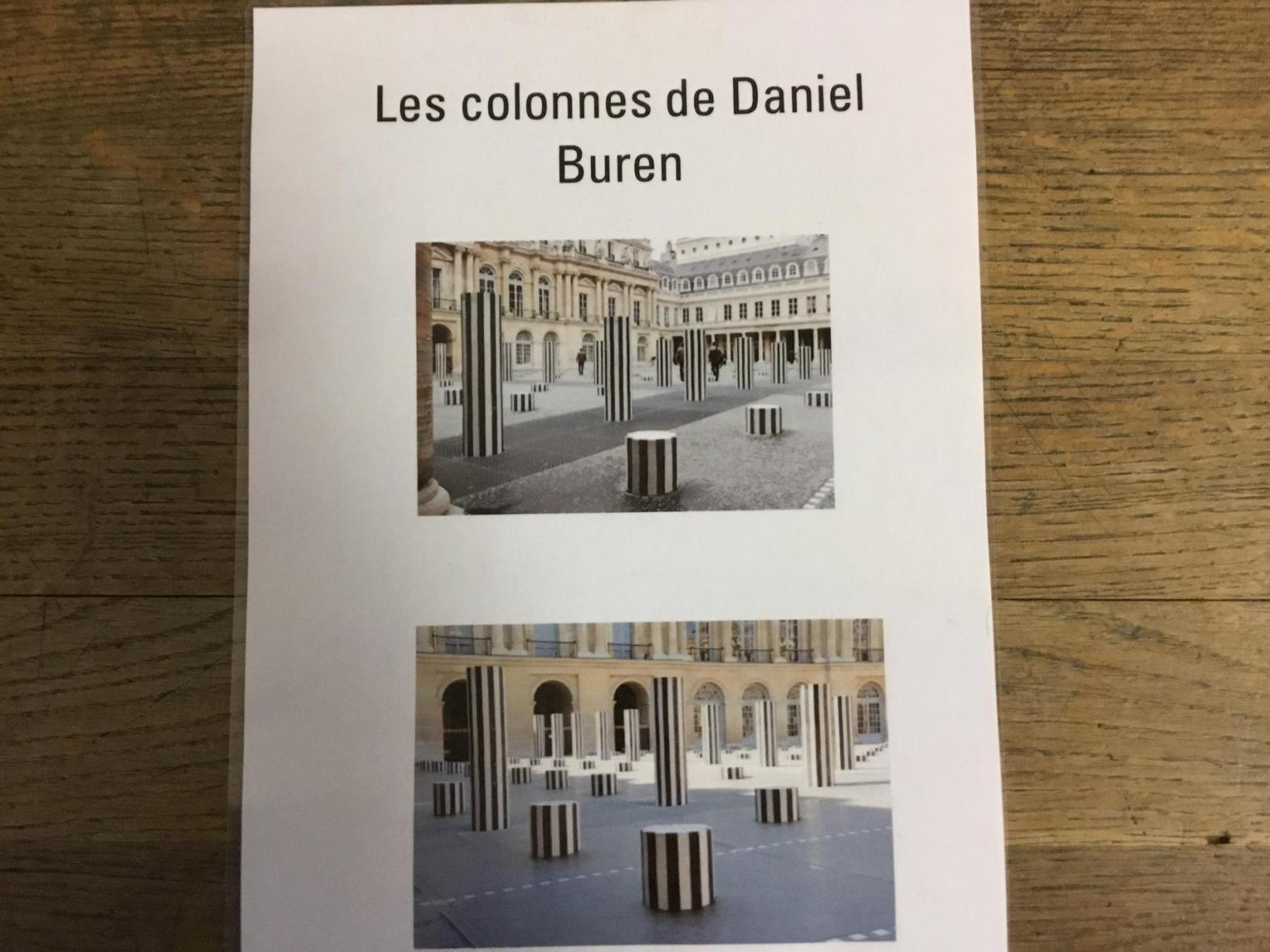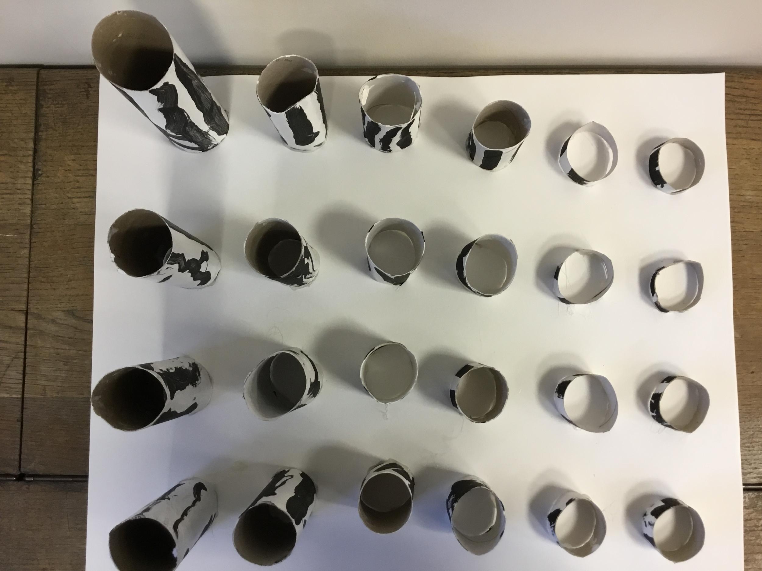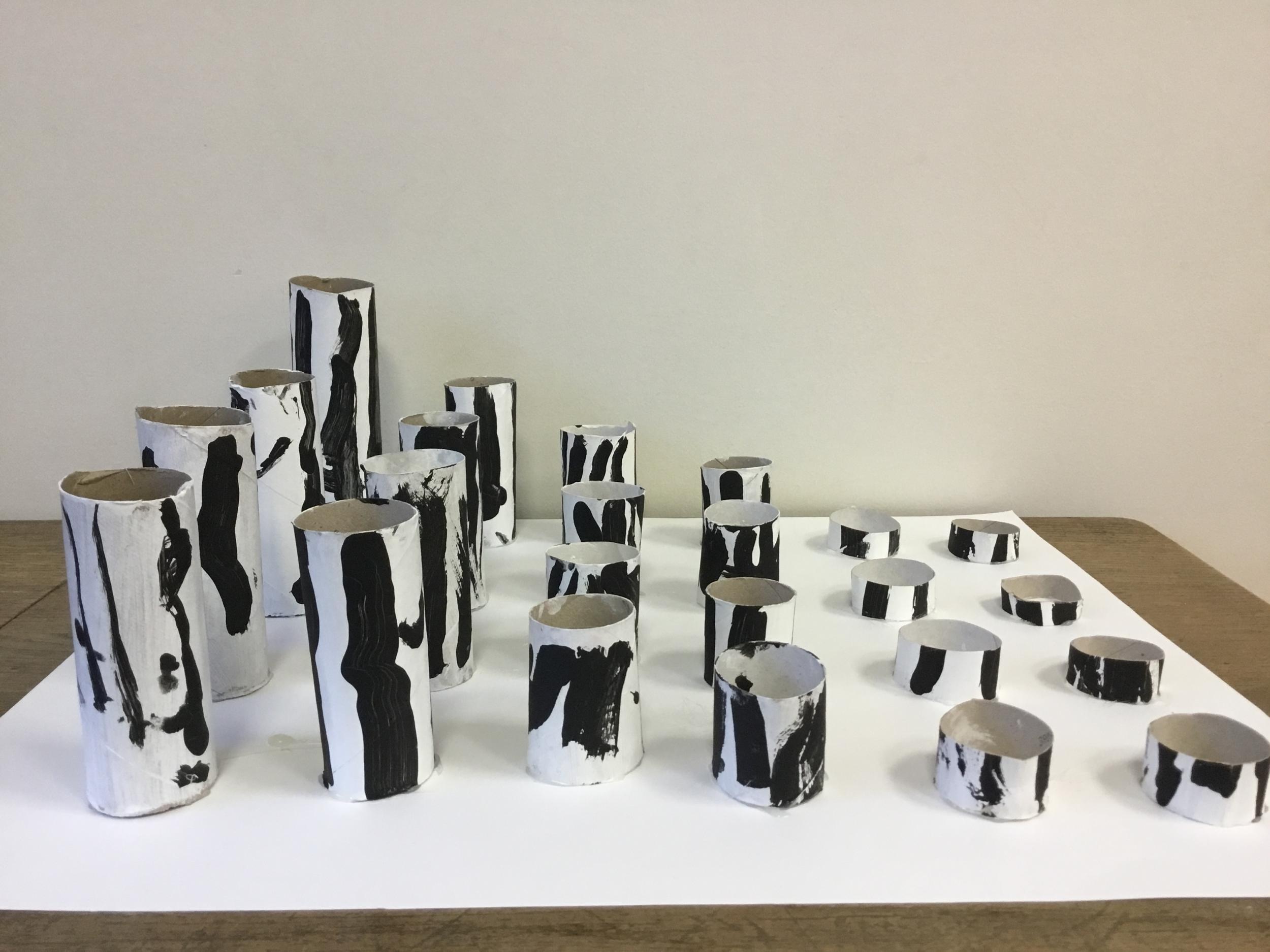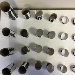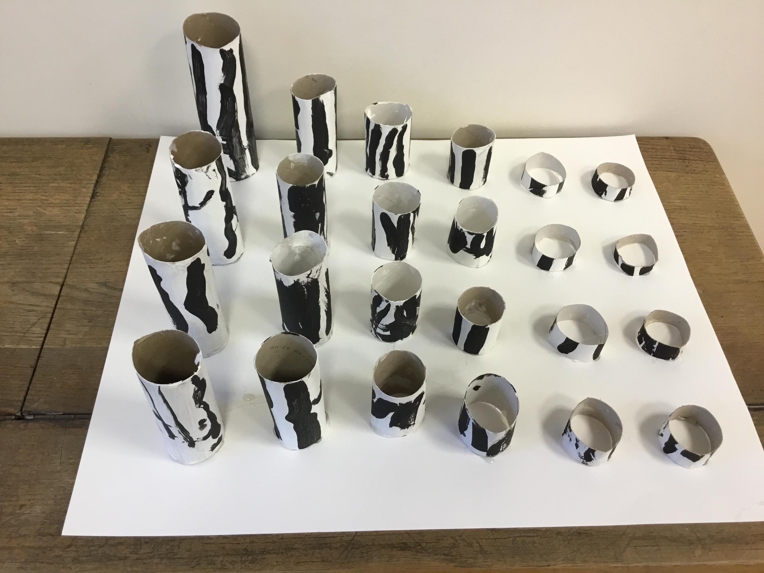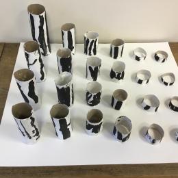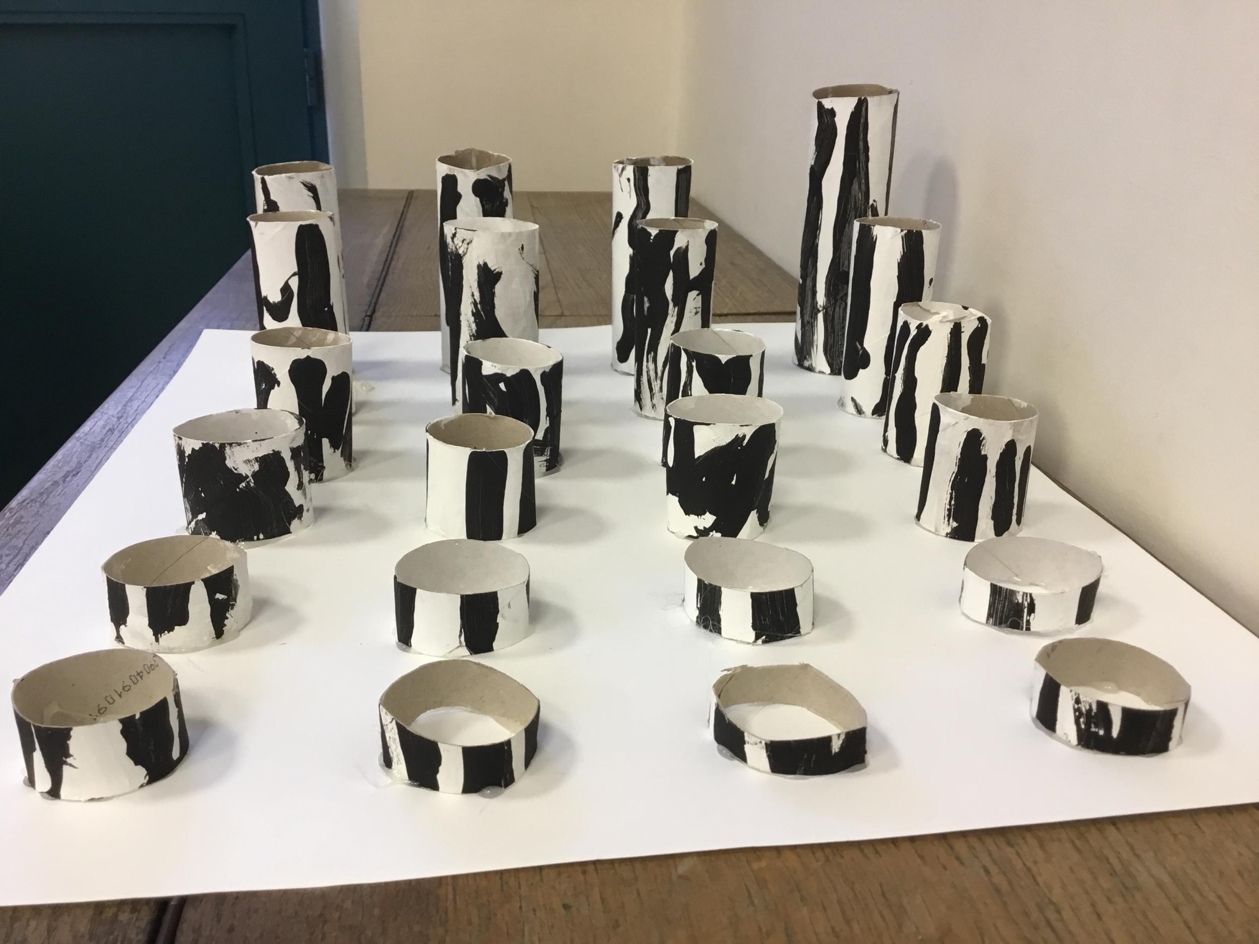 01/03/2020 Pour clôturer le travail sur le trait vertical les élèves ont travaillé à partir des colonnes de Buren. Ils ont peint en blanc des rouleaux de carton puis à l’aide d’un pinceau, ils ont tracé des lignes verticales noires.