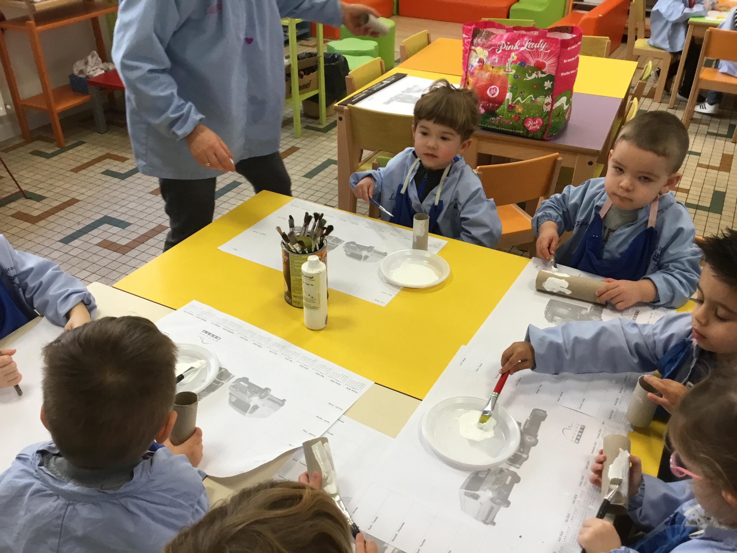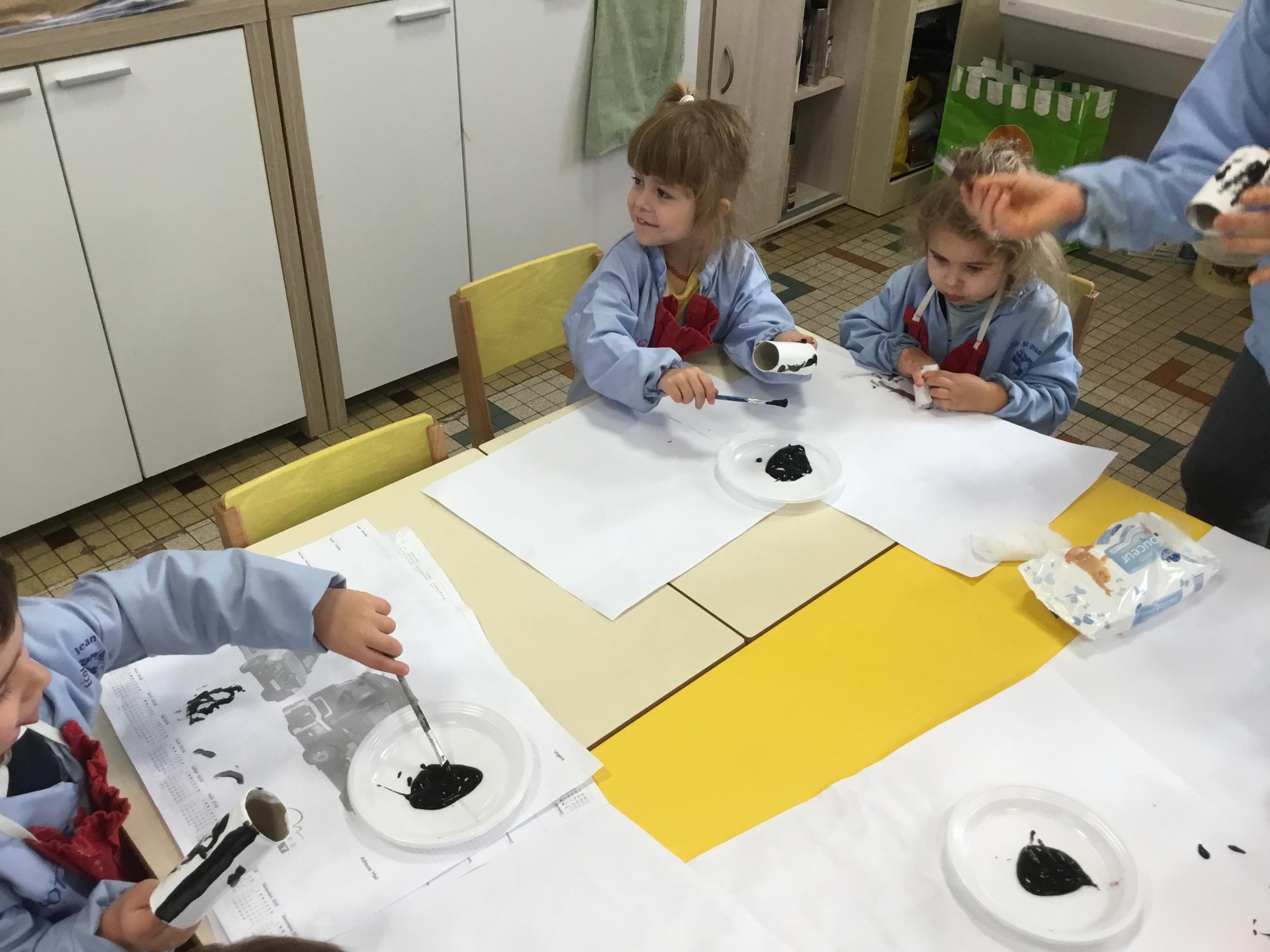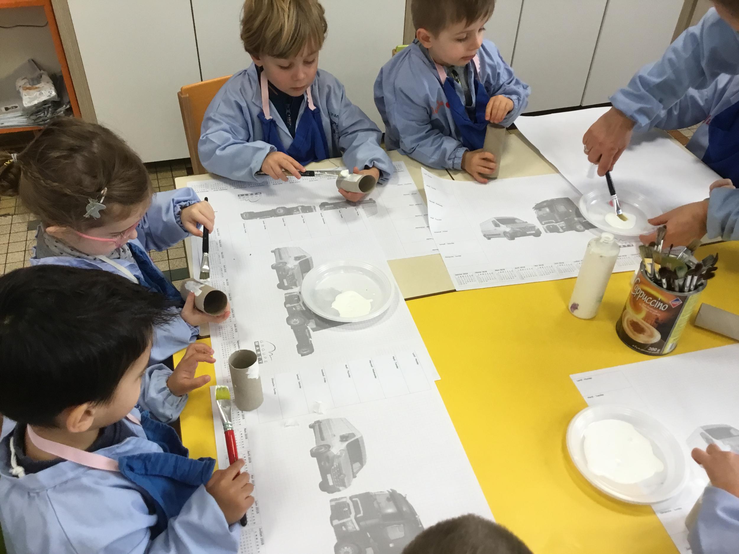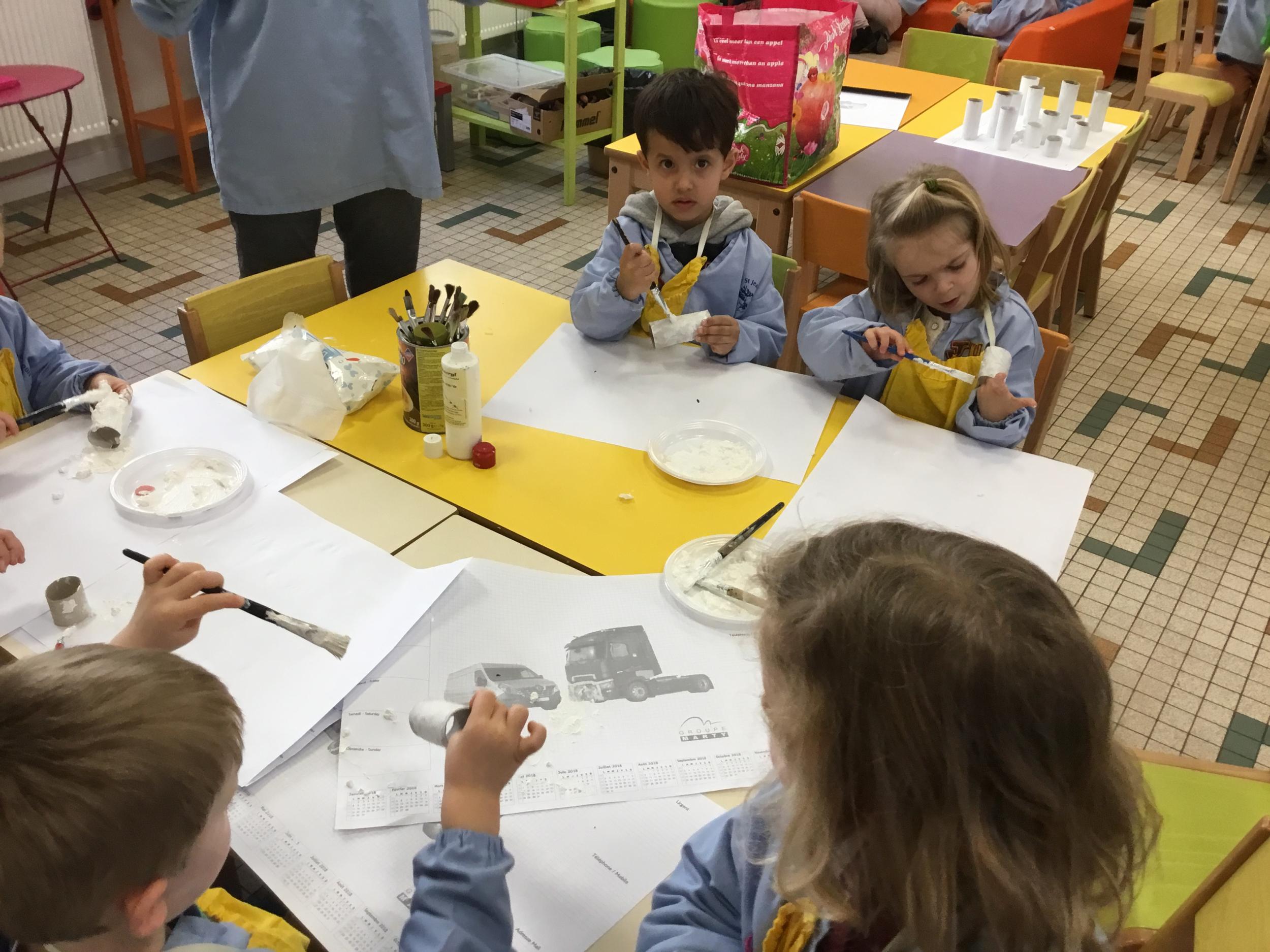 01/03/2020 Pour clôturer le travail sur le trait vertical les élèves ont travaillé à partir des colonnes de Buren. Ils ont peint en blanc des rouleaux de carton puis à l’aide d’un pinceau, ils ont tracé des lignes verticales noires.