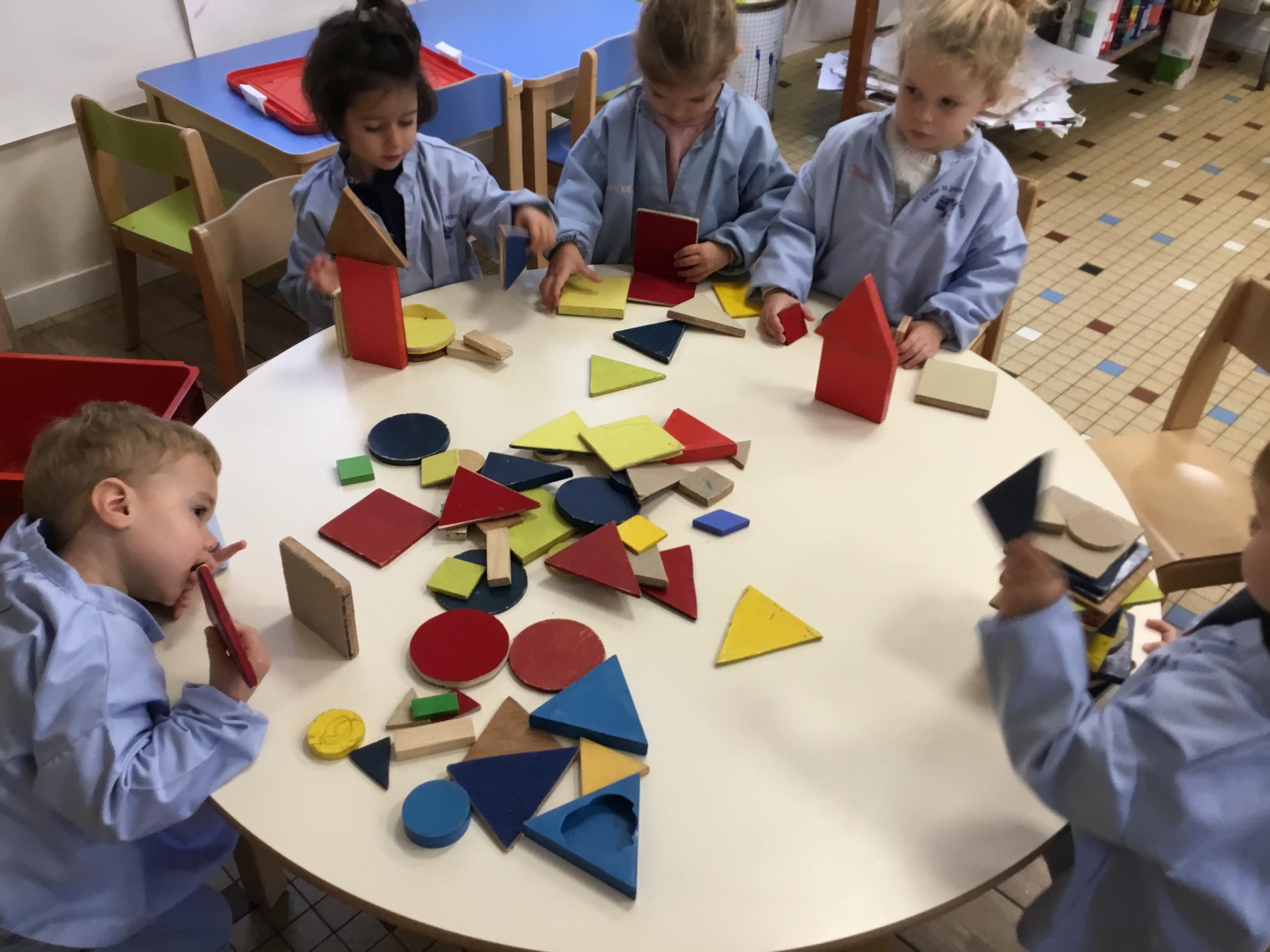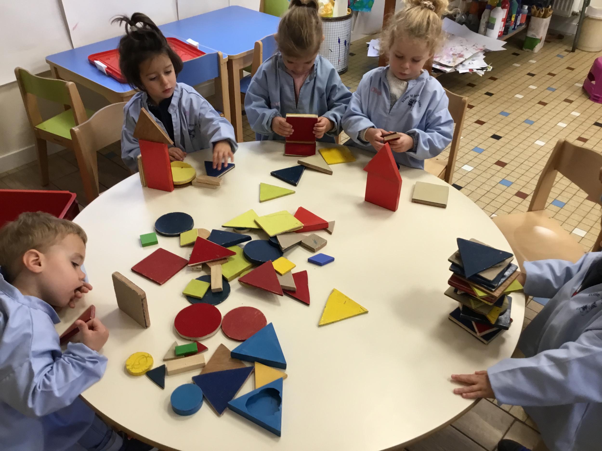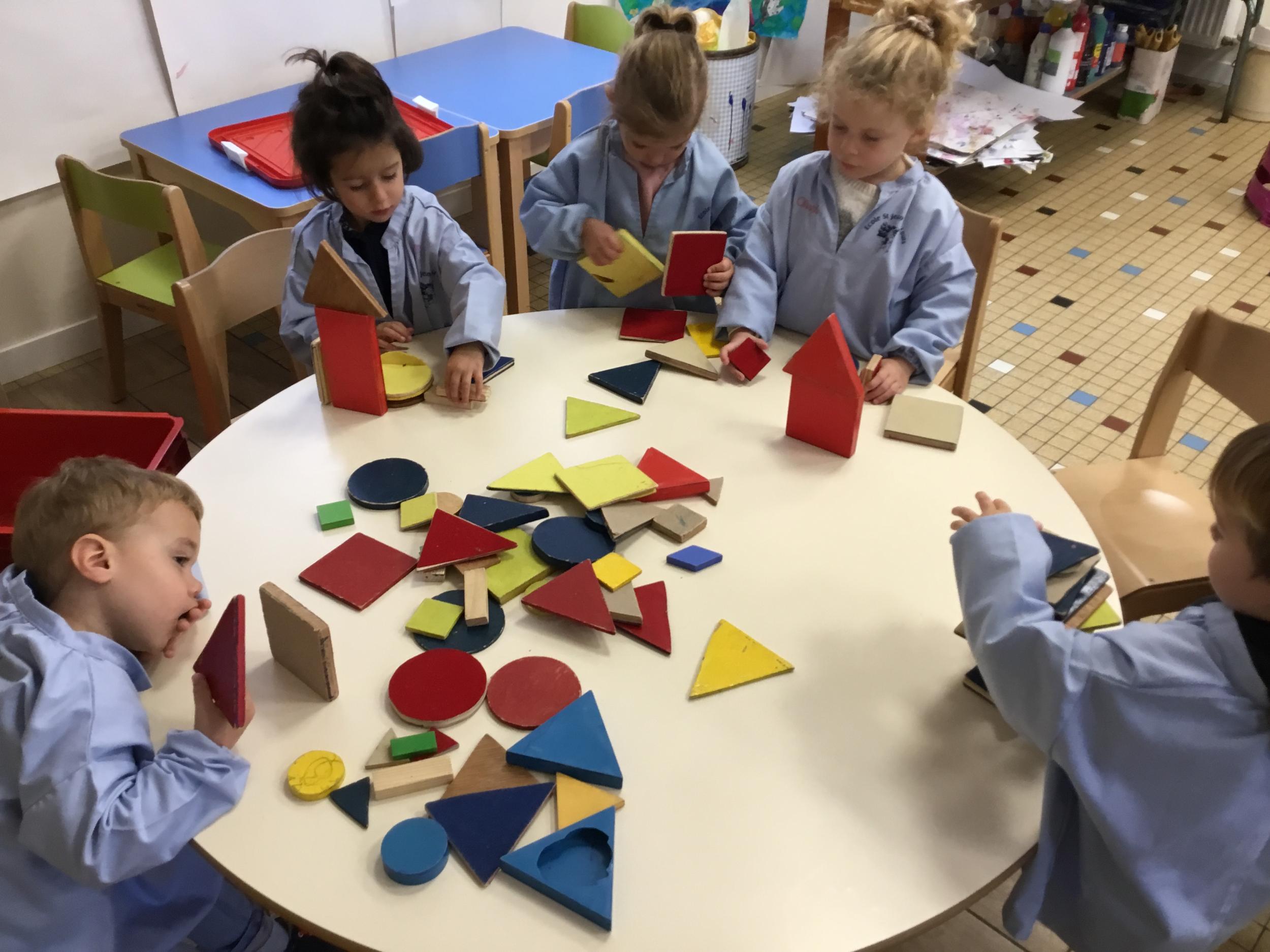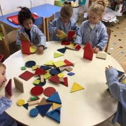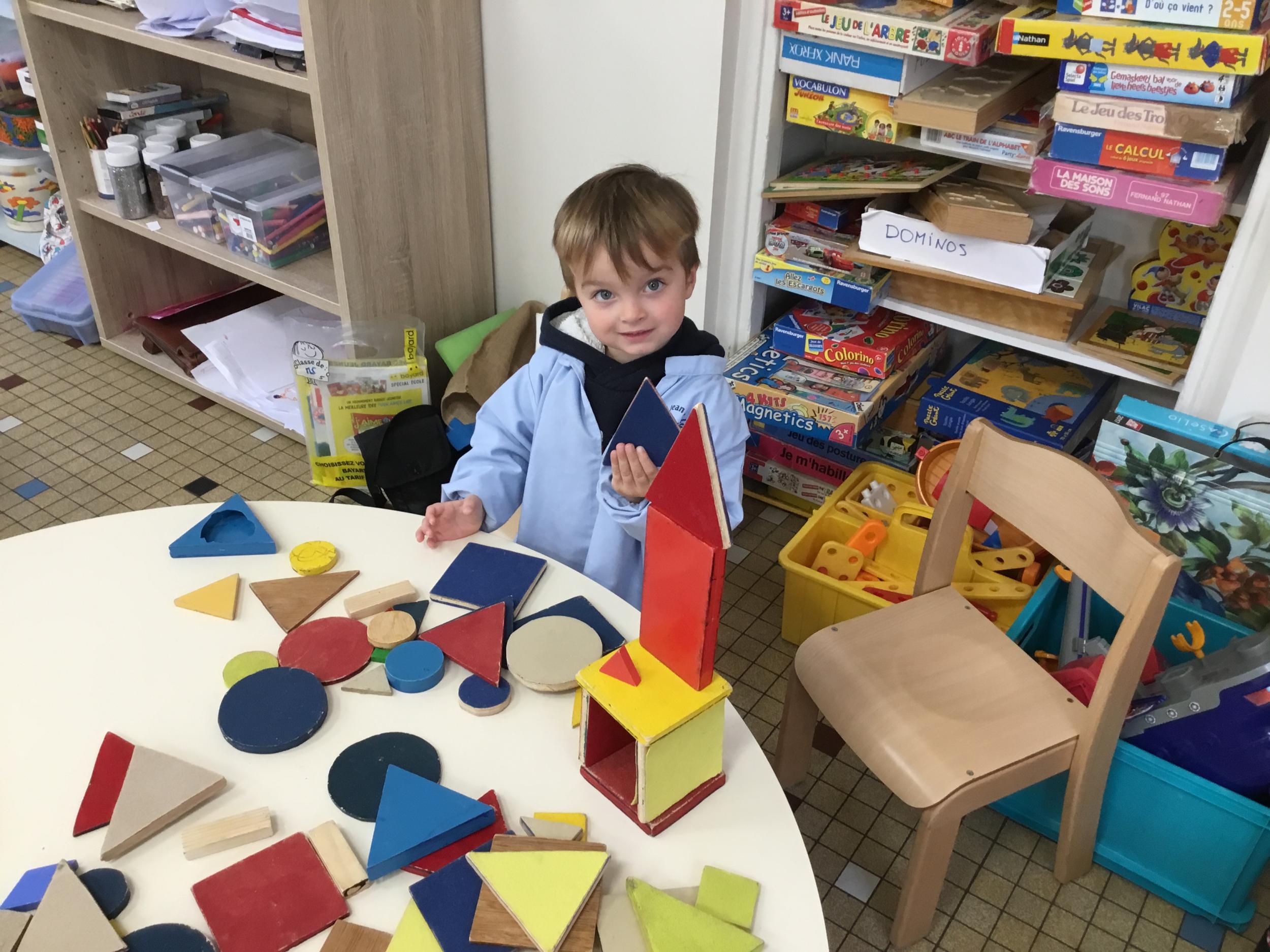 Avec les petites sections , nous avons joué à fabriquer des châteaux avec des blocs logiques. Ils devaient une fois la fabrication réalisée, présenter oralement leur production en la décrivant et en nommant les formes géométriques utilisées et les couleurs. Ils devaient aussi expliquer aux autres comment ils s’y étaient pris.