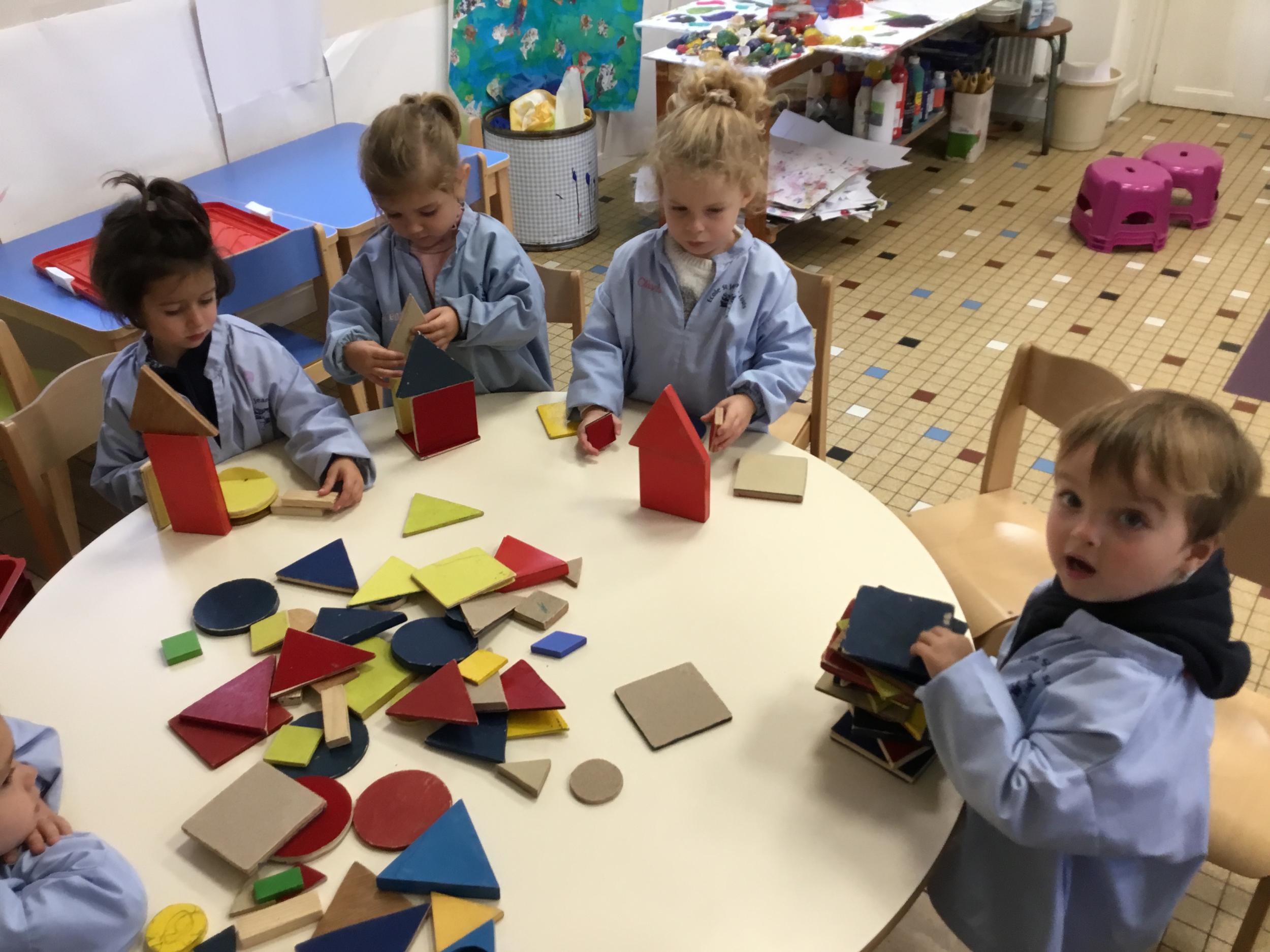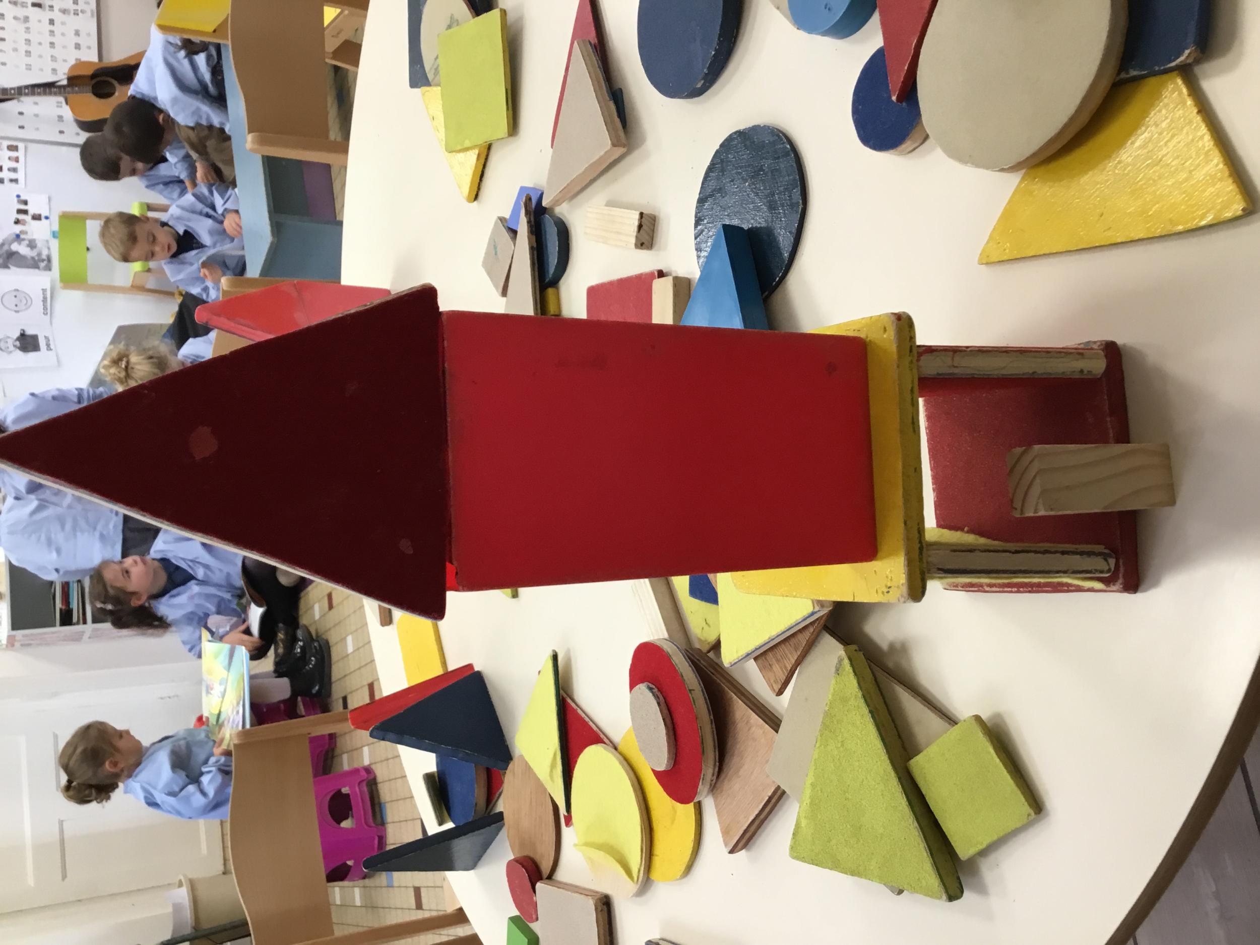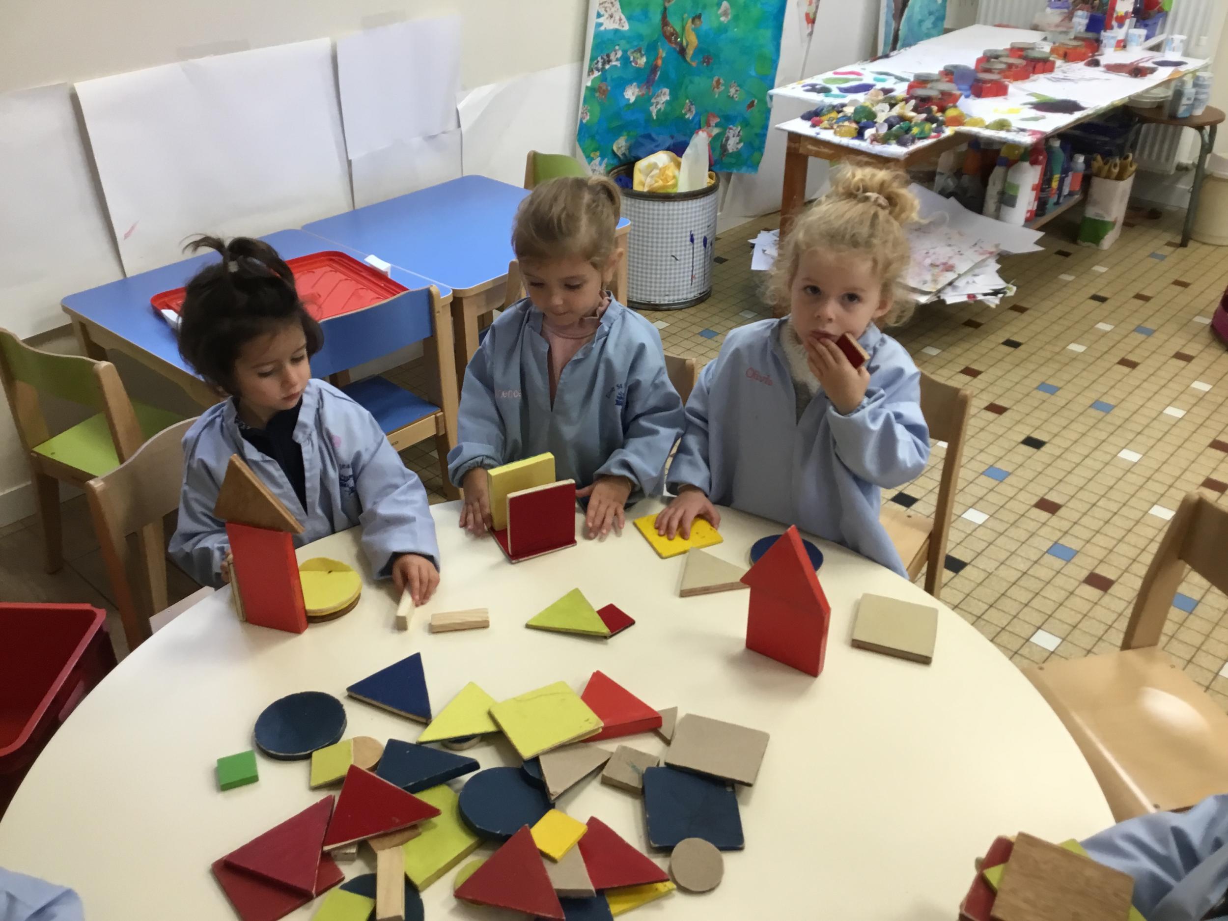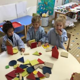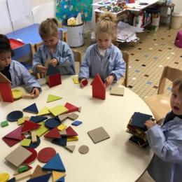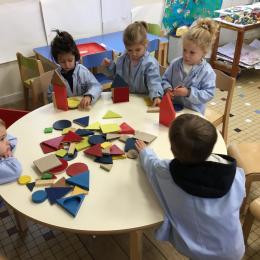 Avec les petites sections , nous avons joué à fabriquer des châteaux avec des blocs logiques. Ils devaient une fois la fabrication réalisée, présenter oralement leur production en la décrivant et en nommant les formes géométriques utilisées et les couleurs. Ils devaient aussi expliquer aux autres comment ils s’y étaient pris.