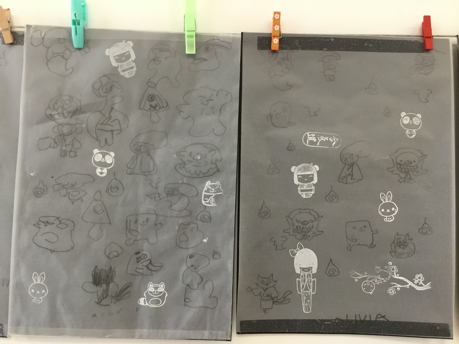 En arts visuels, nous avons travaillé sur les Yokais. Les élèves disposaient de divers motifs qu'ils pouvaient décalquer à leur guise (découverte pour eux du papier calque). Puis ils ont tamponné des personnages, objets... japonnais que la maîtresse possédait à l'aide d'encre blanche pour créer un contraste et faire ressortir ces motifs sur le papier calque. Le tout a été placé sur un fond noir, faisant ressortir les motifs au crayon gris et les tampons blancs.