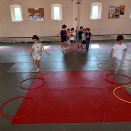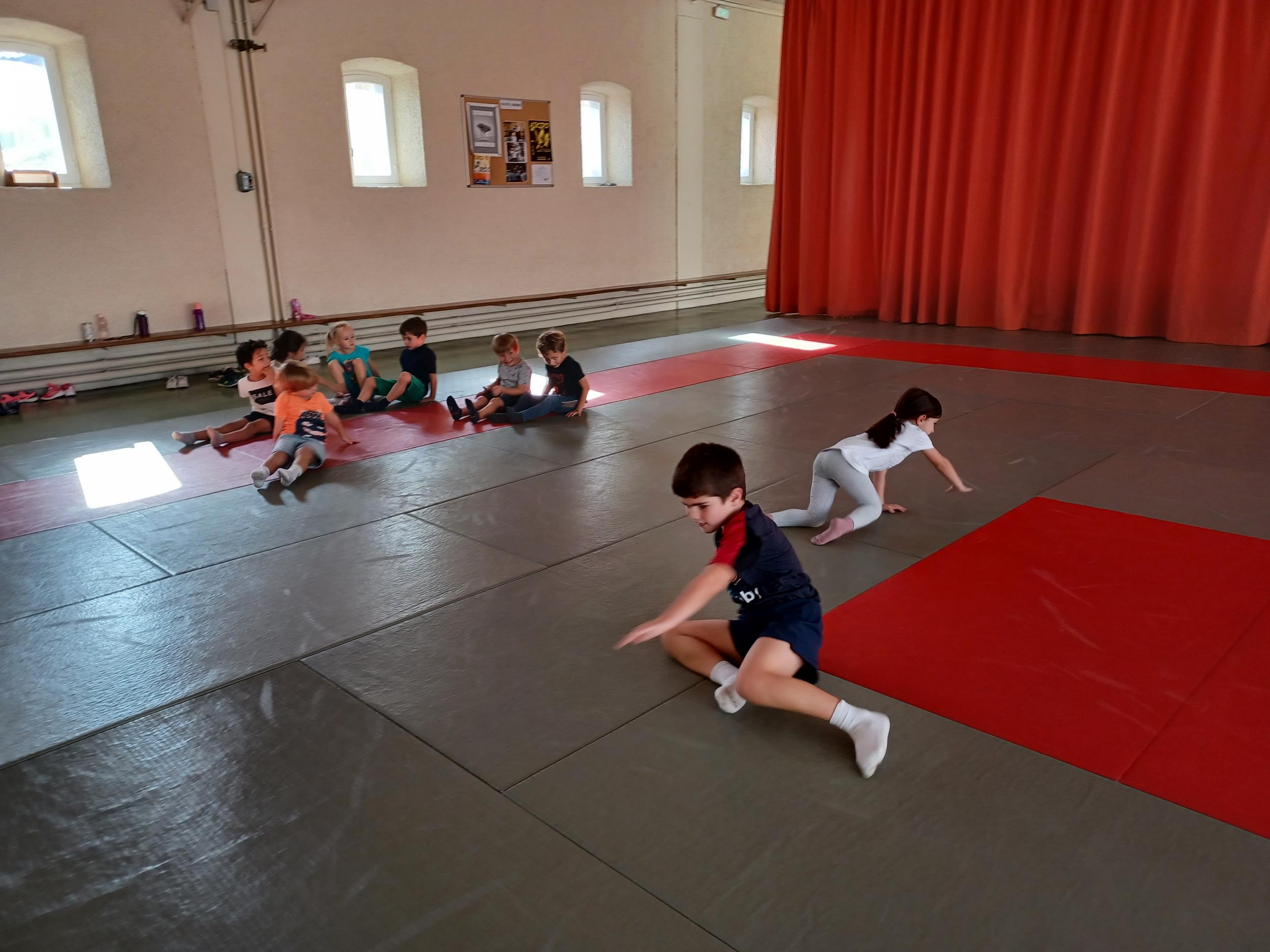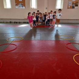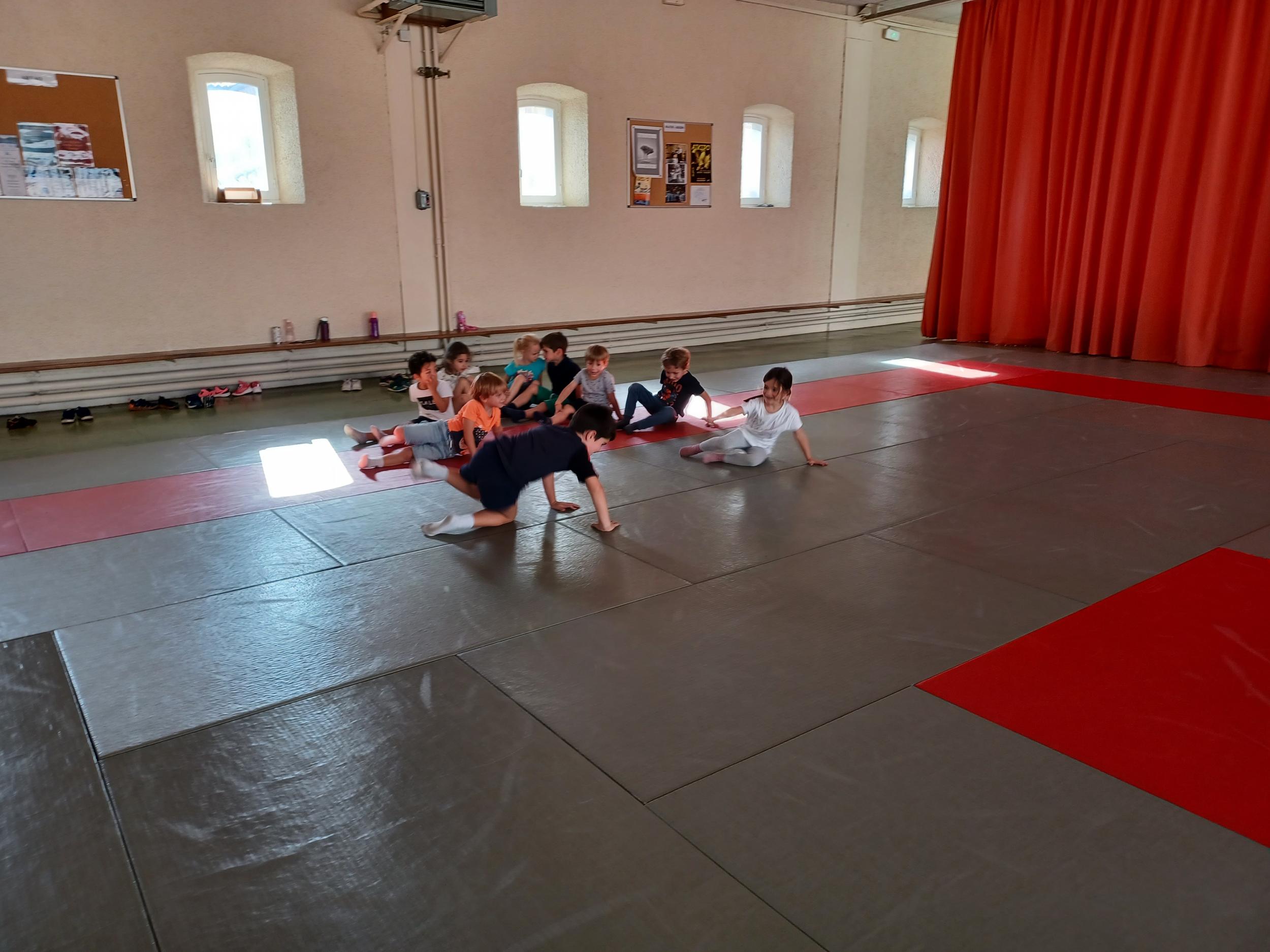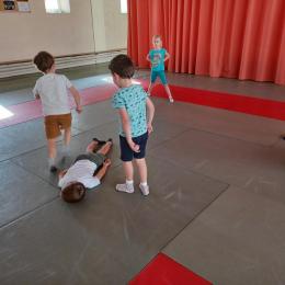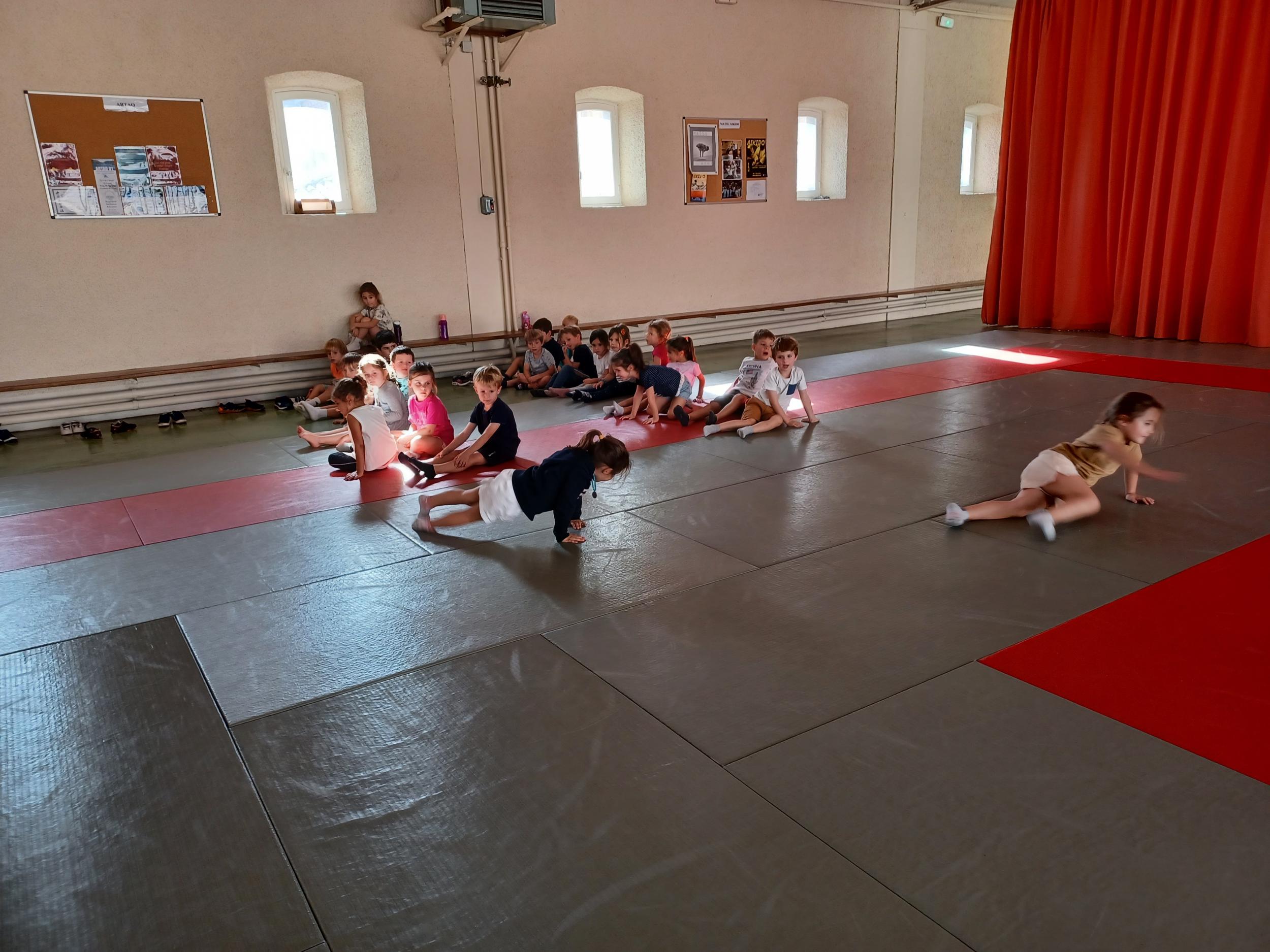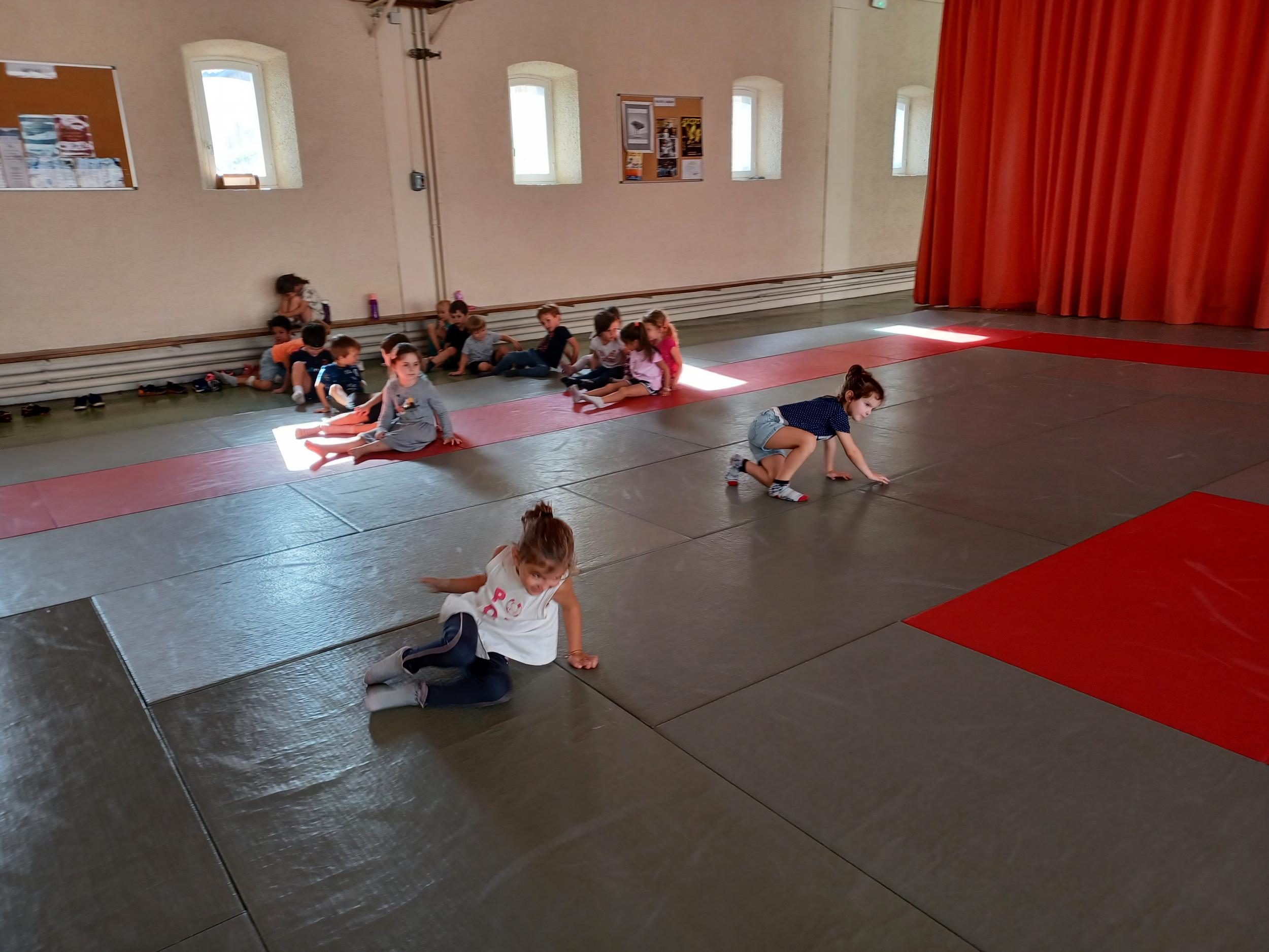 Tous les mardis après-midi, les grandes sections partent à la salle de sport. Nous avons travaillé, lors de ces premiers mois ,différentes façons de se déplacer, sur 3 niveaux : allongé, assis , et debout.