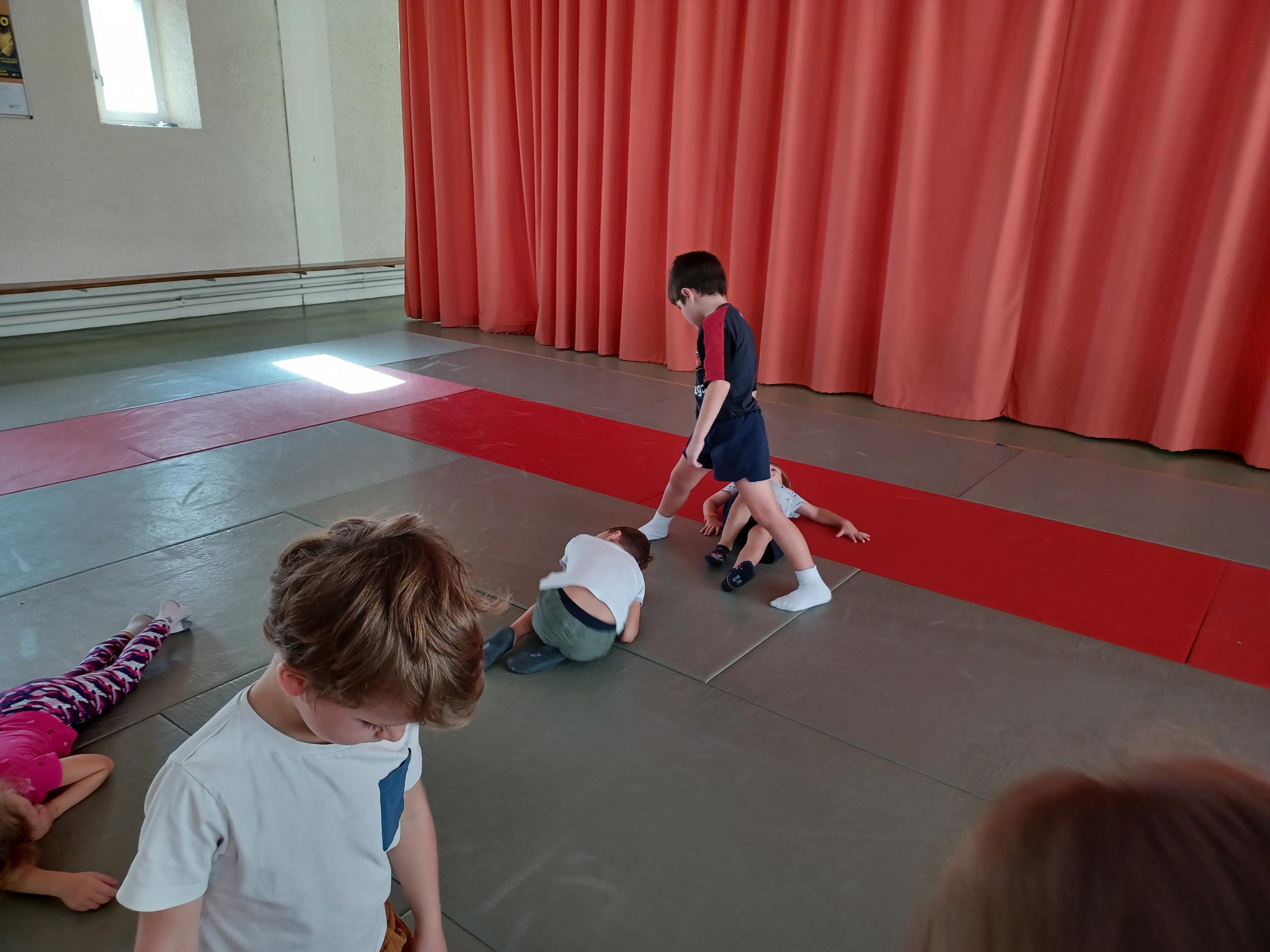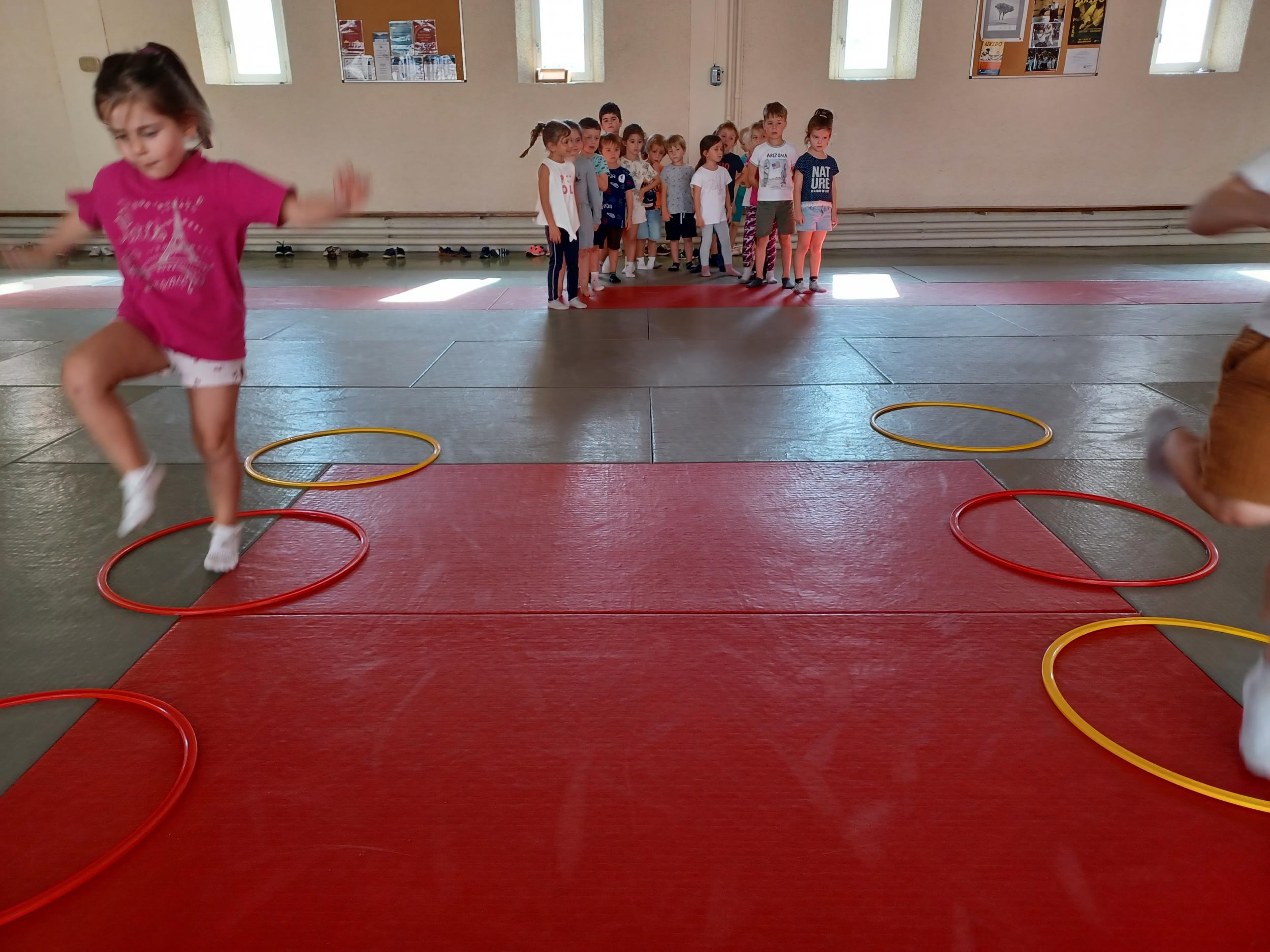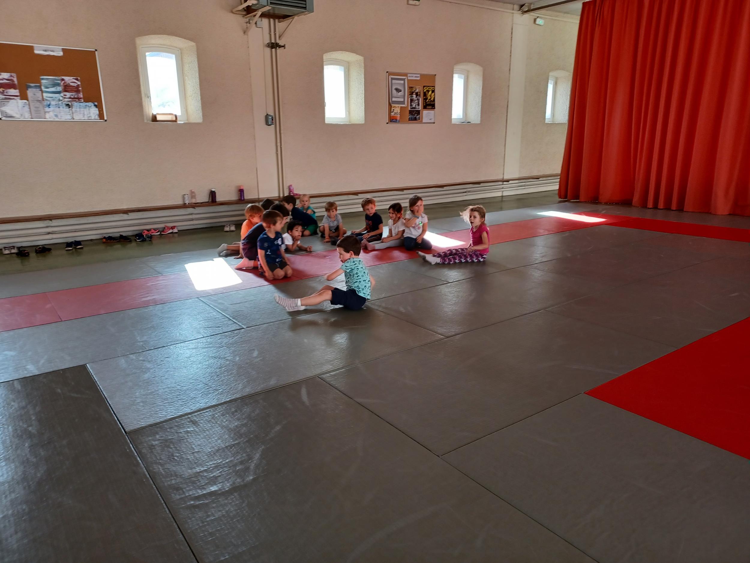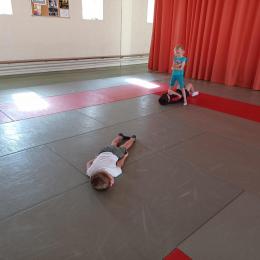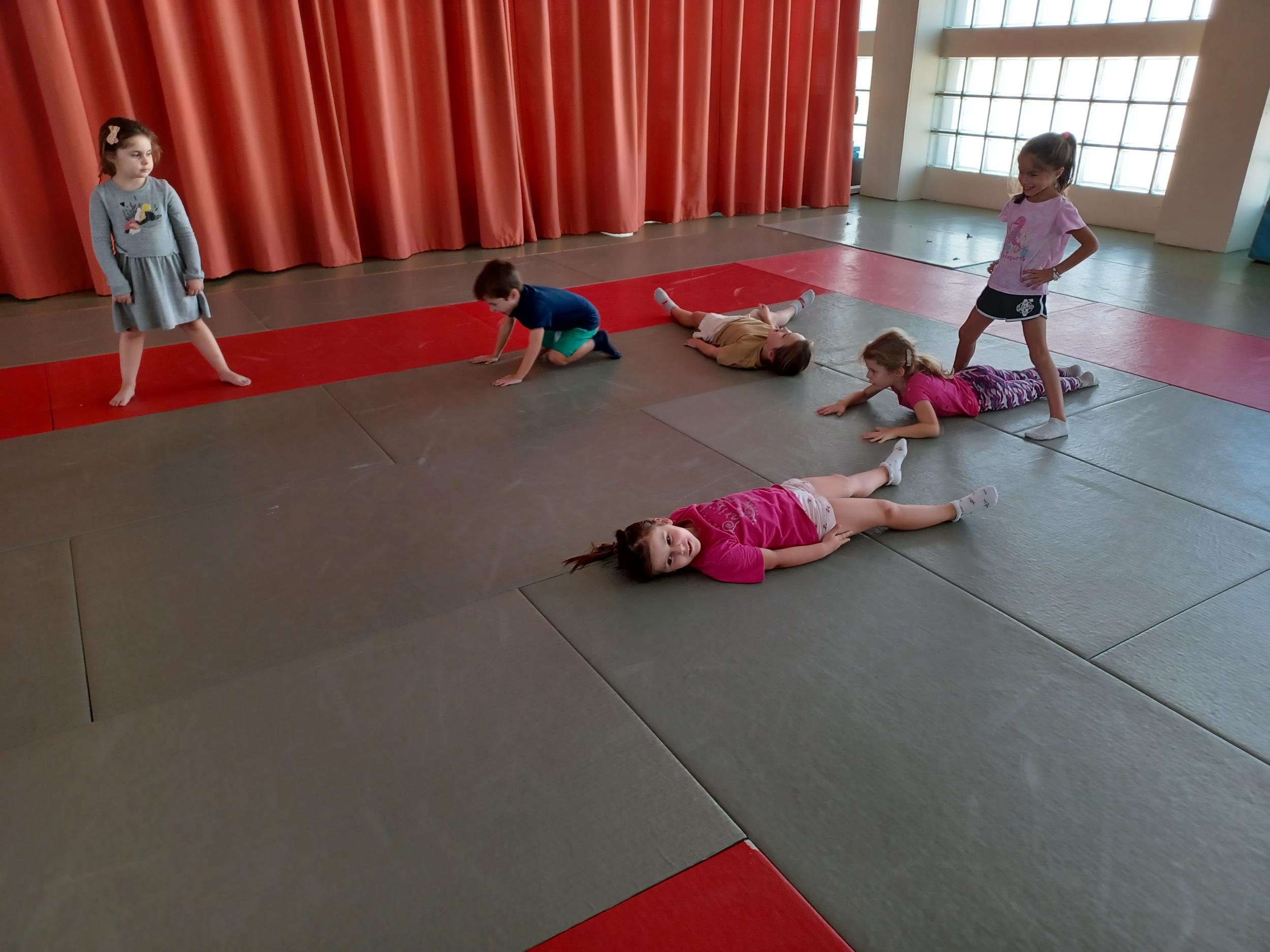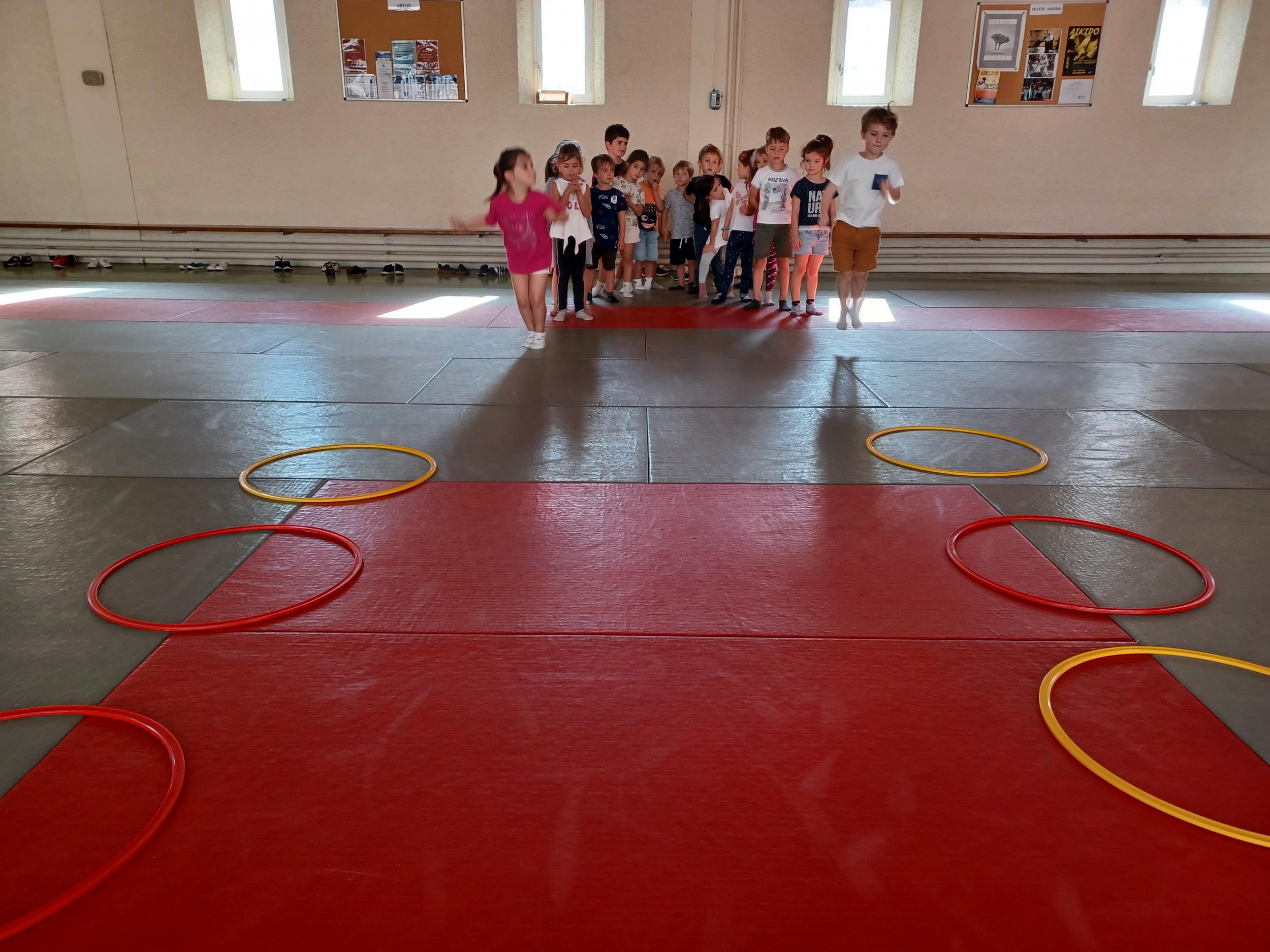 Tous les mardis après-midi, les grandes sections partent à la salle de sport. Nous avons travaillé, lors de ces premiers mois ,différentes façons de se déplacer, sur 3 niveaux : allongé, assis , et debout.