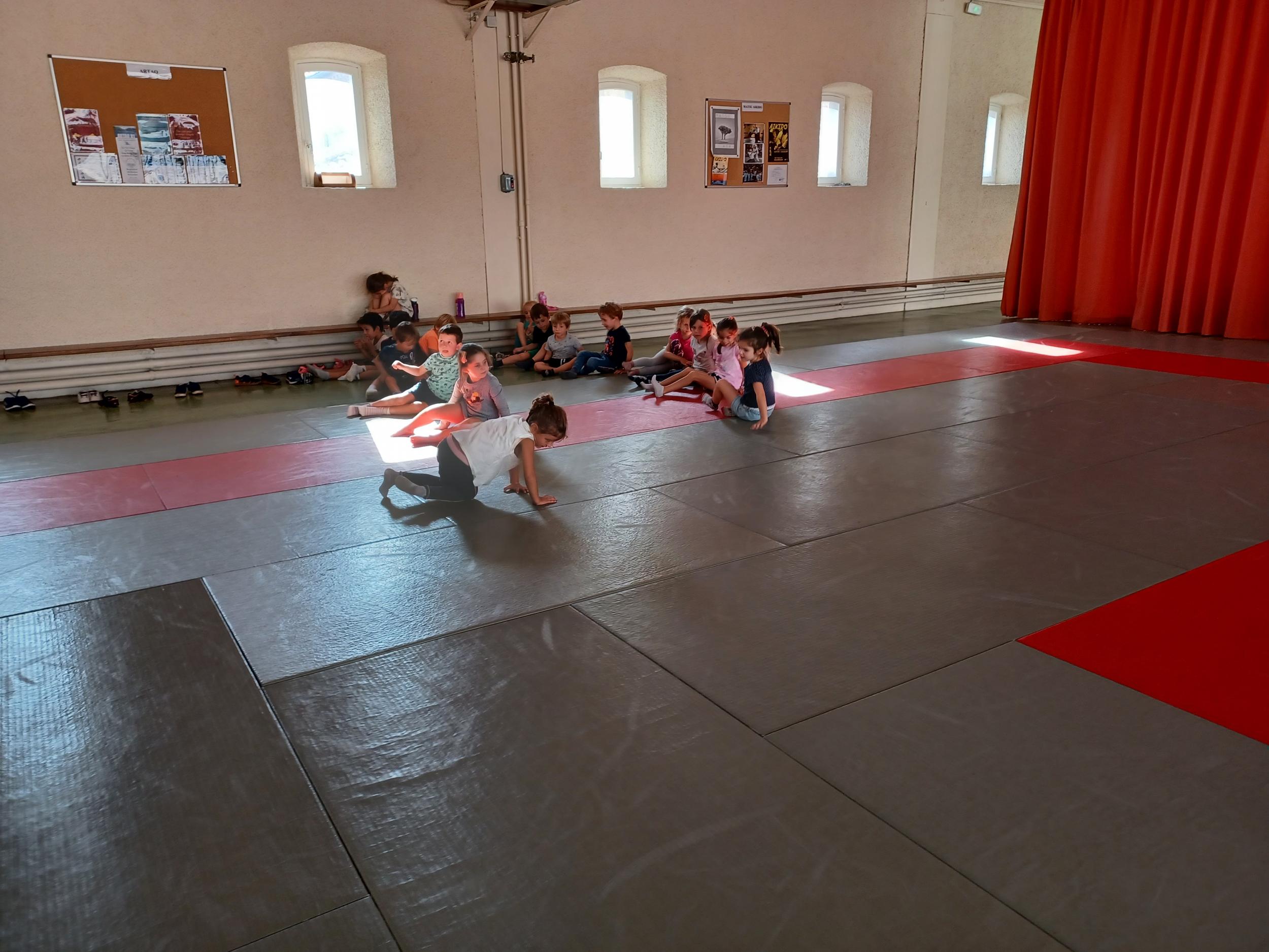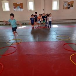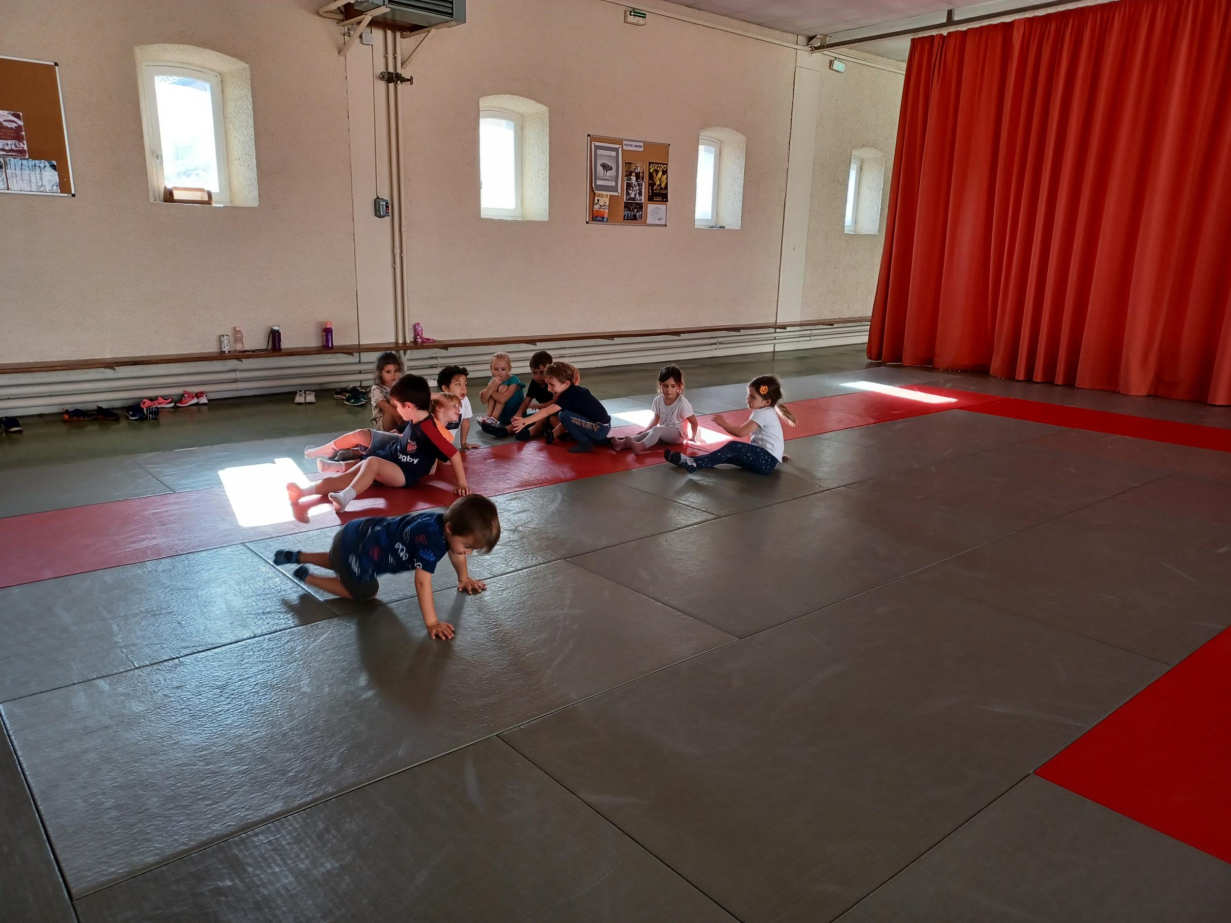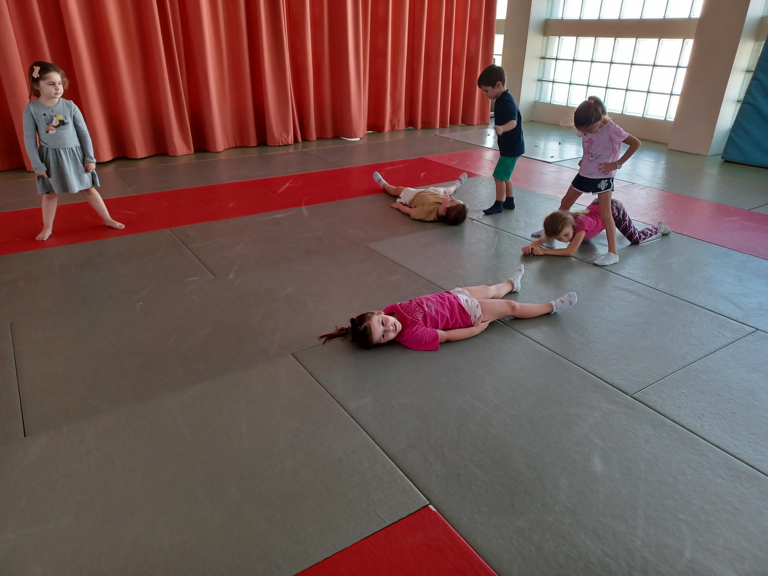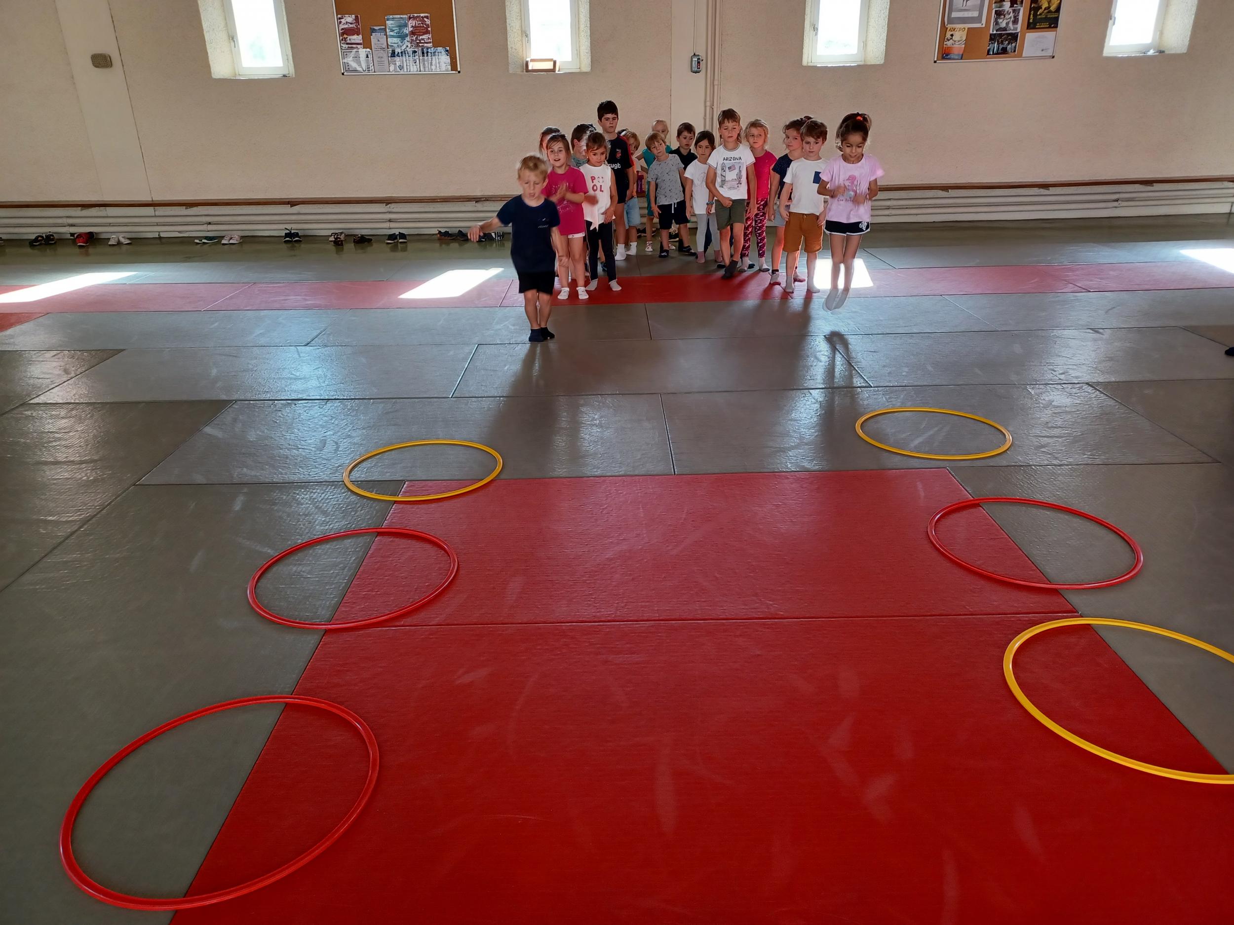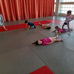 Tous les mardis après-midi, les grandes sections partent à la salle de sport. Nous avons travaillé, lors de ces premiers mois ,différentes façons de se déplacer, sur 3 niveaux : allongé, assis , et debout.