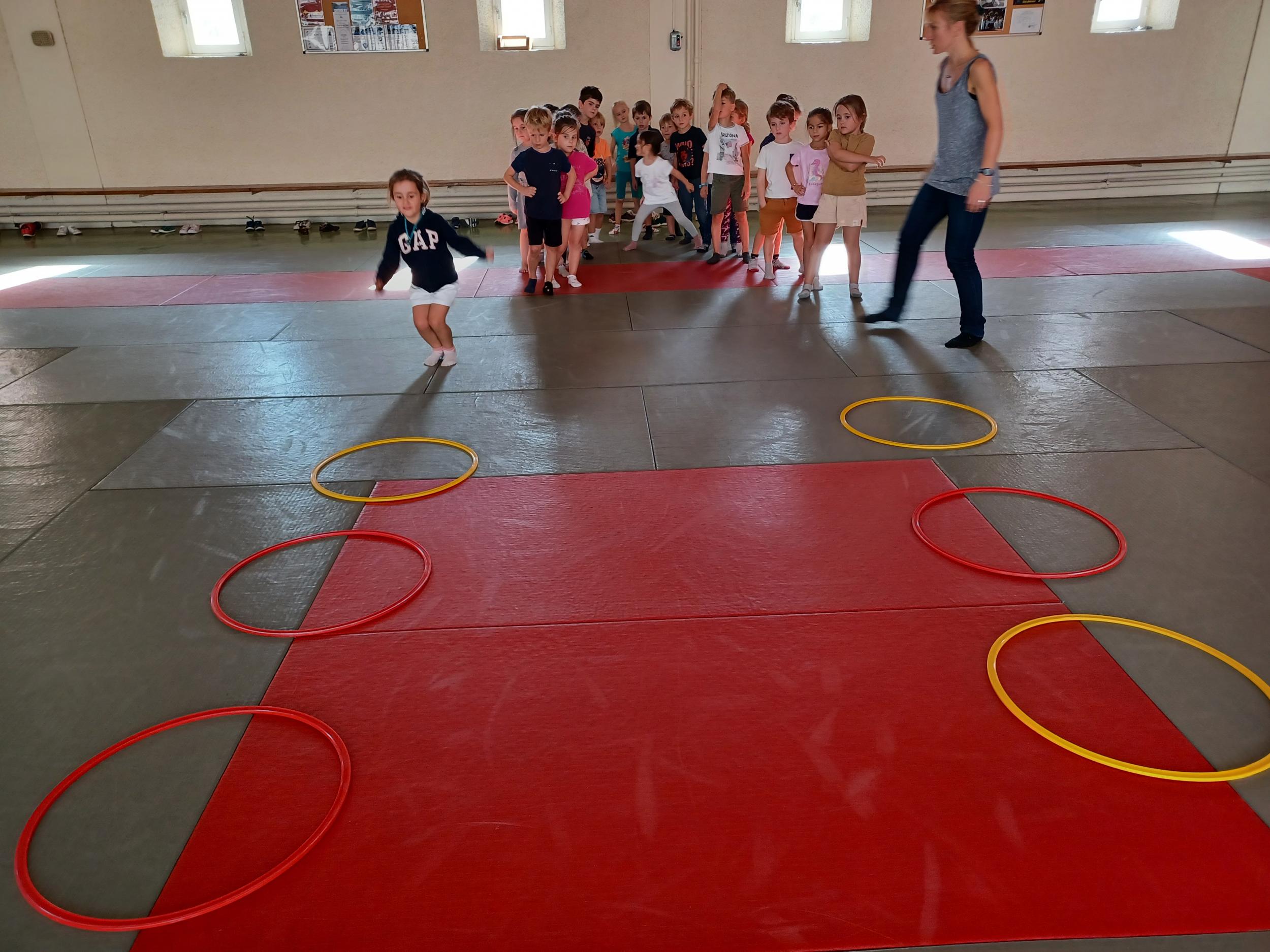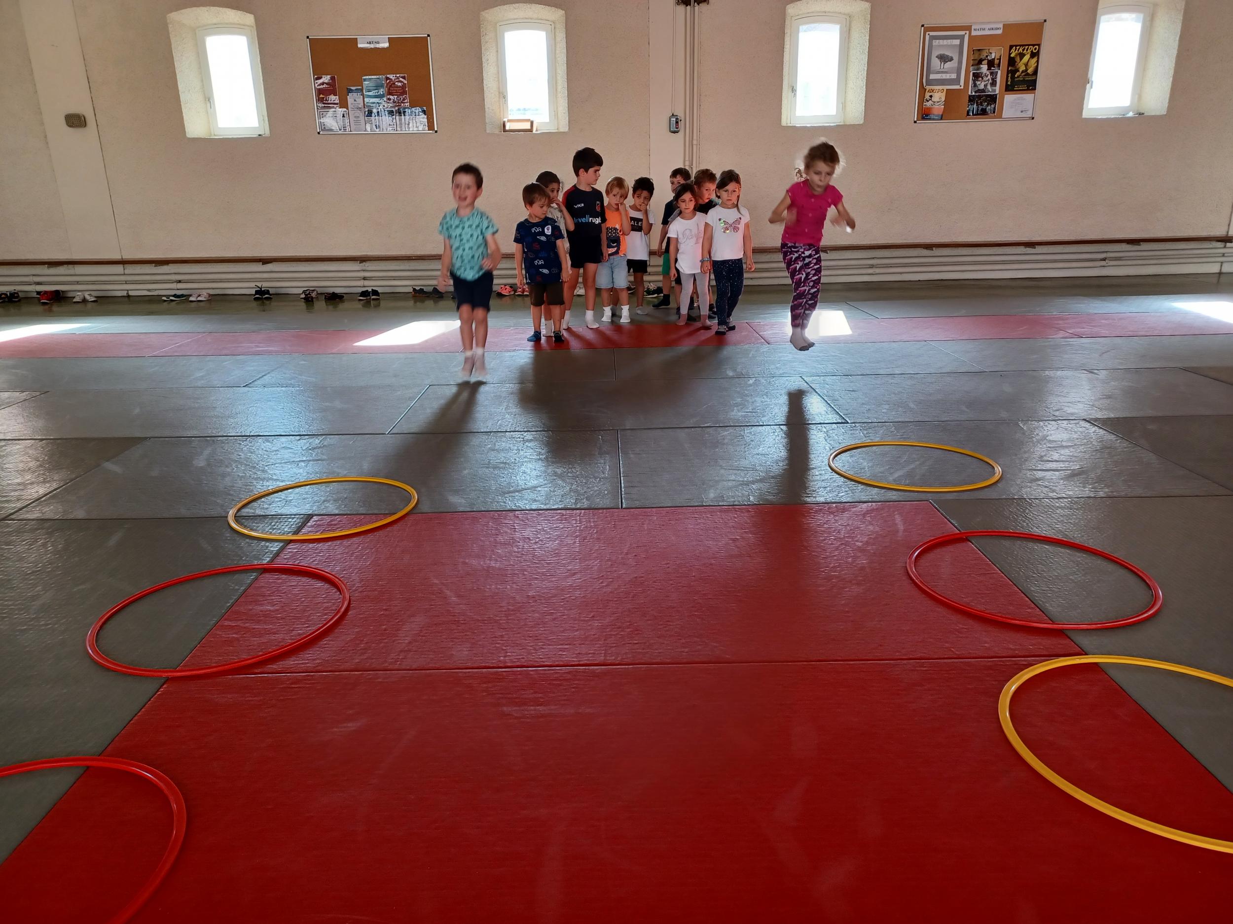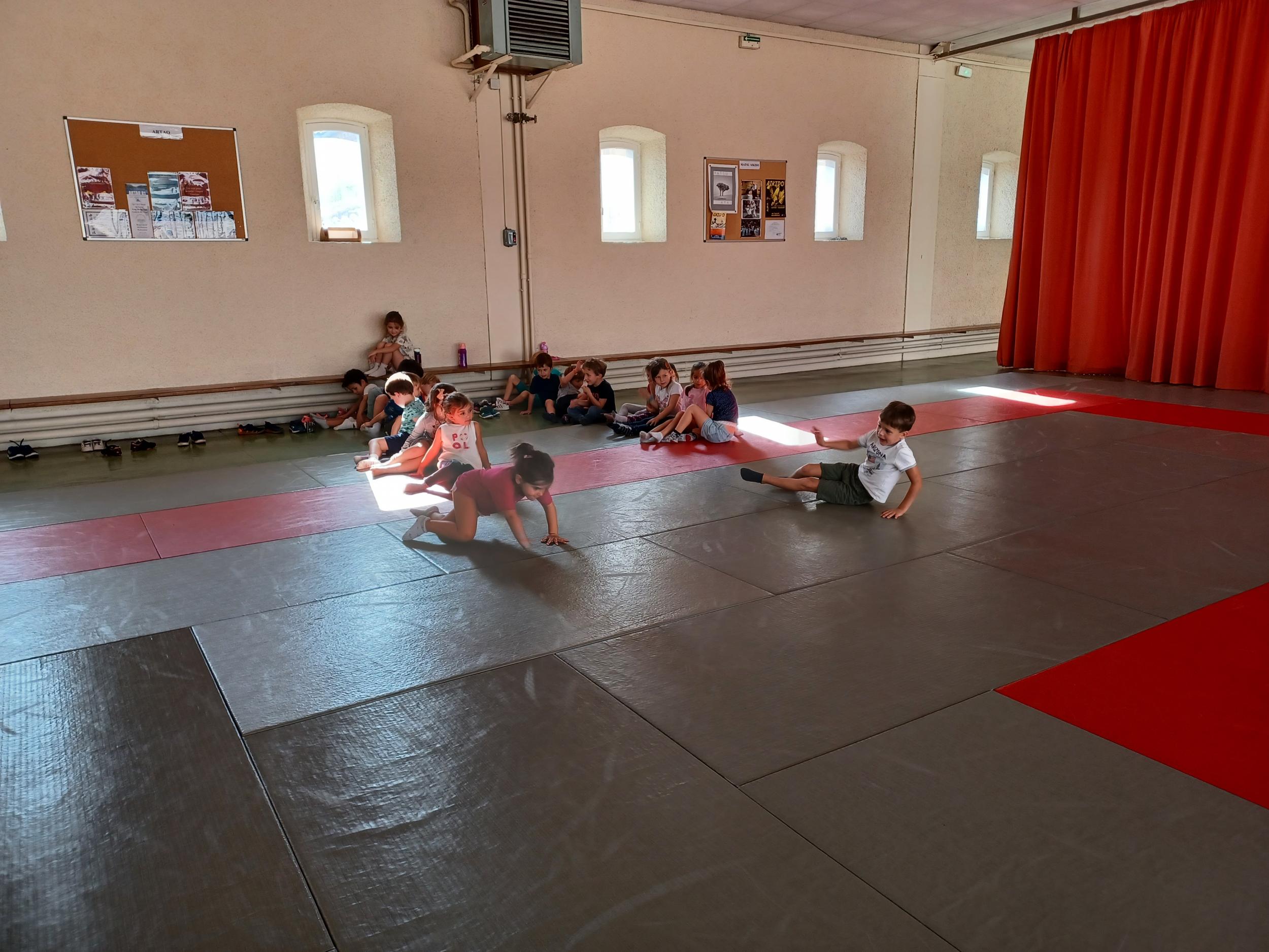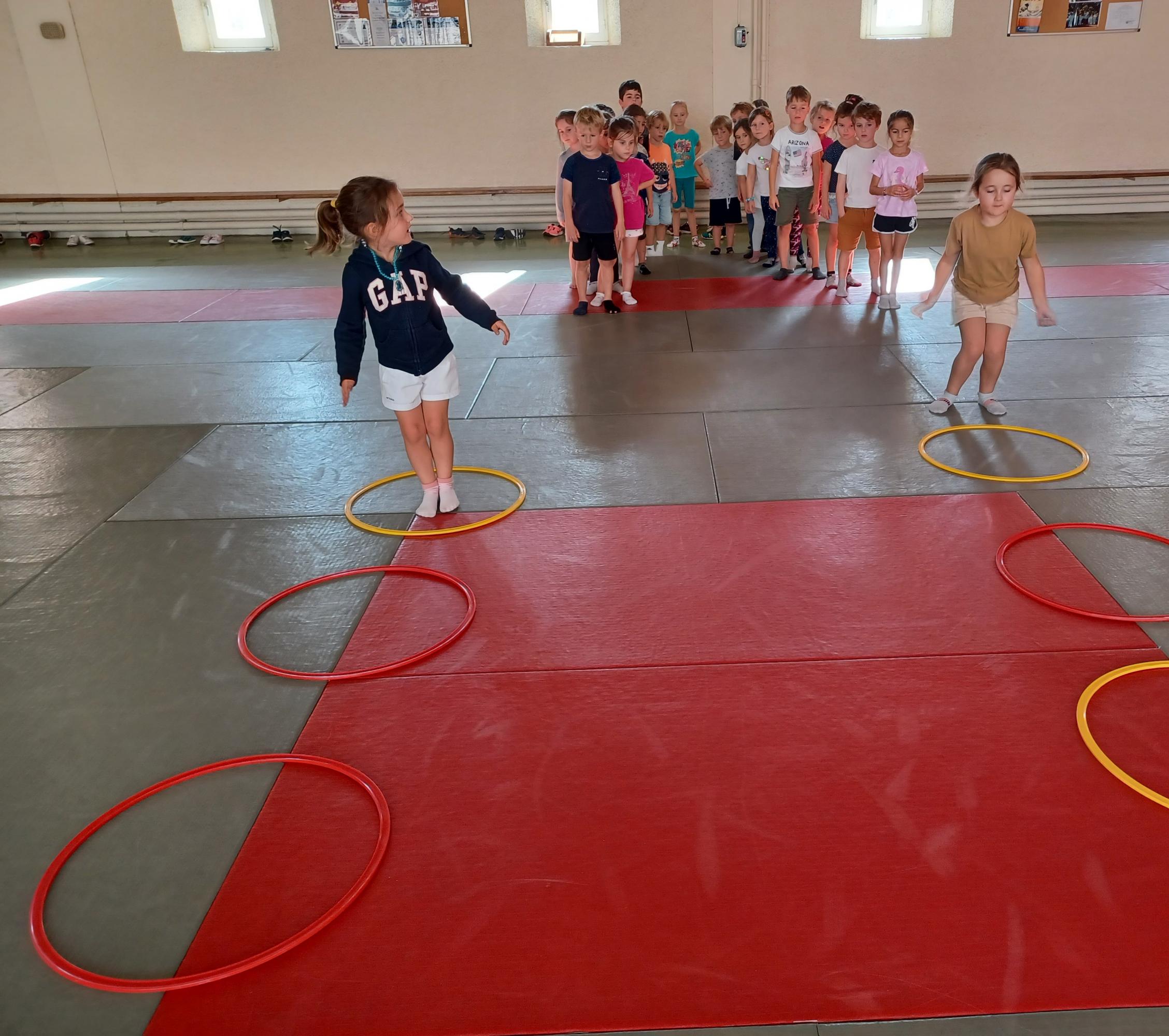 Tous les mardis après-midi, les grandes sections partent à la salle de sport. Nous avons travaillé, lors de ces premiers mois ,différentes façons de se déplacer, sur 3 niveaux : allongé, assis , et debout.