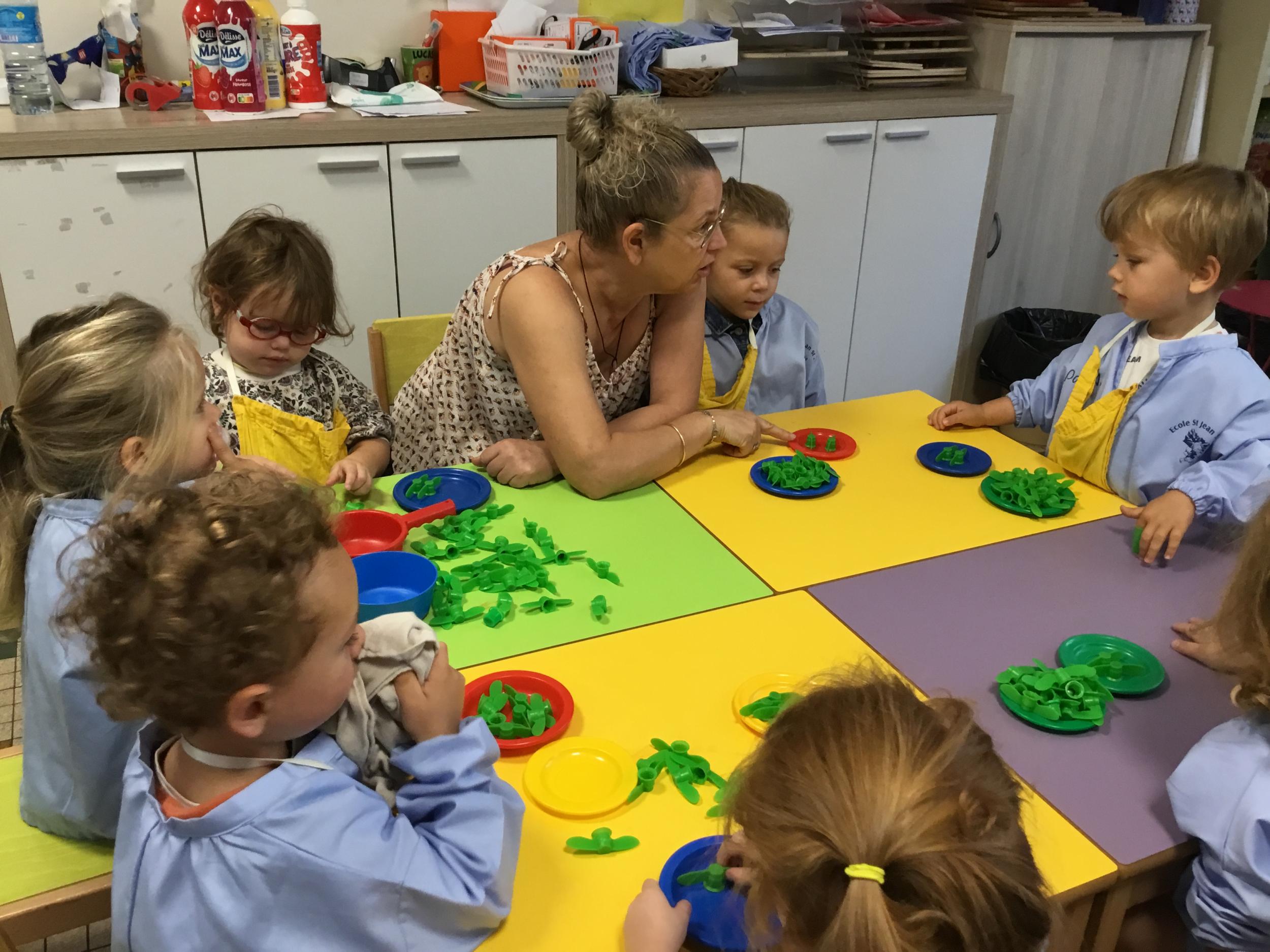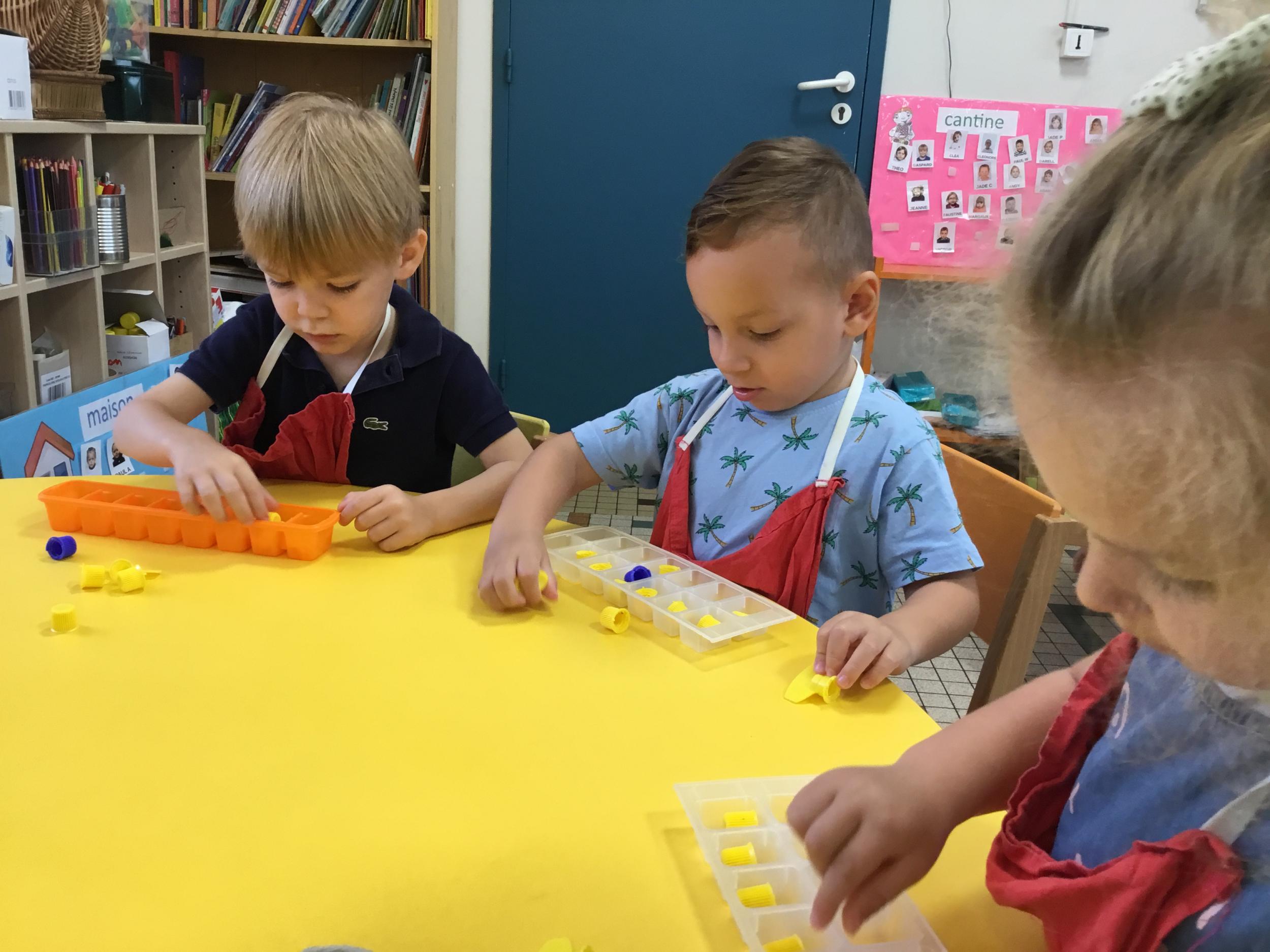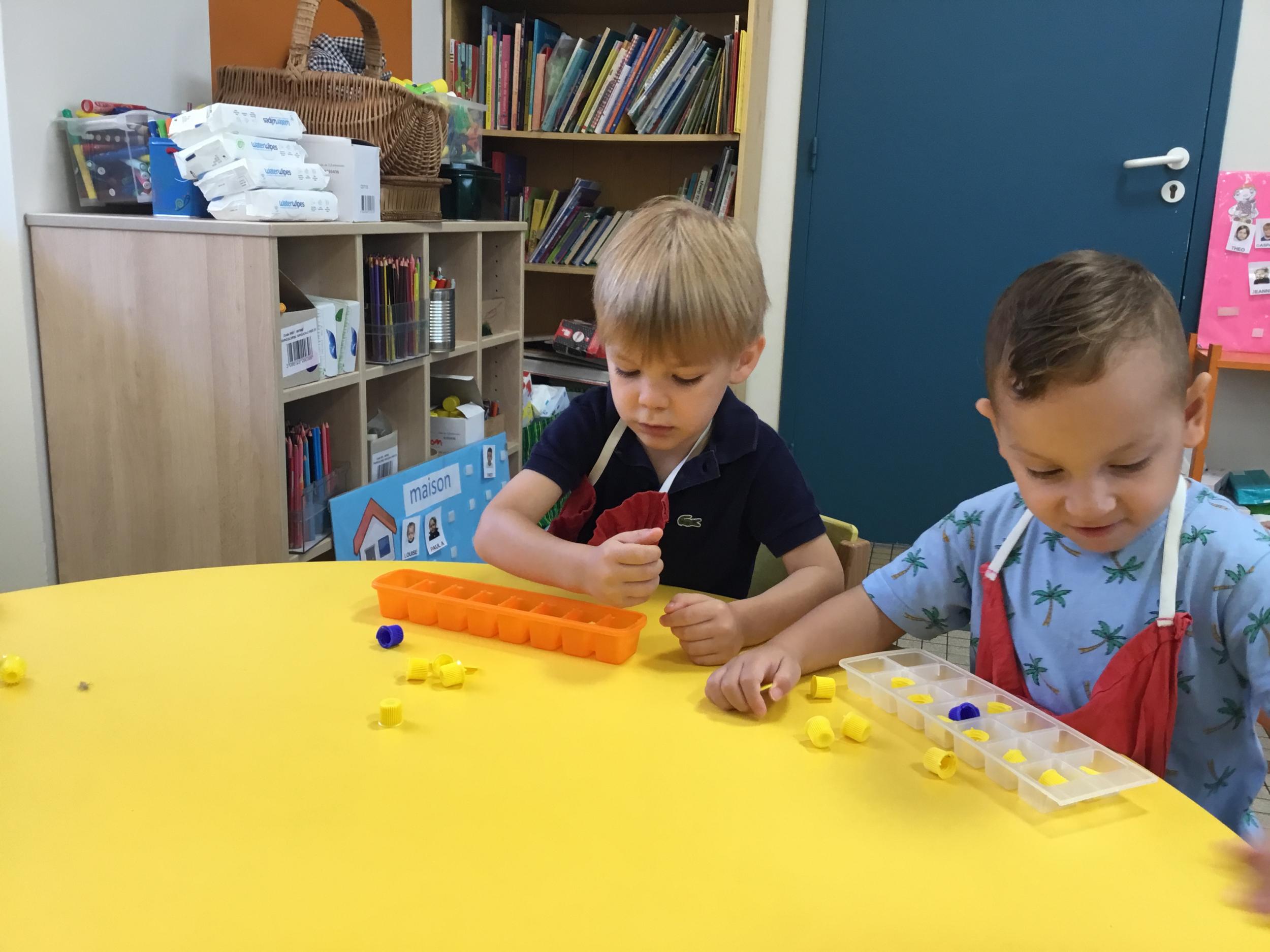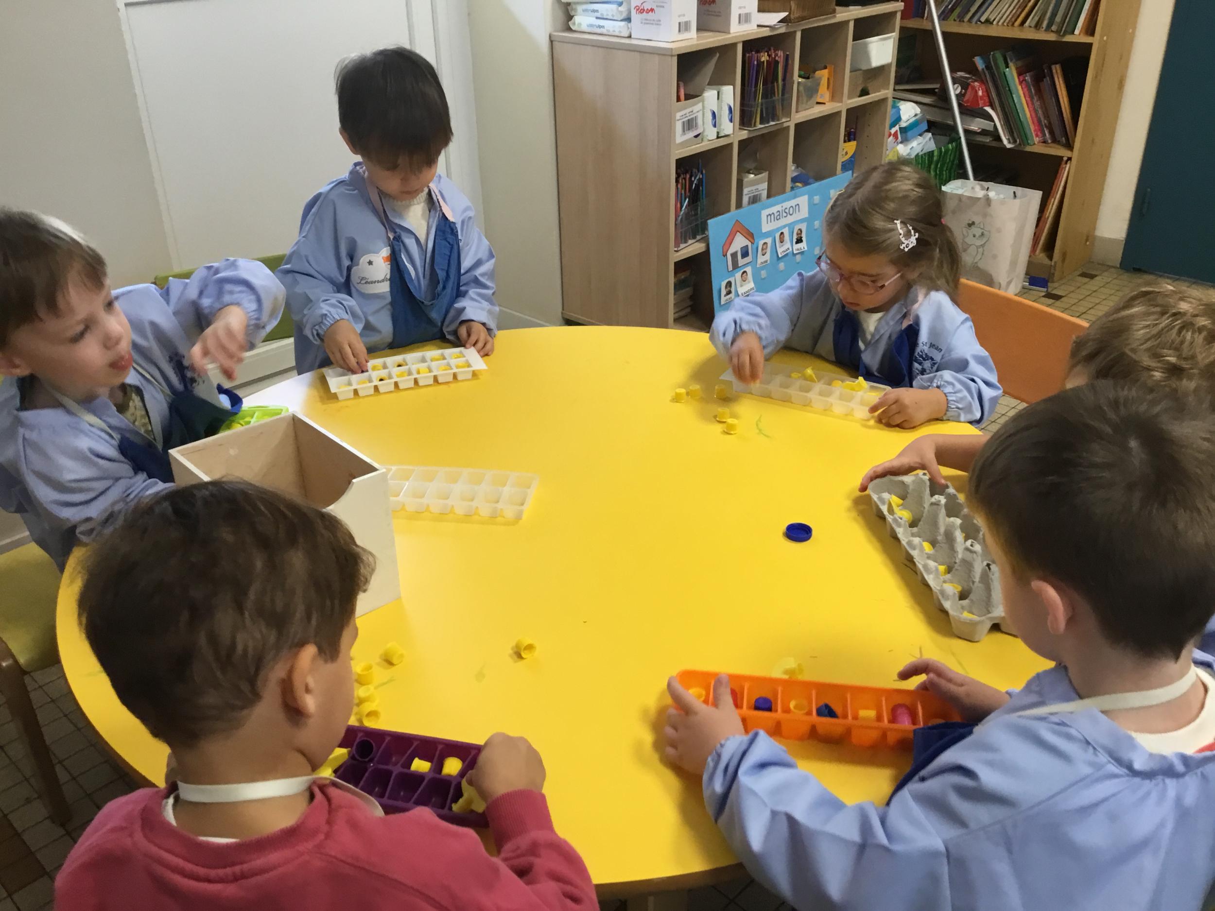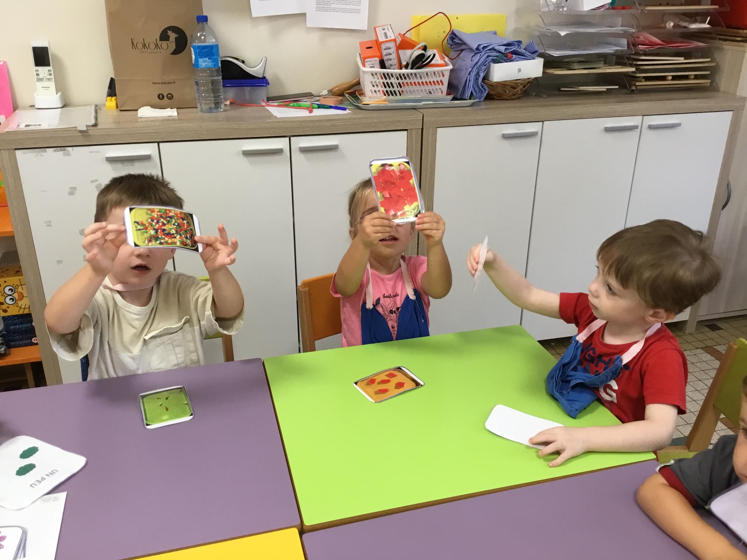 Avant d’aborder les nombres , il est important de bien comprendre certaines notions. Nous avons donc abordé les notions de « peu » et « beaucoup » de différentes façons: en manipulant des bouchons, en jouant au restaurant, par comparaison de cartes ….Nous l’avons aussi travaillé en anglais ! Pour aller plus loin, nous avons travaillé les notions de « trop » et « assez » …. Encore un peu difficile pour certains.