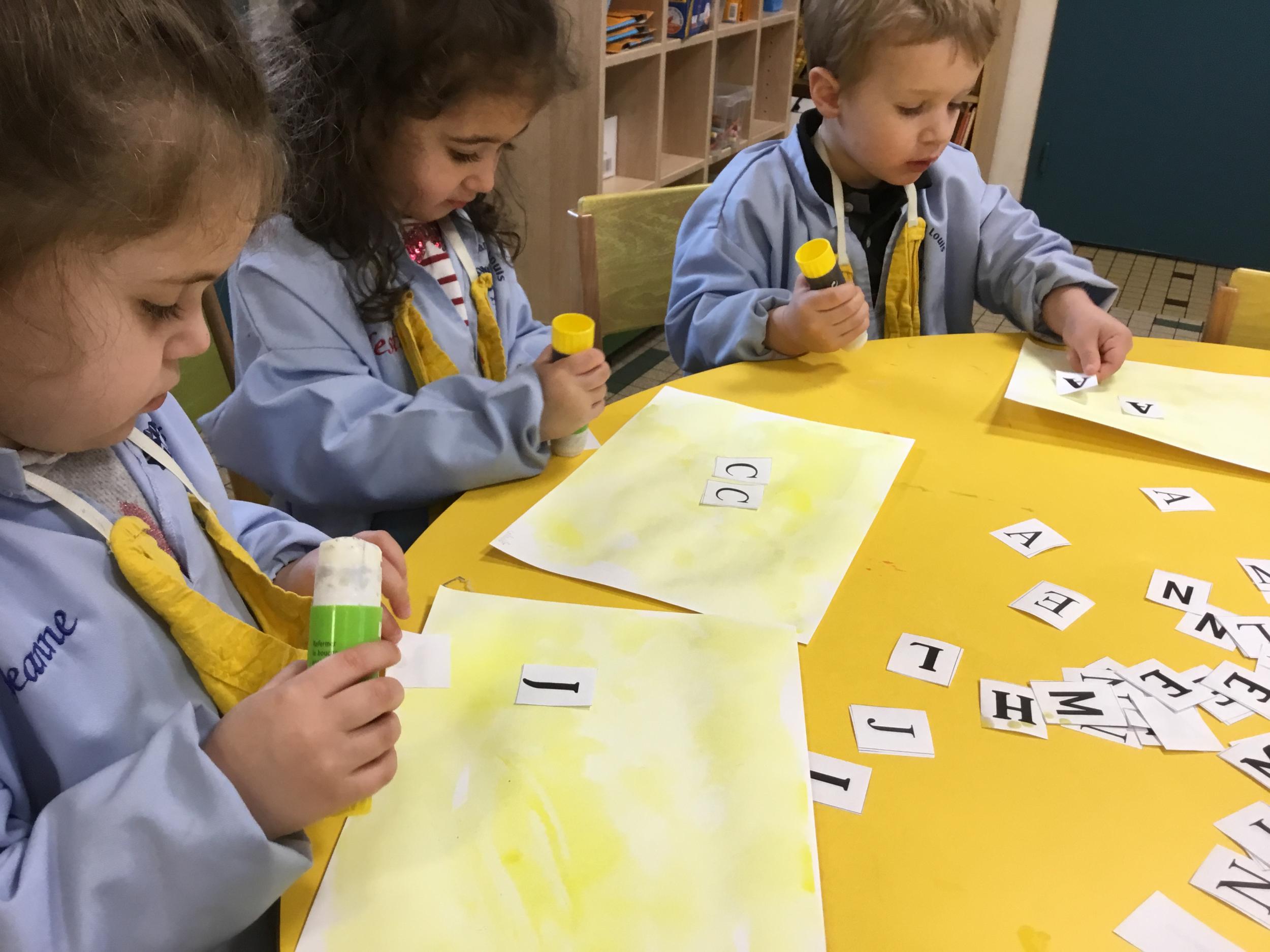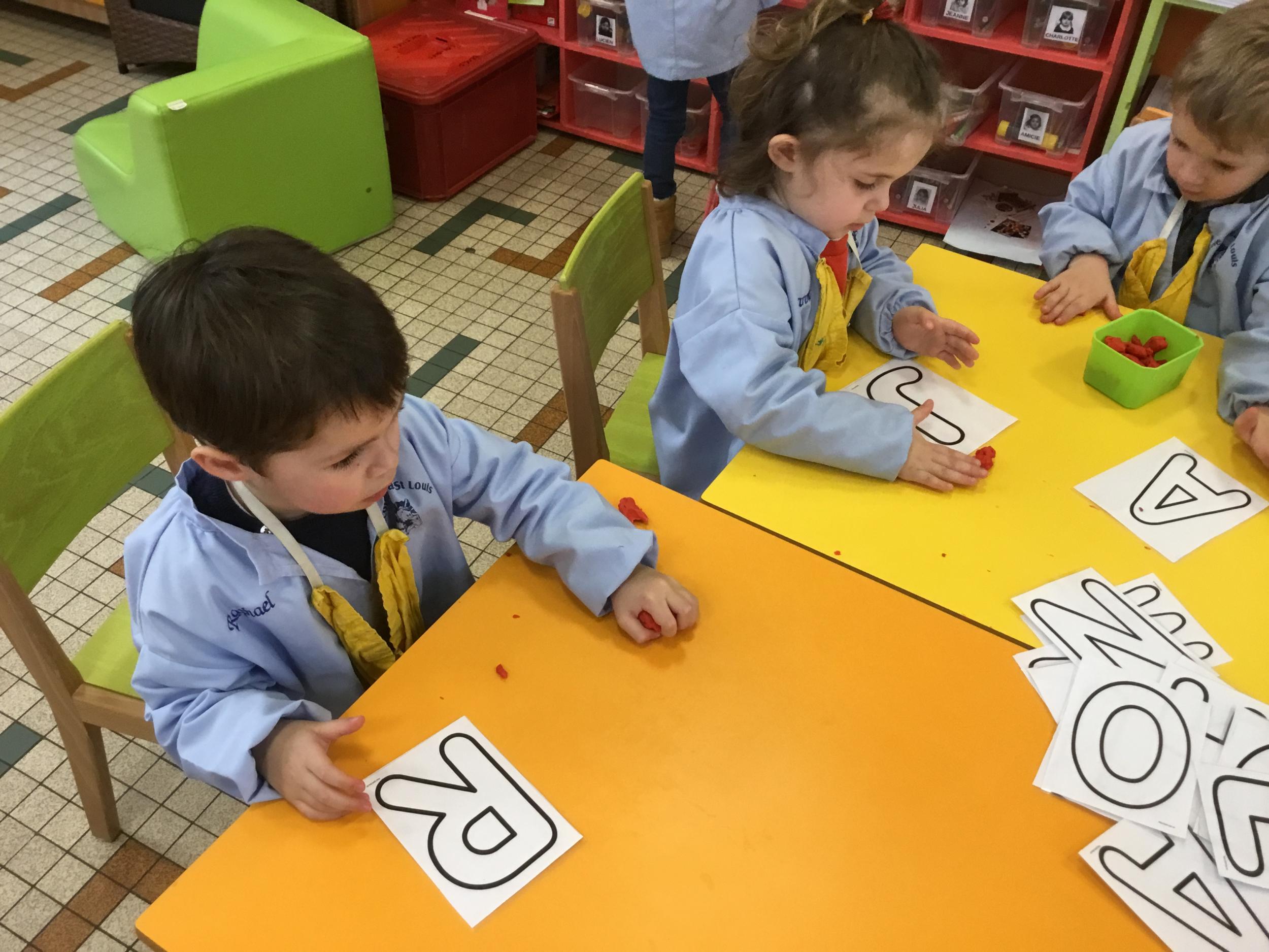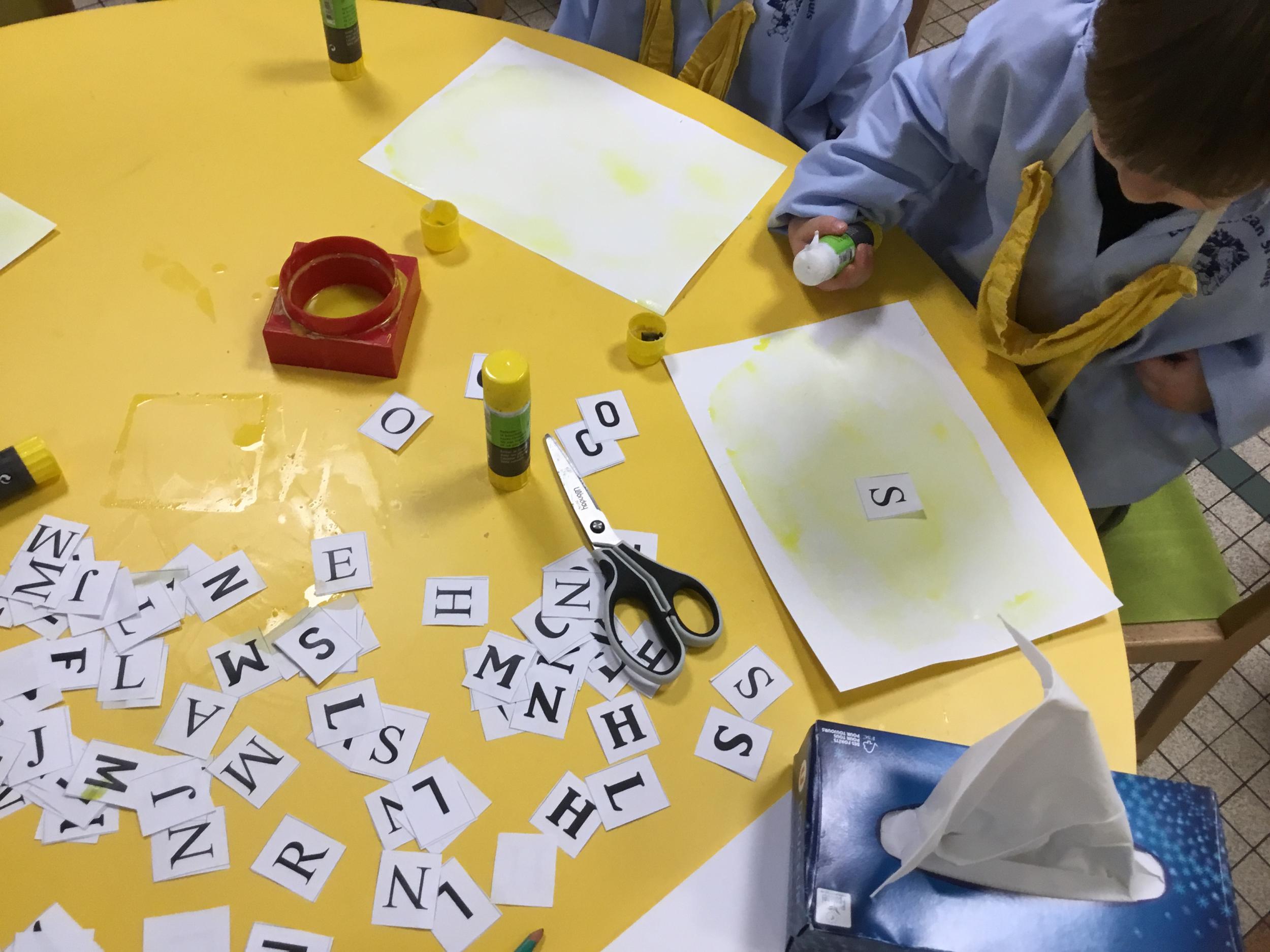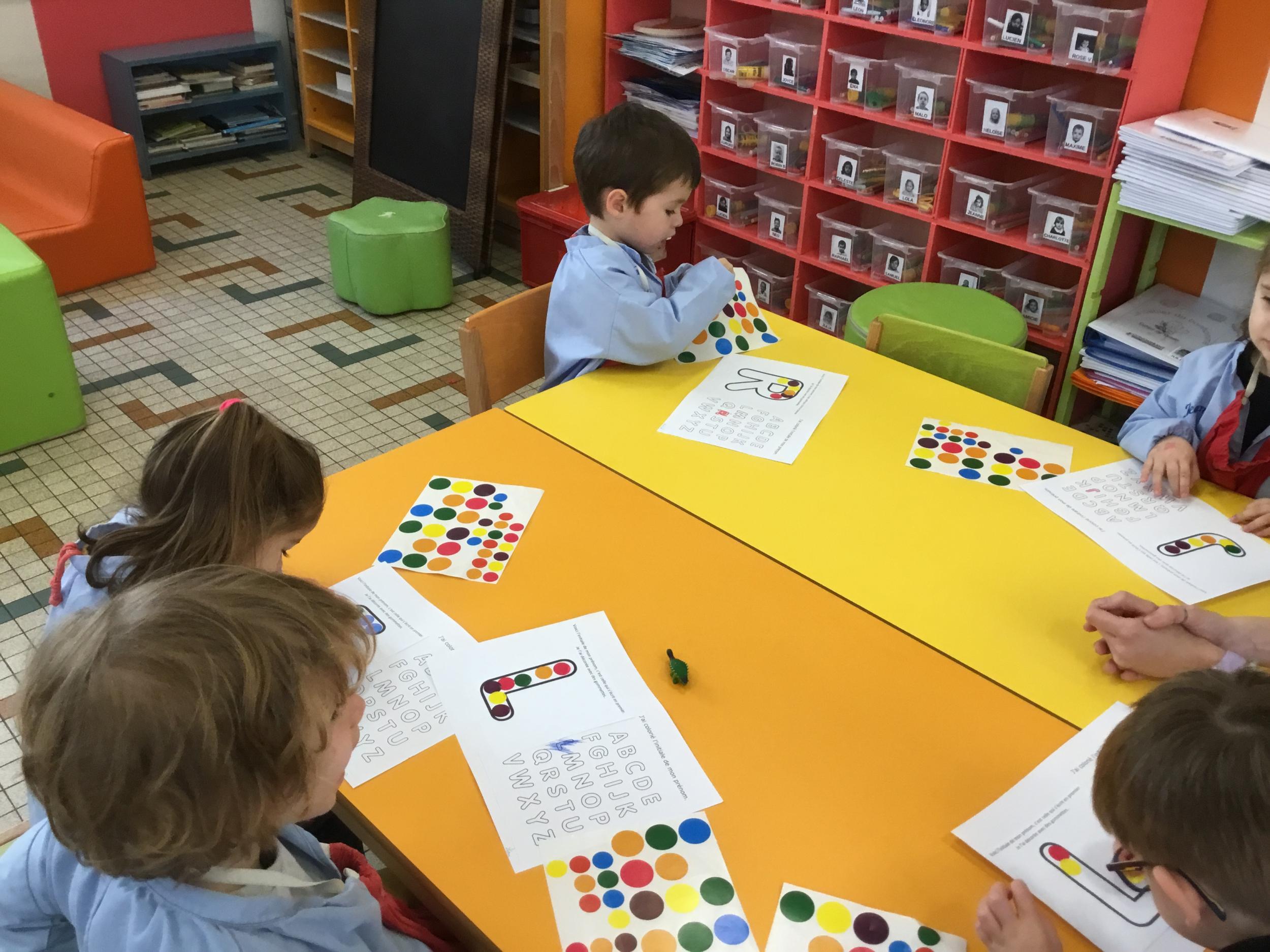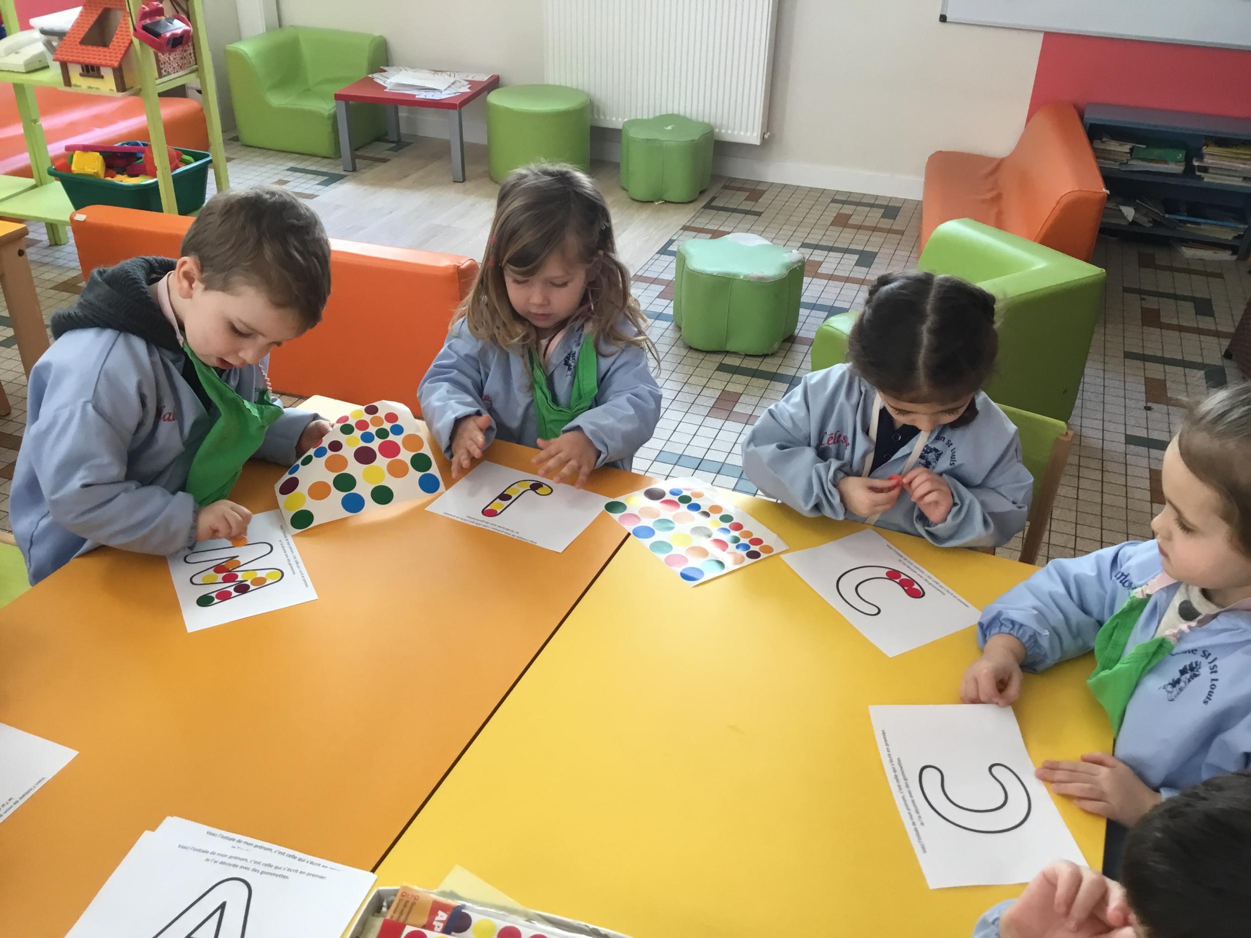 Depuis le début de la période les élèves travaillent autour de leur prénom et de leur initiale. Différents ateliers leur permettent d’appréhender l’écrit de leur initiale.