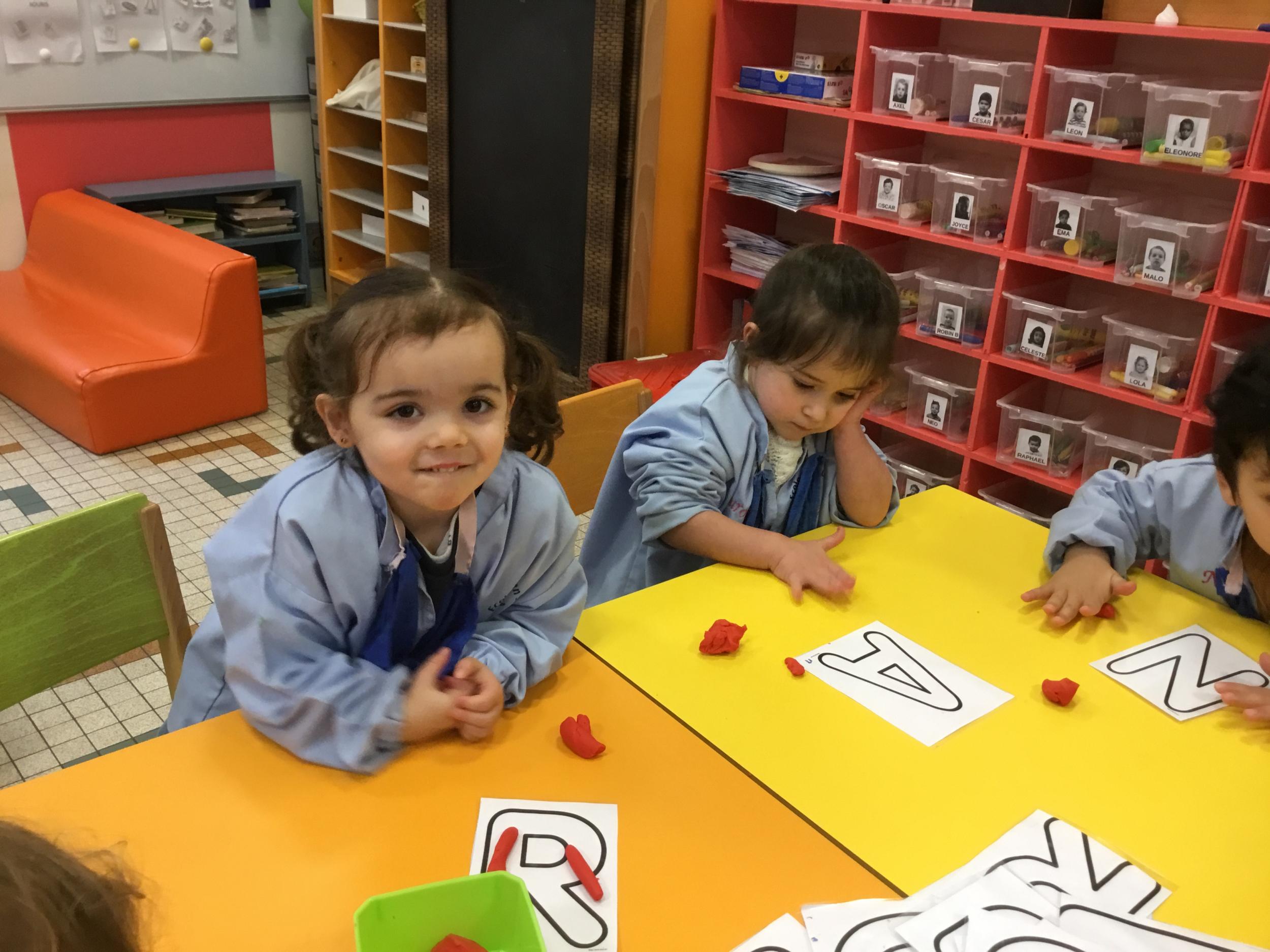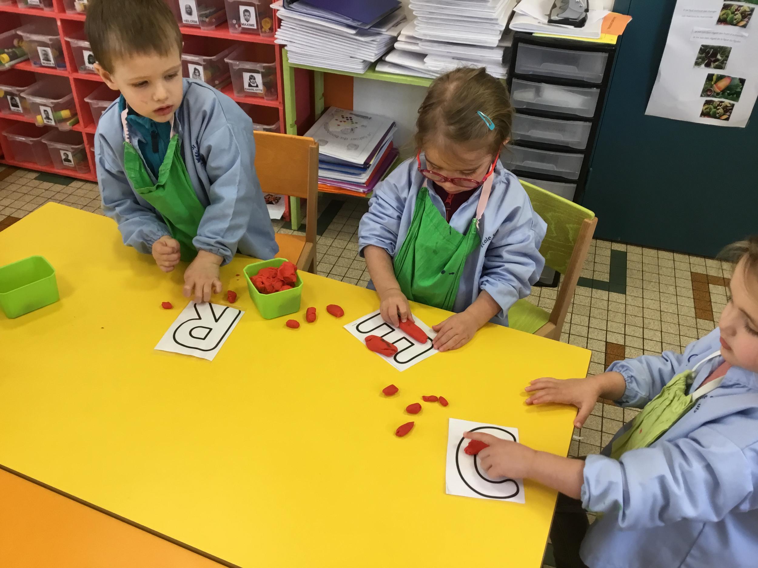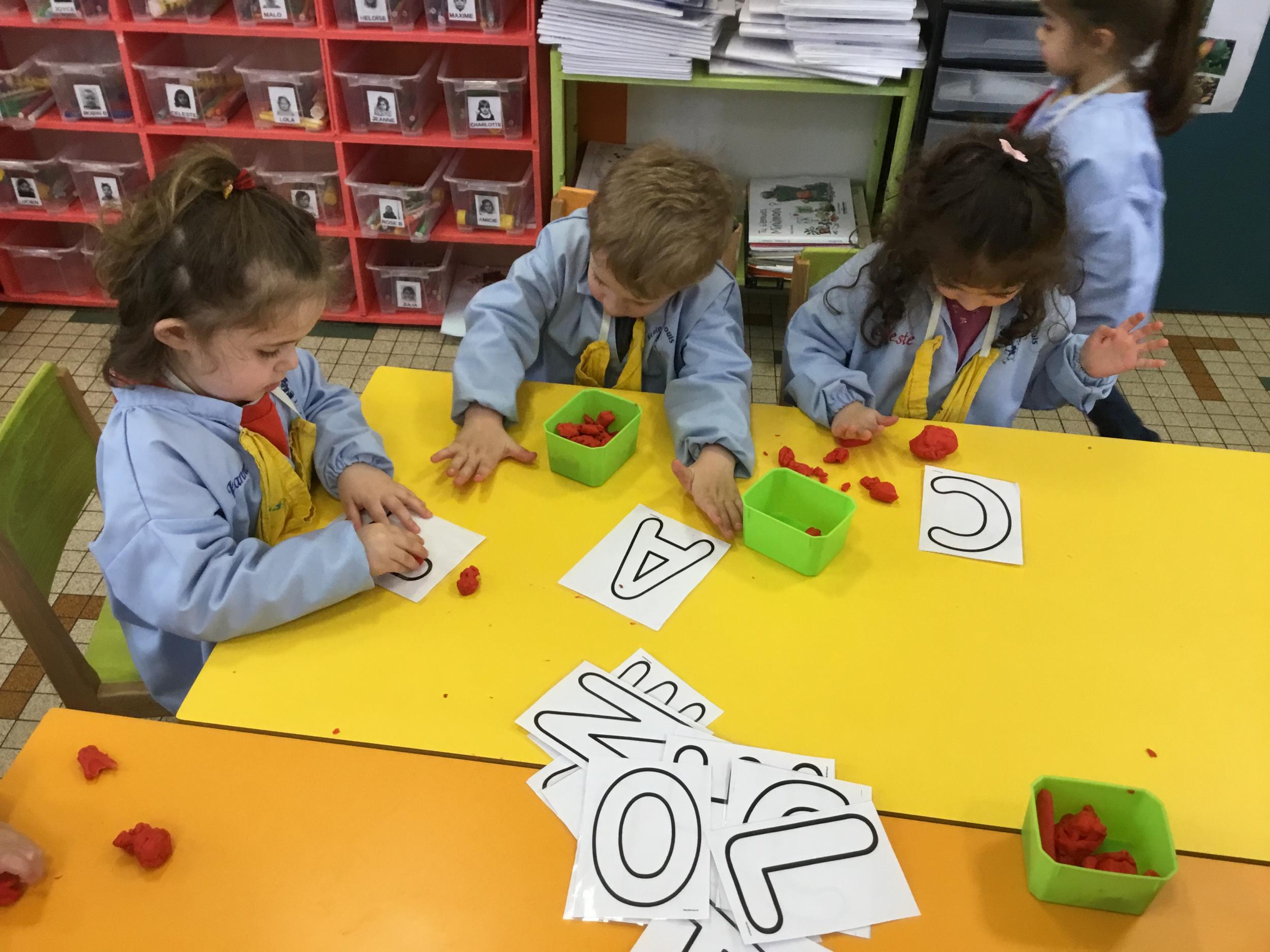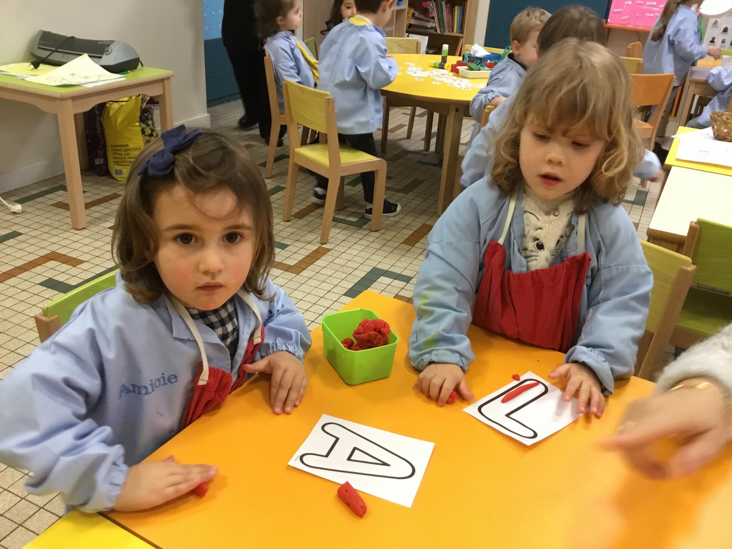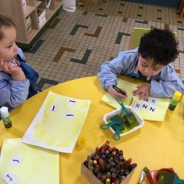 Depuis le début de la période les élèves travaillent autour de leur prénom et de leur initiale. Différents ateliers leur permettent d’appréhender l’écrit de leur initiale.
