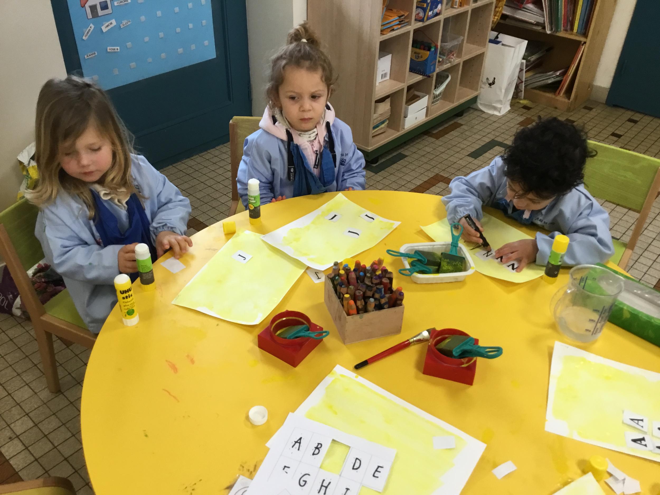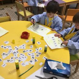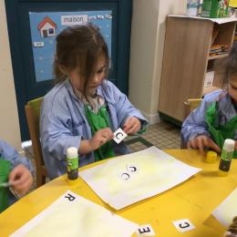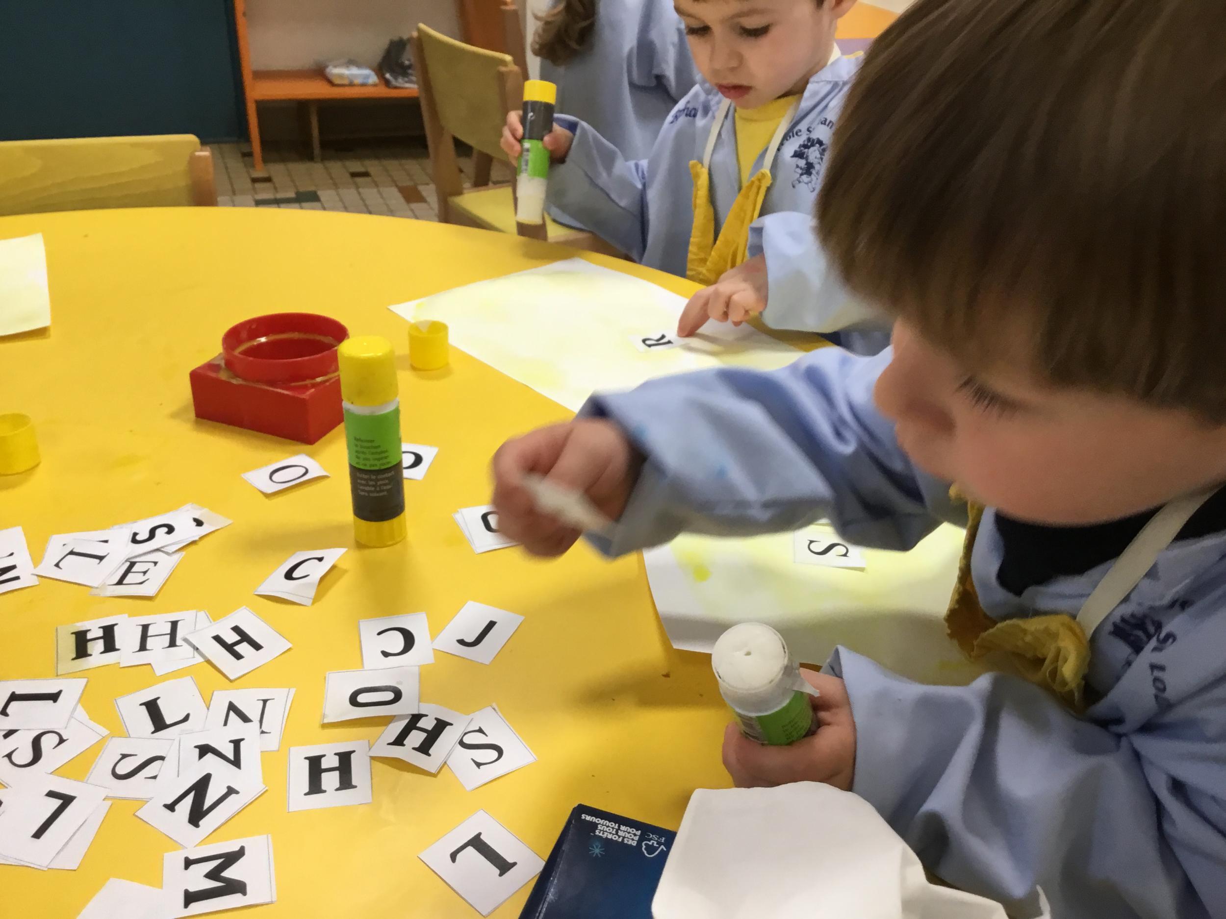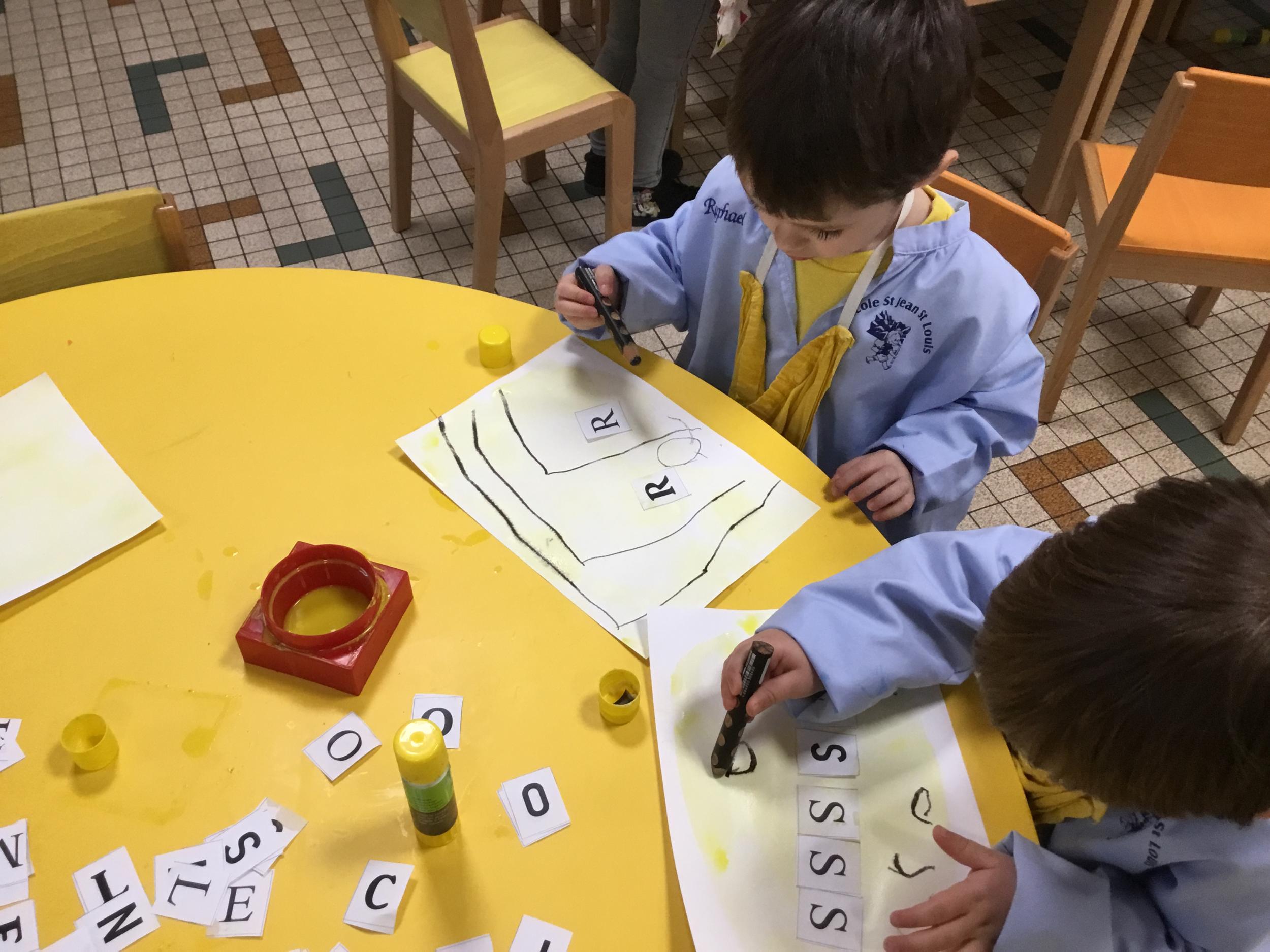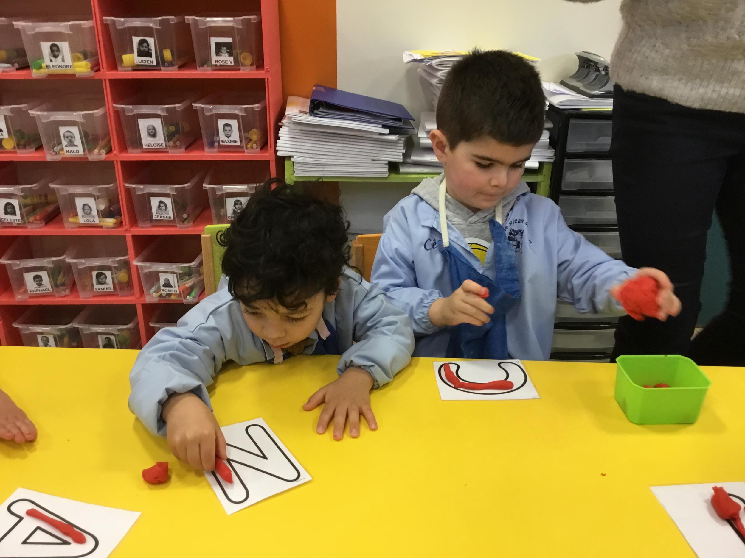 Depuis le début de la période les élèves travaillent autour de leur prénom et de leur initiale. Différents ateliers leur permettent d’appréhender l’écrit de leur initiale.