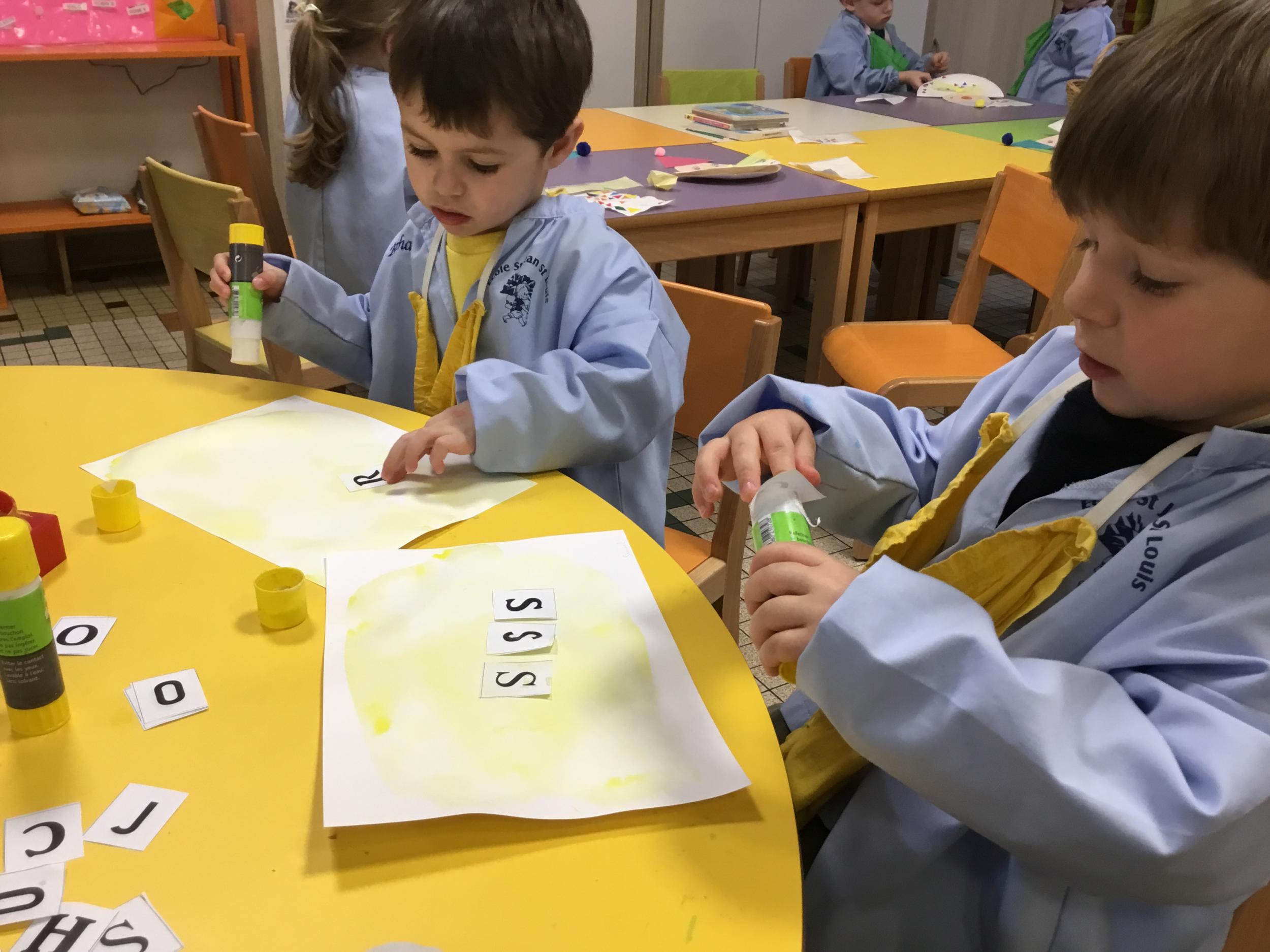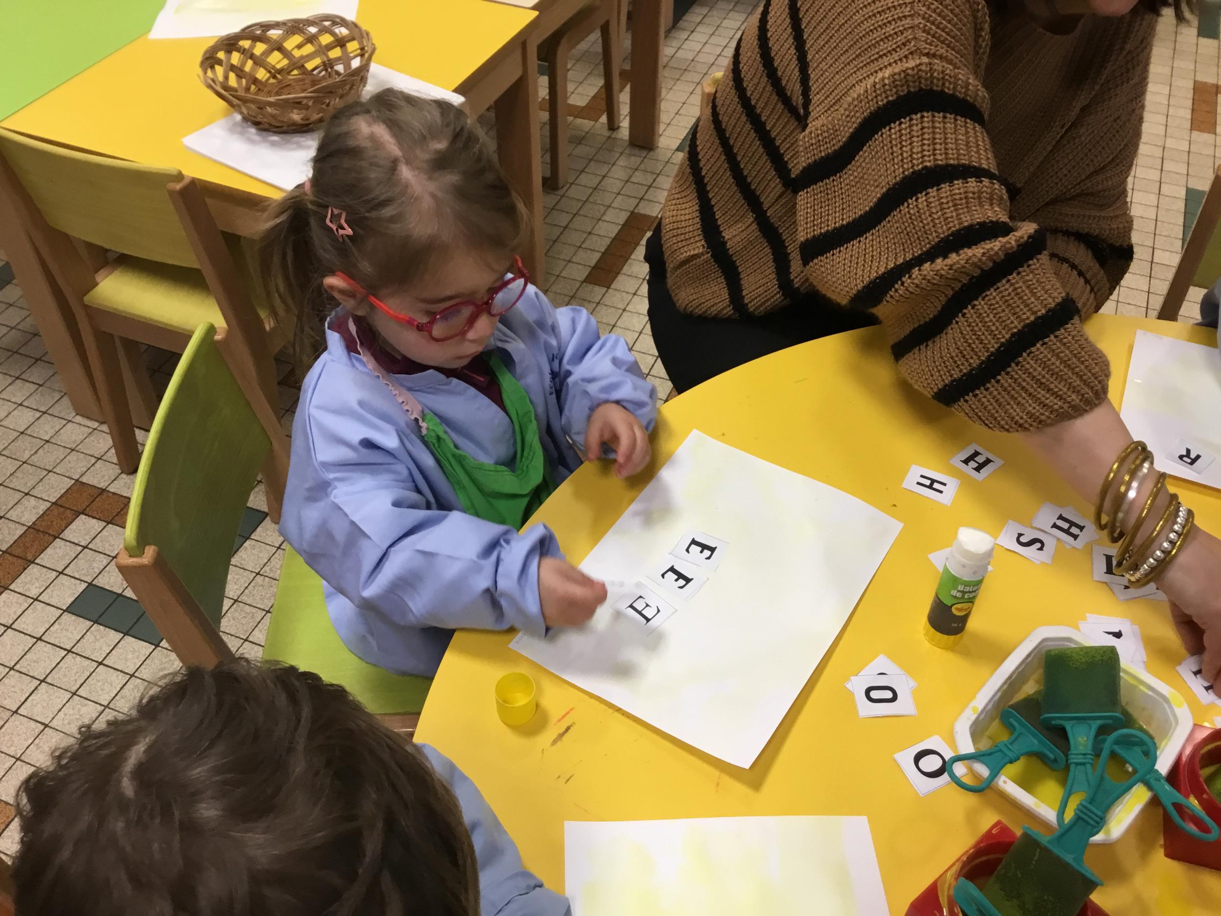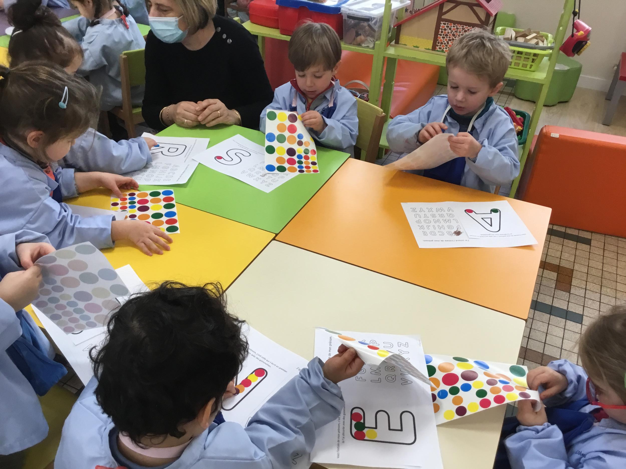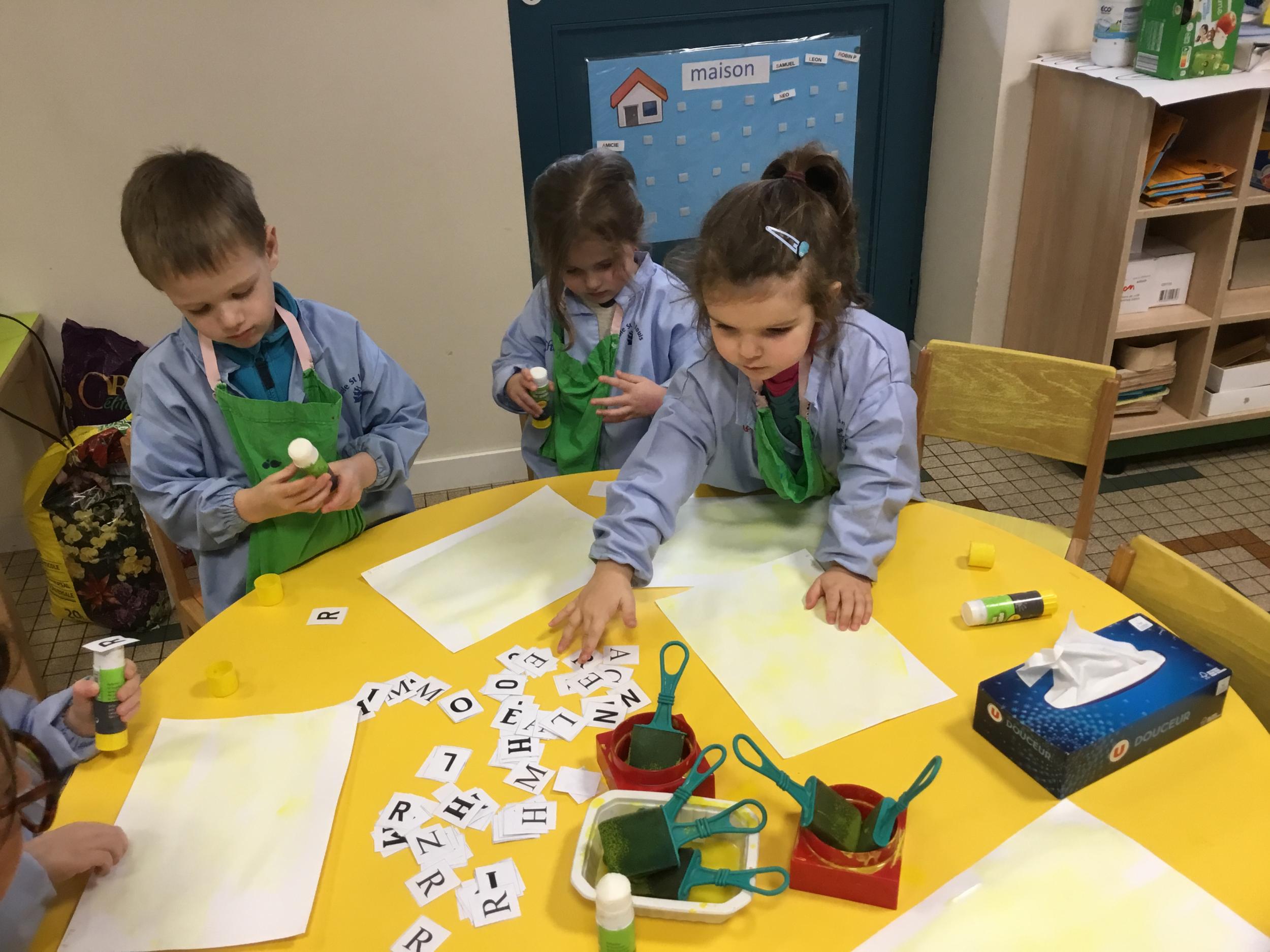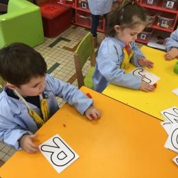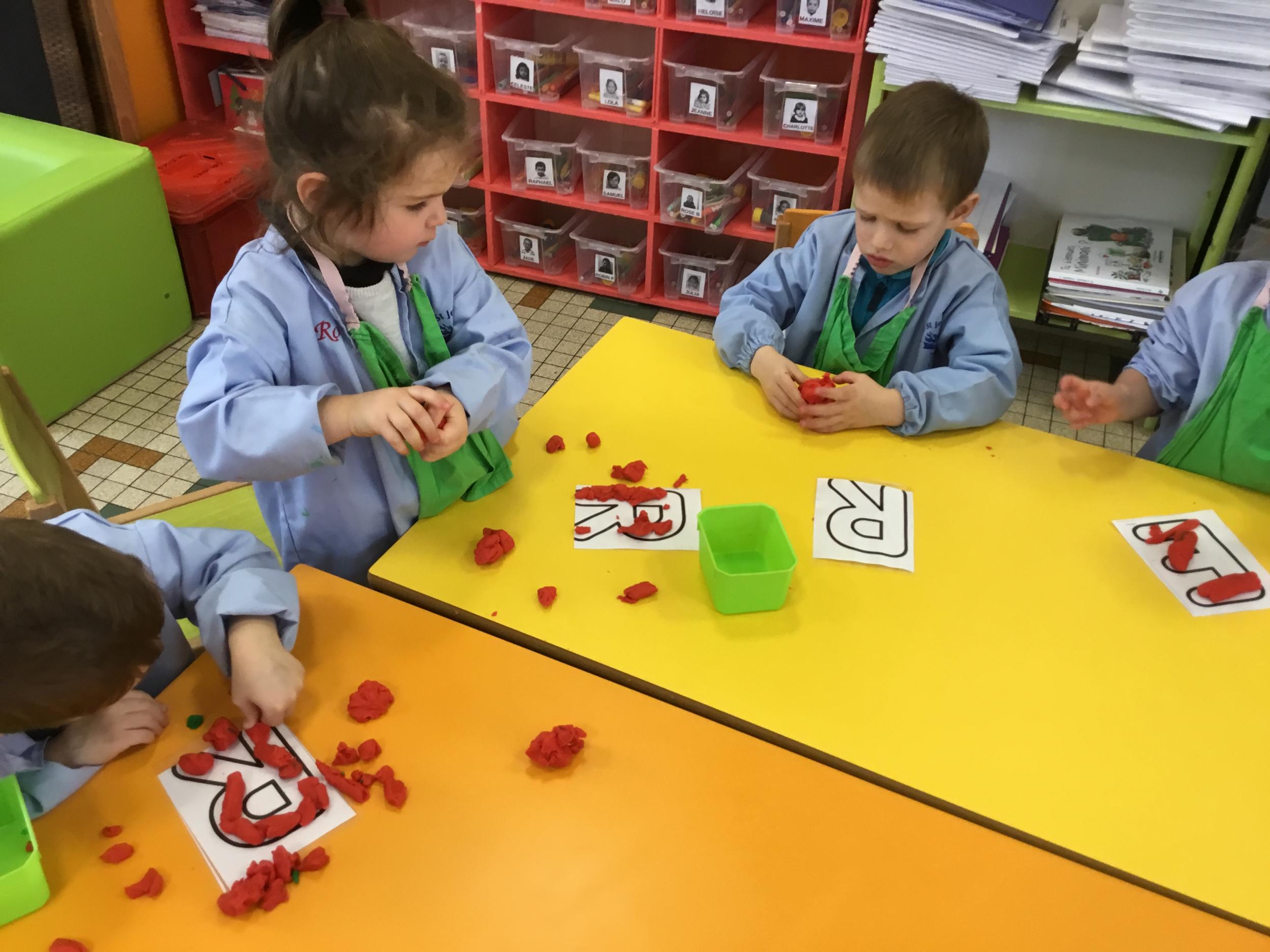 Depuis le début de la période les élèves travaillent autour de leur prénom et de leur initiale. Différents ateliers leur permettent d’appréhender l’écrit de leur initiale.