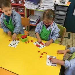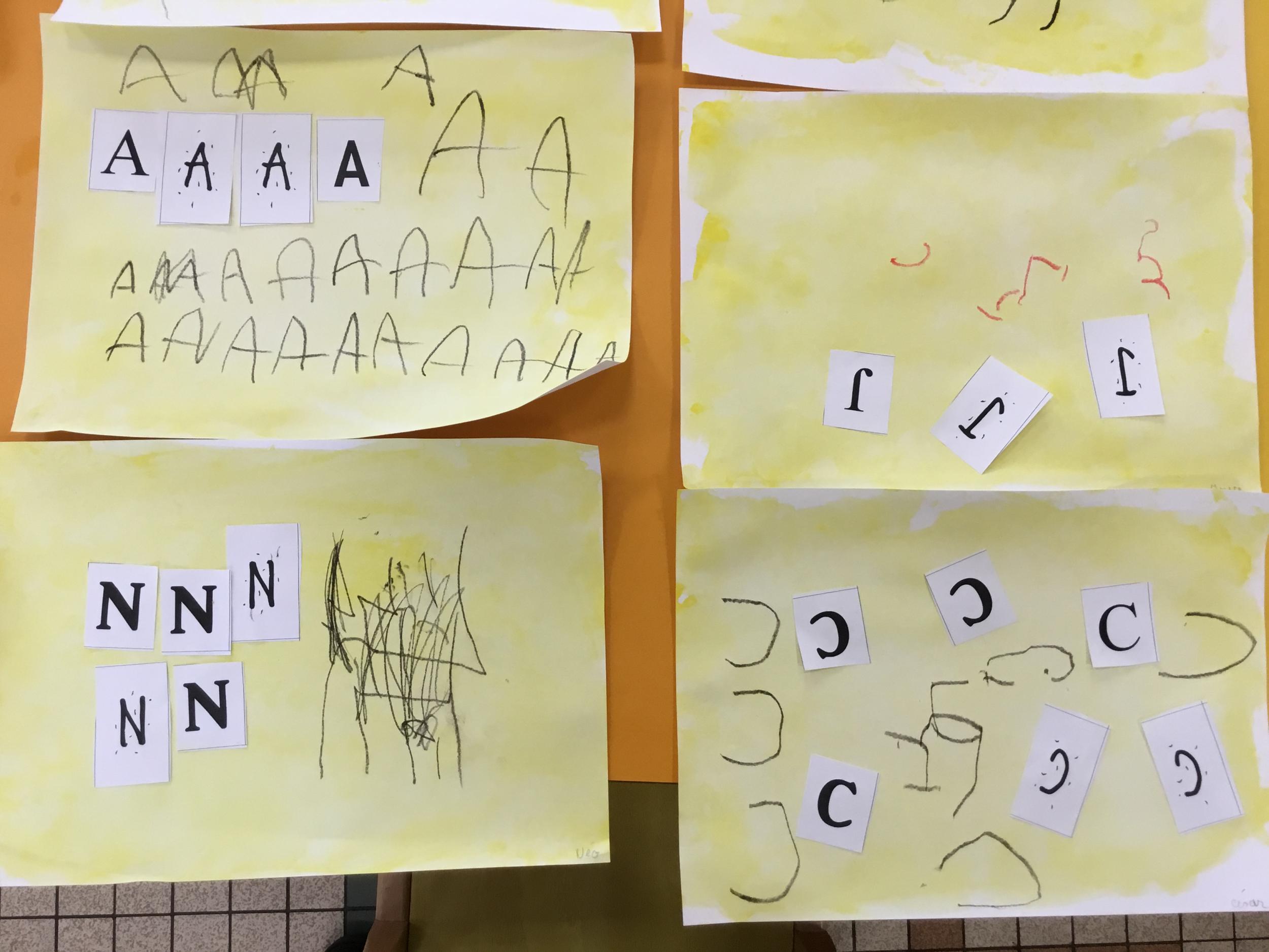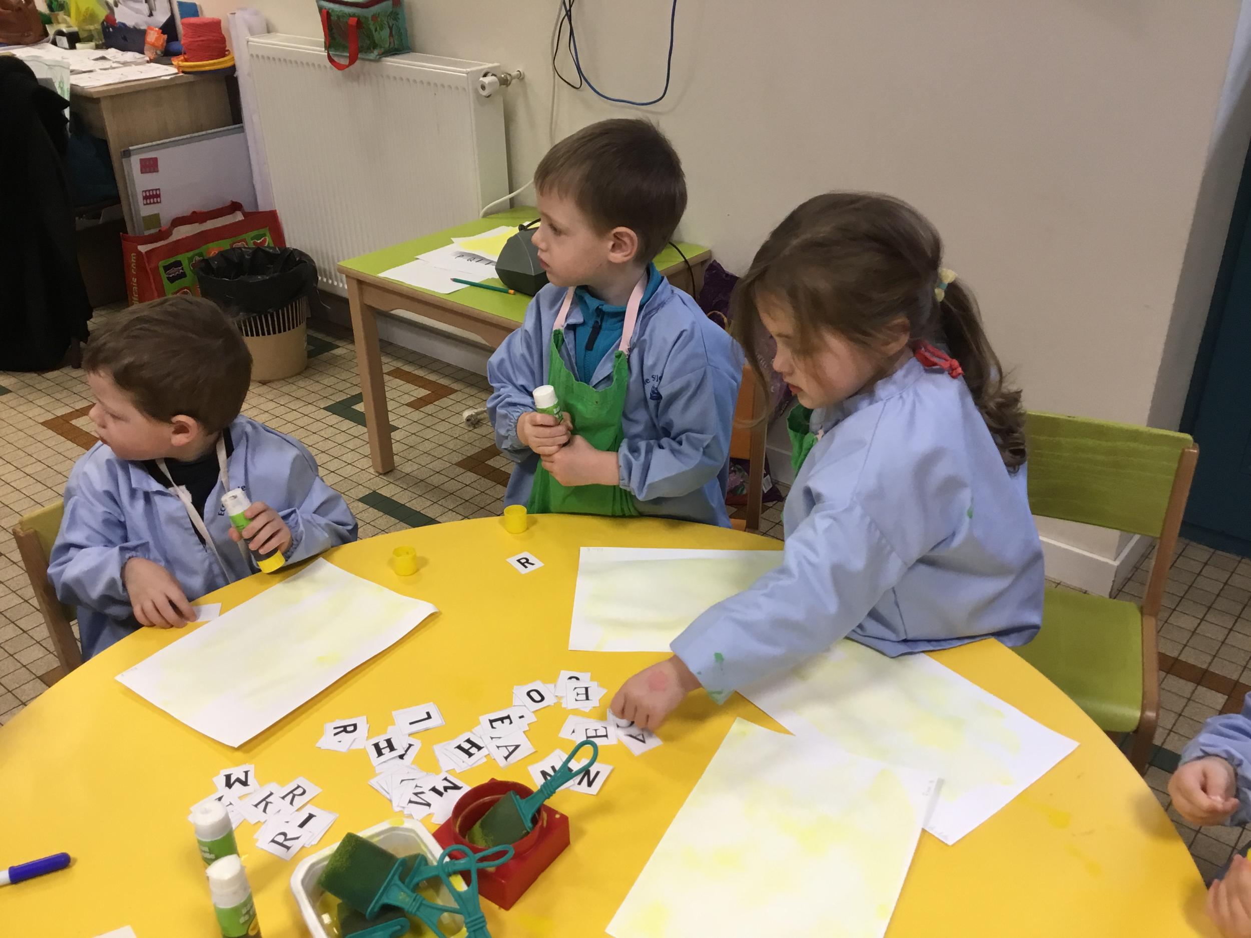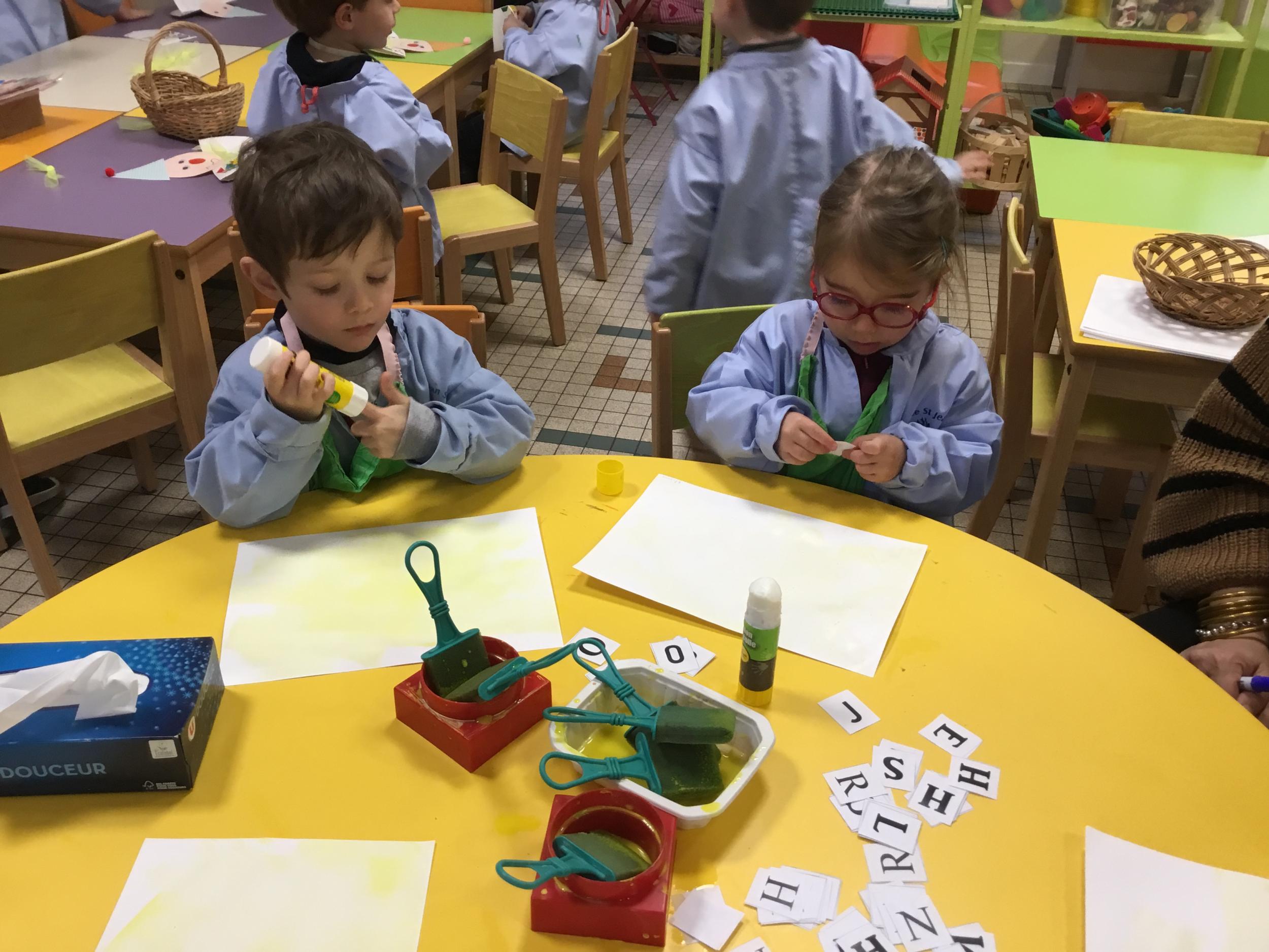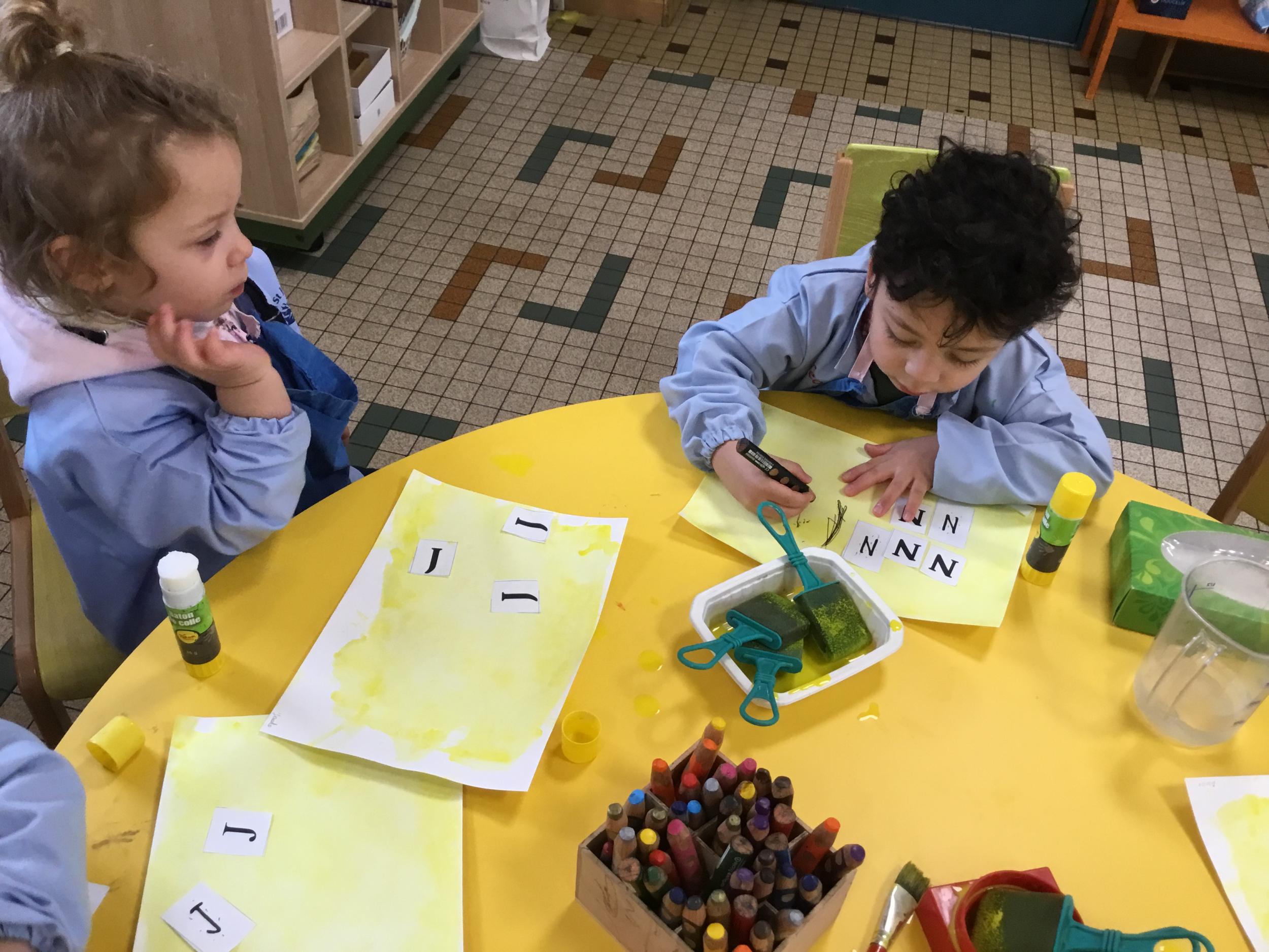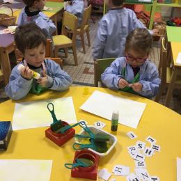 Depuis le début de la période les élèves travaillent autour de leur prénom et de leur initiale. Différents ateliers leur permettent d’appréhender l’écrit de leur initiale.