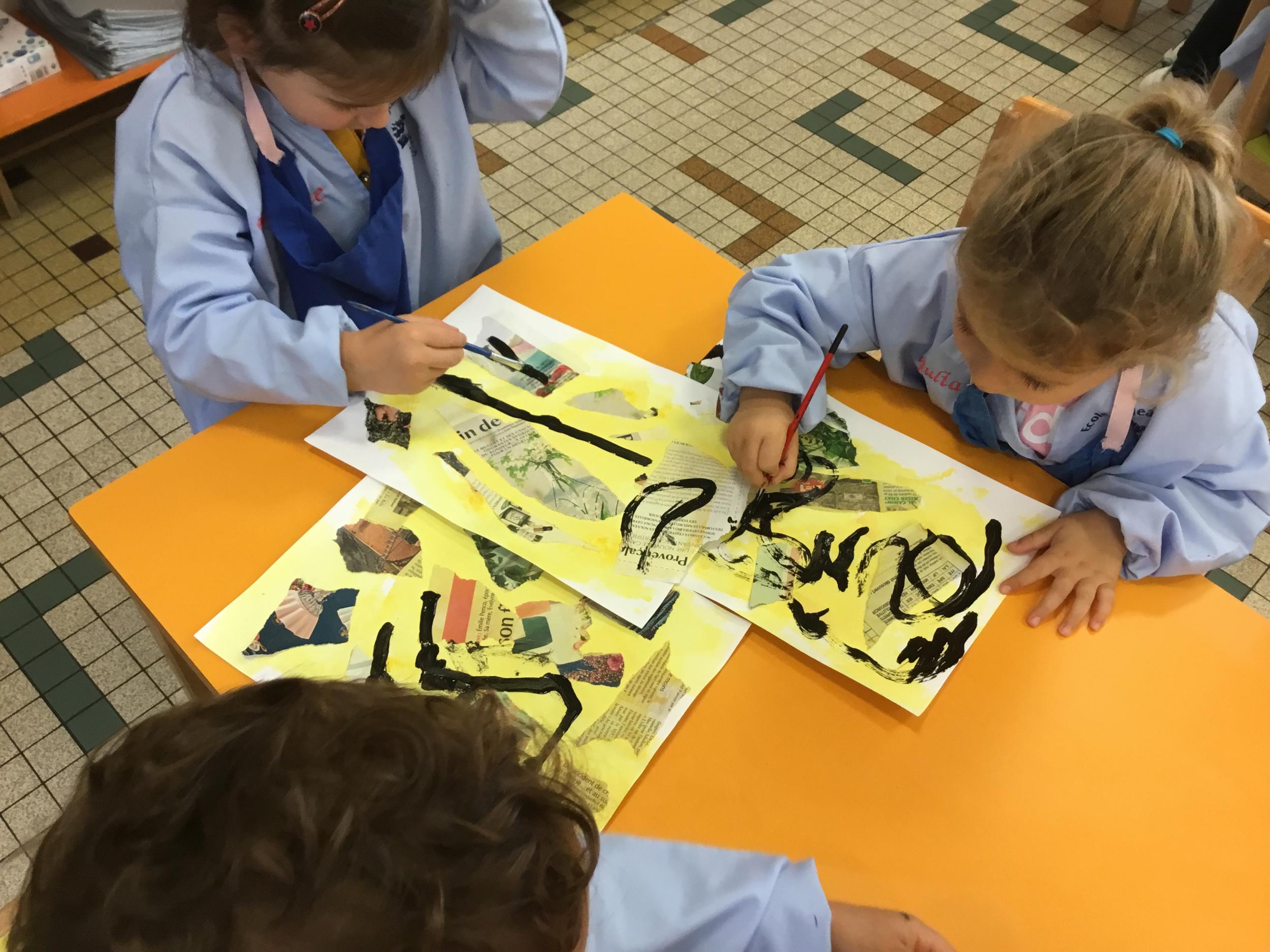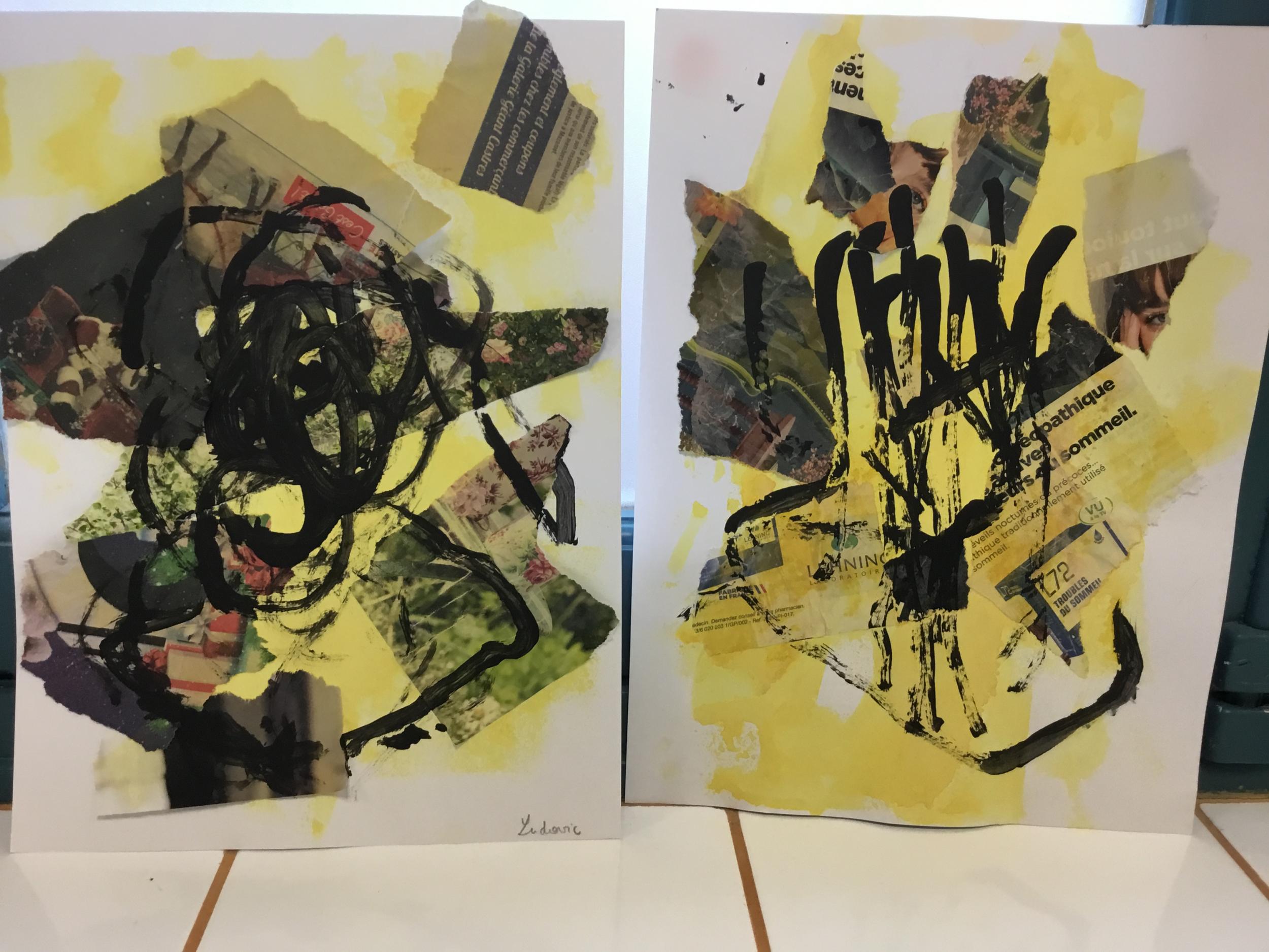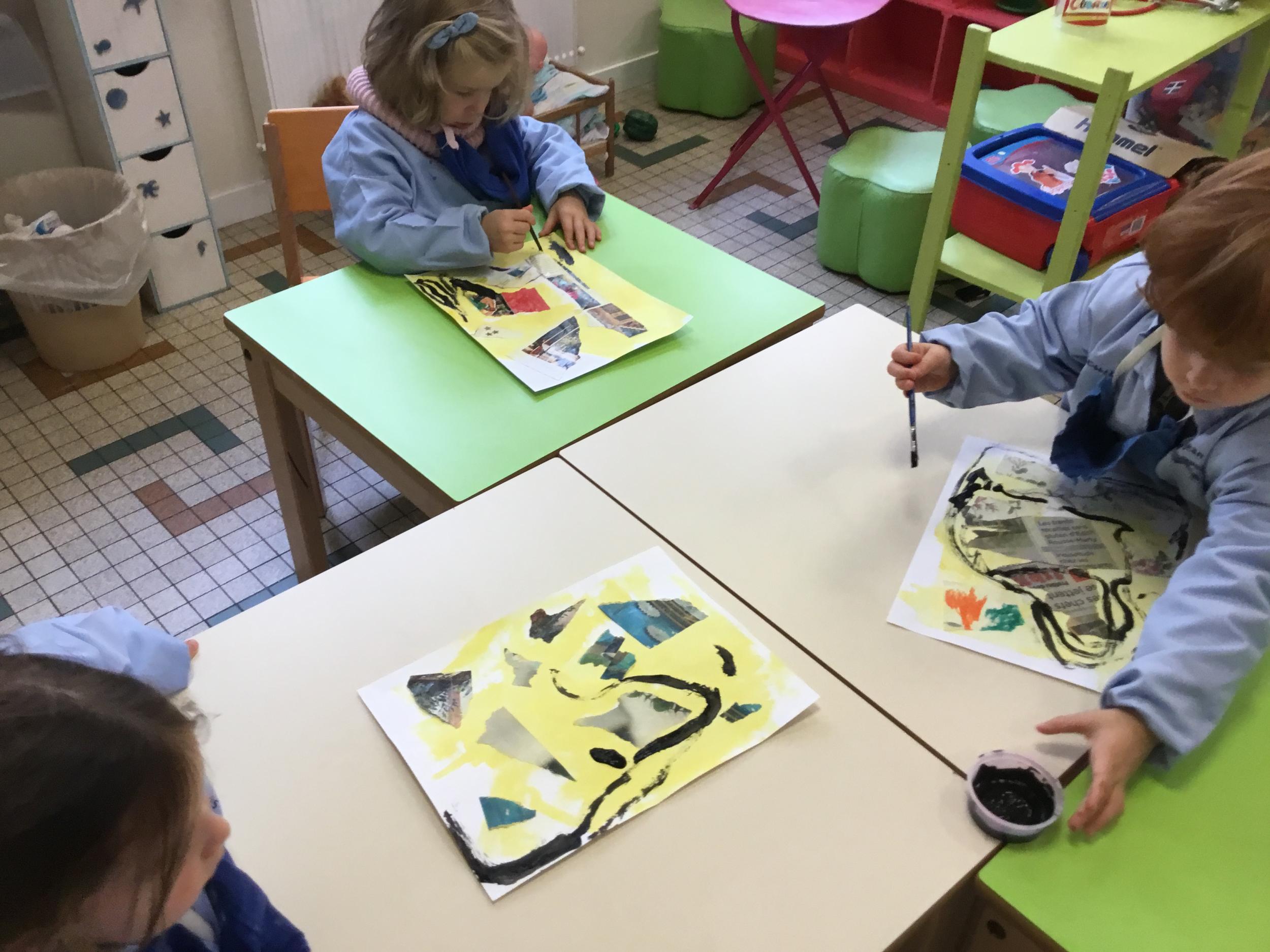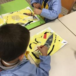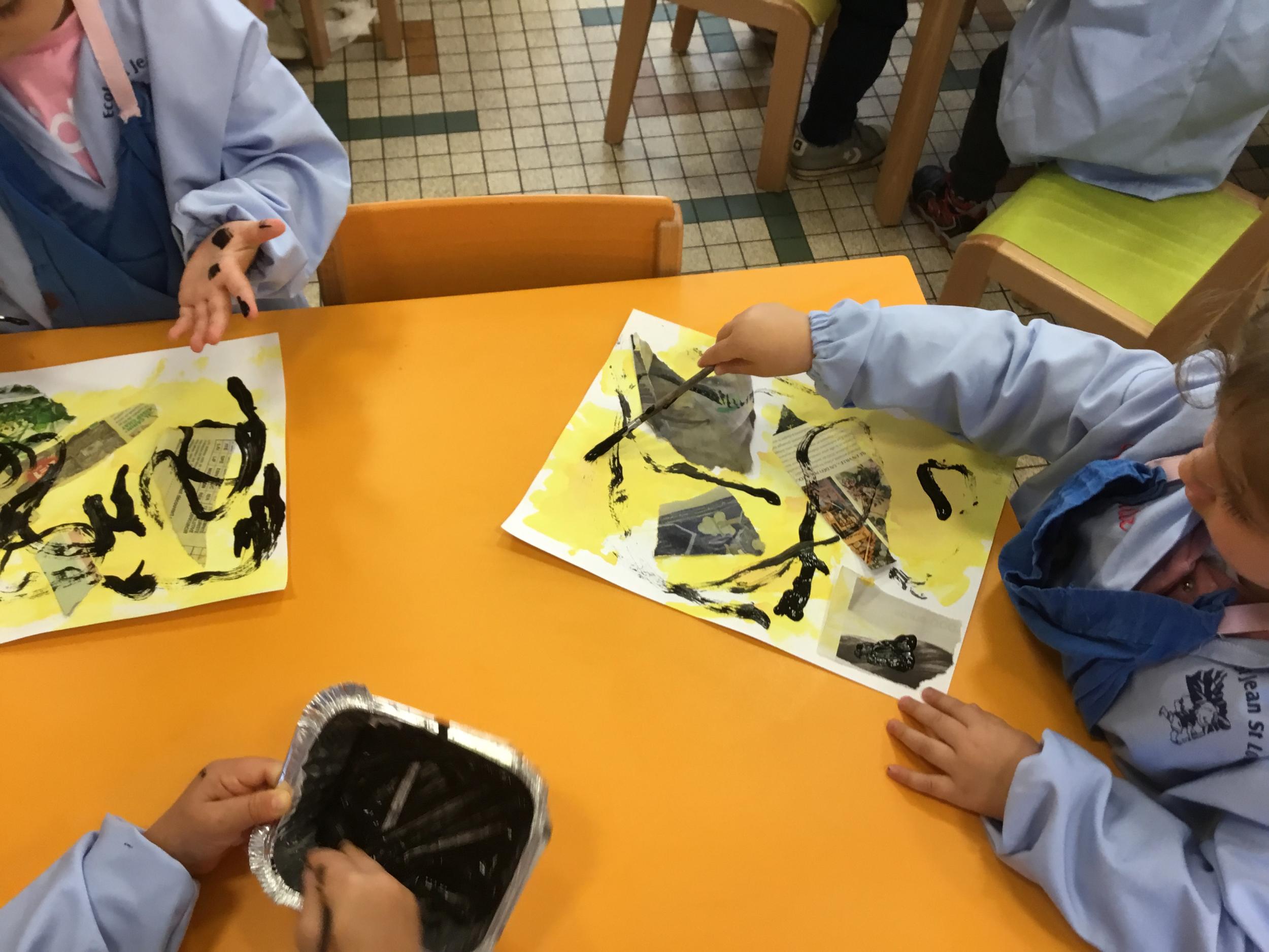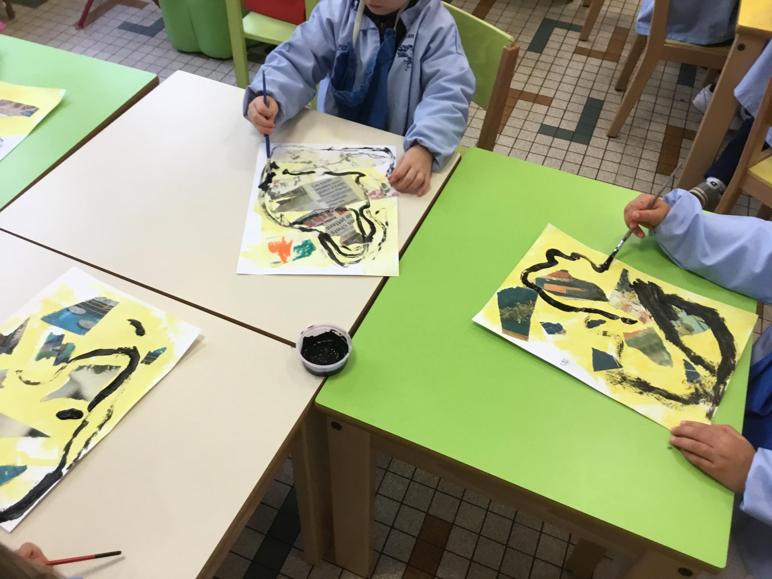 cette œuvre a permis de travailler dans le domaine de l’écrit. Après un travail de collage de papiers déchirés et de la réalisation d’un aplat de couleur jaune, ils ont tracé des chemins. Première approche du geste de l’écrit.