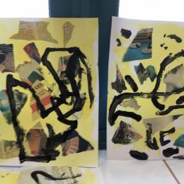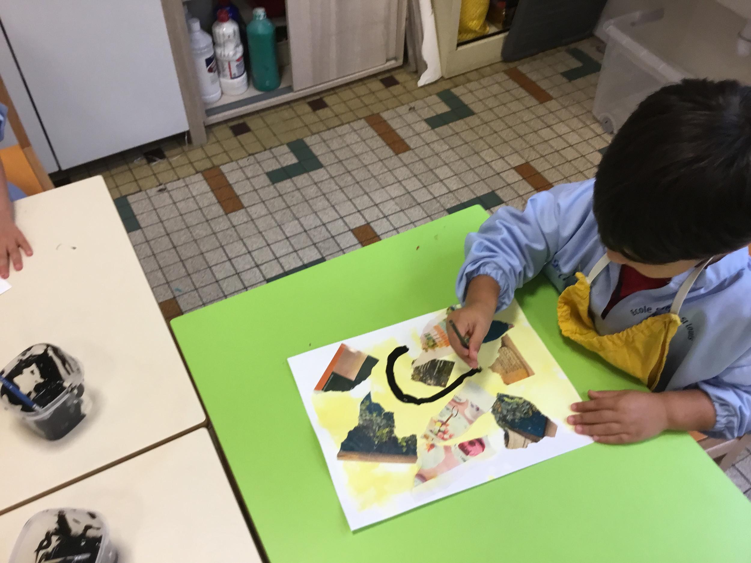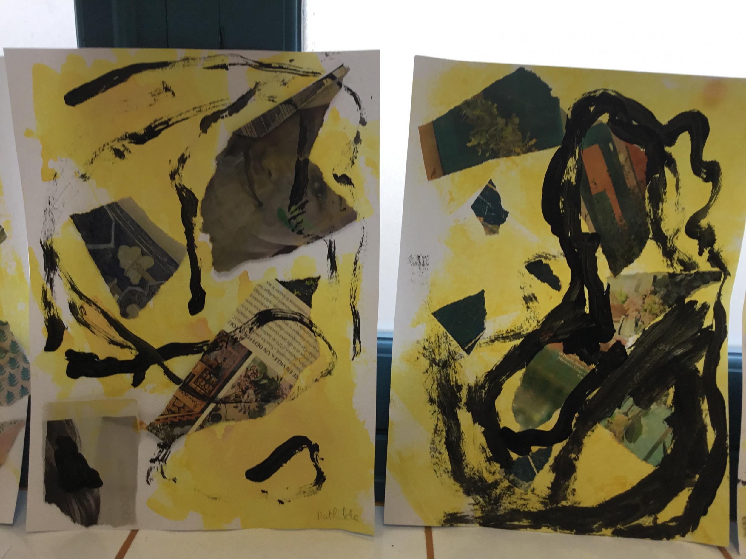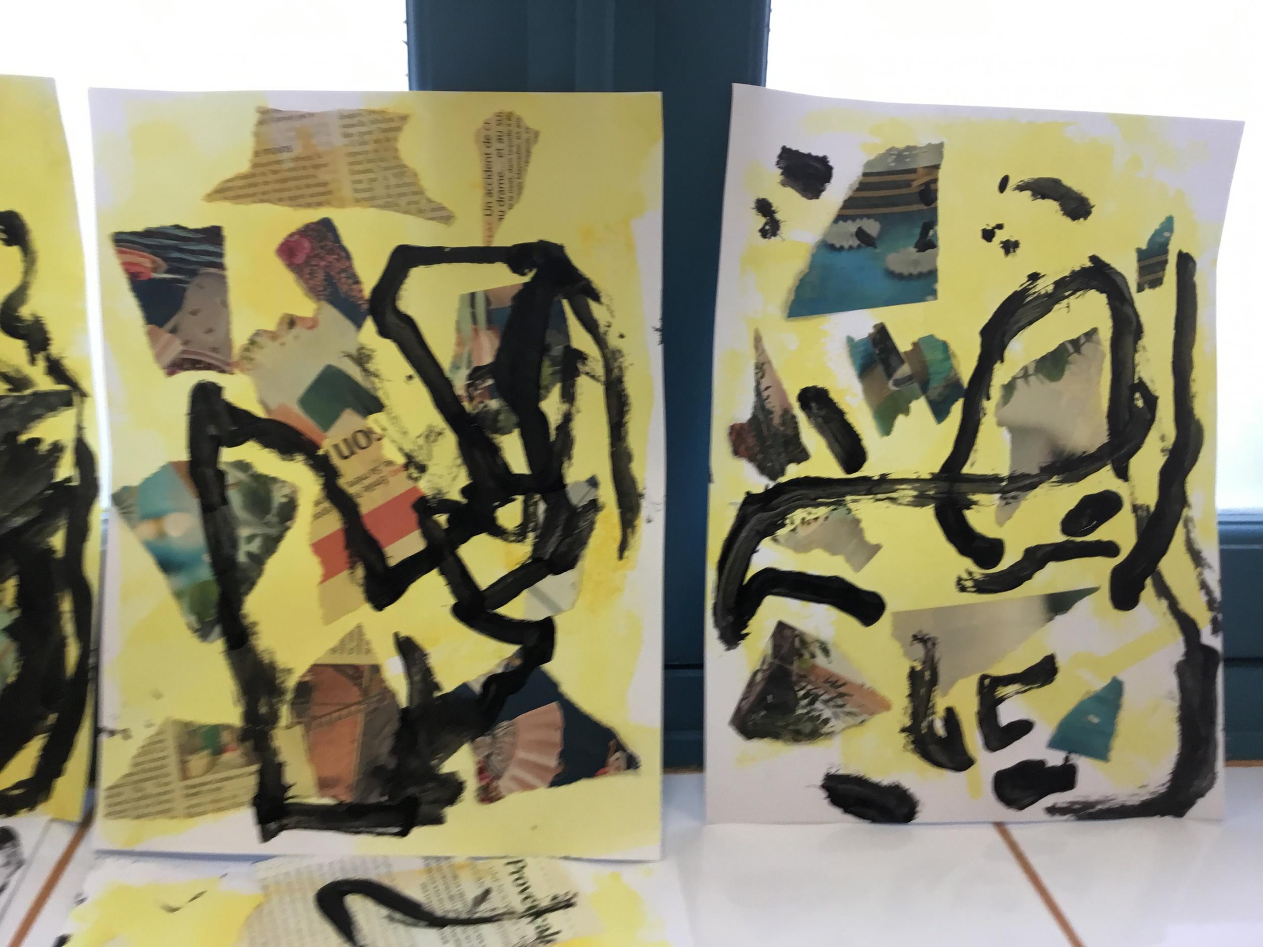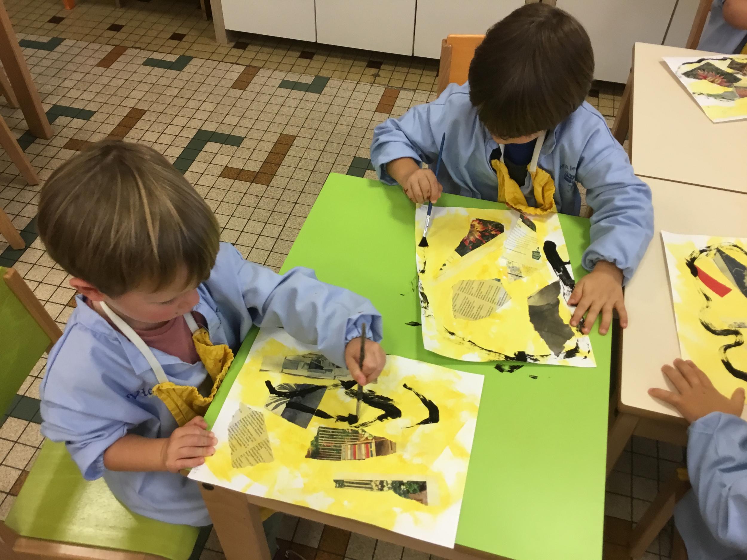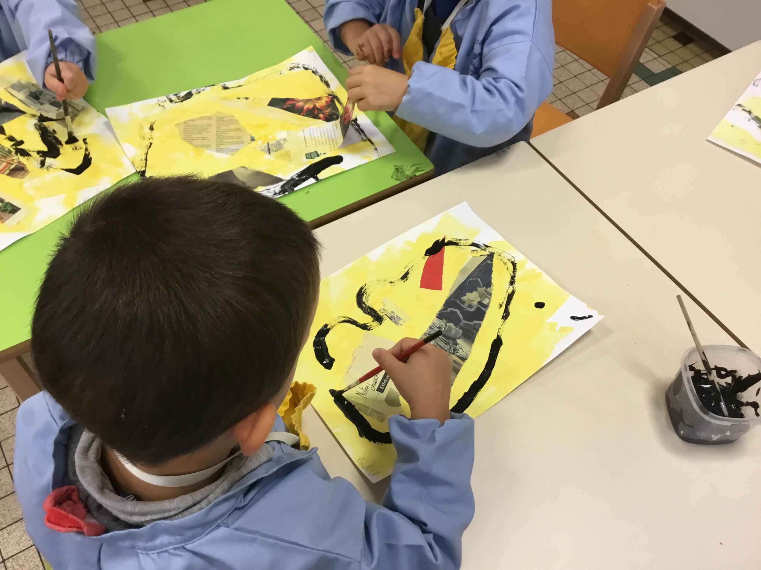 cette œuvre a permis de travailler dans le domaine de l’écrit. Après un travail de collage de papiers déchirés et de la réalisation d’un aplat de couleur jaune, ils ont tracé des chemins. Première approche du geste de l’écrit.