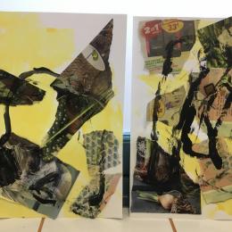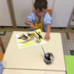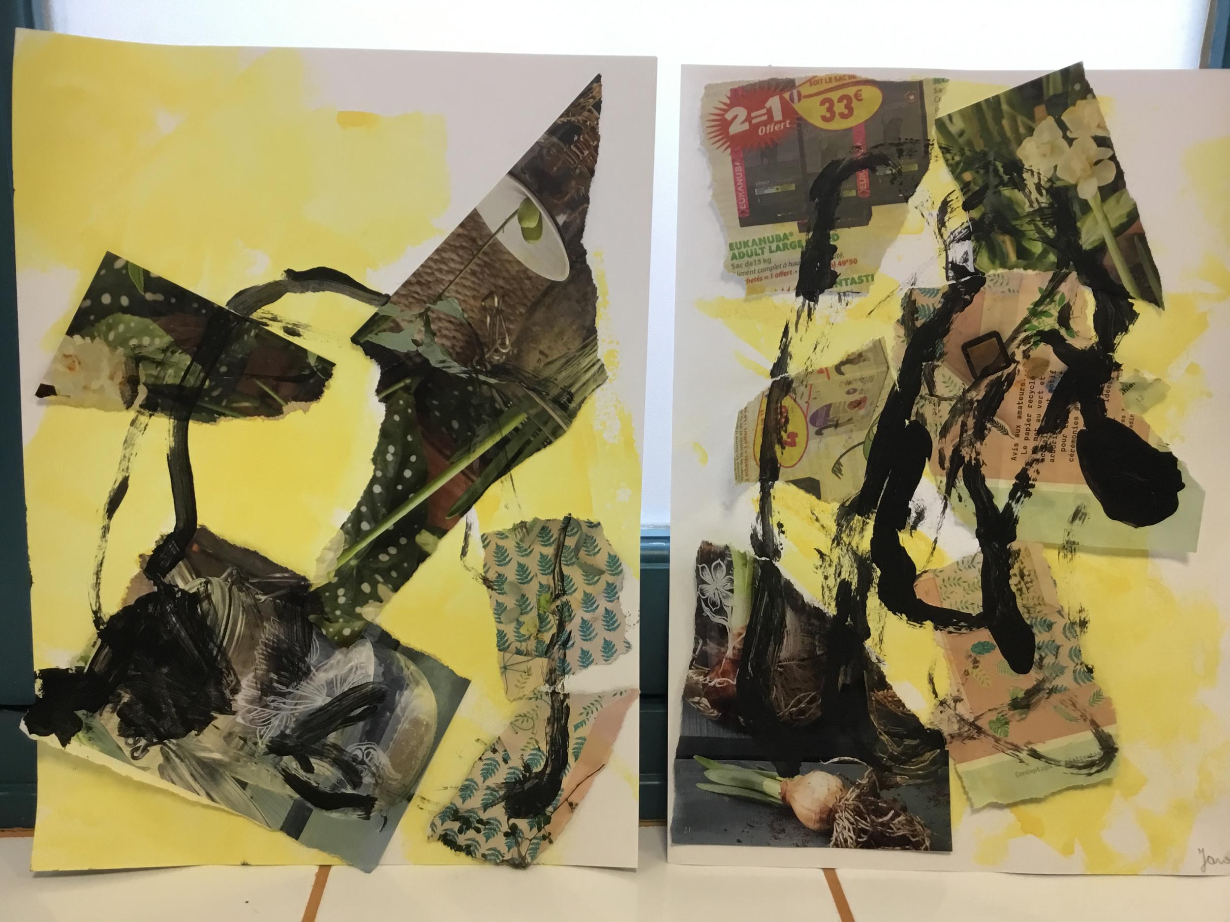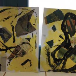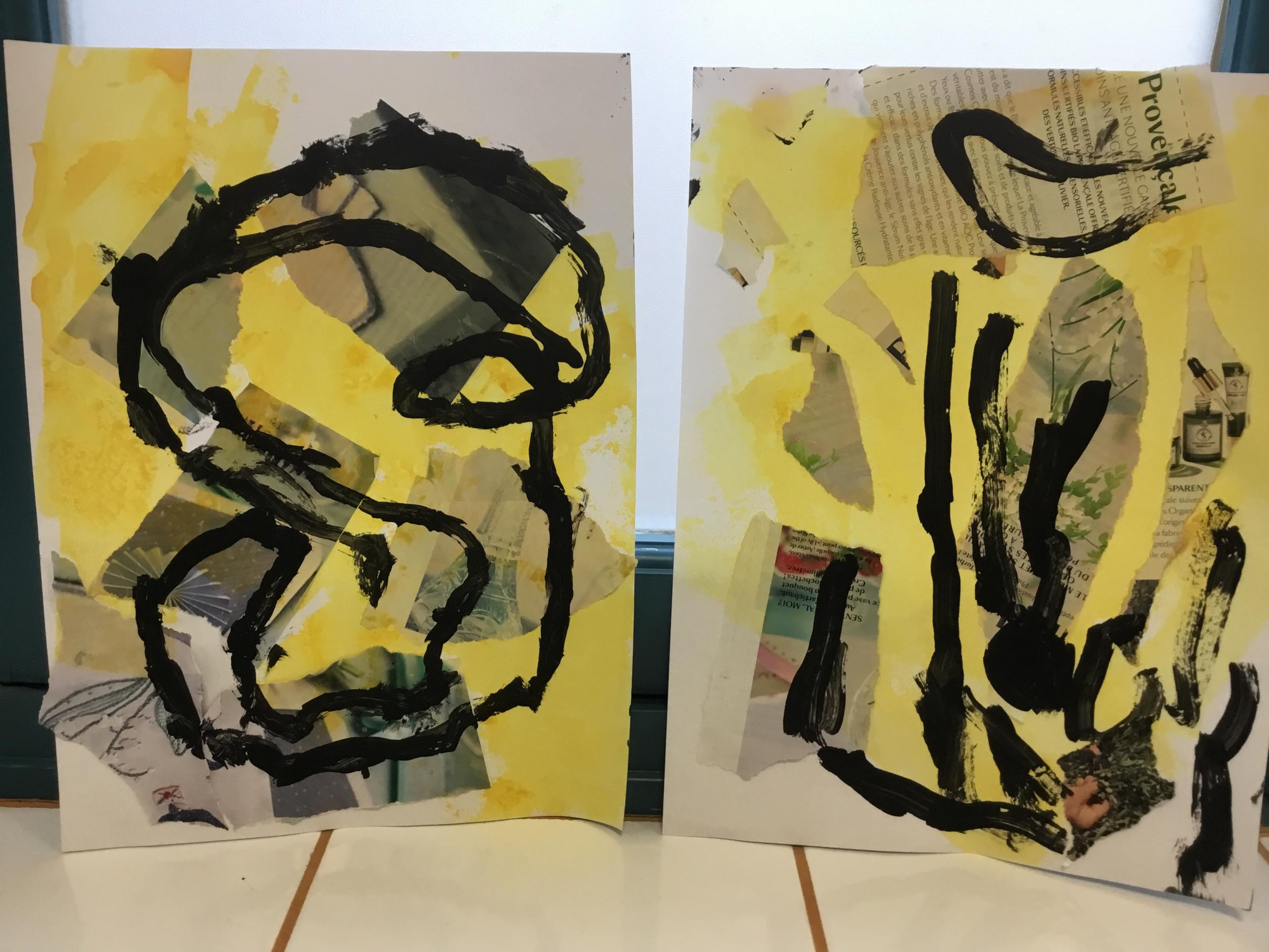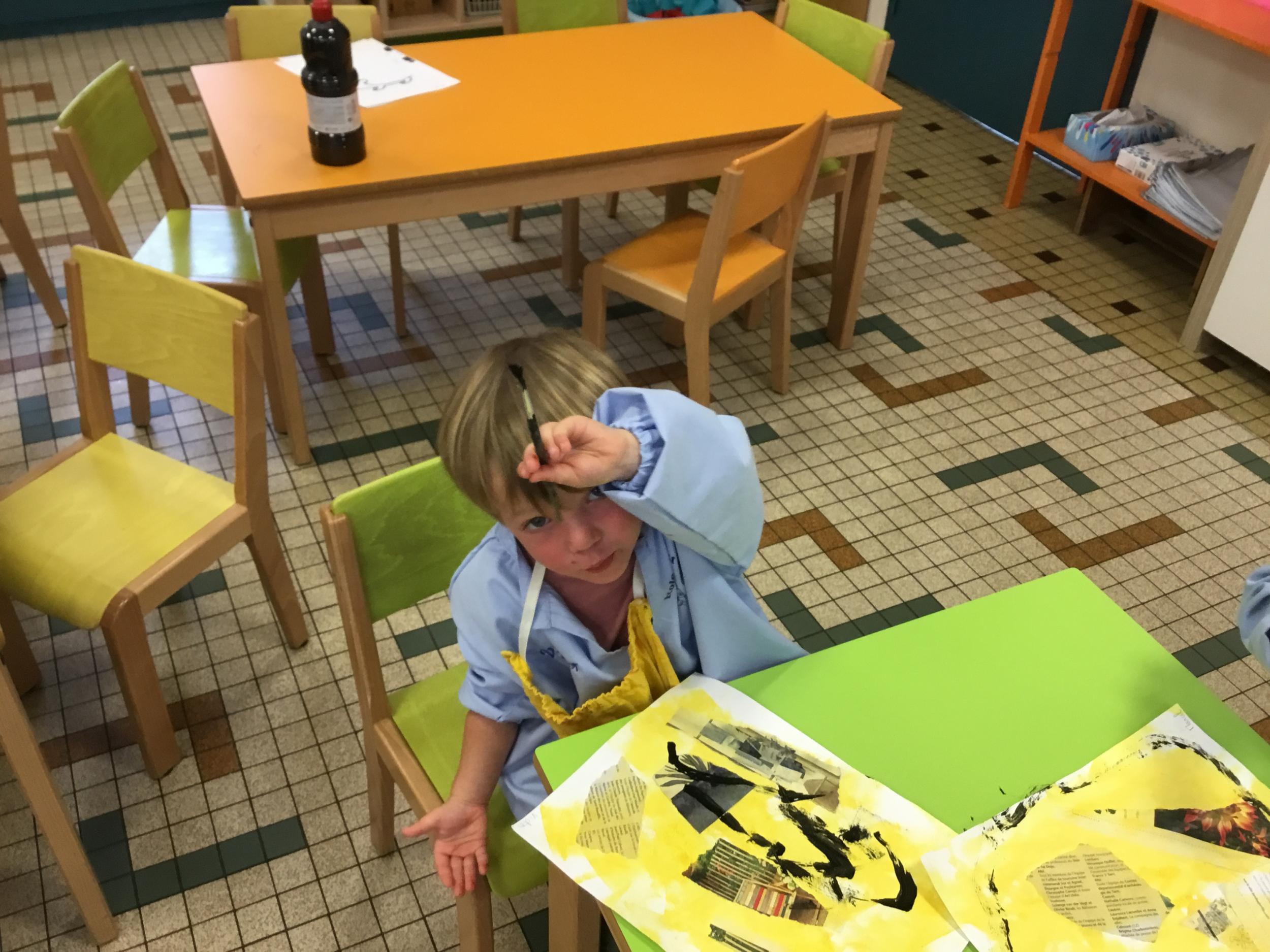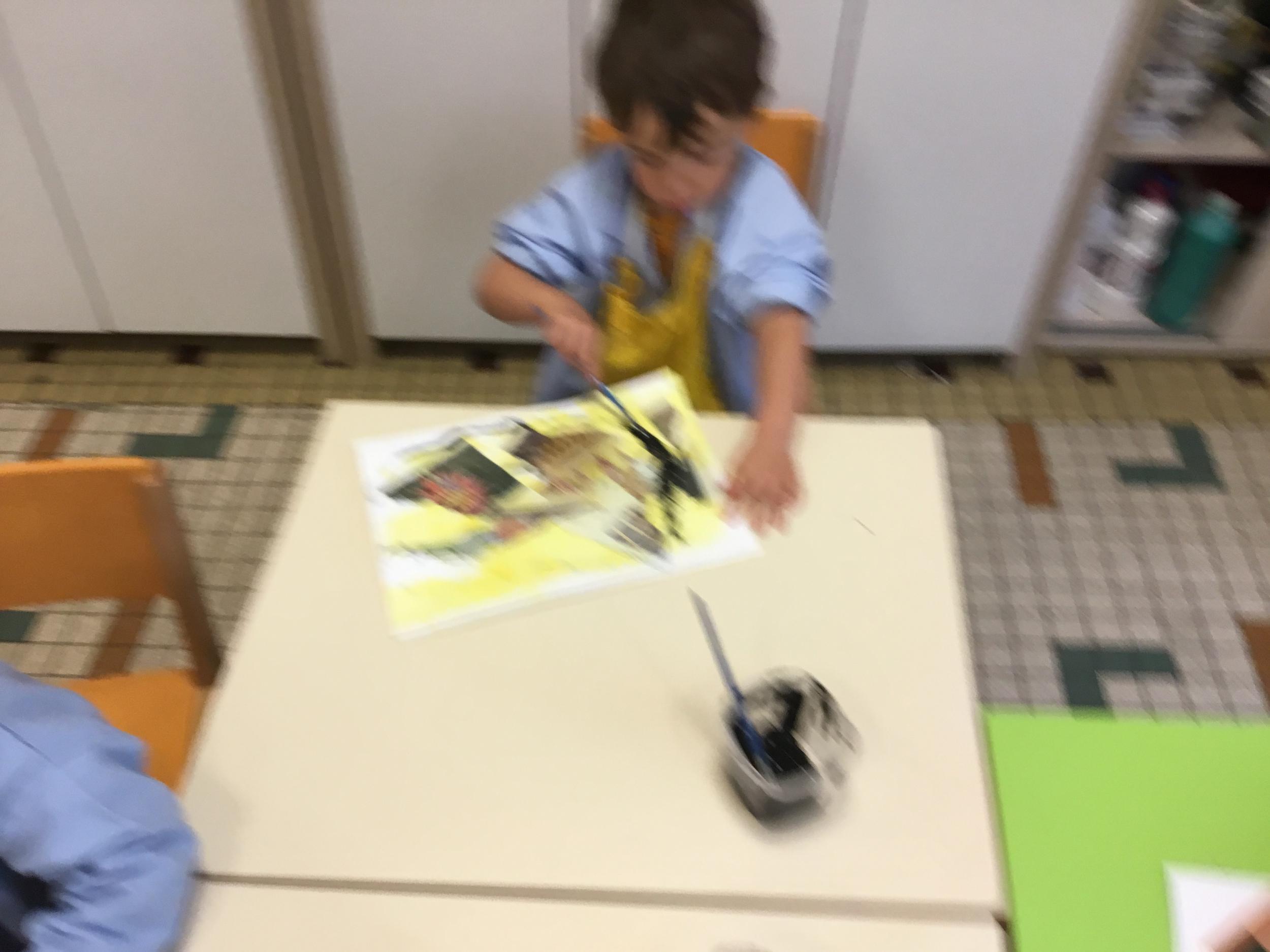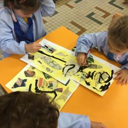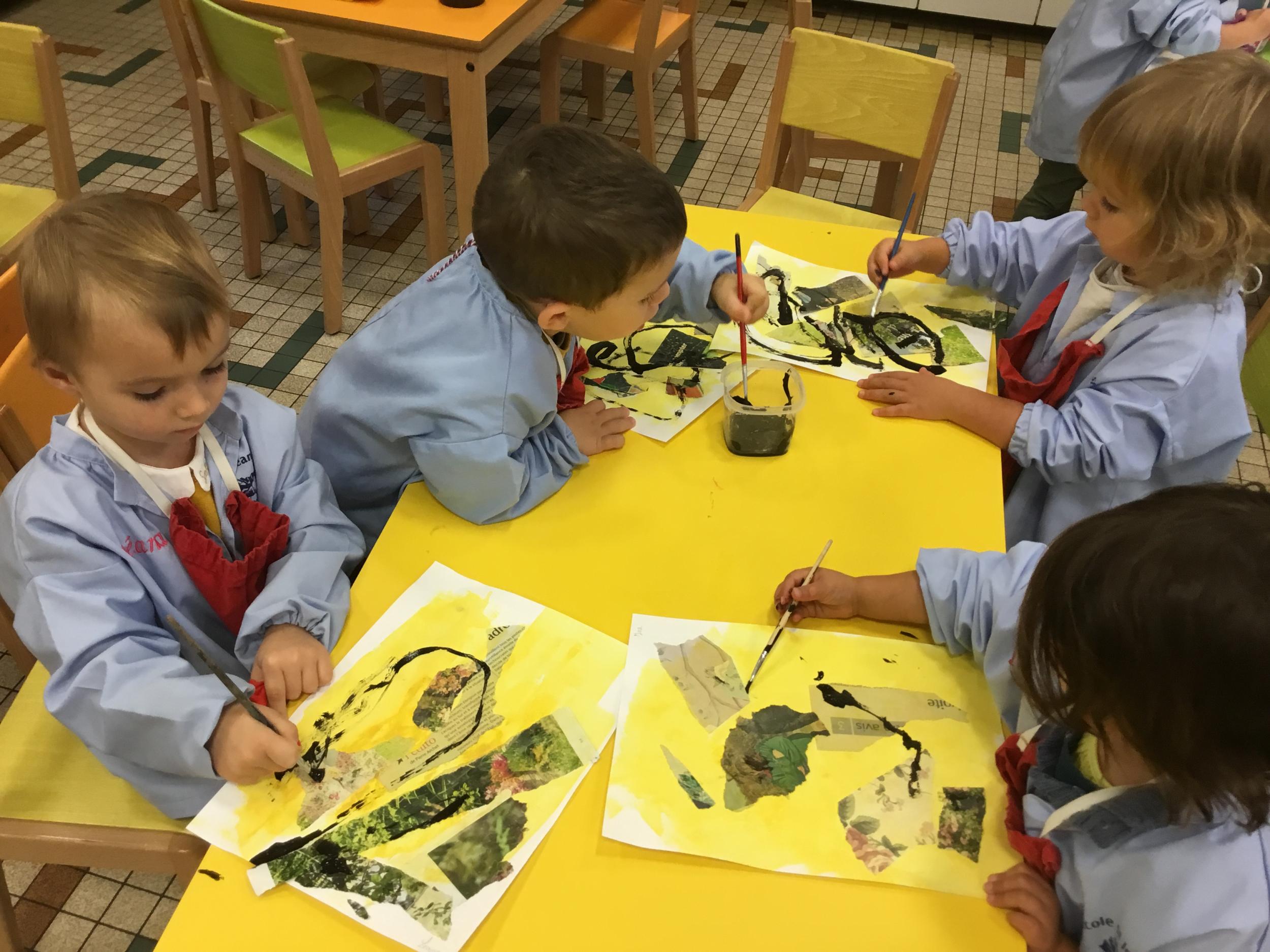 cette œuvre a permis de travailler dans le domaine de l’écrit. Après un travail de collage de papiers déchirés et de la réalisation d’un aplat de couleur jaune, ils ont tracé des chemins. Première approche du geste de l’écrit.