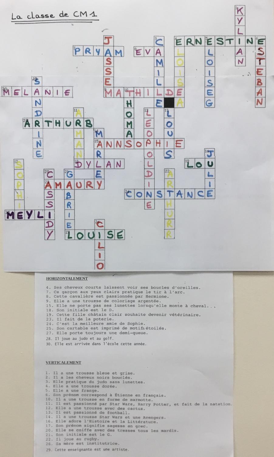 Les CM1 ont réalisé une grille de mots croisés constituée des prénoms des membres de la classe.