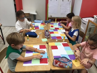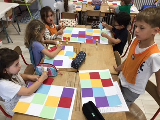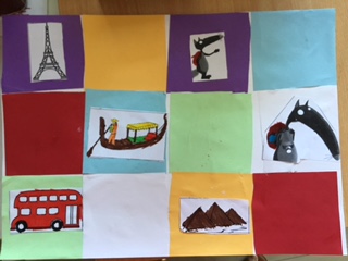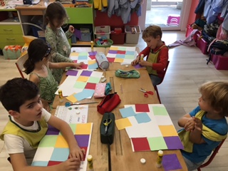 Parallèlement à cela, nous avons travaillé le découpage, l'assemblage et le collage de carrés pour obtenir un pavage similaire à la couverture de l'album et collé dessus quelques dessins de celui-ci.