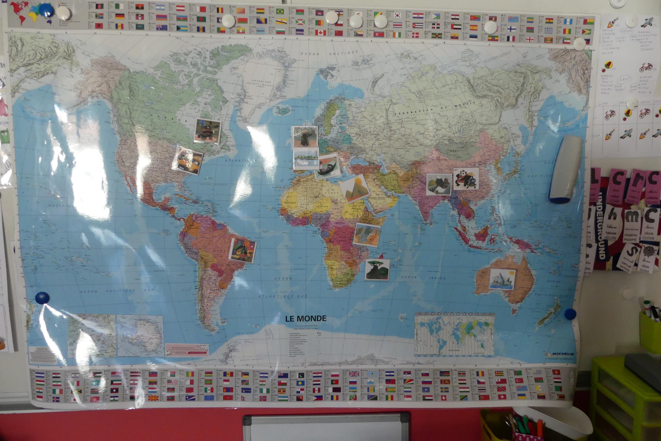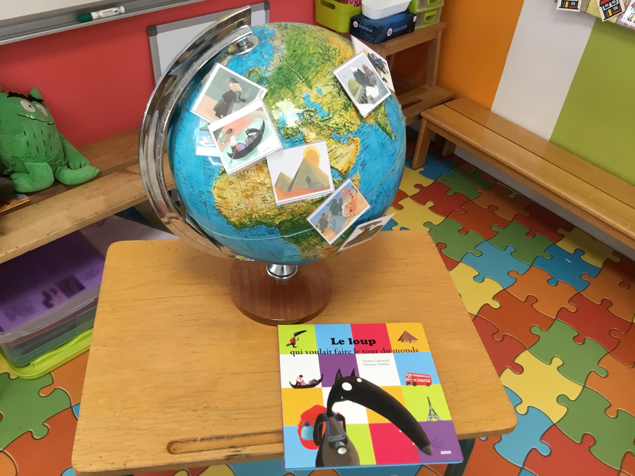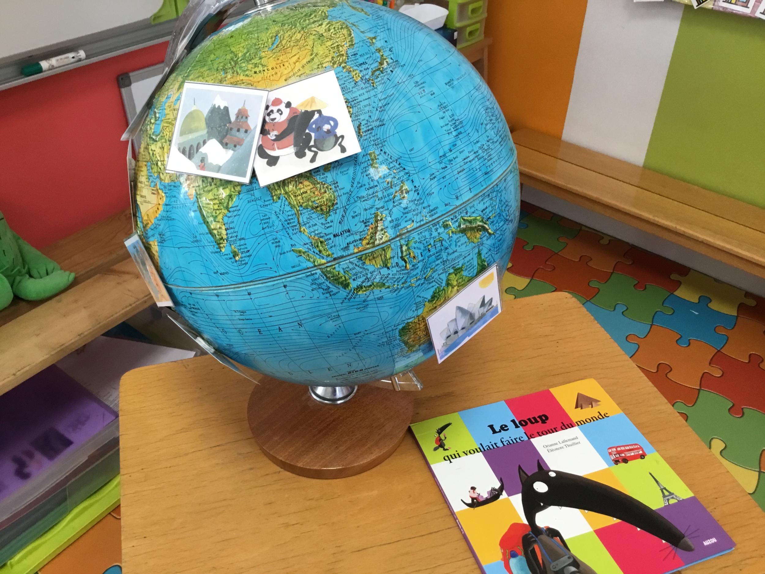 En classe, nous avons observé un globe terrestre, discuté dessus, puis collé les images du voyage de Loup.