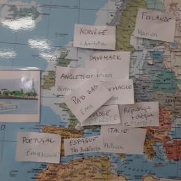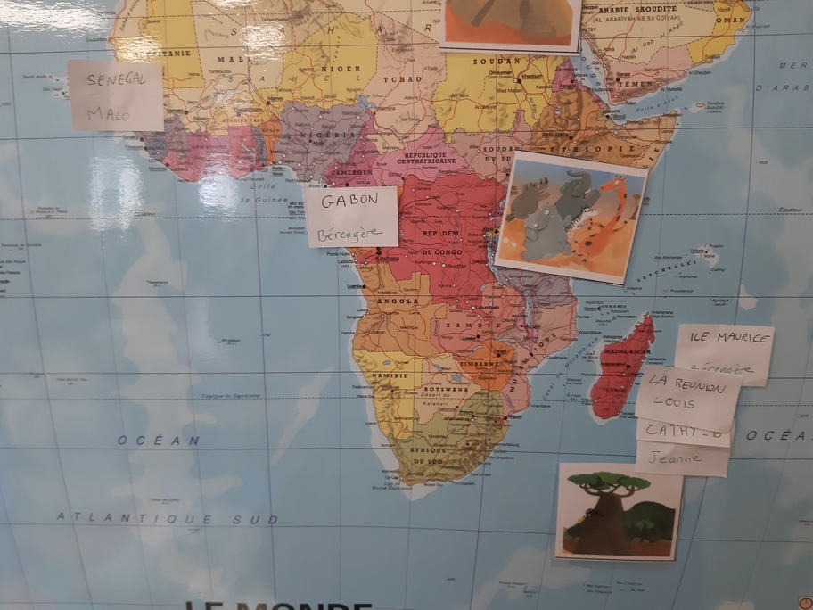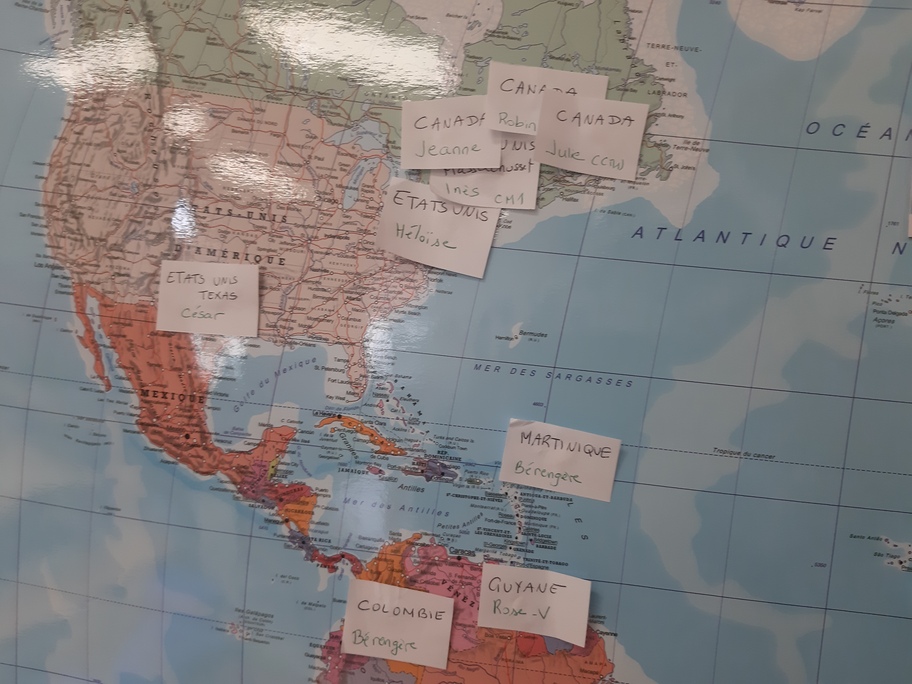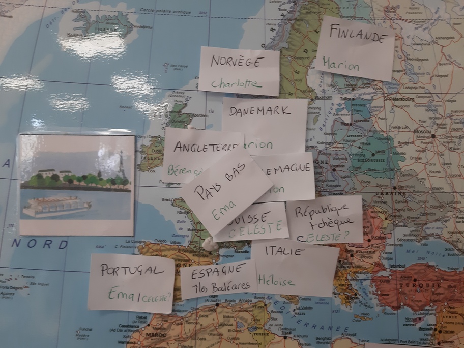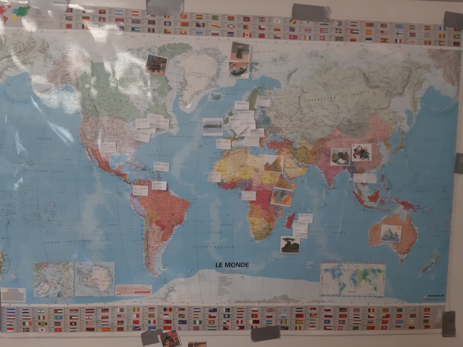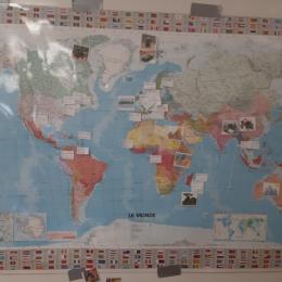 Avant de partir, nous avons étiqueté notre planisphère en indiquant tous les pays destinataires de nos lettres!