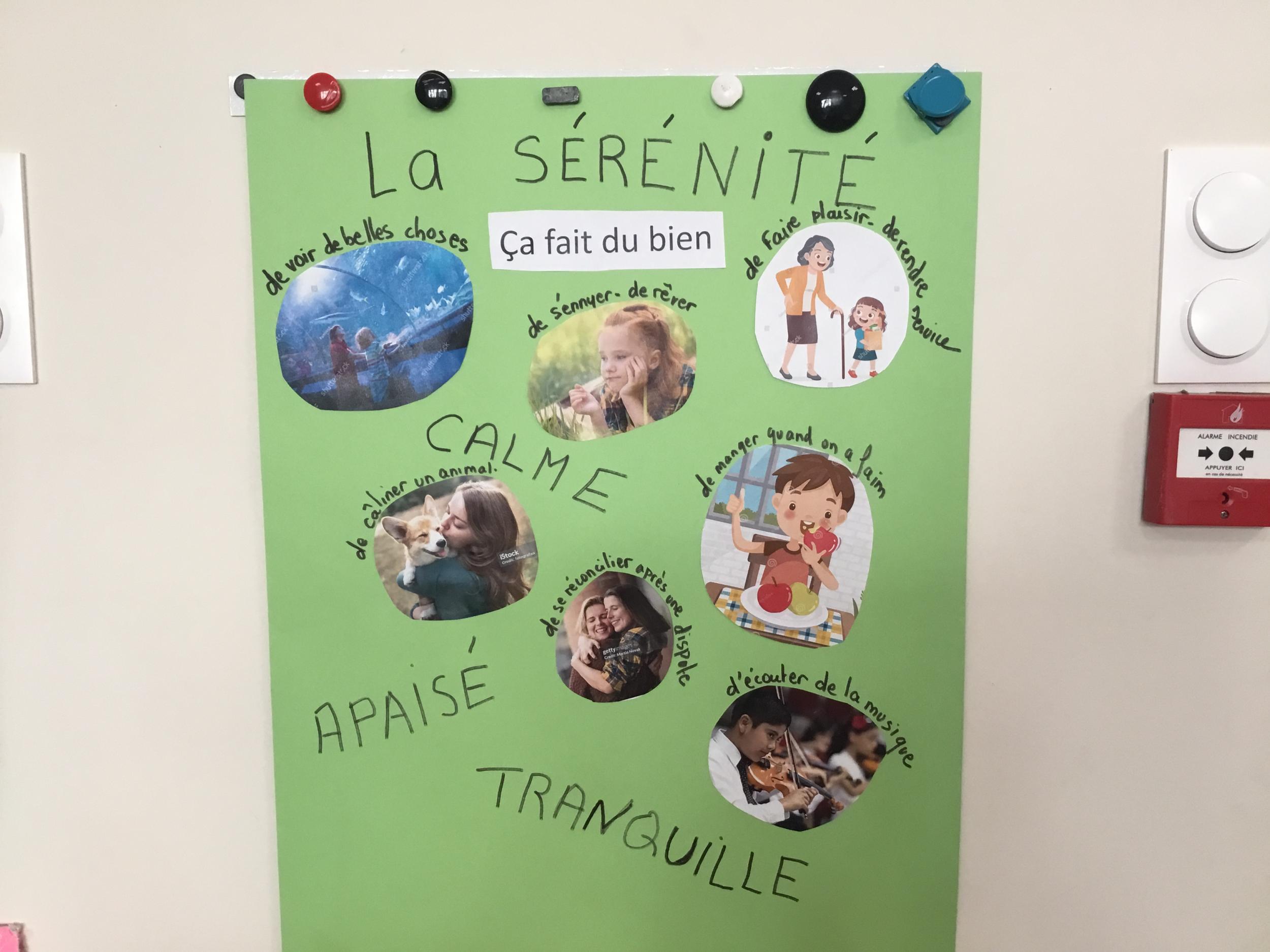 A l’atelier de Gigi et Loulou , nous avons travaillé les émotions et le vocabulaire des émotions. Puis nous avons collé des images qui représentent des situations de calme, de tranquillité ou de colère…