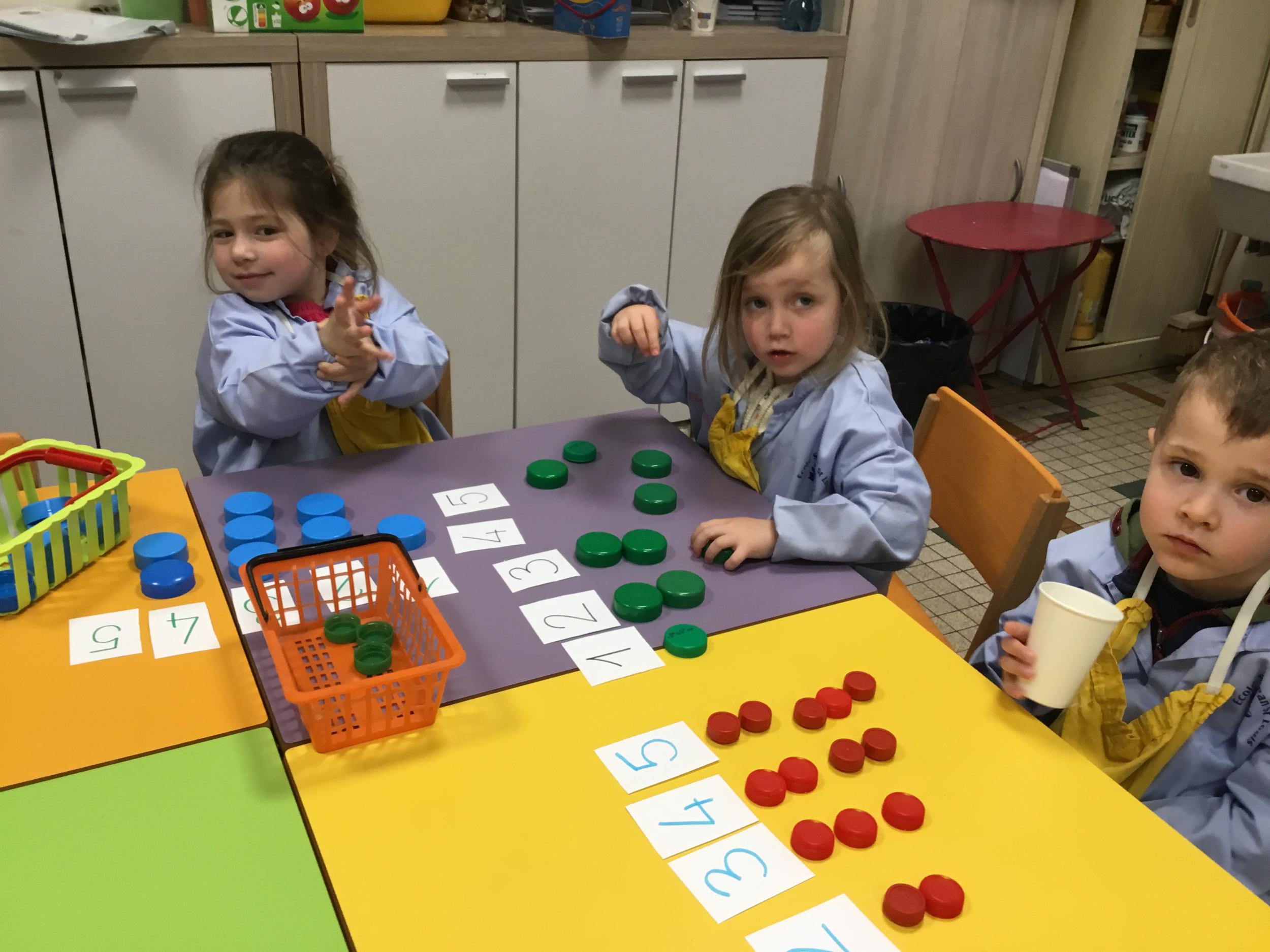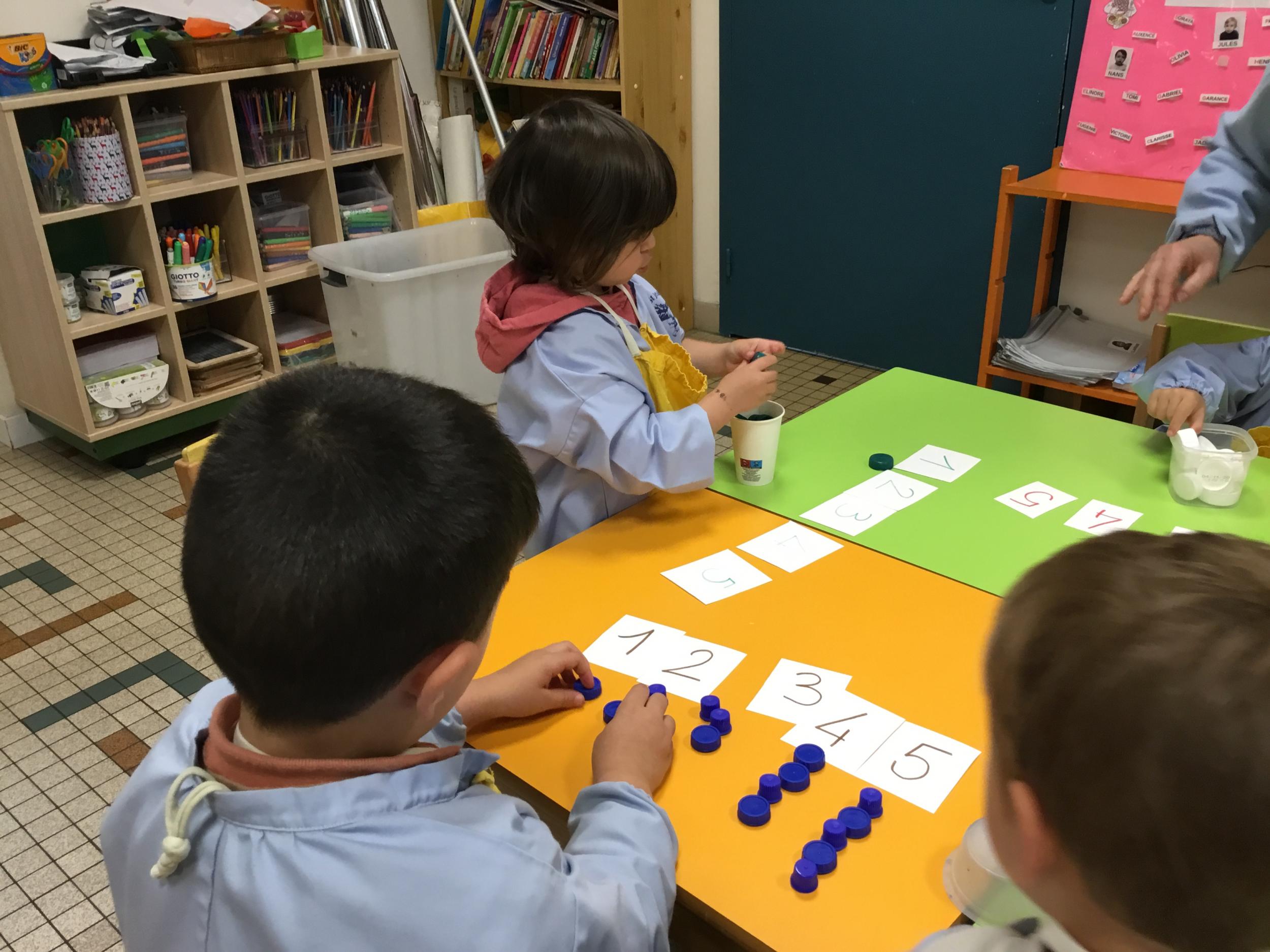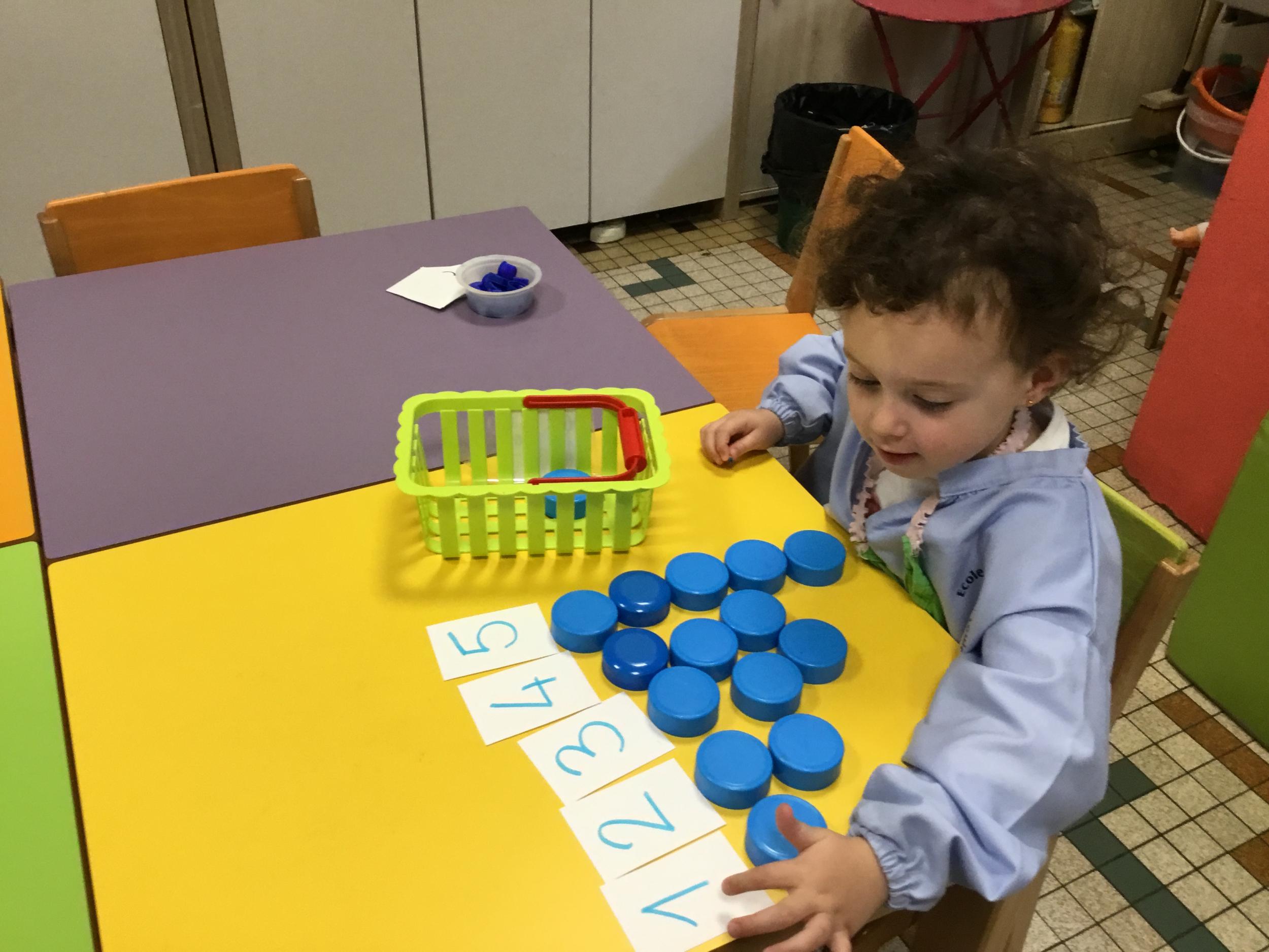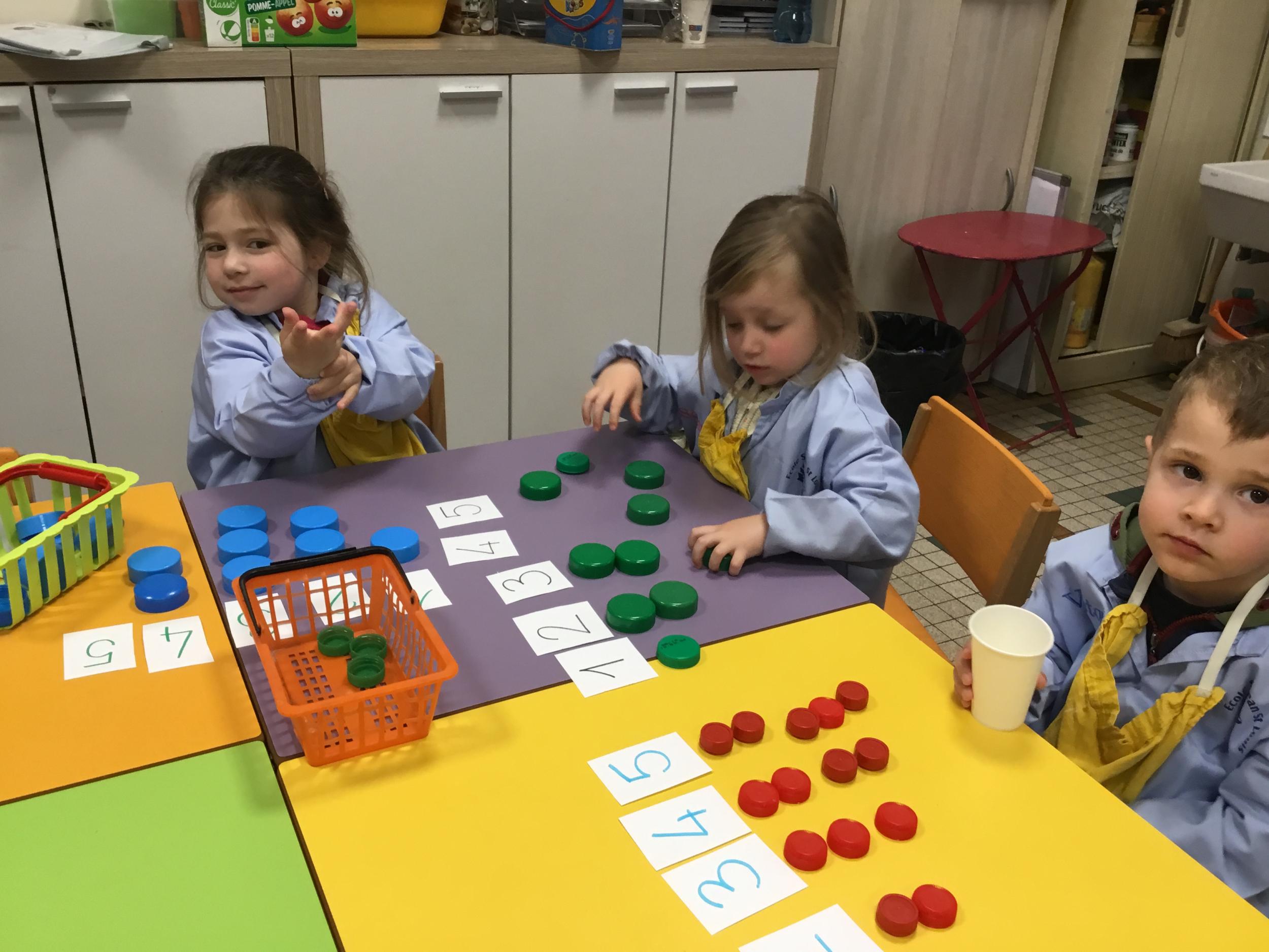 Puis chaque enfant est invité à compléter avec des jetons chacun des chiffres en disant 1 et 1 ça fait 2 puis 1 et 1 et 1 ça fait 3 …
