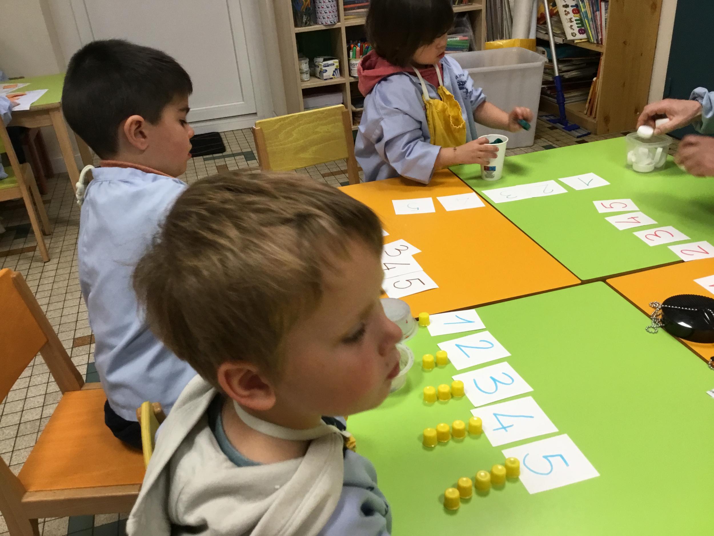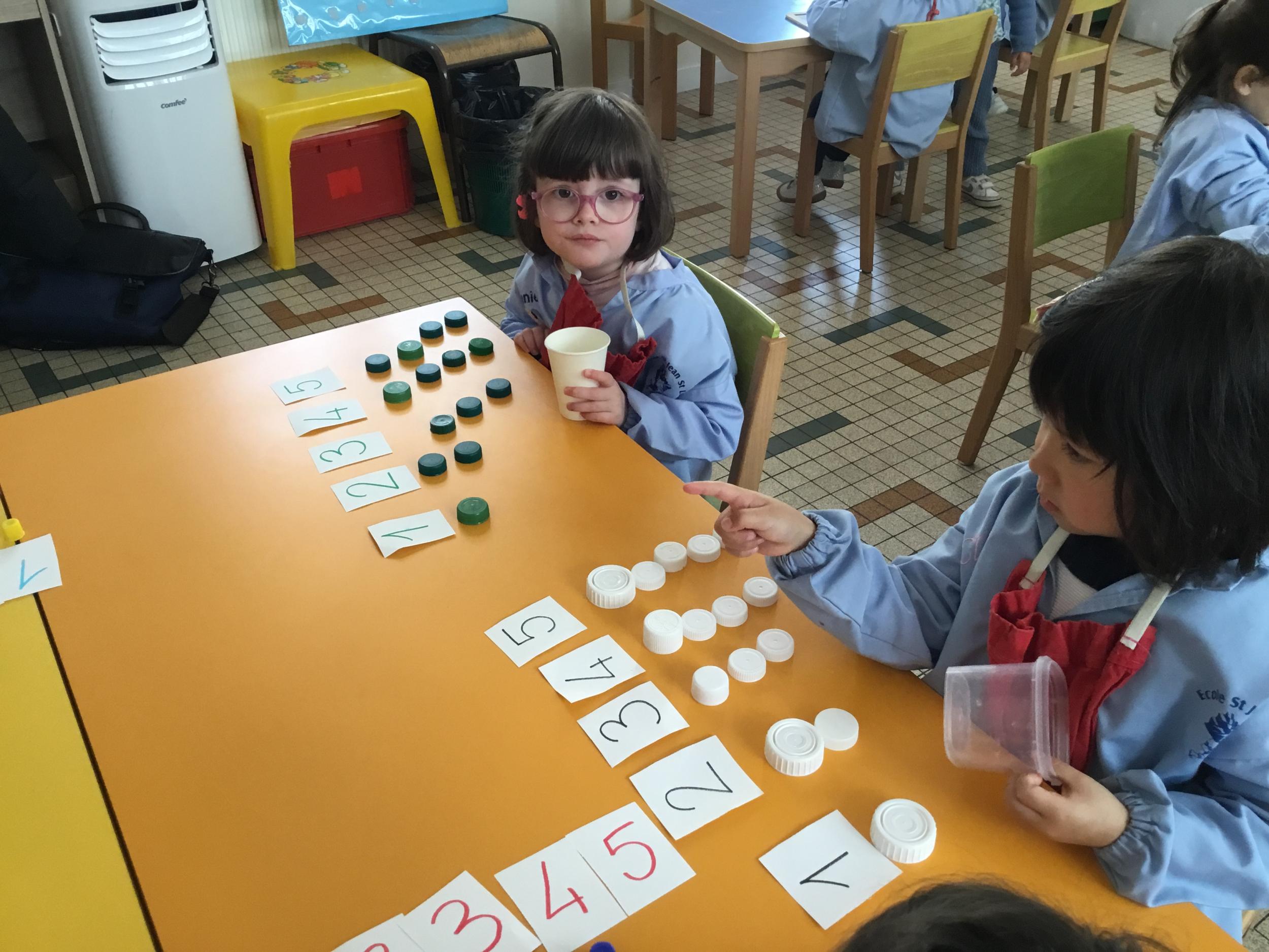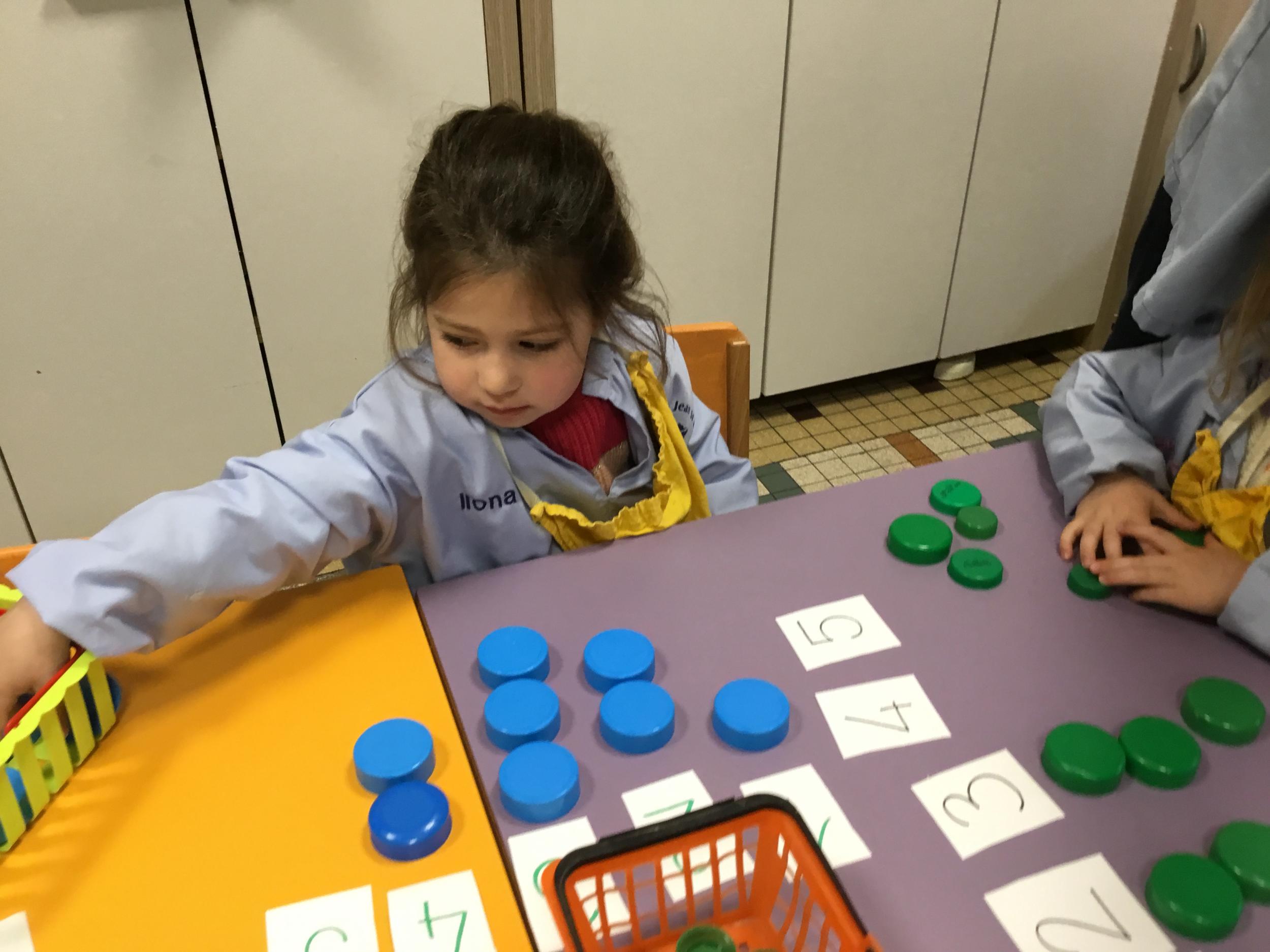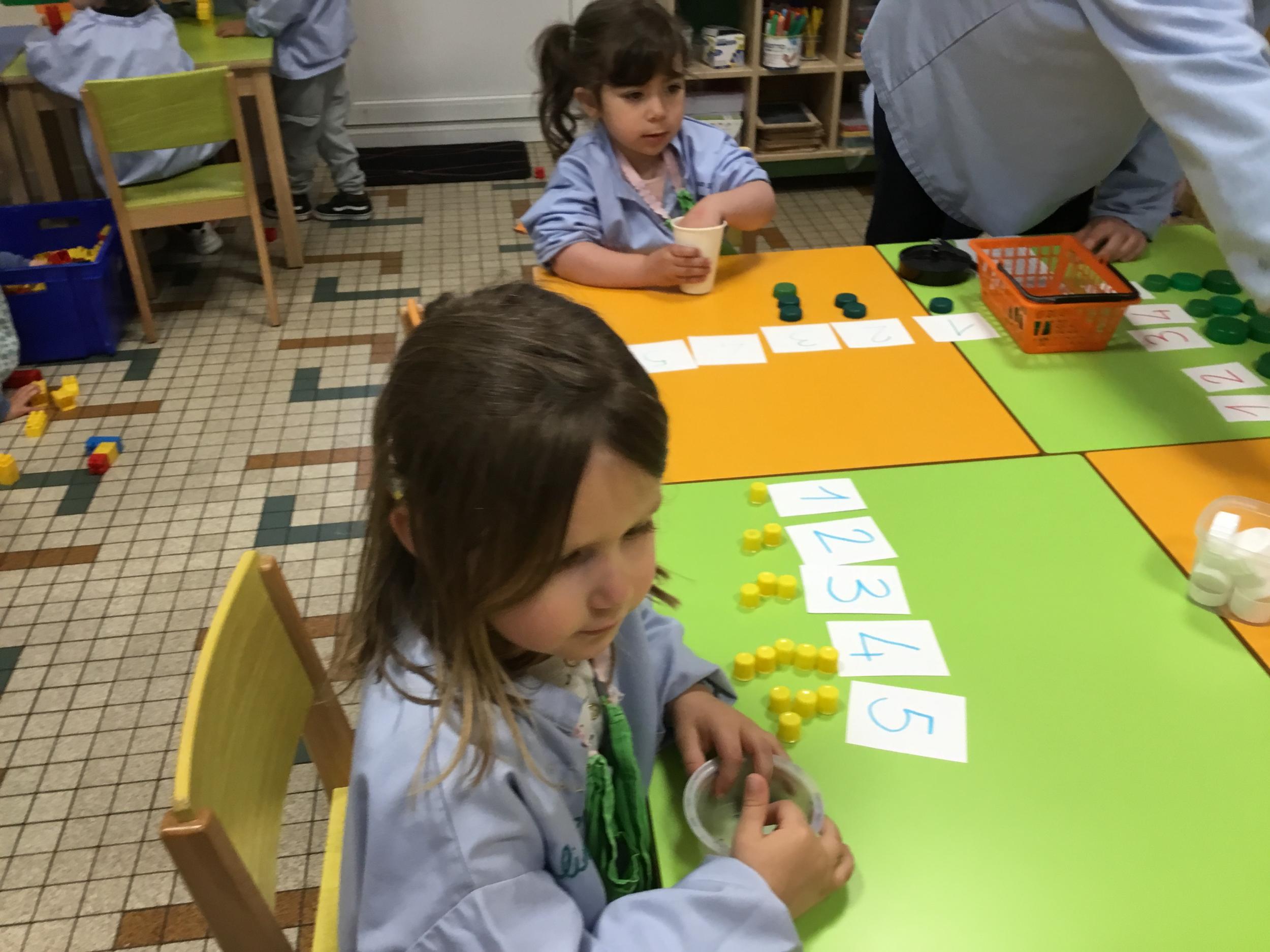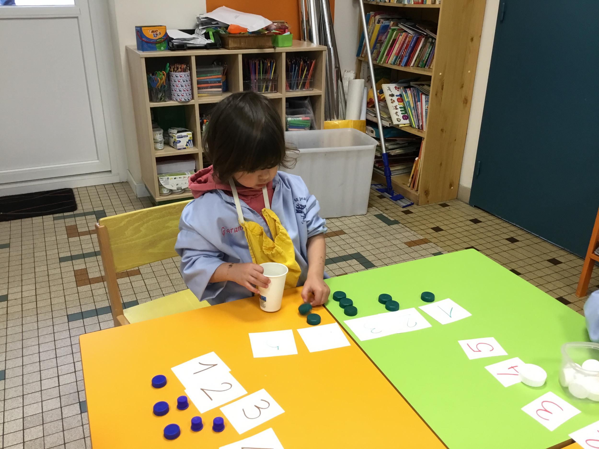 Puis chaque enfant est invité à compléter avec des jetons chacun des chiffres en disant 1 et 1 ça fait 2 puis 1 et 1 et 1 ça fait 3 …