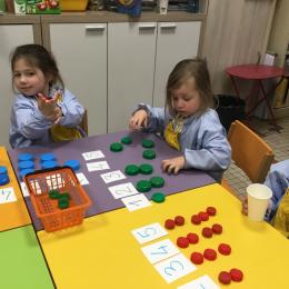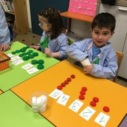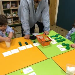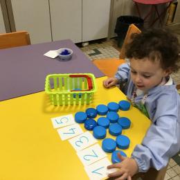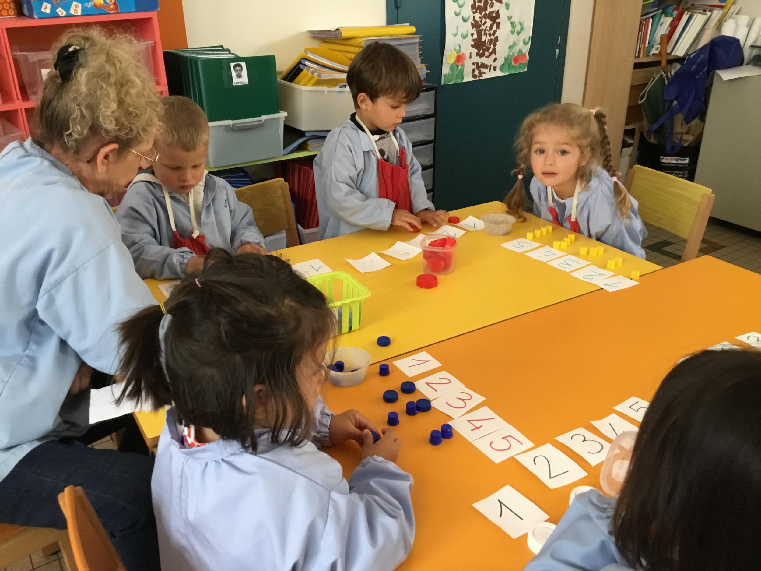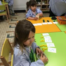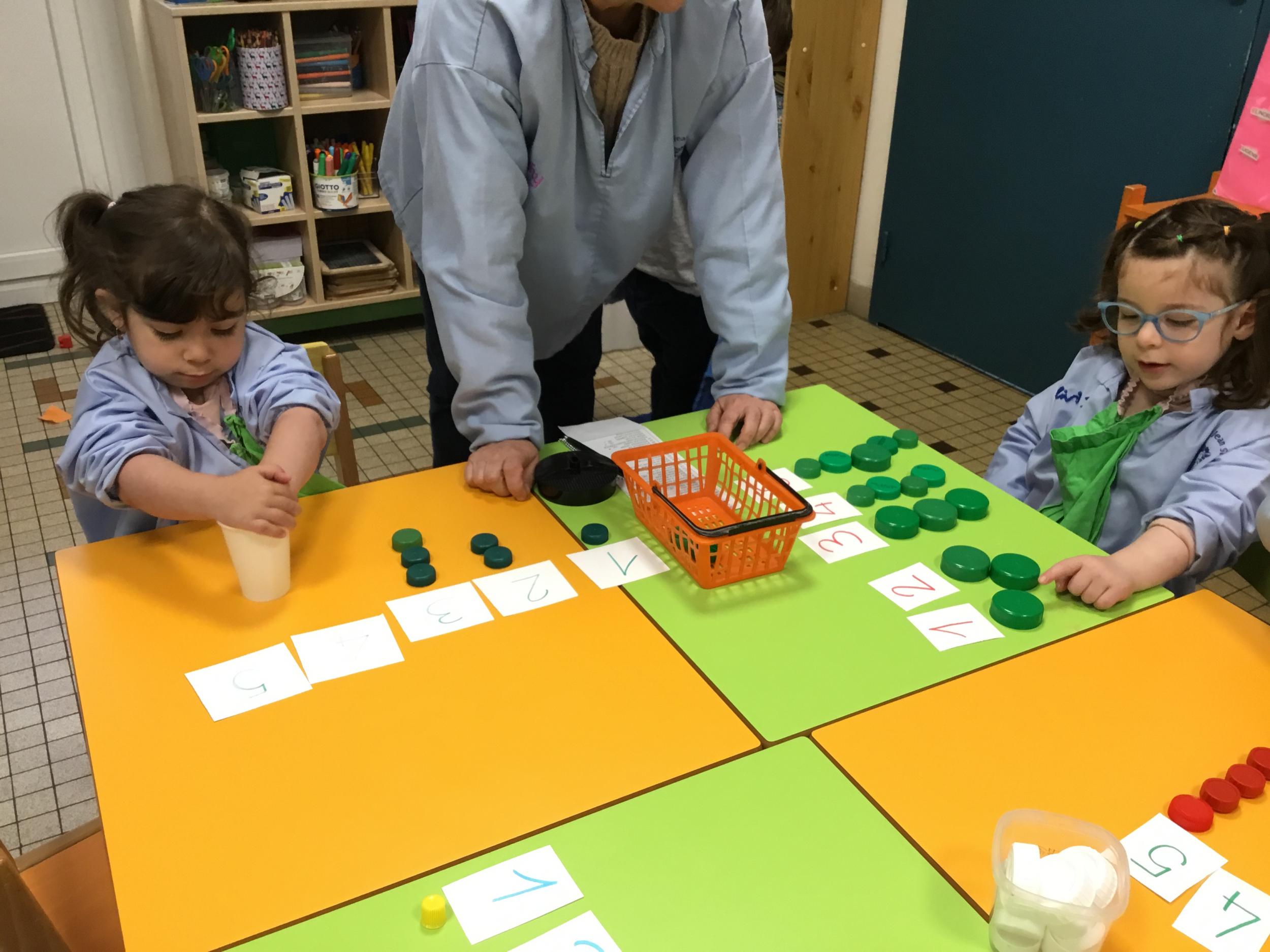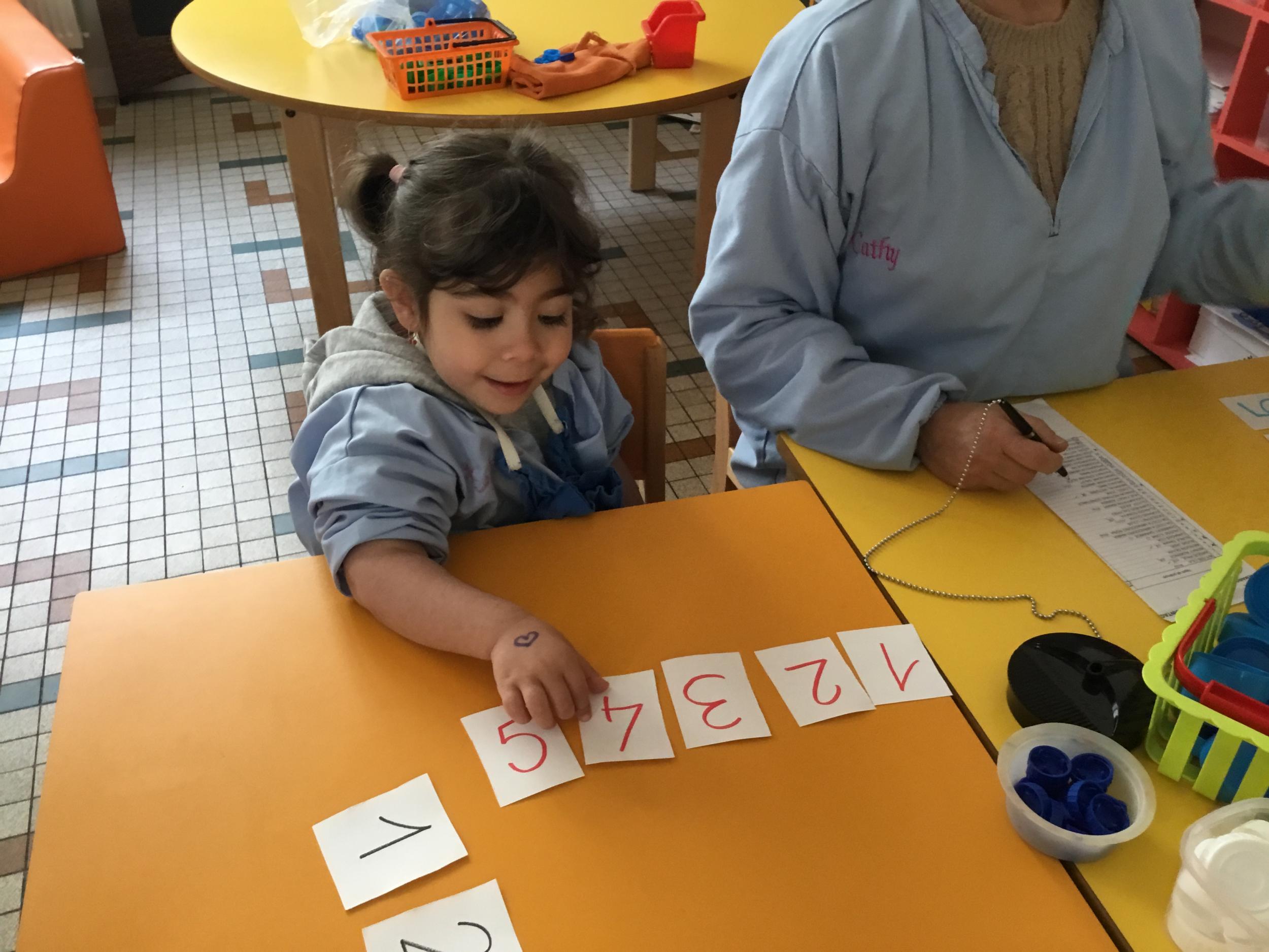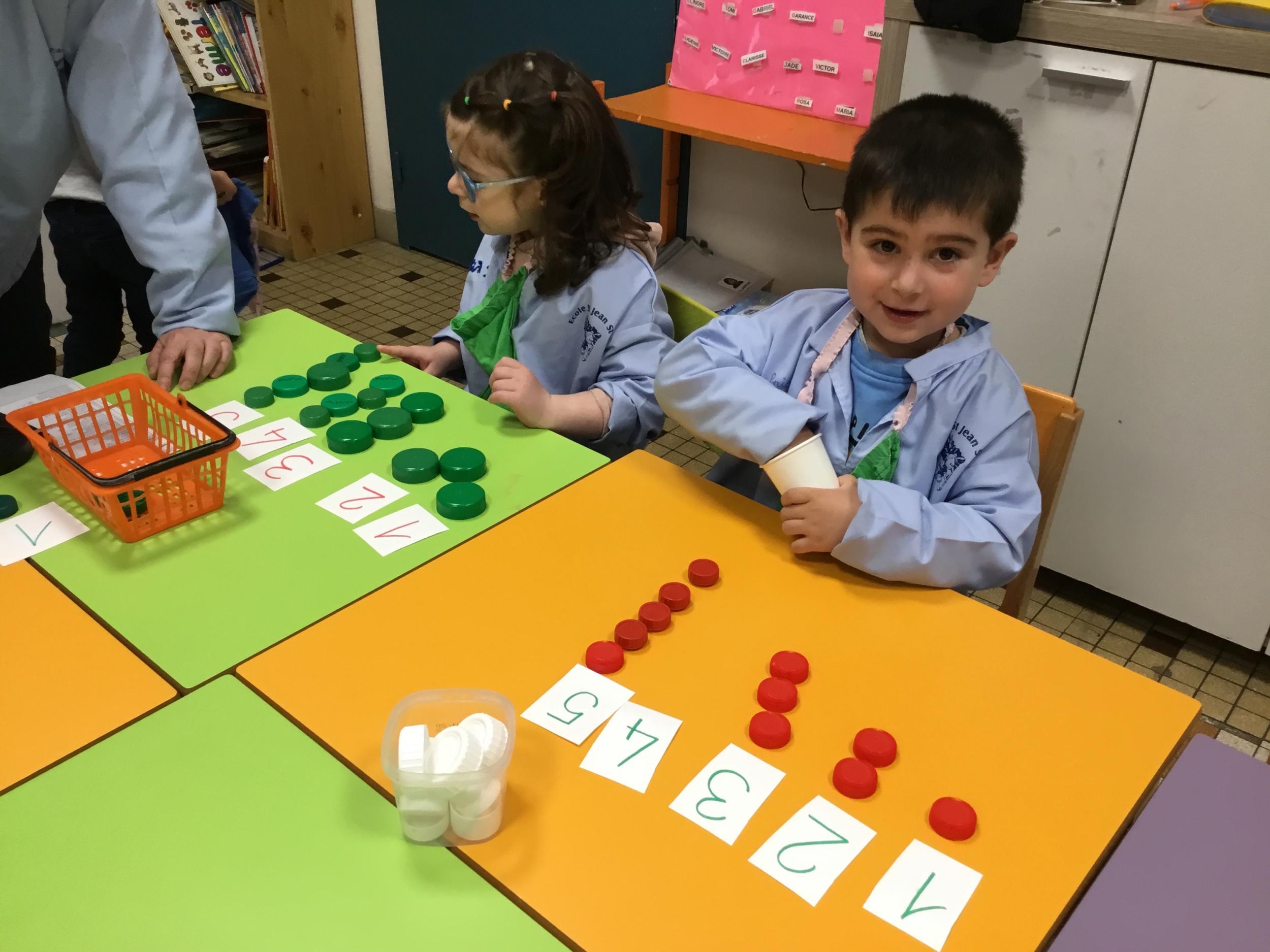 Puis chaque enfant est invité à compléter avec des jetons chacun des chiffres en disant 1 et 1 ça fait 2 puis 1 et 1 et 1 ça fait 3 …