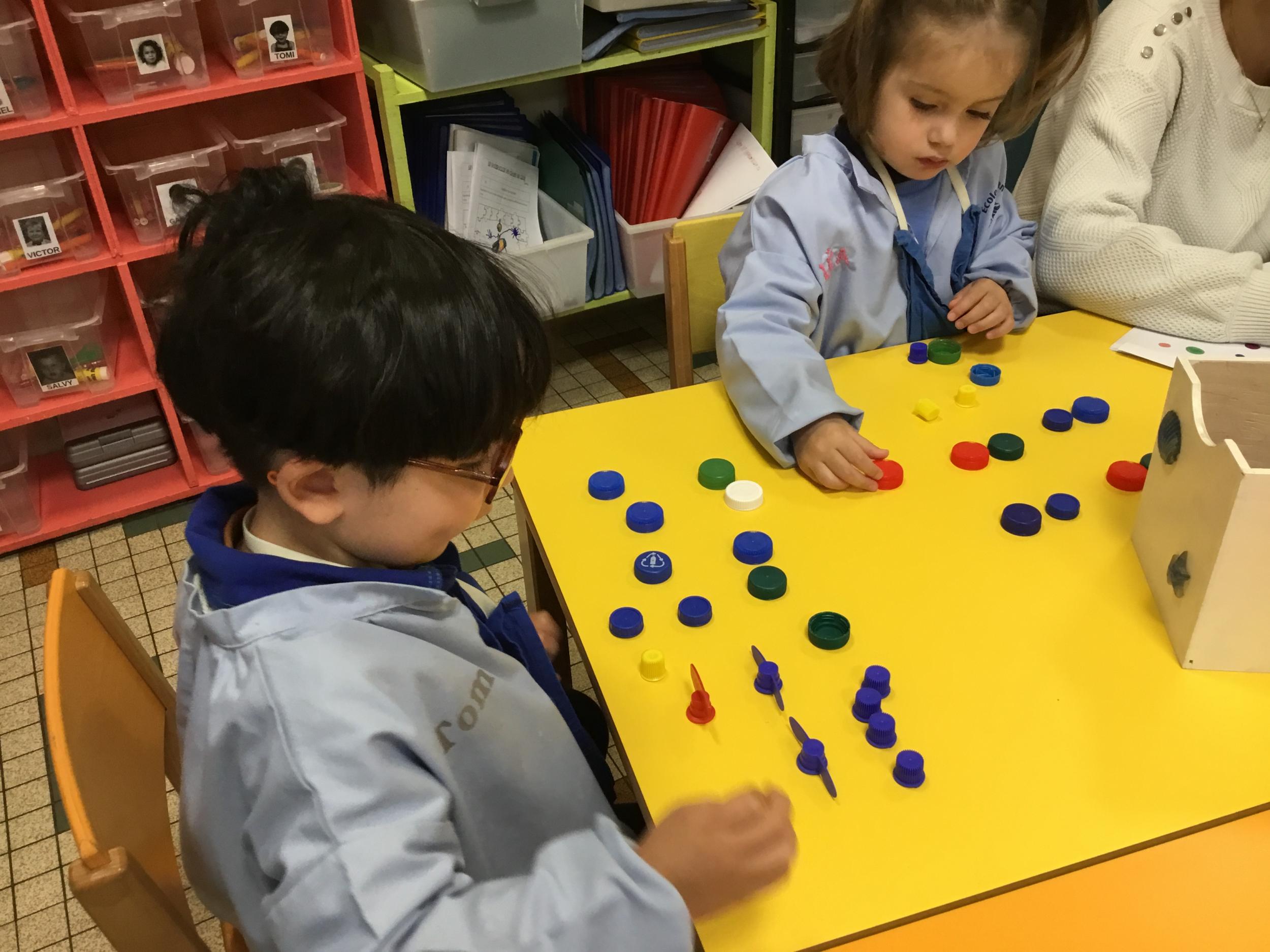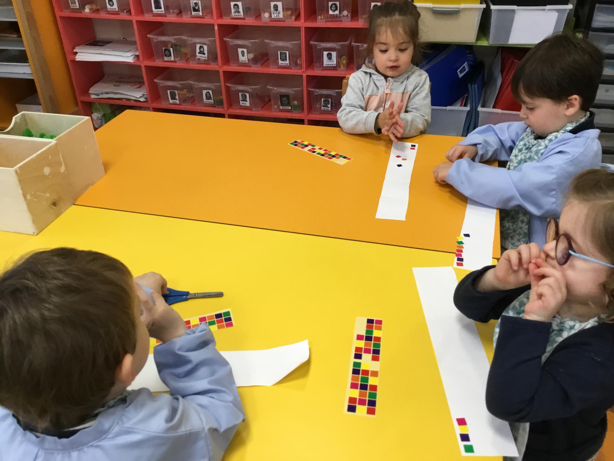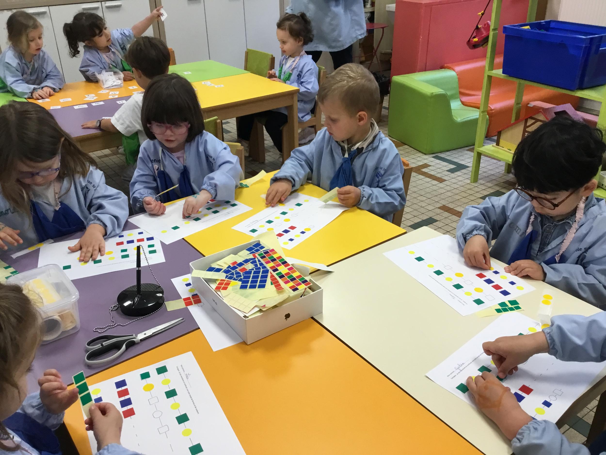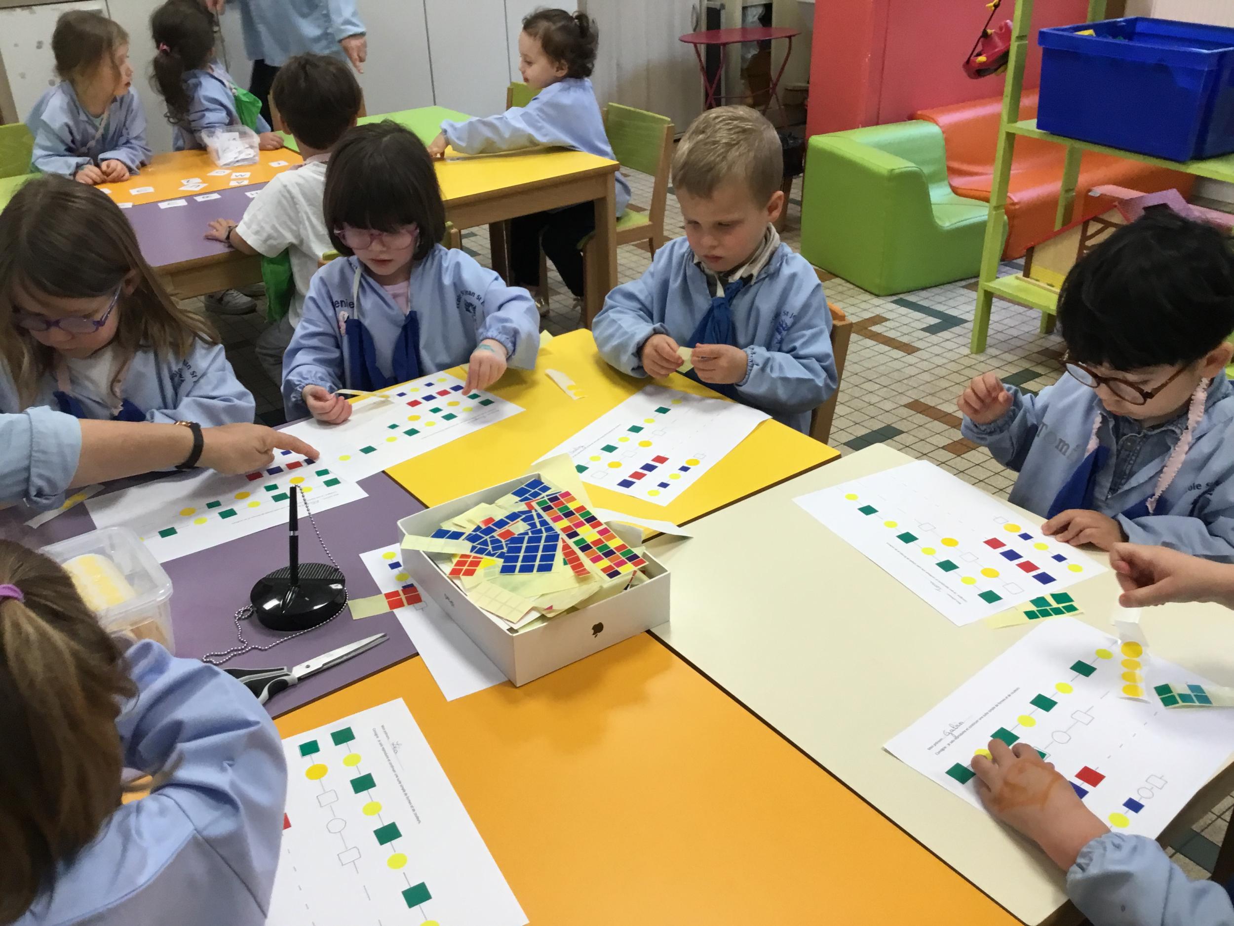 Les élèves ont d’abord manipulé et complété des suites de jetons. Certains ont inventé des algorithmes . Puis ils ont complété des suites à l’aide de gommettes.