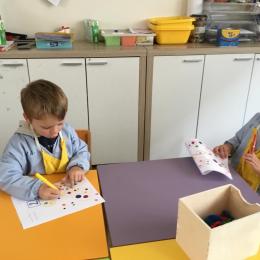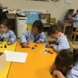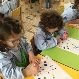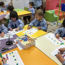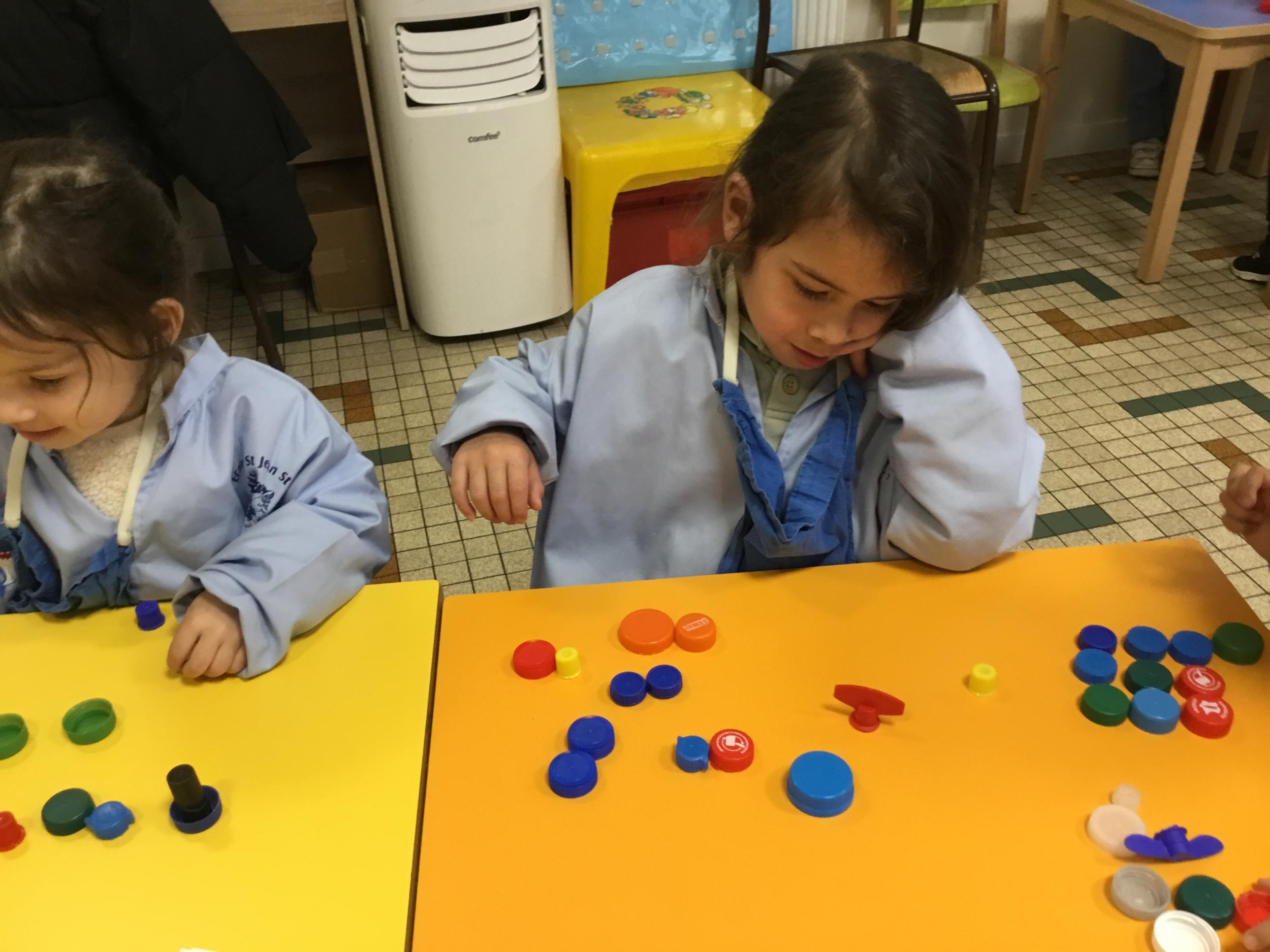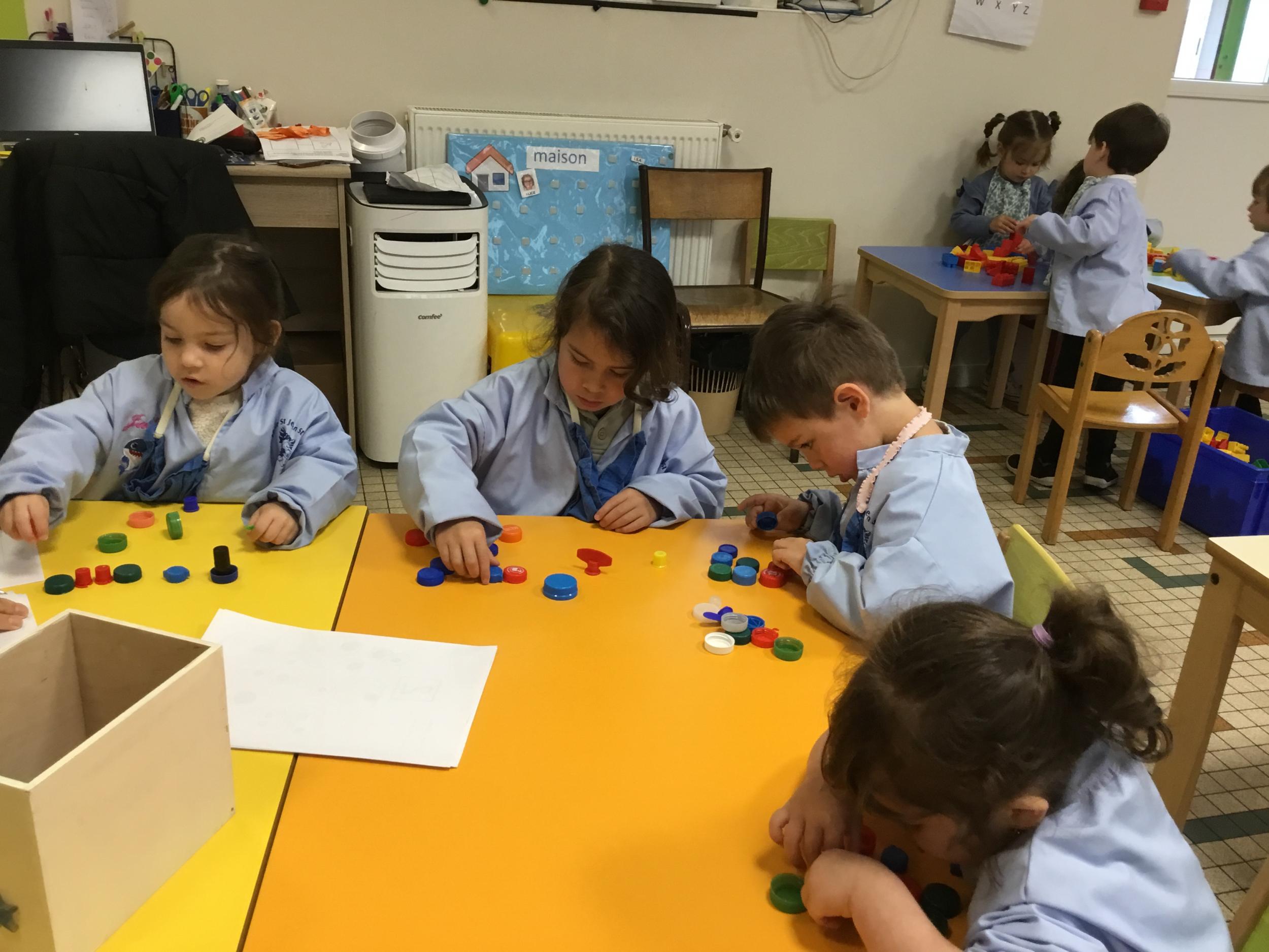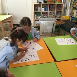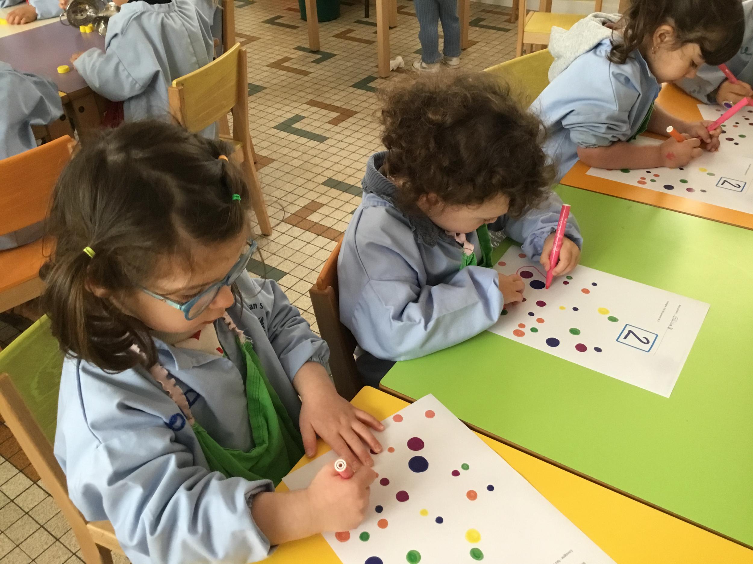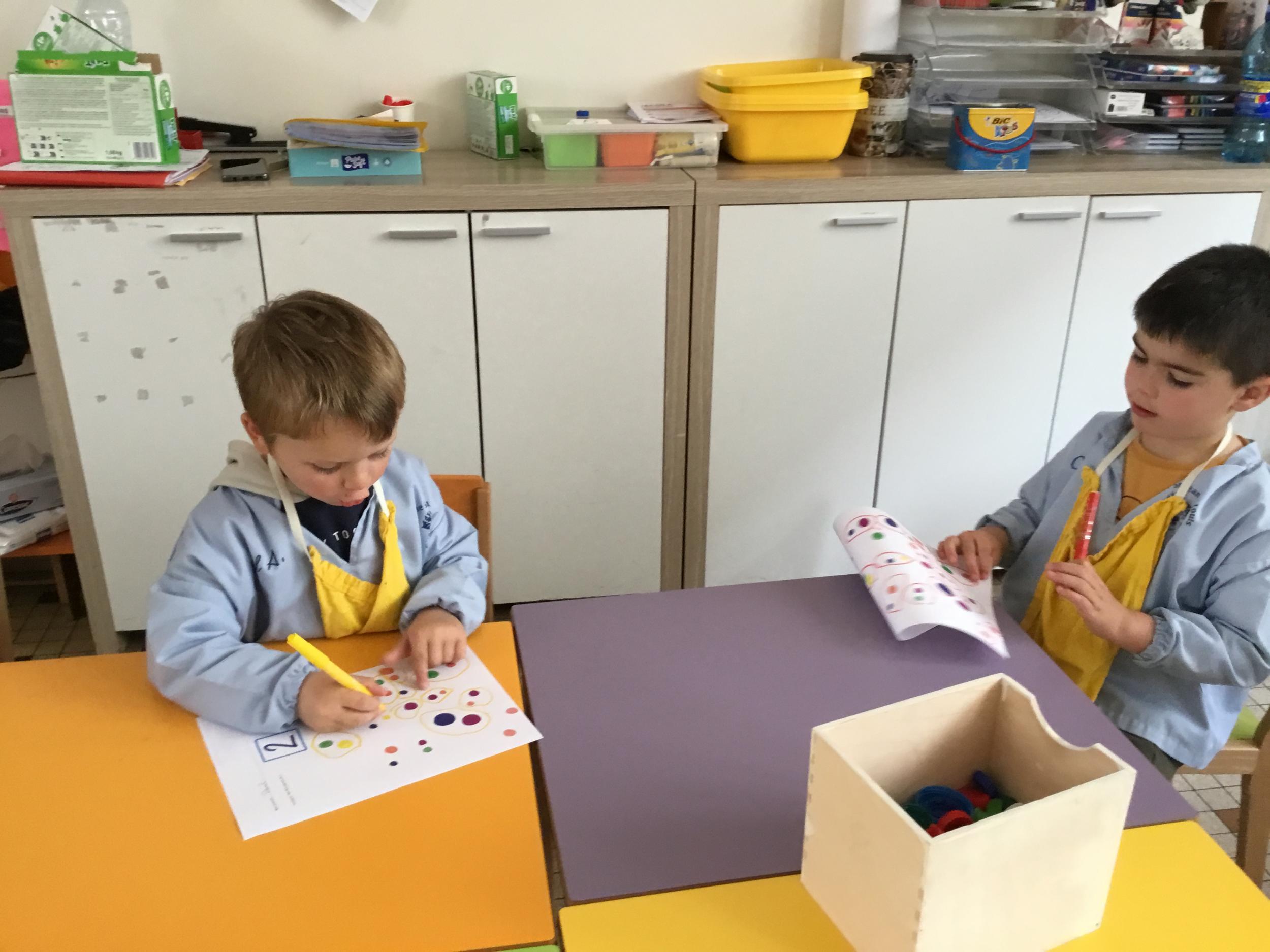 Les élèves ont d’abord manipulé et complété des suites de jetons. Certains ont inventé des algorithmes . Puis ils ont complété des suites à l’aide de gommettes.