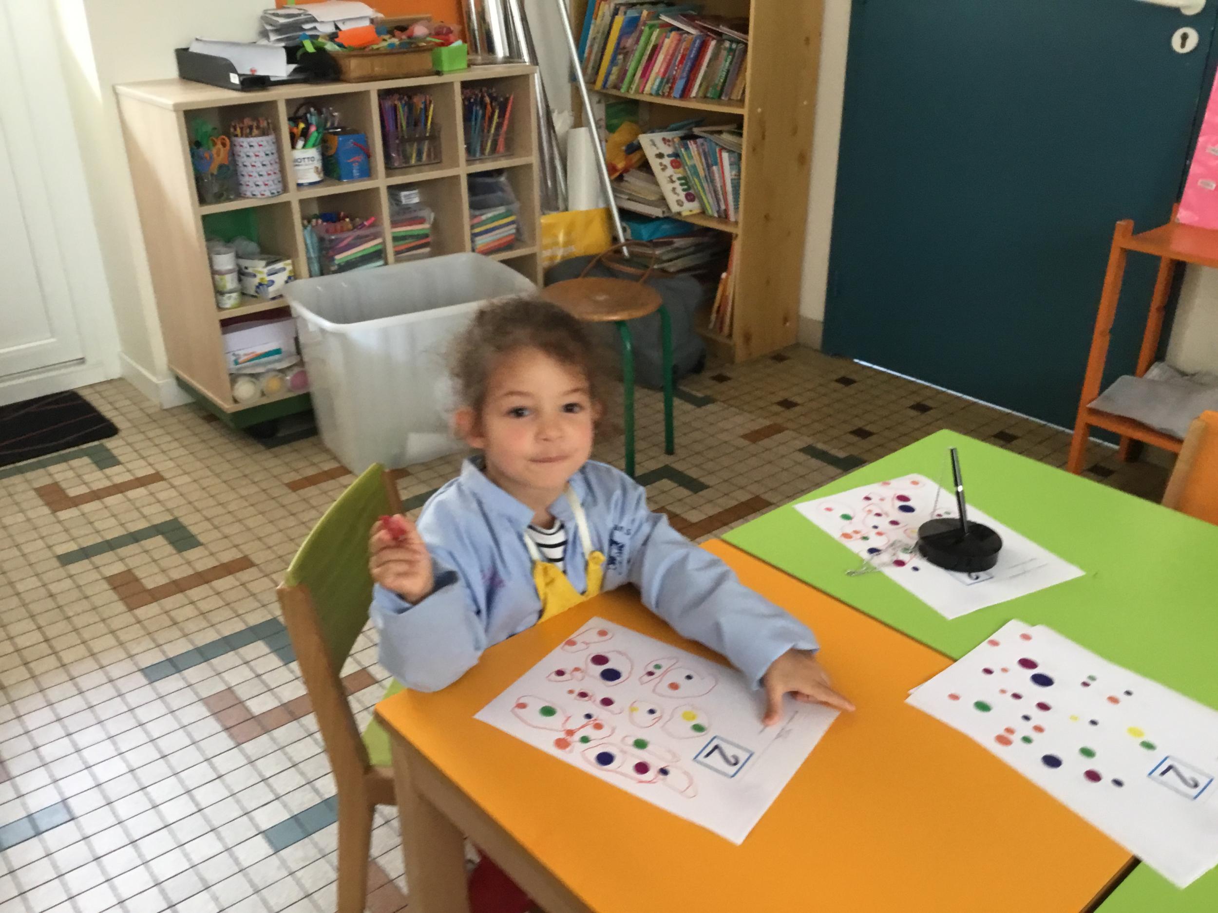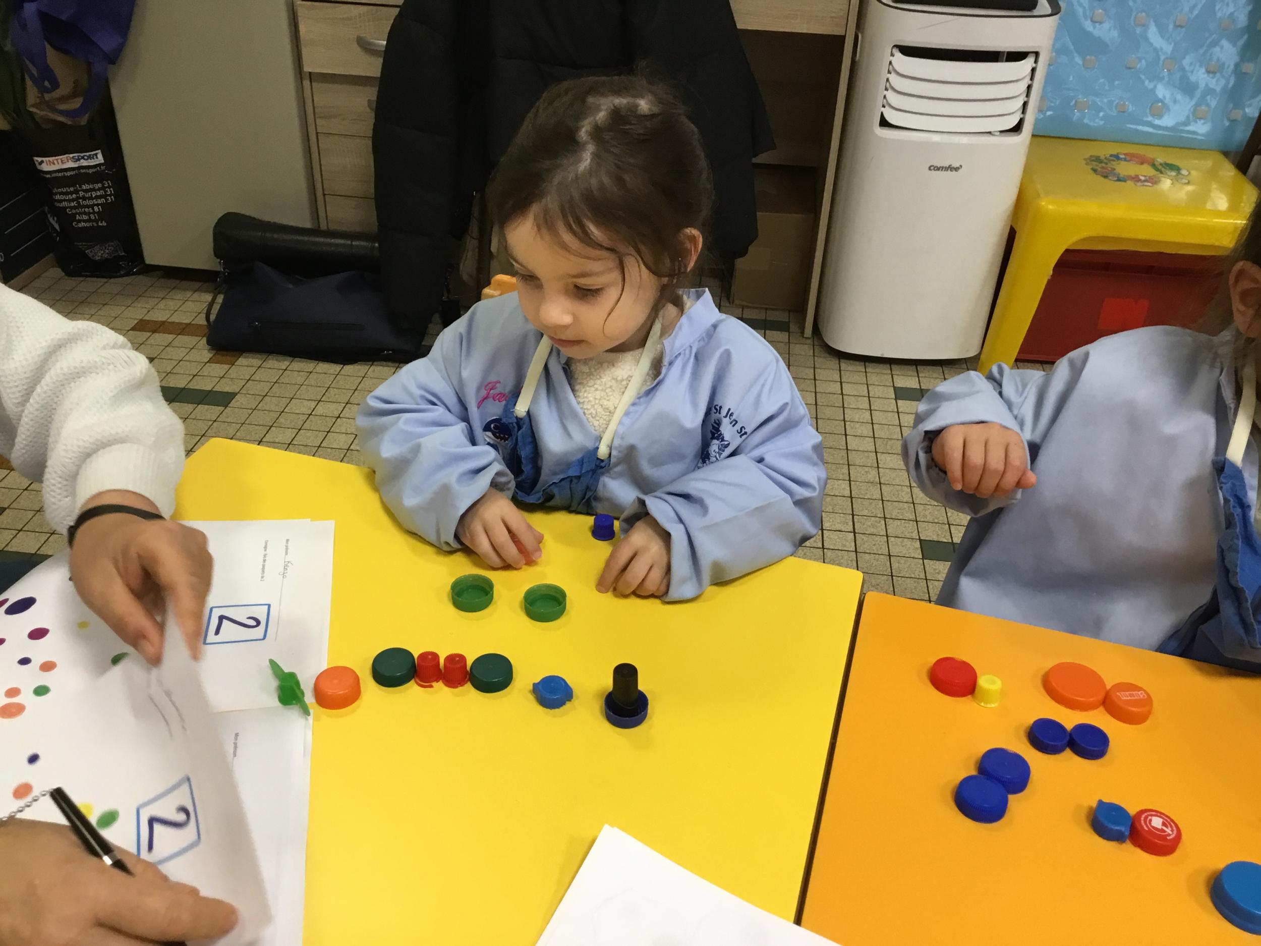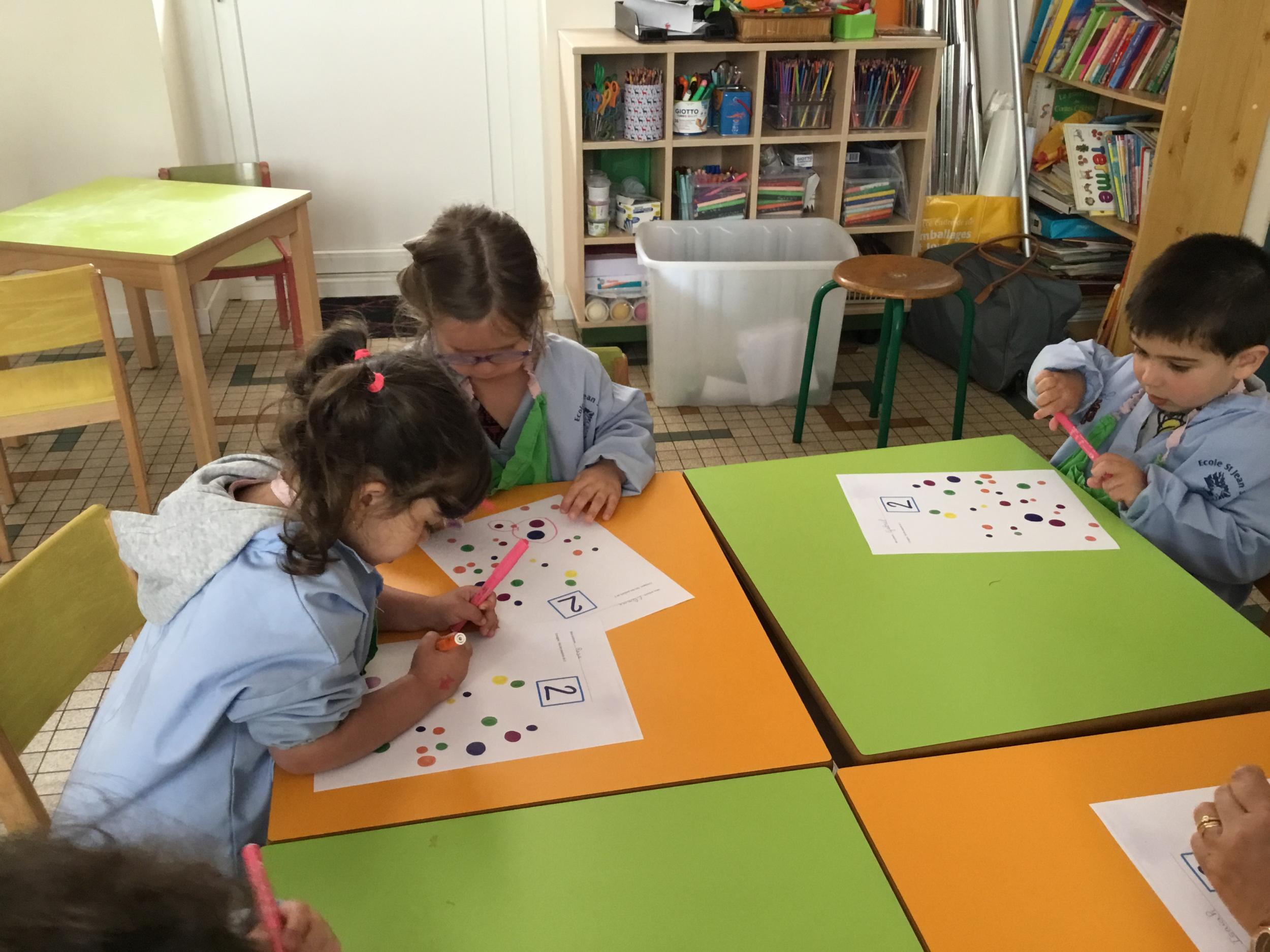 Afin de bien s’imprégner du chiffre 2 , la maîtresse a demandé à chaque élève de positionner devant lui sur la table , les jetons par 2 . Puis chacun devait entourer les jetons par 2 .