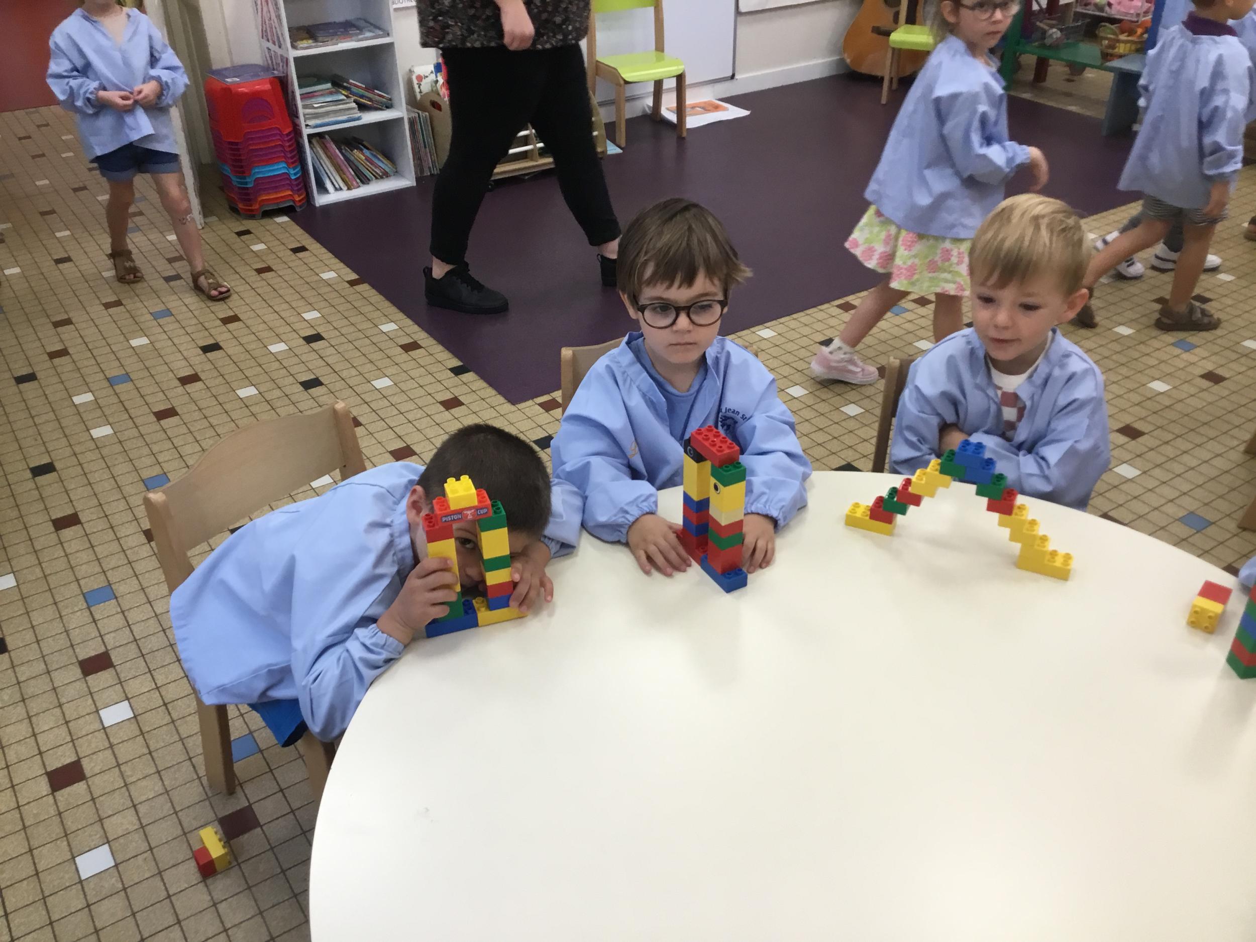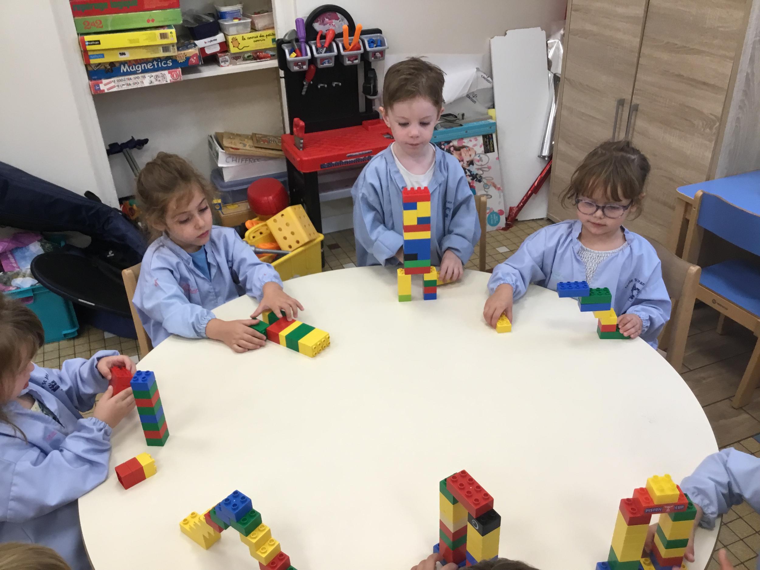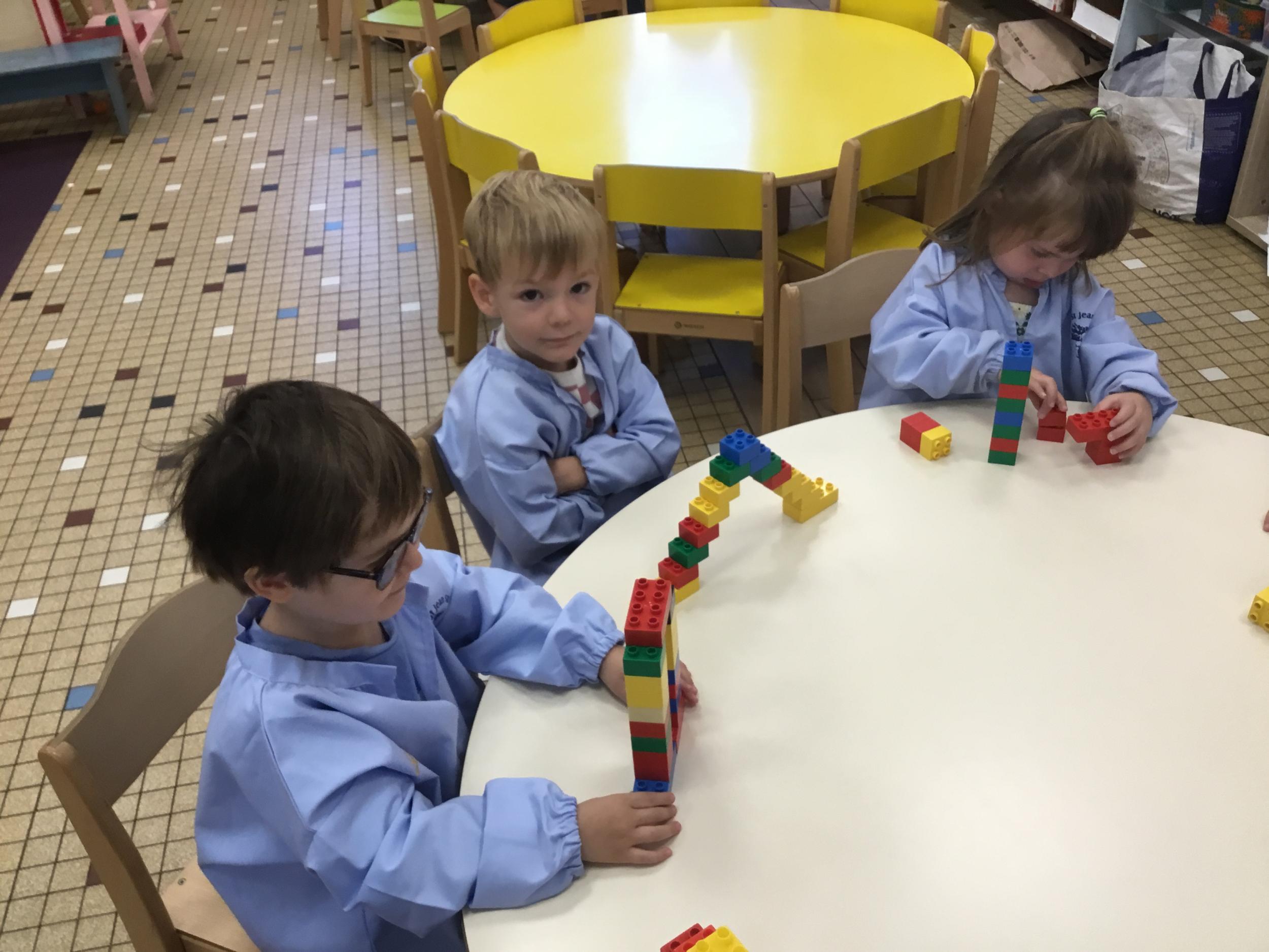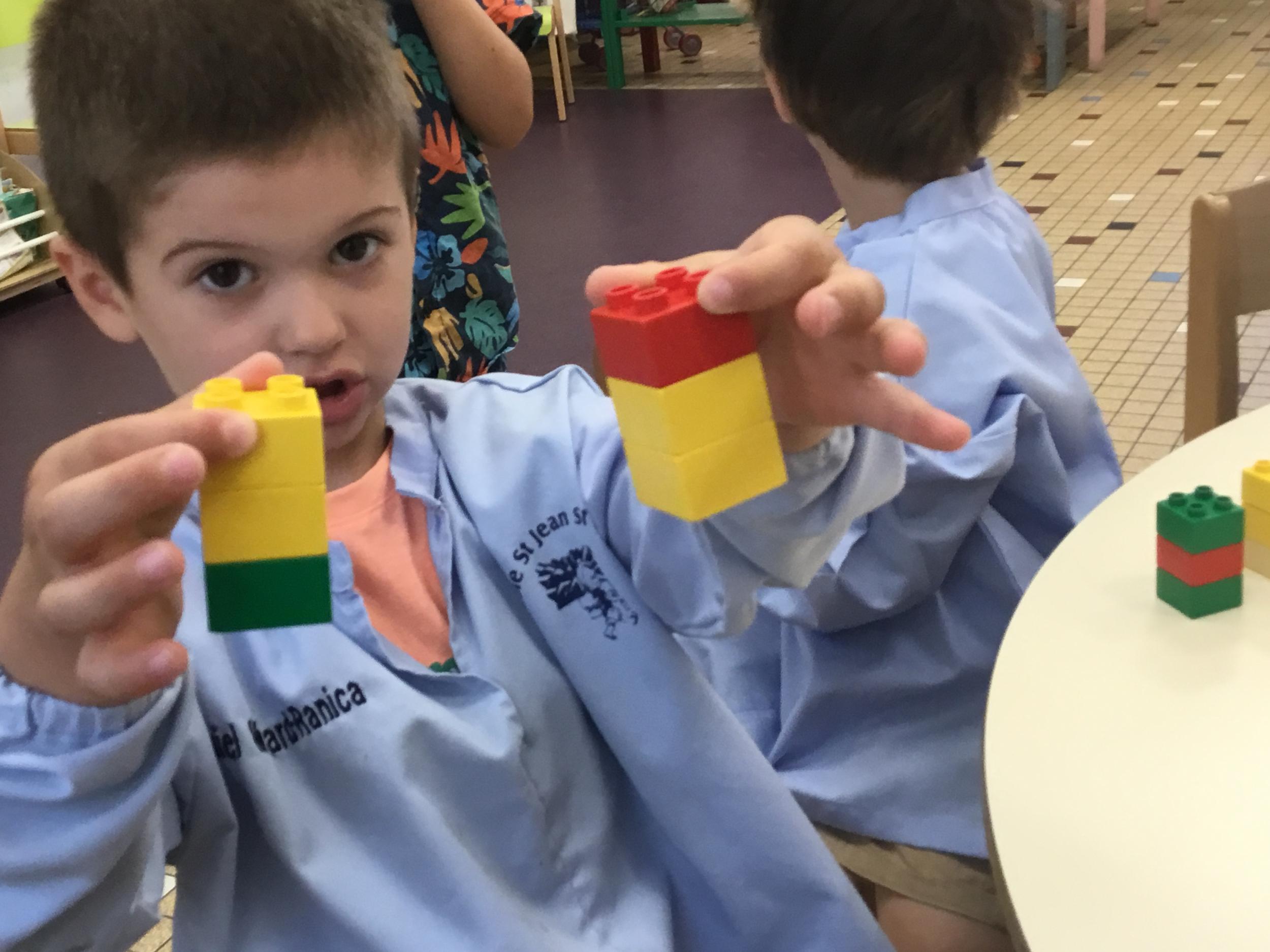 Avec les moyens, nous apprenons la numération en manipulant , en construisant des tours et des ponts avec des légos en les dénombrant et en les comparant. Ainsi, se crée la notion de « autant que , pas assez et/ou trop ».