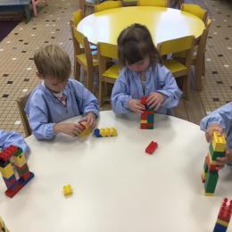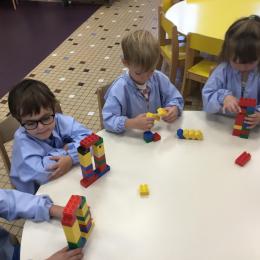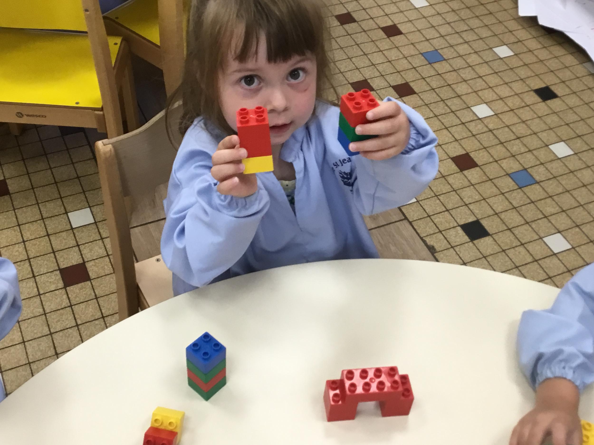 On crée ainsi une tour de trois légos puis deux tours de trois légos . On compare la taille des tours. Puis on montre trois doigts .Ensuite on empile les deux tours de trois légos et on compte le nombre de légos etc…