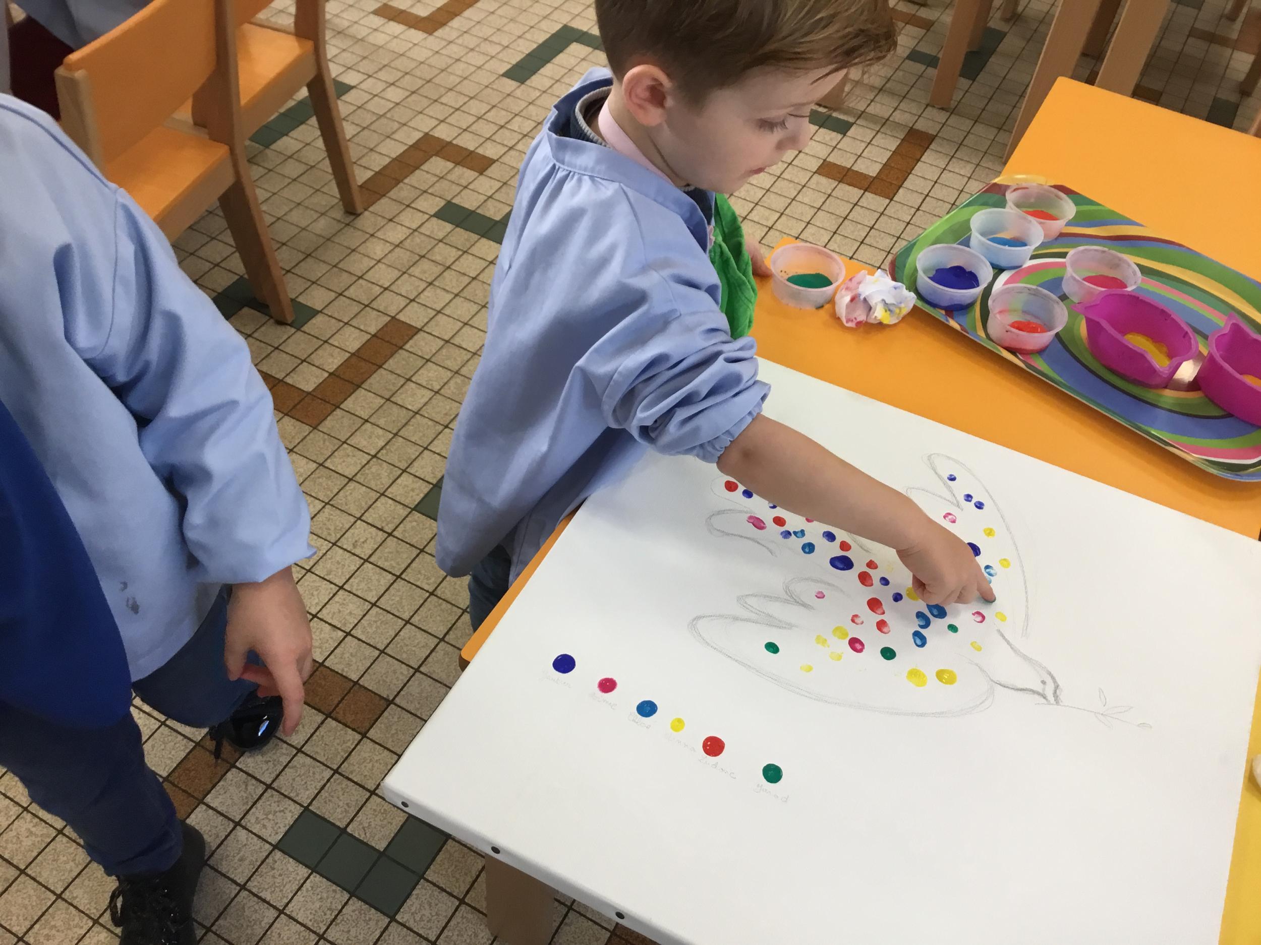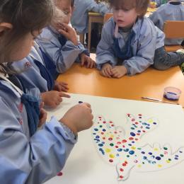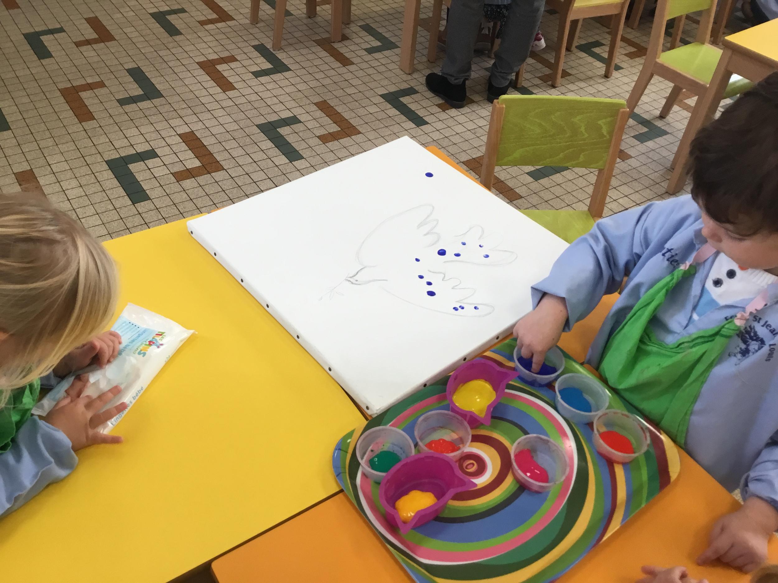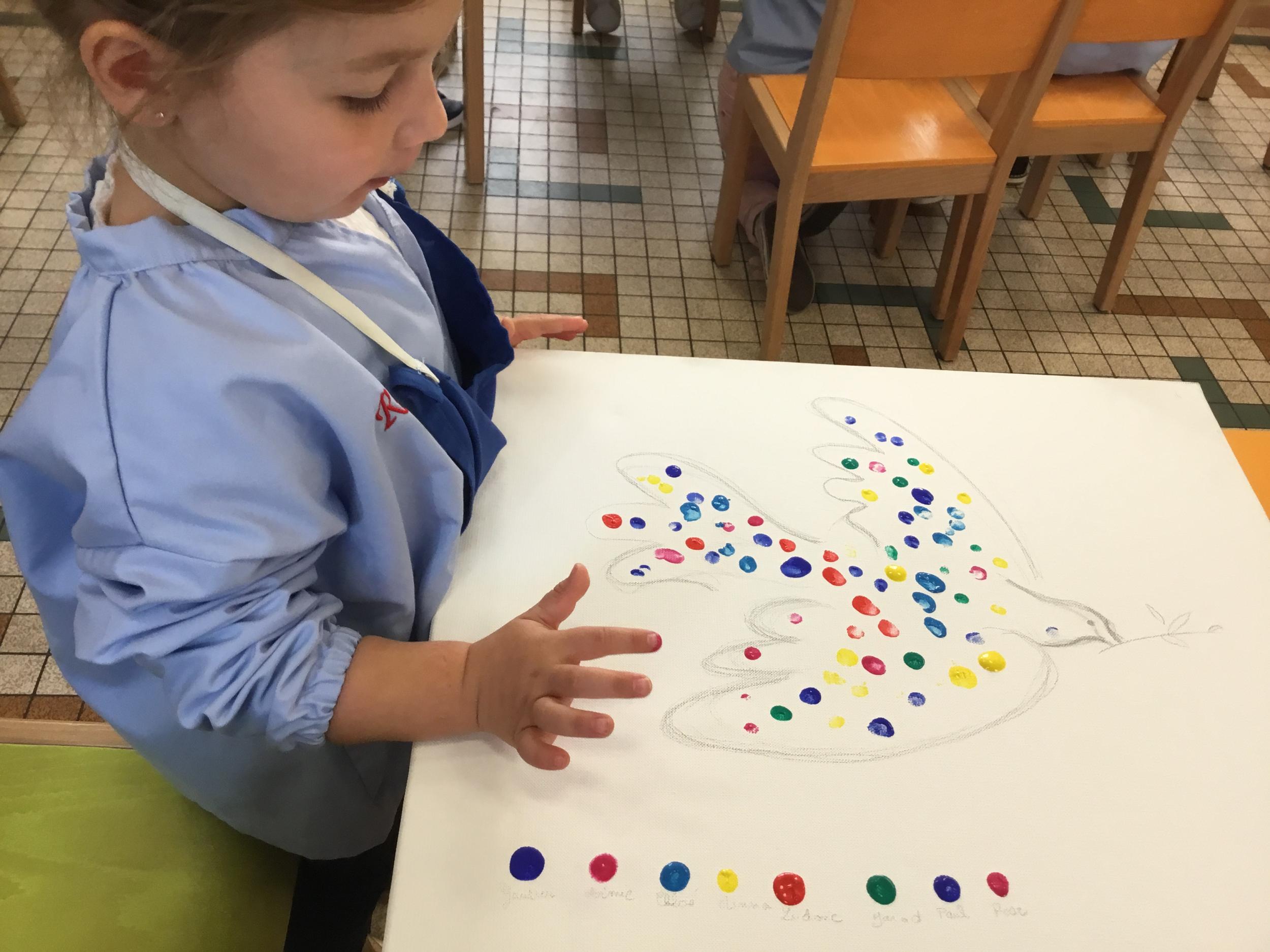 Cette semaine les élèves ont réalisé une œuvre collective. Chaque enfant a choisi une couleur et a rempli le corps de la colombe avec l’ empreinte de leur index. Puis ils ont signé l’œuvre de leur petit doigt.