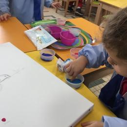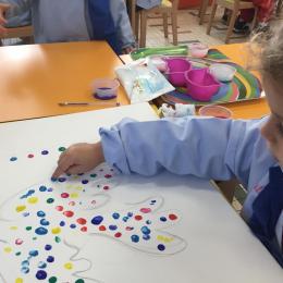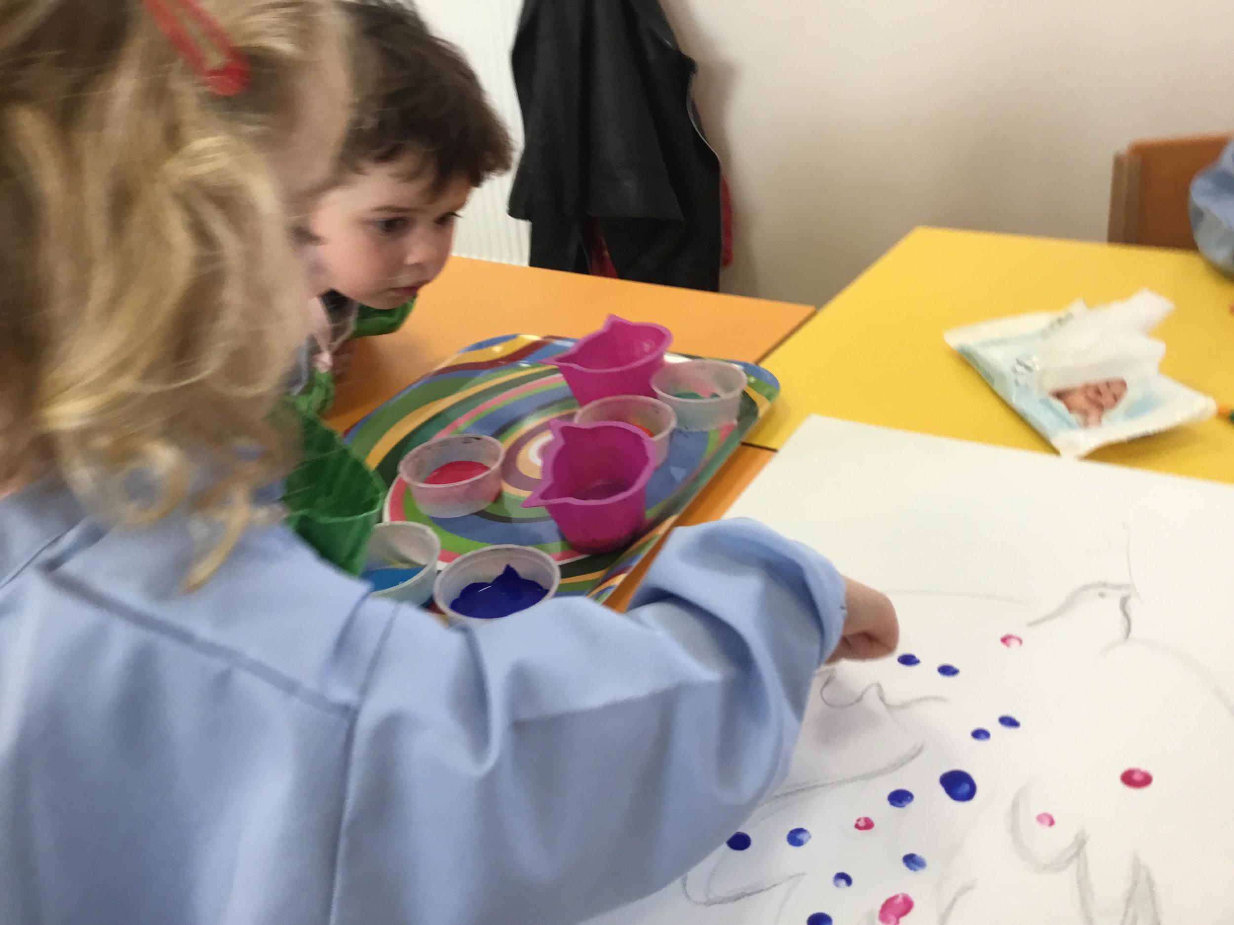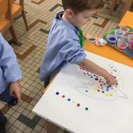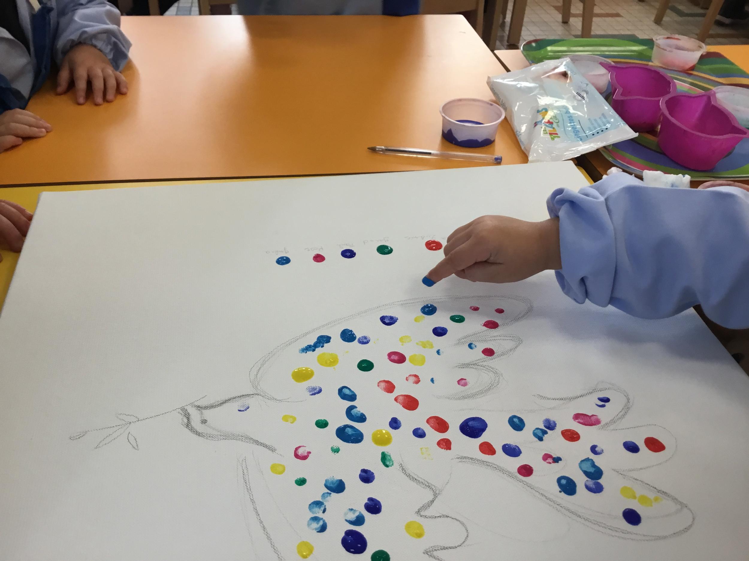 Cette semaine les élèves ont réalisé une œuvre collective. Chaque enfant a choisi une couleur et a rempli le corps de la colombe avec l’ empreinte de leur index. Puis ils ont signé l’œuvre de leur petit doigt.