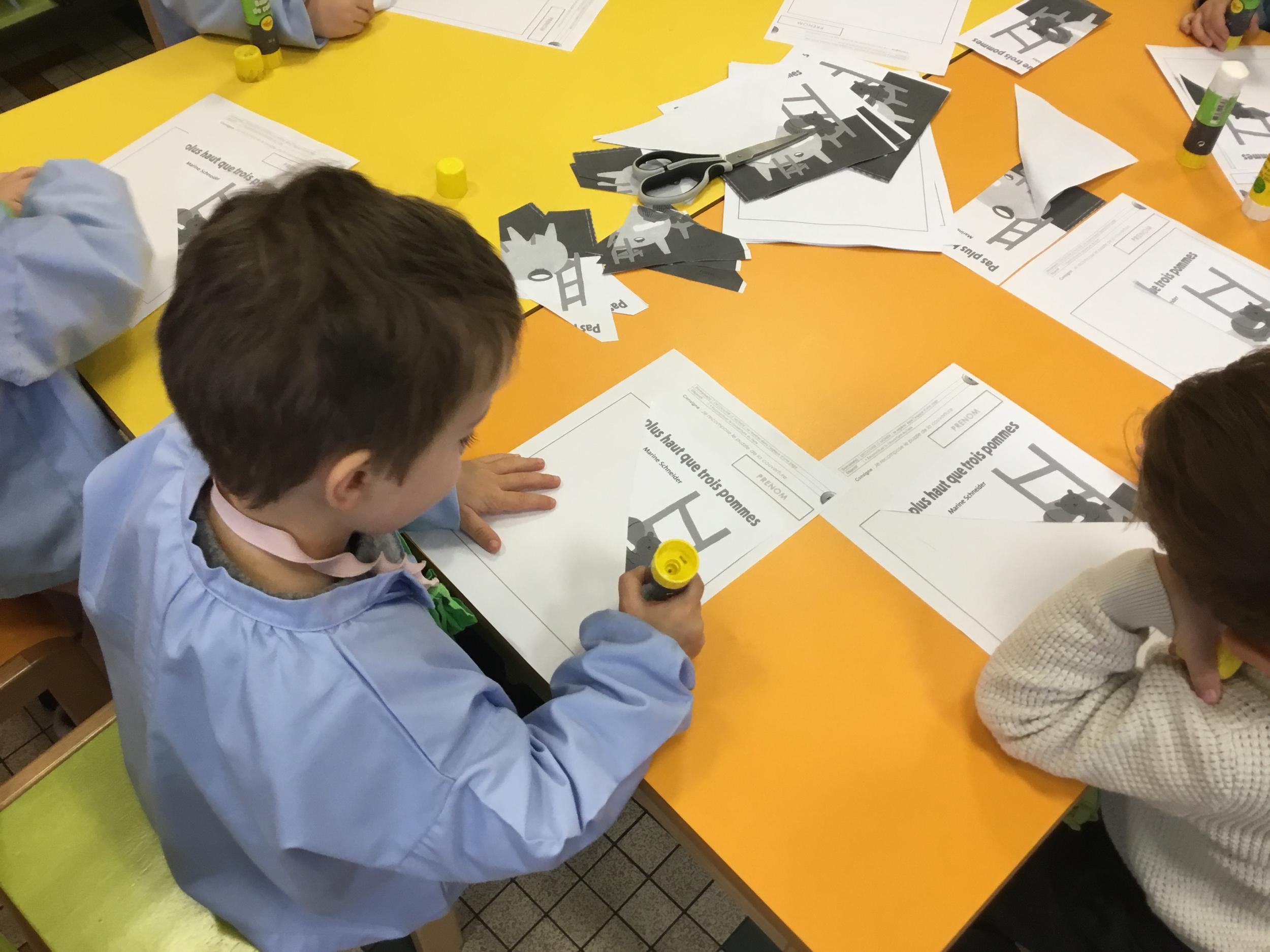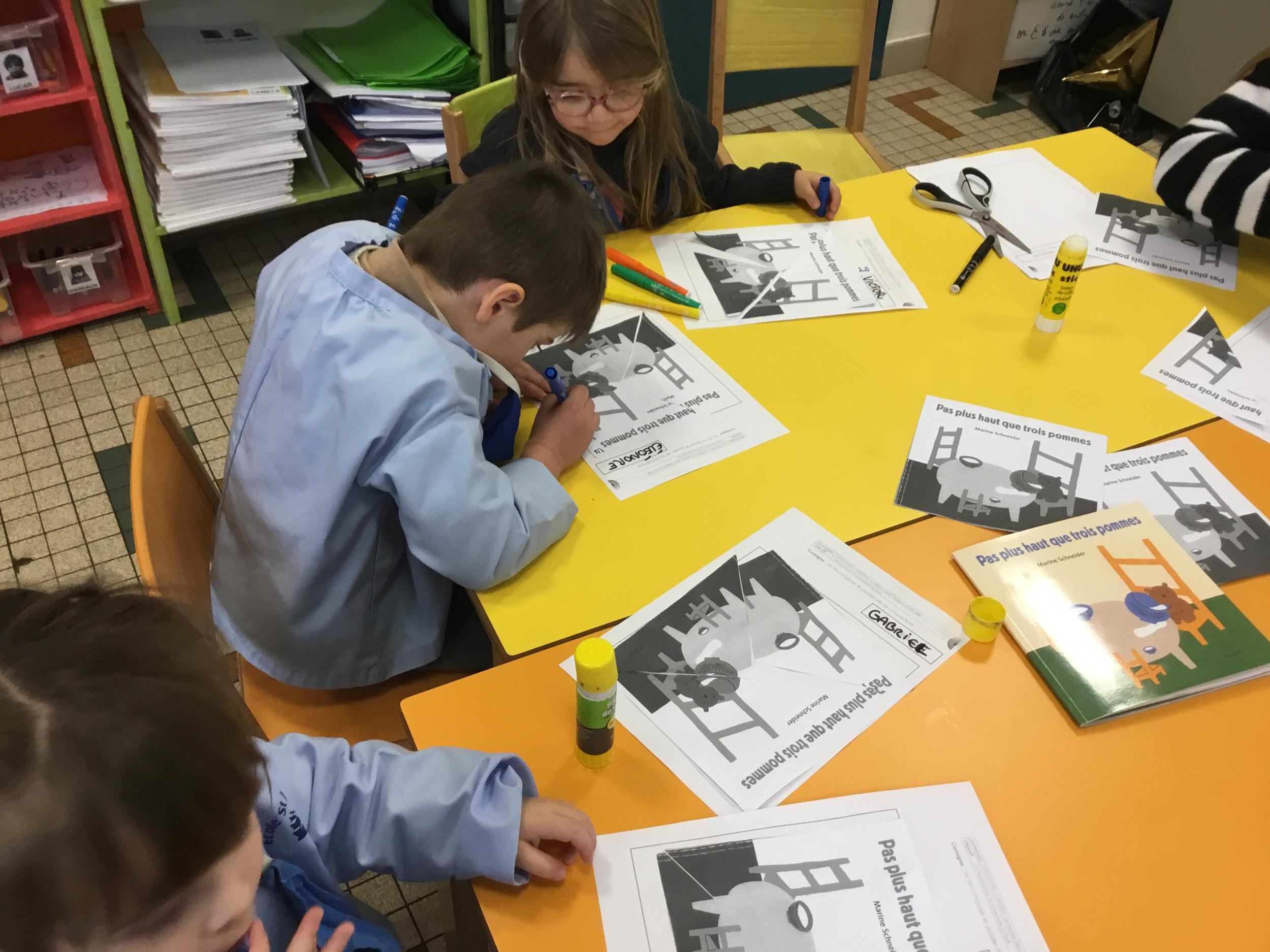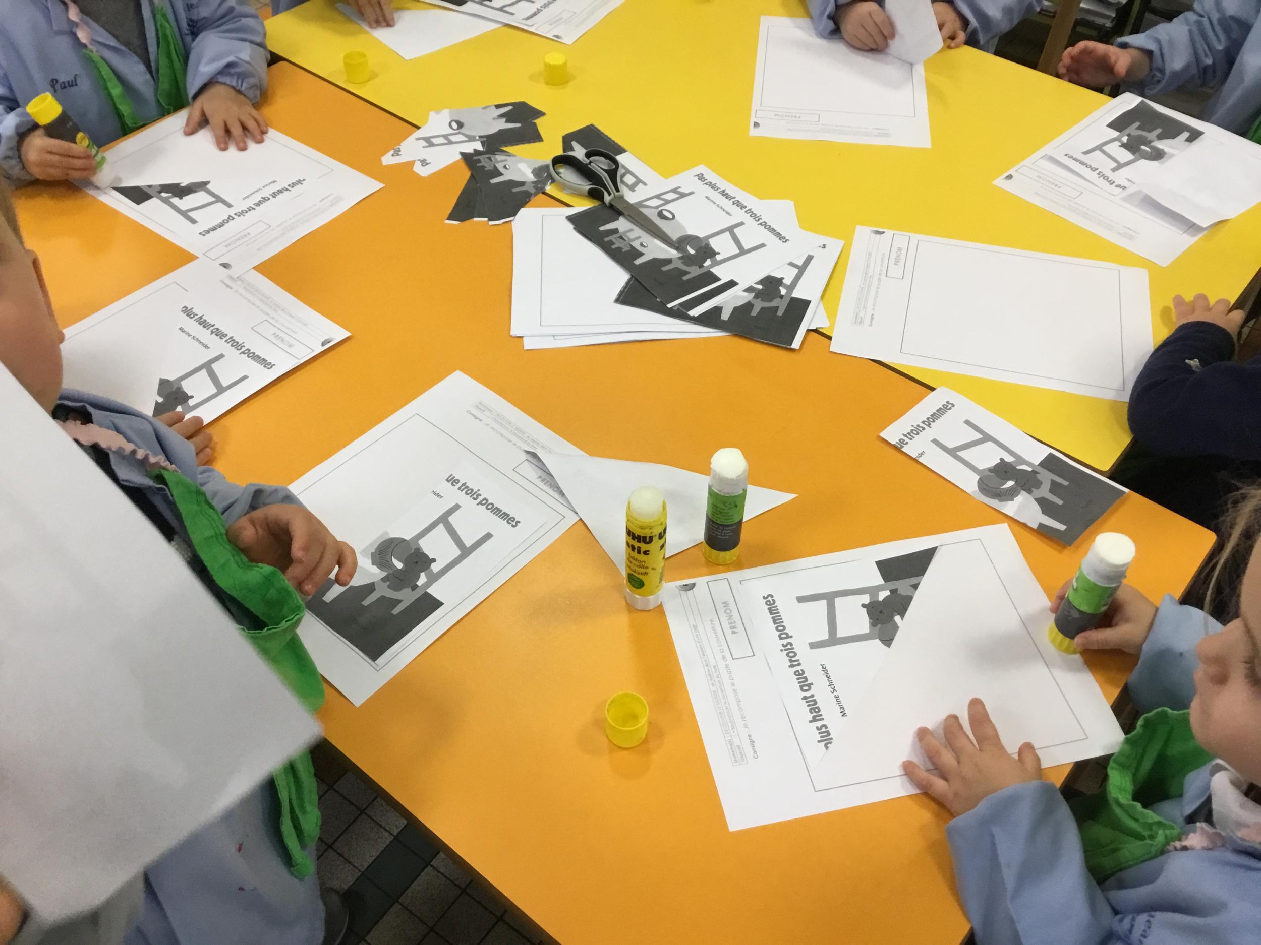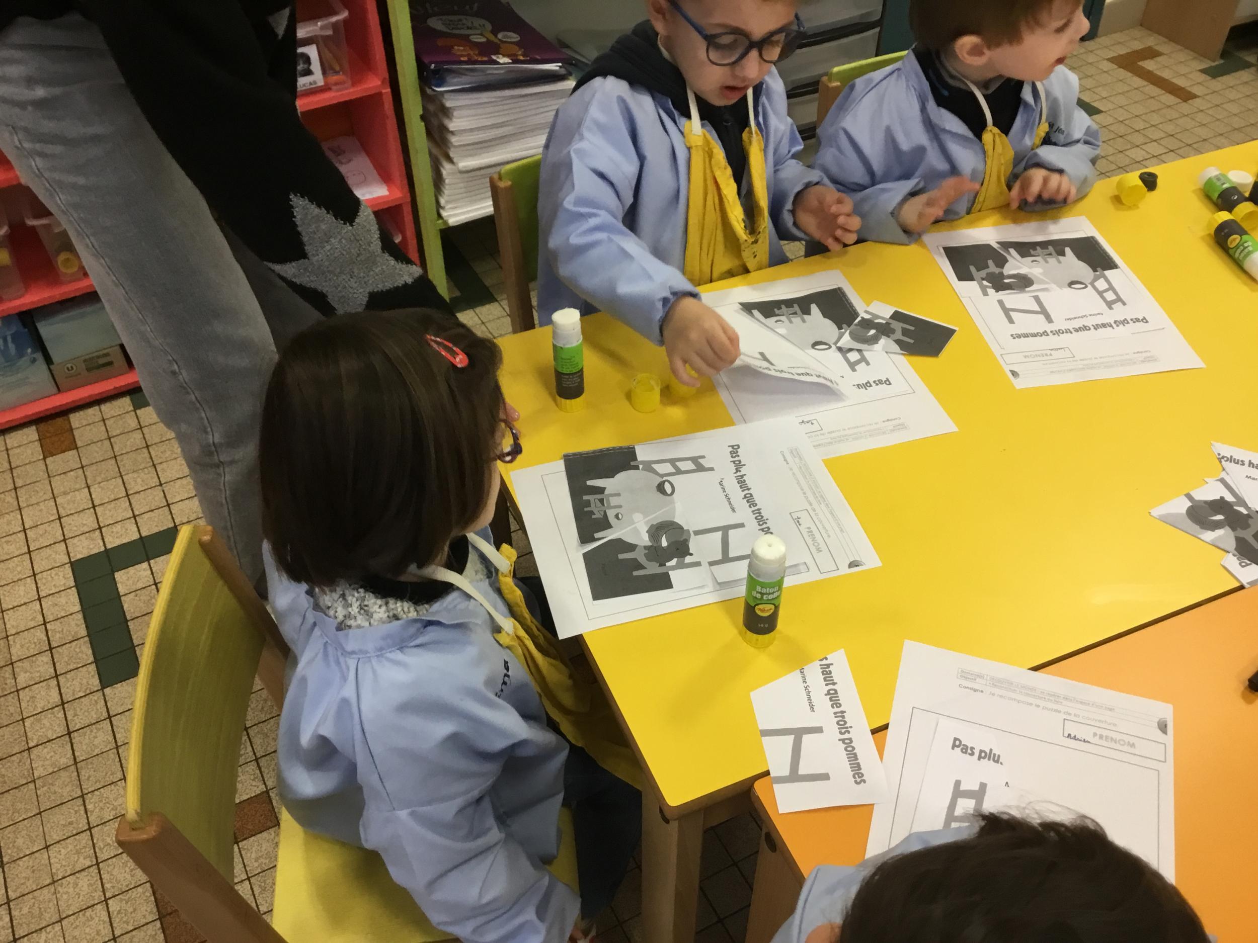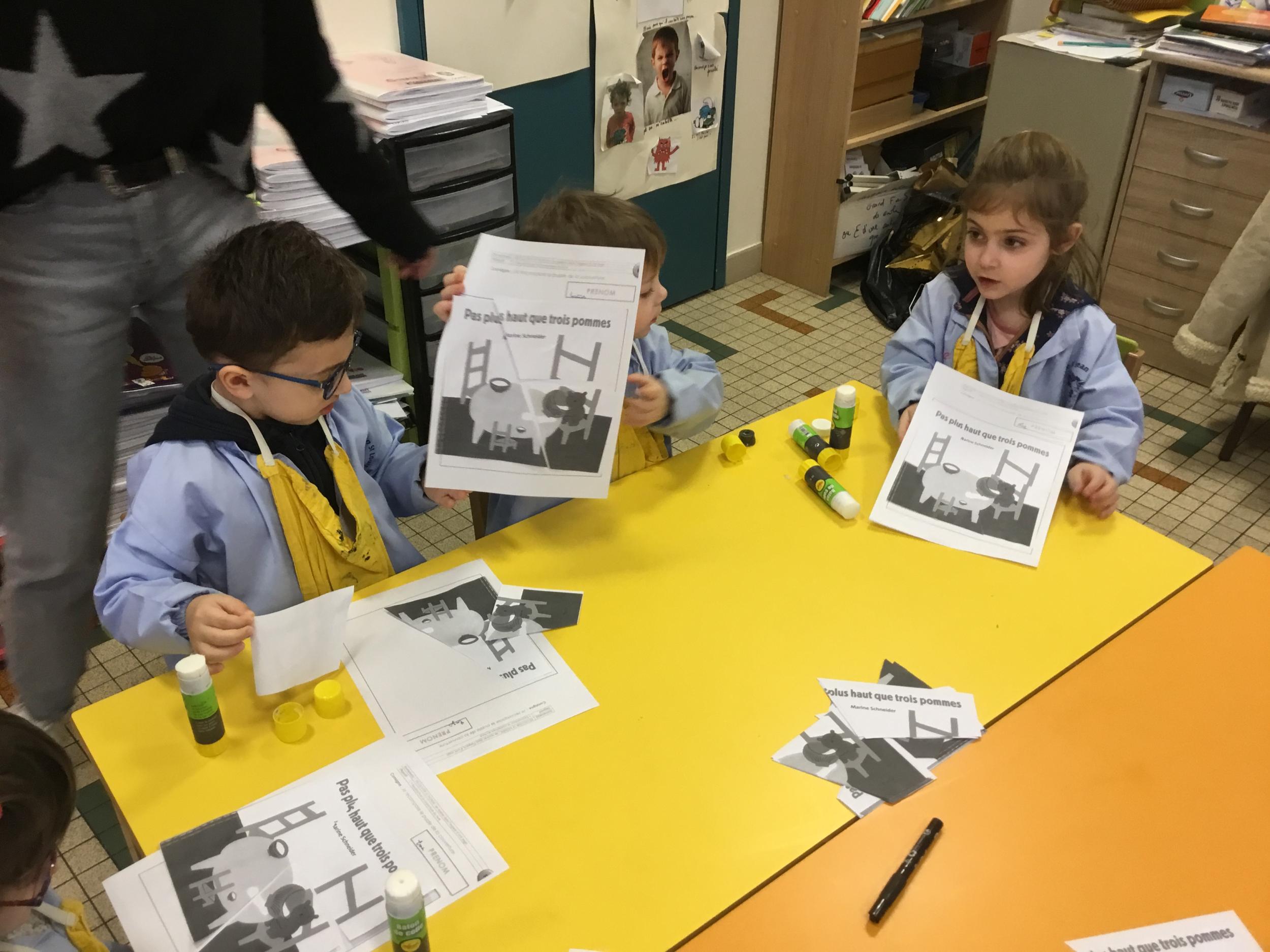 Les élèves ont réalisé une œuvre plastique en lien avec le trait horizontal et une œuvre de l’artiste Paul klee. En langage, ils ont joué à un jeu de cartes qui leur a permis de poser une question : j’ai …. Qui a…? Ils ont dû reconstituer la couverture du livre « Pas plus haut que trois pommes » à partir duquel nous avons travaillé sur la notion de « grand, petit et moyen »