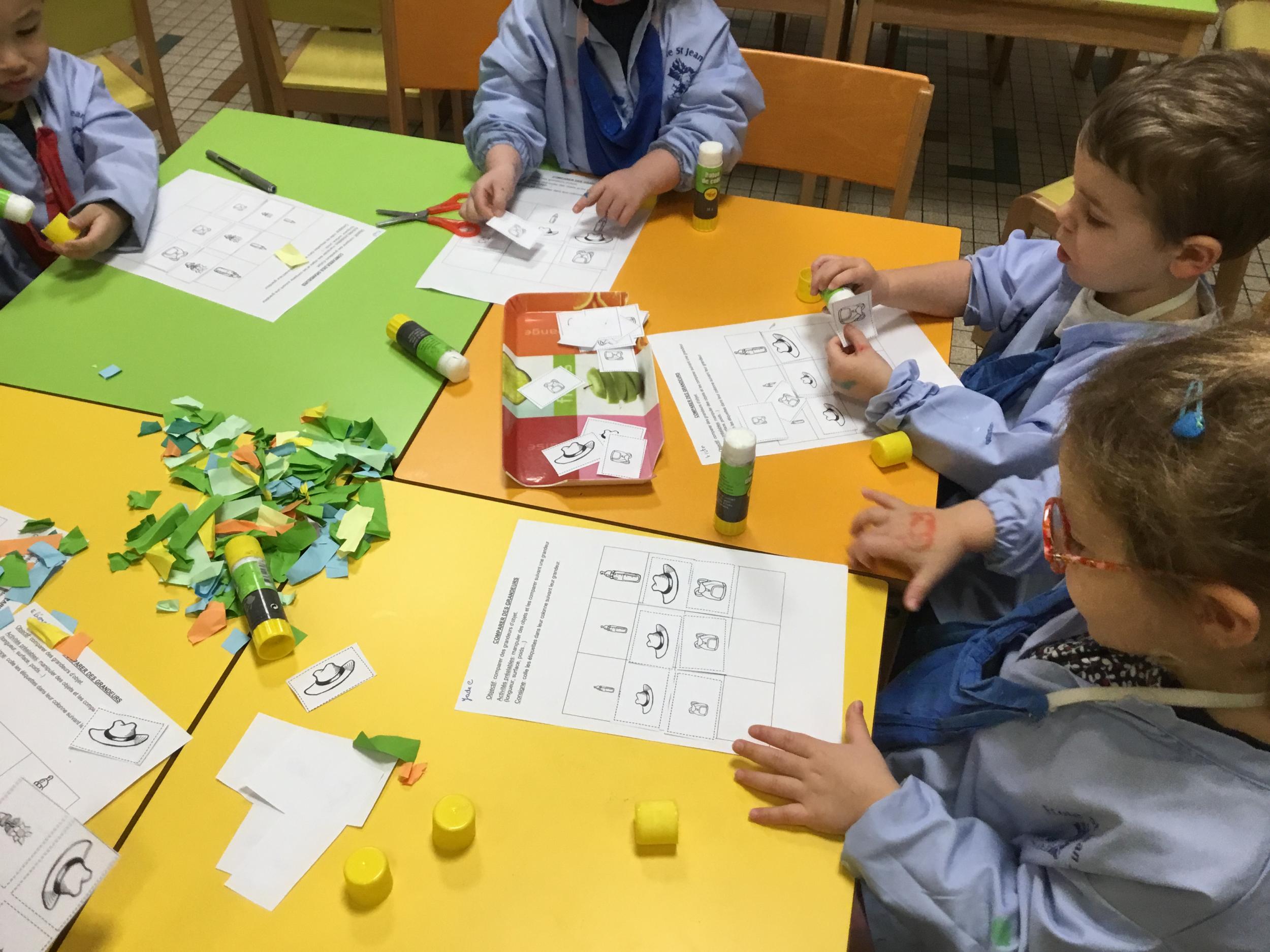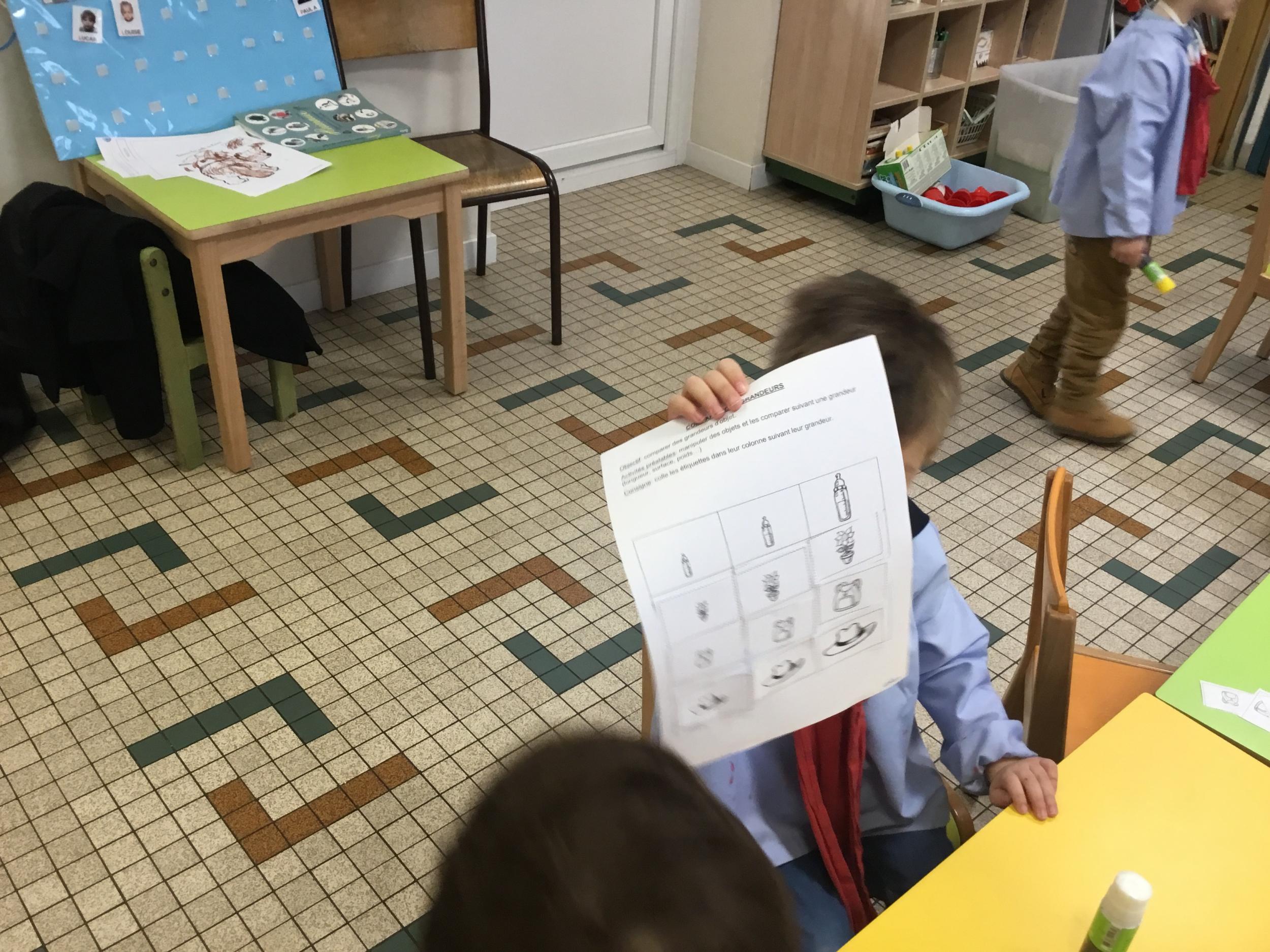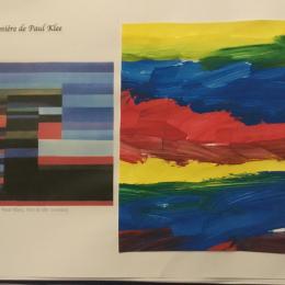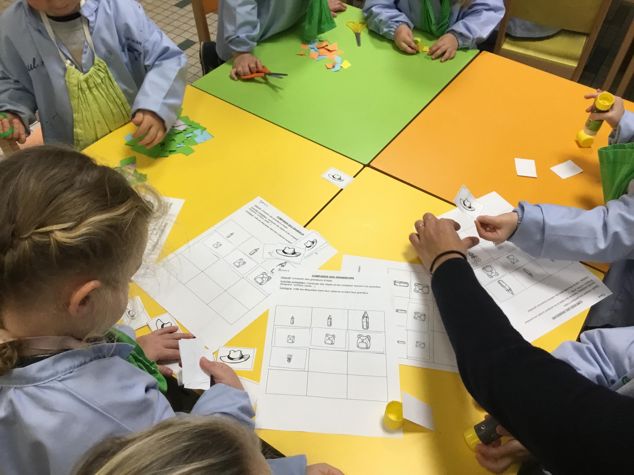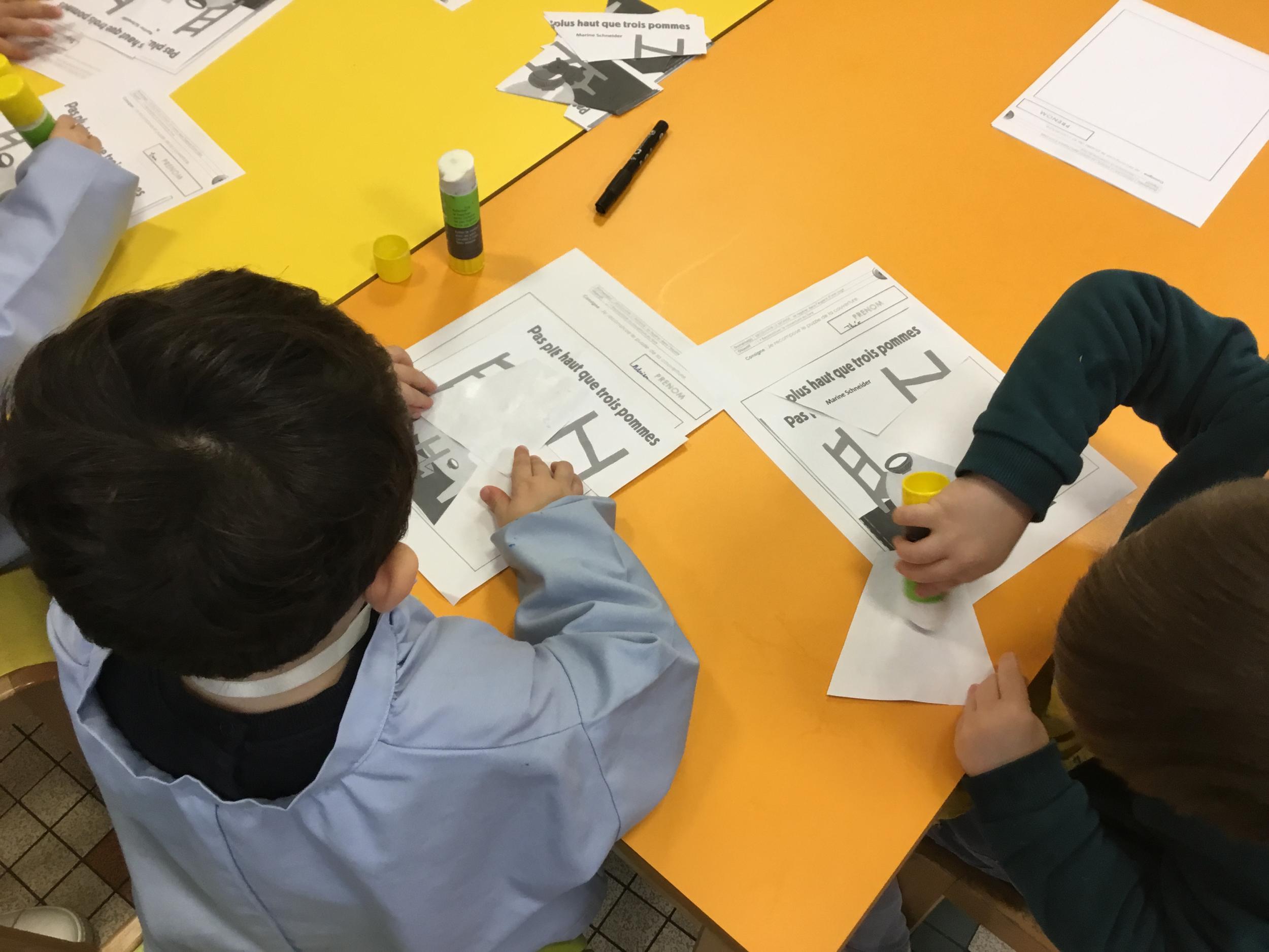 Les élèves ont réalisé une œuvre plastique en lien avec le trait horizontal et une œuvre de l’artiste Paul klee. En langage, ils ont joué à un jeu de cartes qui leur a permis de poser une question : j’ai …. Qui a…? Ils ont dû reconstituer la couverture du livre « Pas plus haut que trois pommes » à partir duquel nous avons travaillé sur la notion de « grand, petit et moyen »