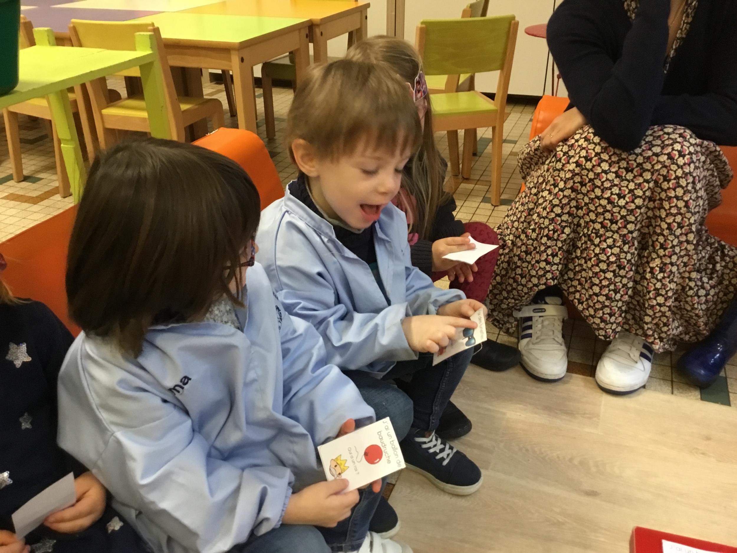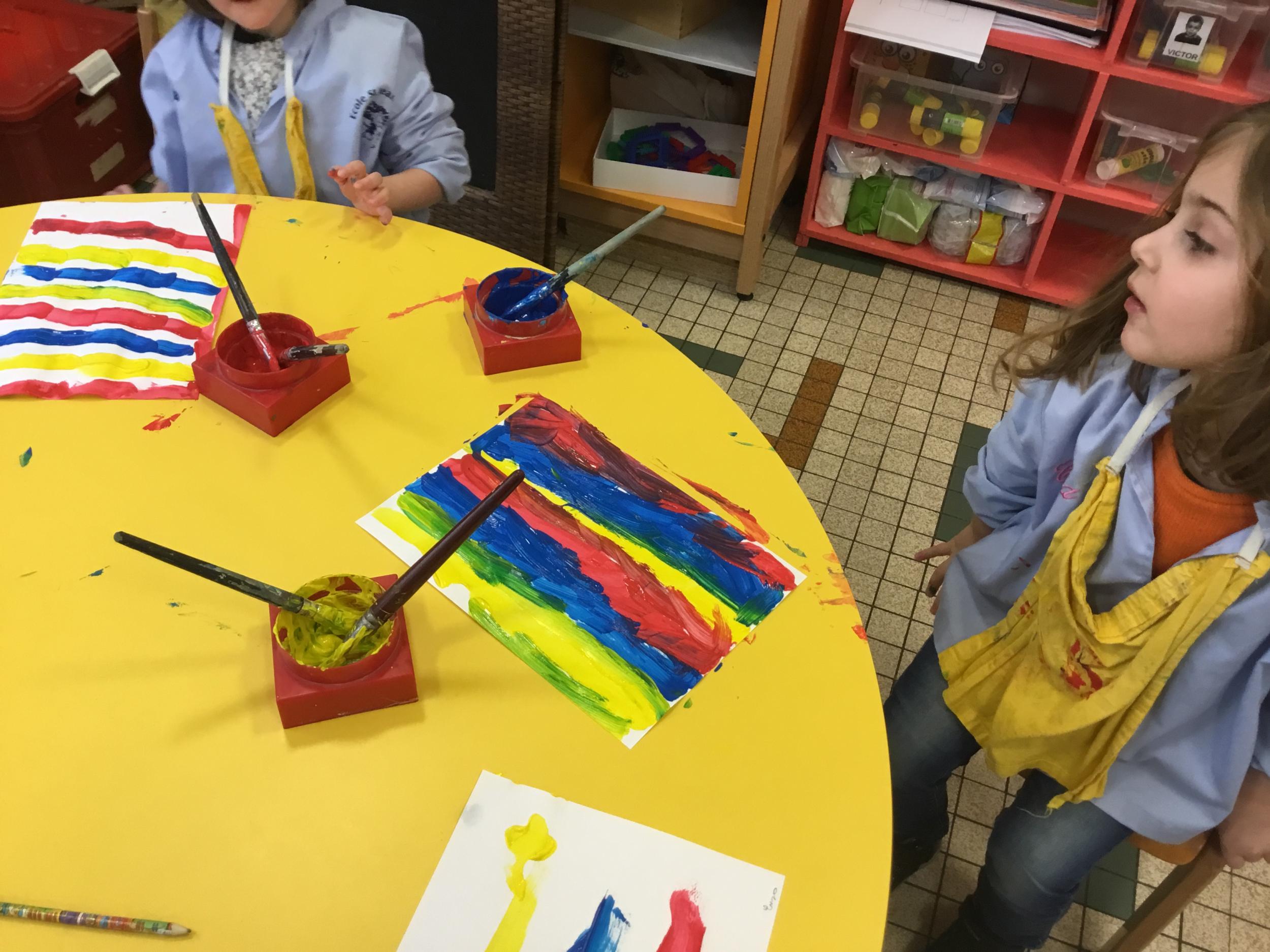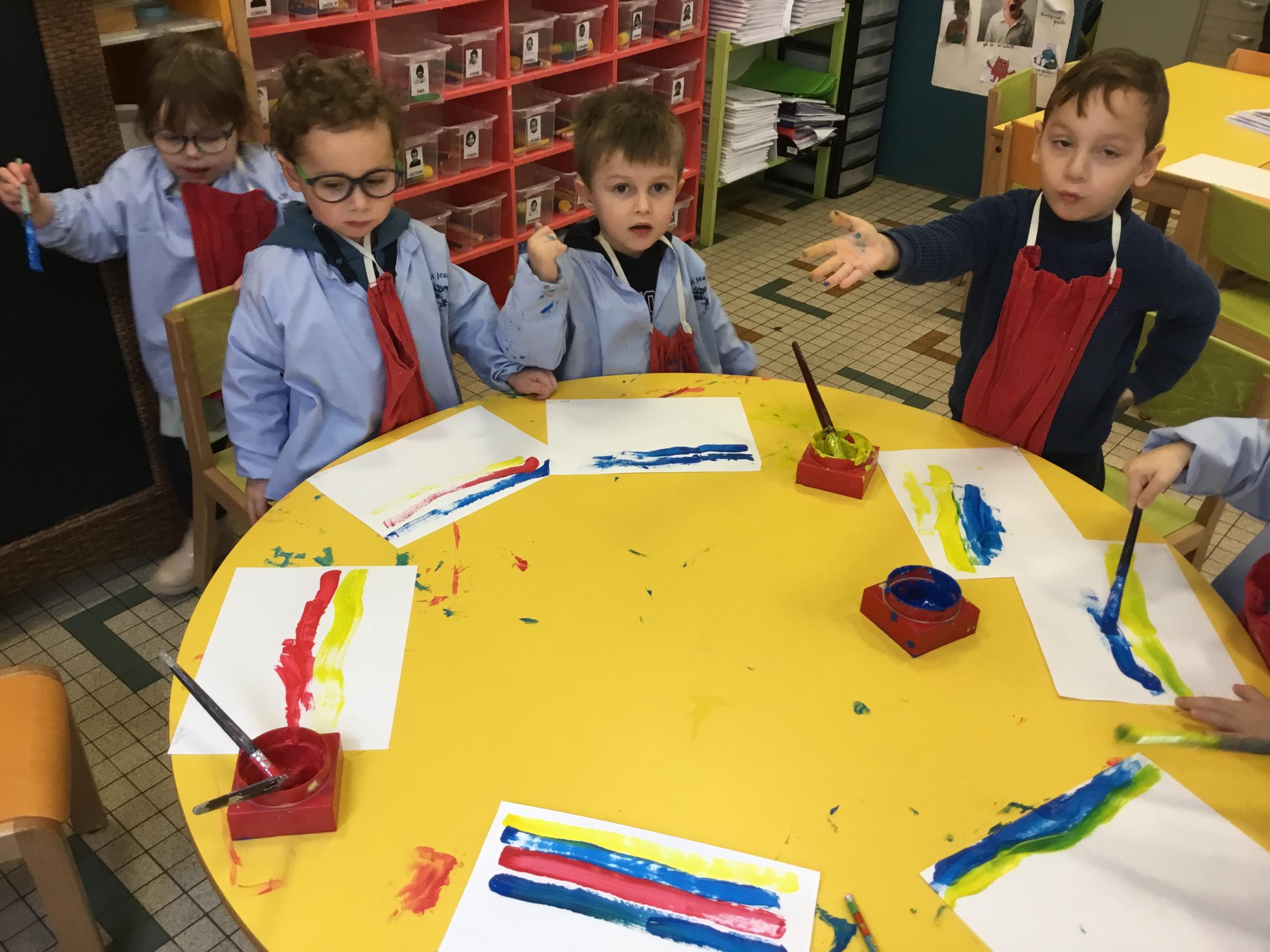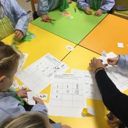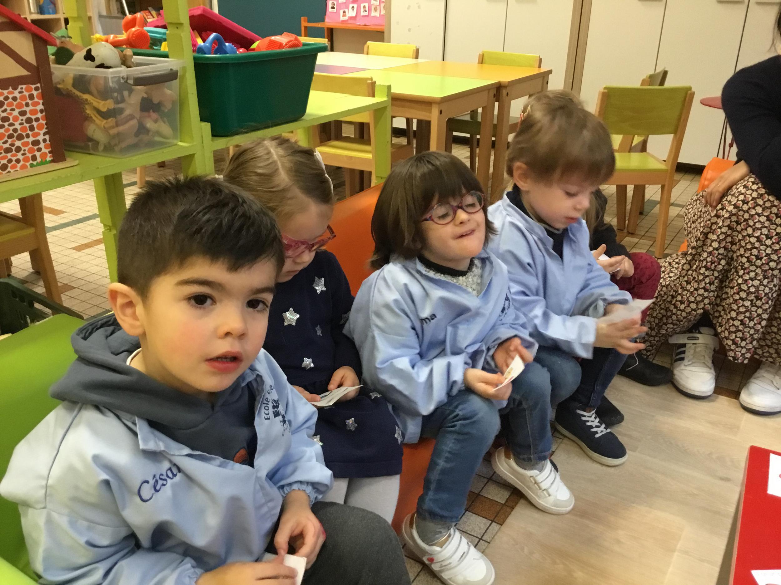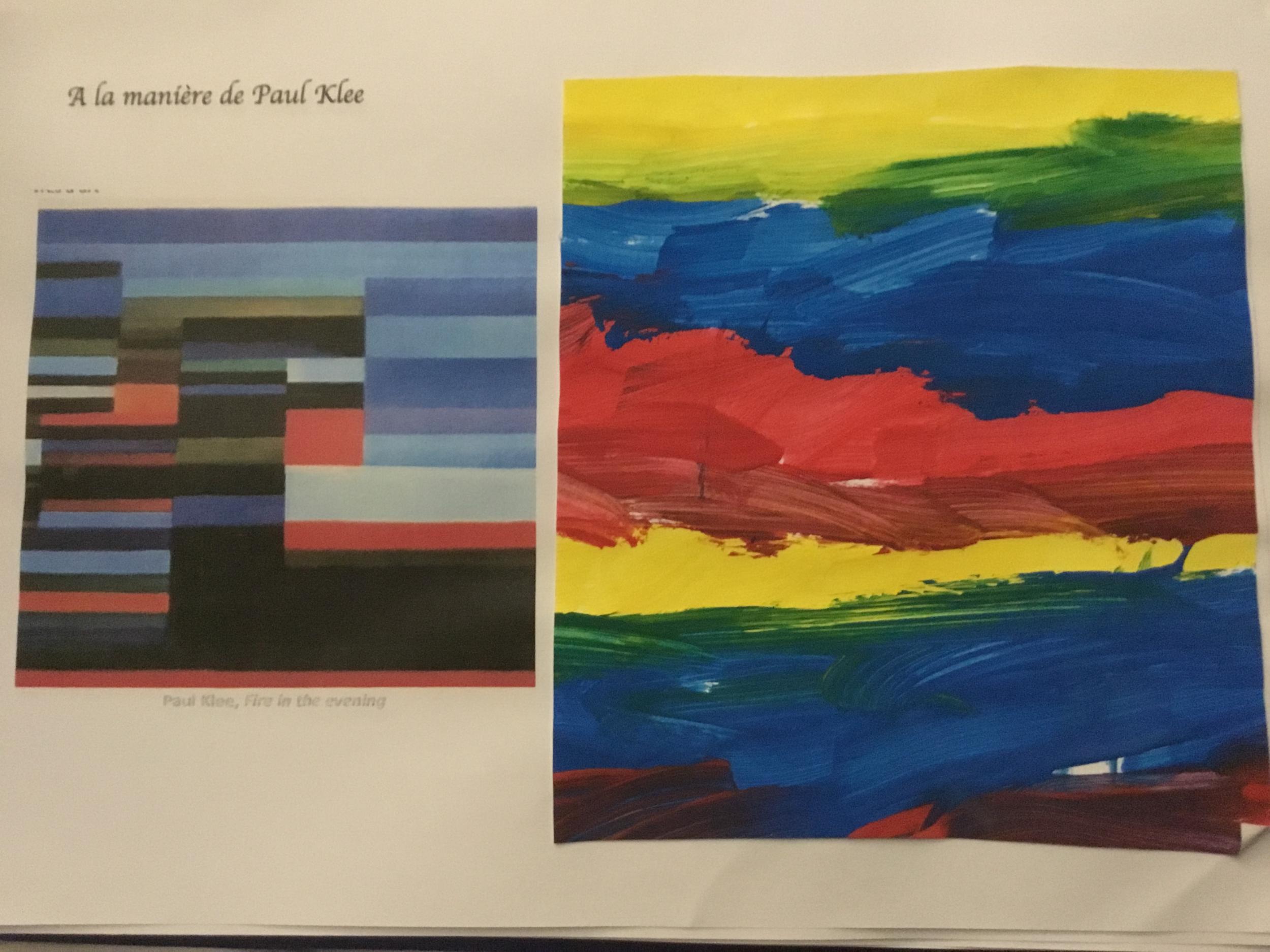Les élèves ont réalisé une œuvre plastique en lien avec le trait horizontal et une œuvre de l’artiste Paul klee. En langage, ils ont joué à un jeu de cartes qui leur a permis de poser une question : j’ai …. Qui a…? Ils ont dû reconstituer la couverture du livre « Pas plus haut que trois pommes » à partir duquel nous avons travaillé sur la notion de « grand, petit et moyen »