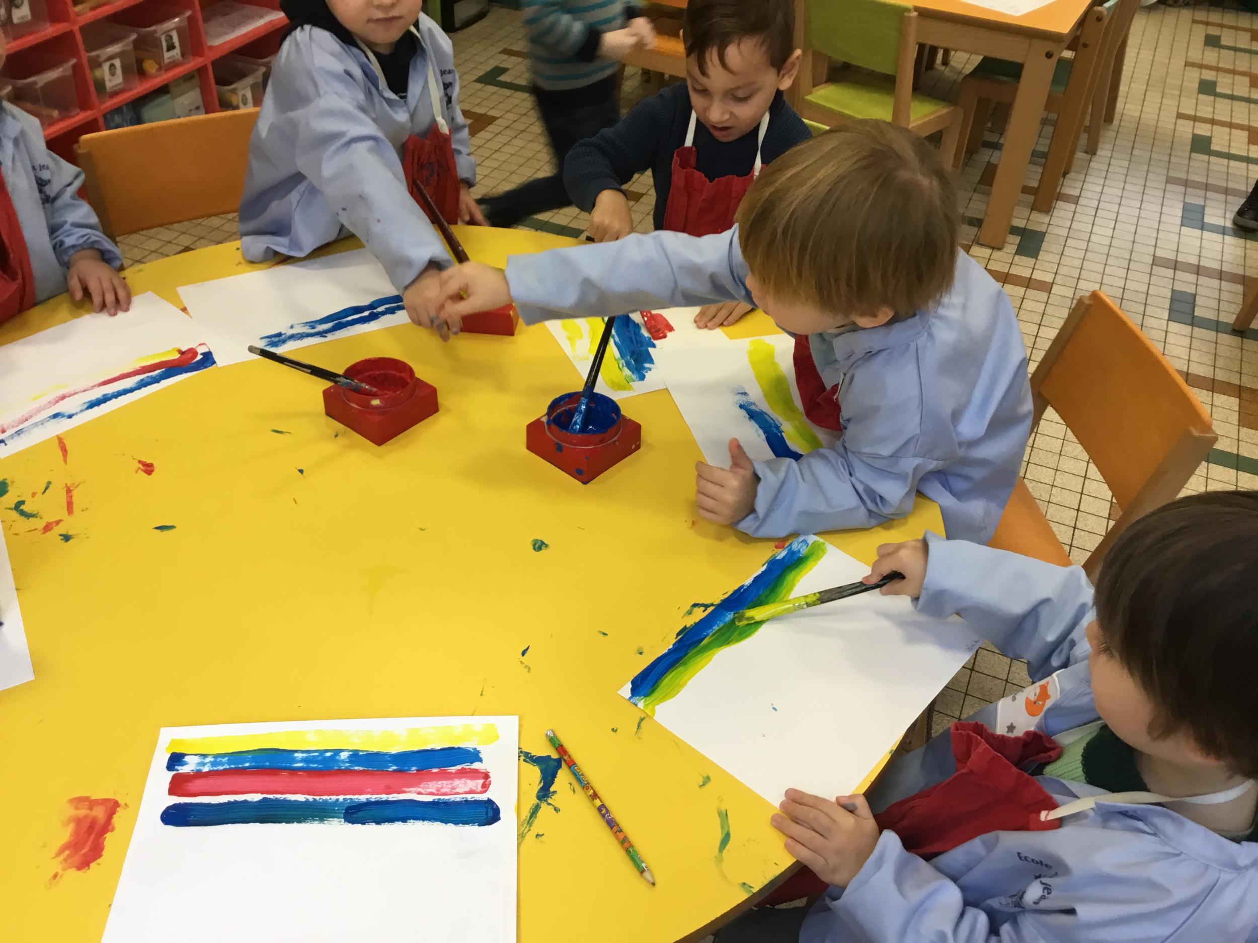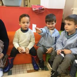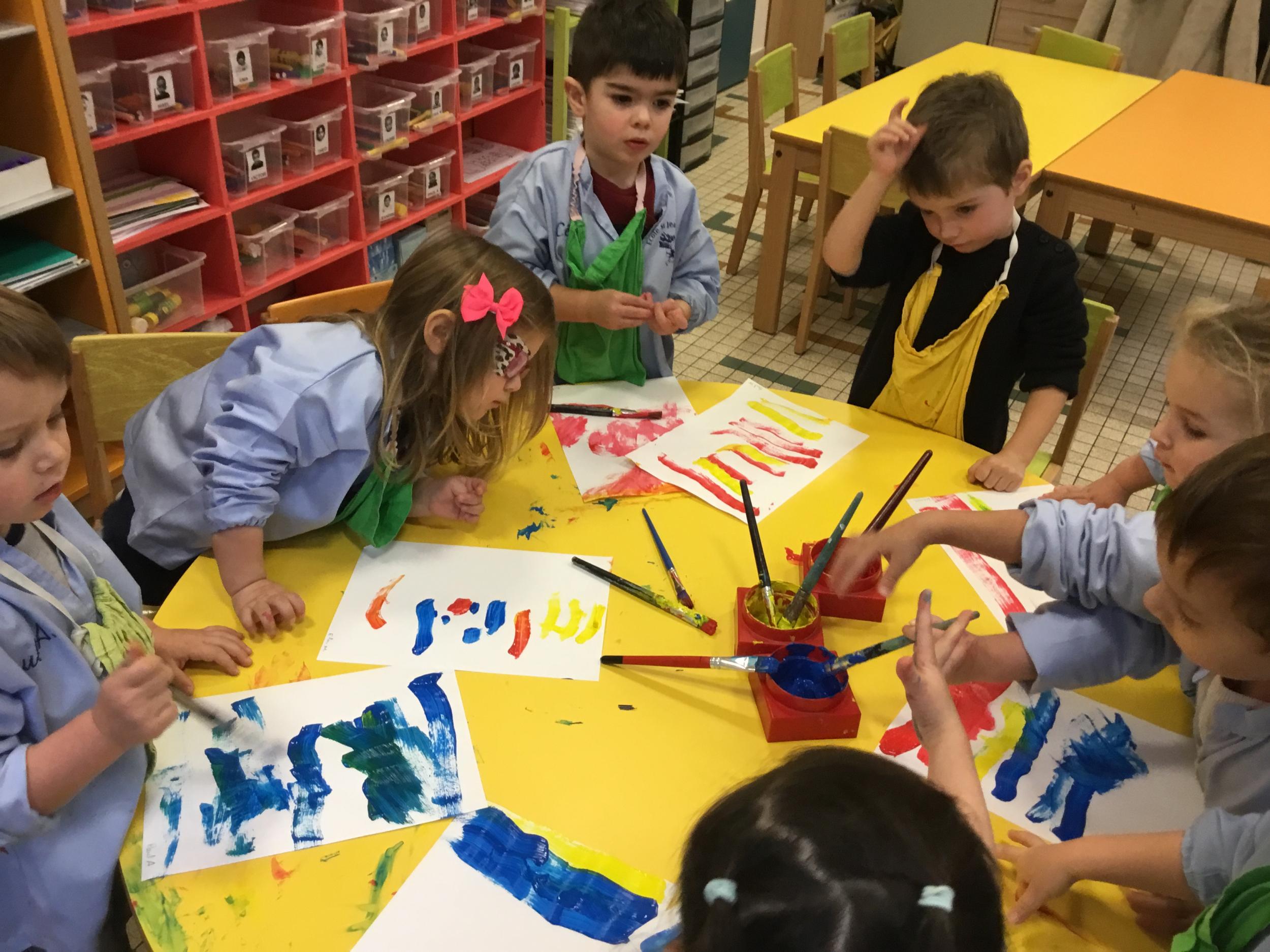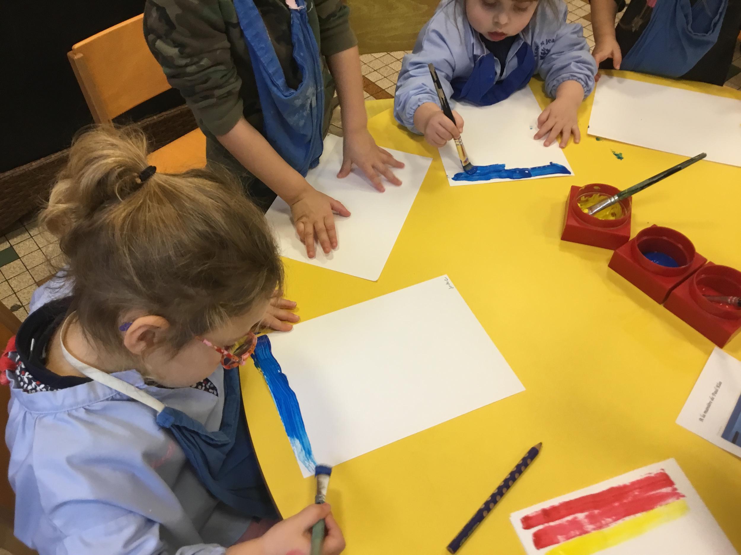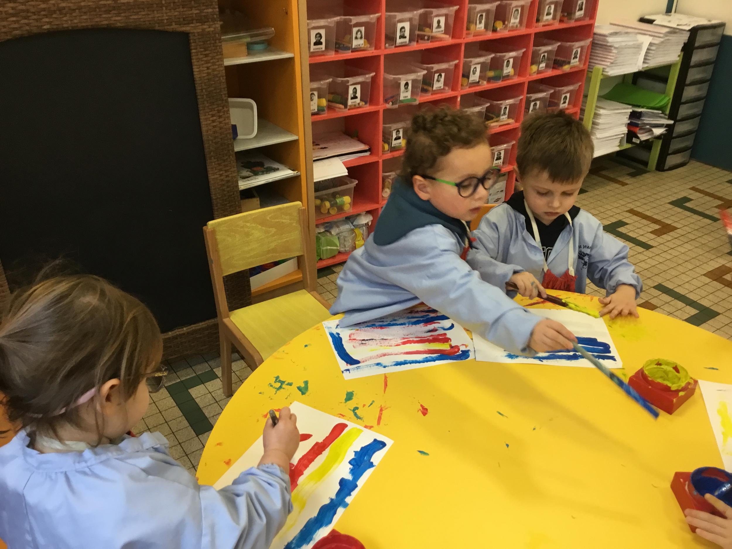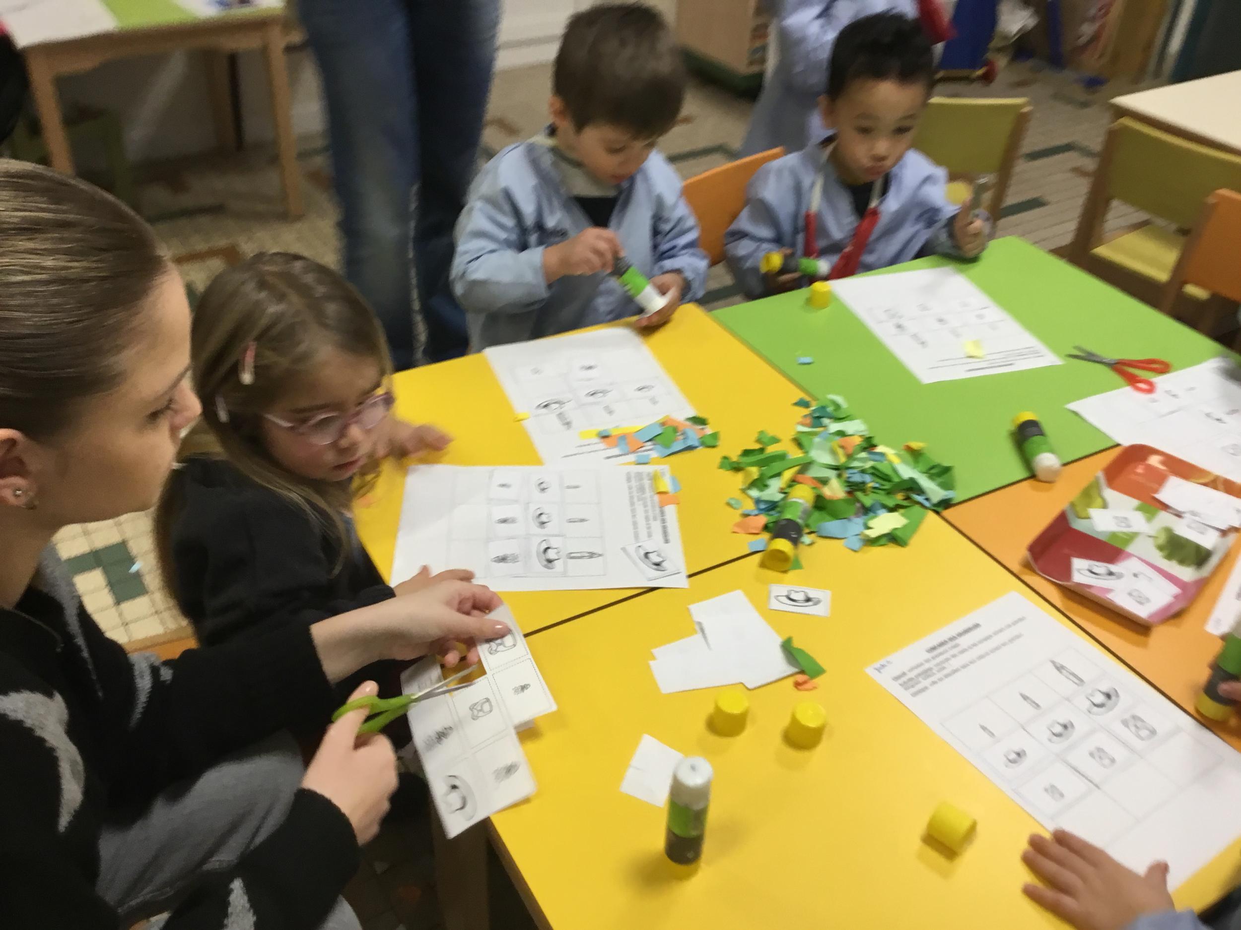 Les élèves ont réalisé une œuvre plastique en lien avec le trait horizontal et une œuvre de l’artiste Paul klee. En langage, ils ont joué à un jeu de cartes qui leur a permis de poser une question : j’ai …. Qui a…? Ils ont dû reconstituer la couverture du livre « Pas plus haut que trois pommes » à partir duquel nous avons travaillé sur la notion de « grand, petit et moyen »