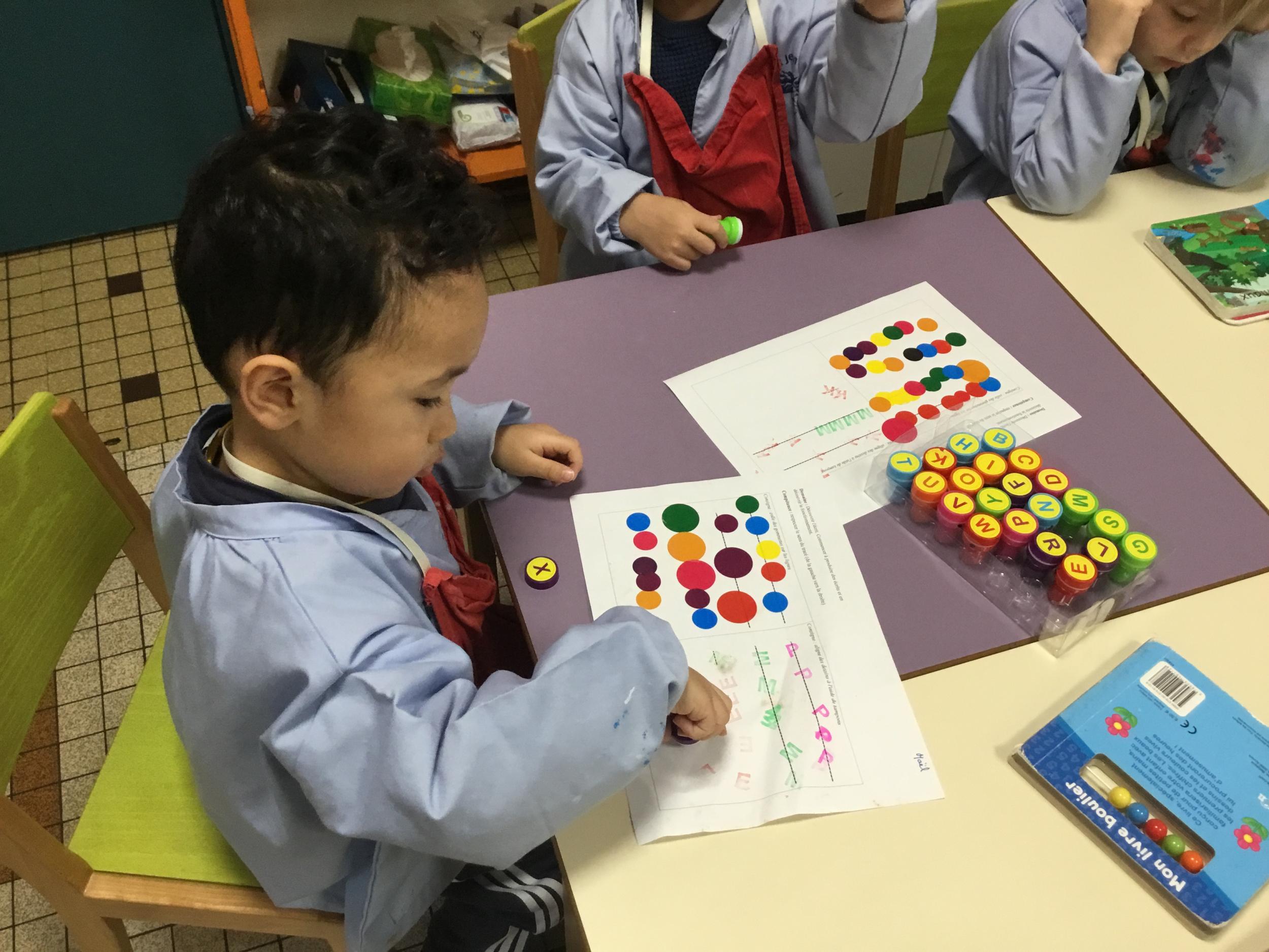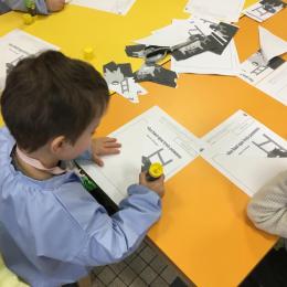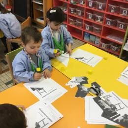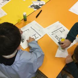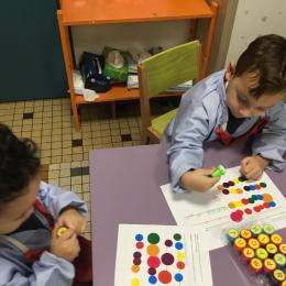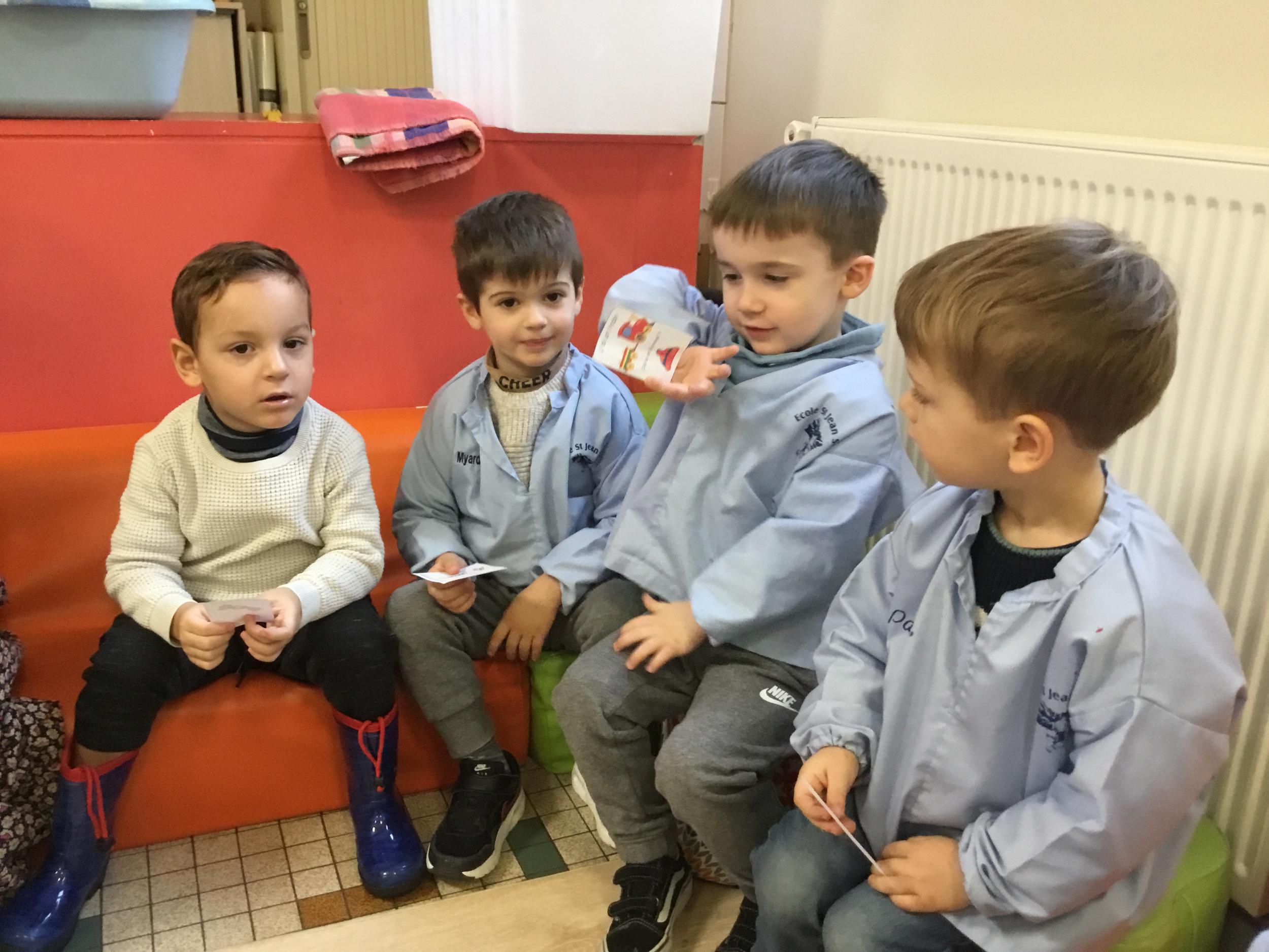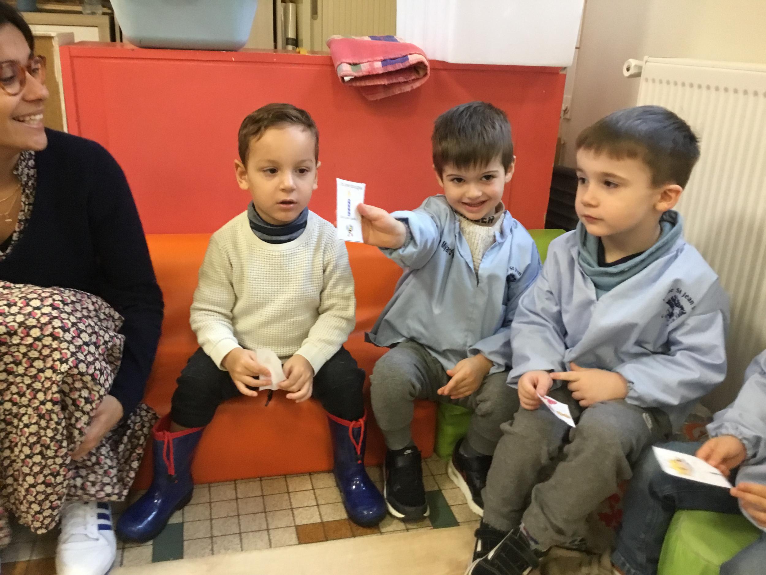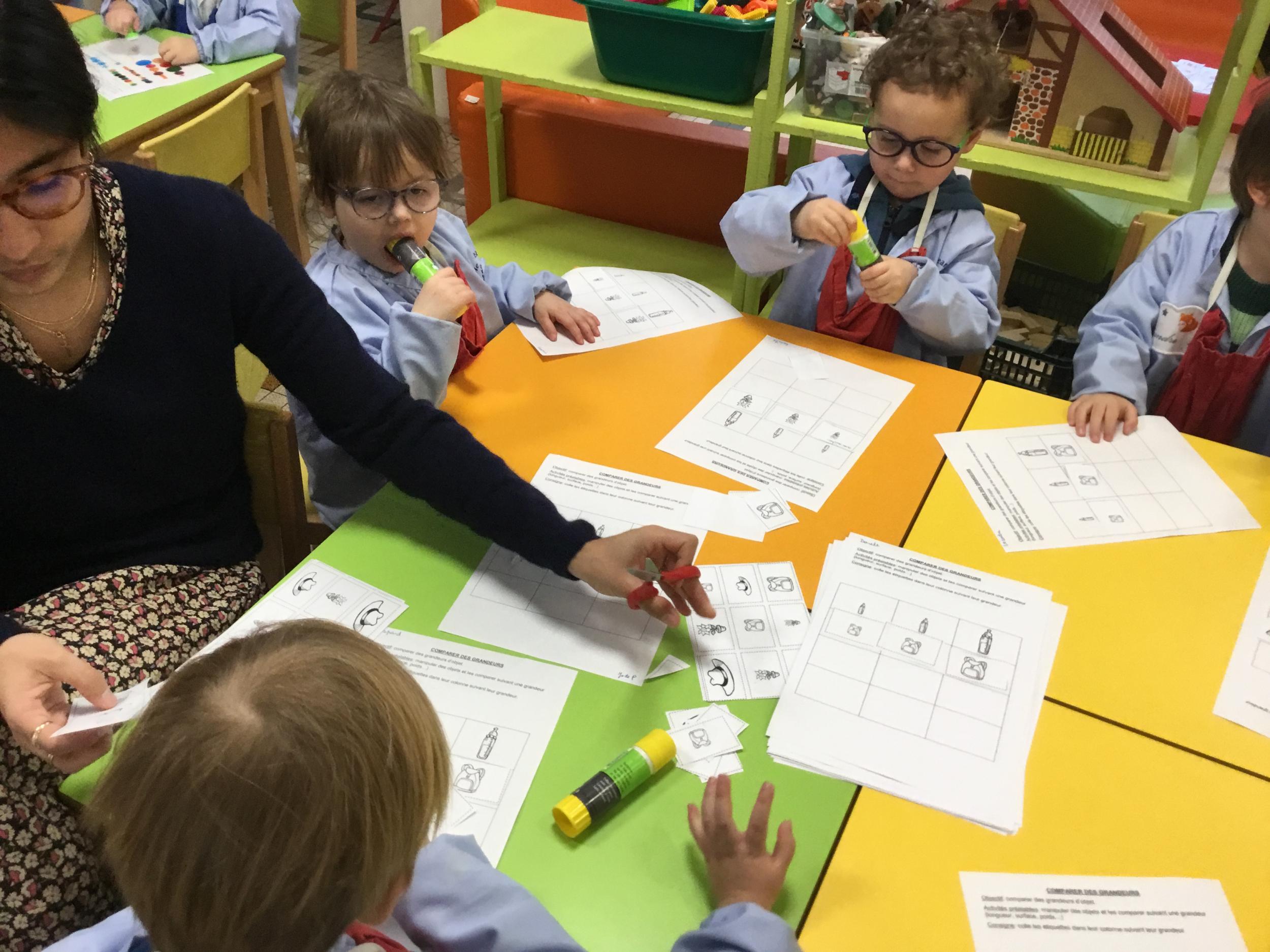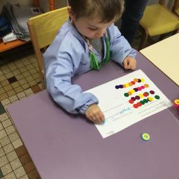 Les élèves ont réalisé une œuvre plastique en lien avec le trait horizontal et une œuvre de l’artiste Paul klee. En langage, ils ont joué à un jeu de cartes qui leur a permis de poser une question : j’ai …. Qui a…? Ils ont dû reconstituer la couverture du livre « Pas plus haut que trois pommes » à partir duquel nous avons travaillé sur la notion de « grand, petit et moyen »