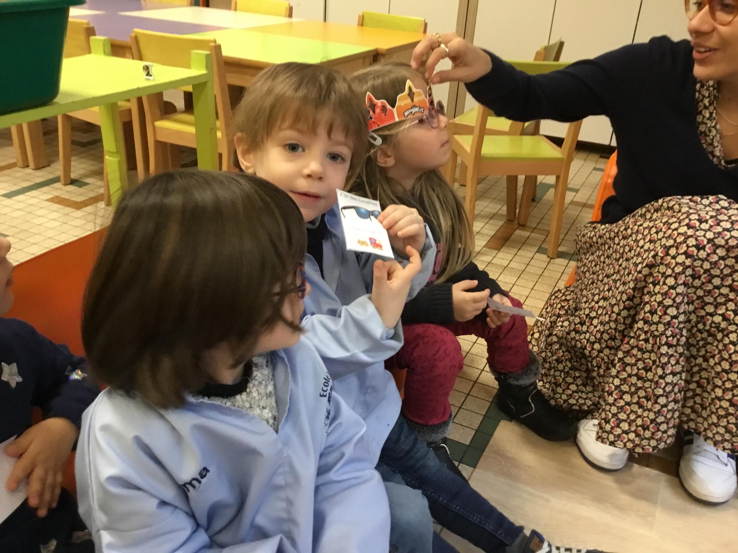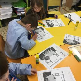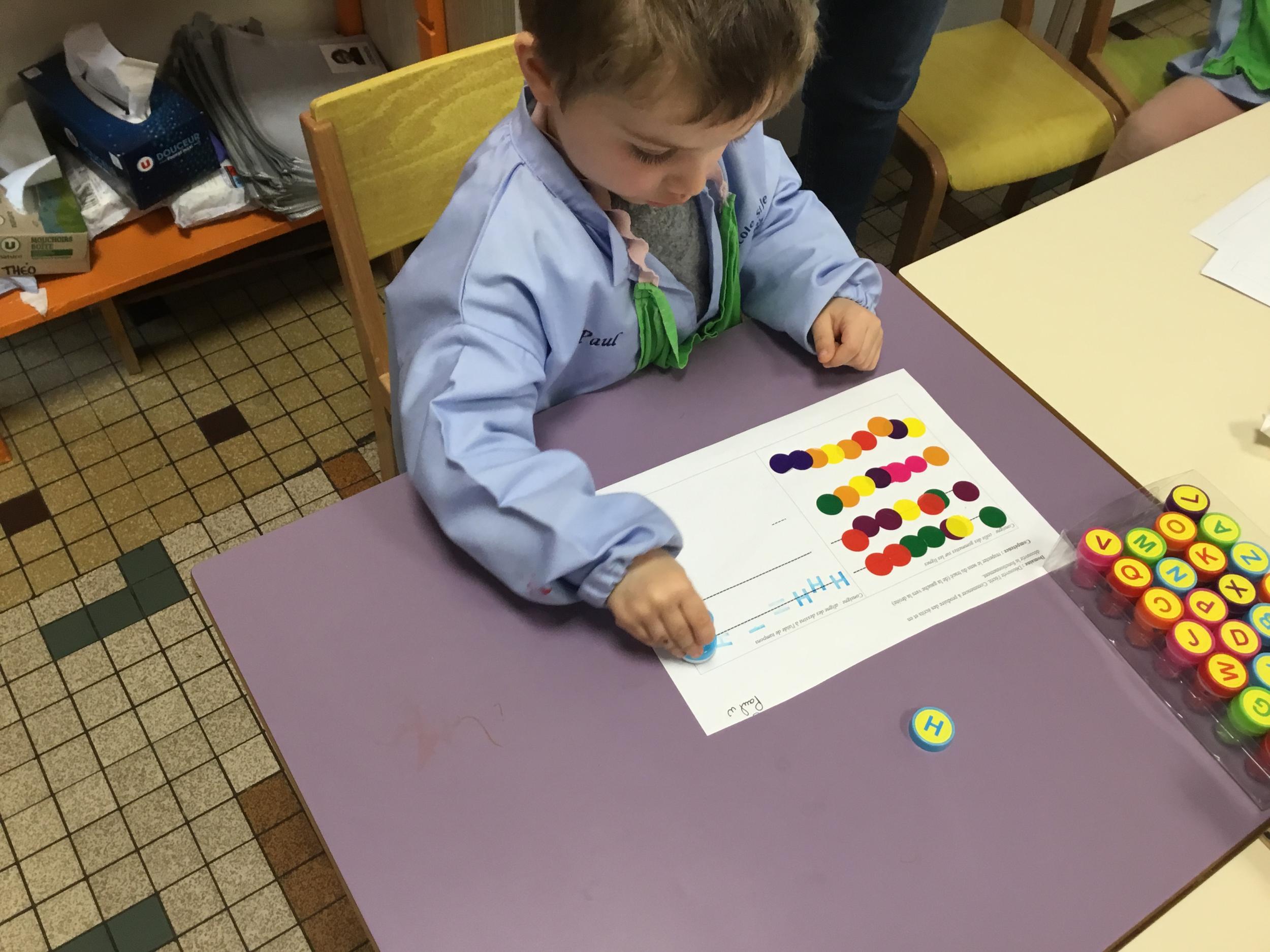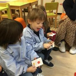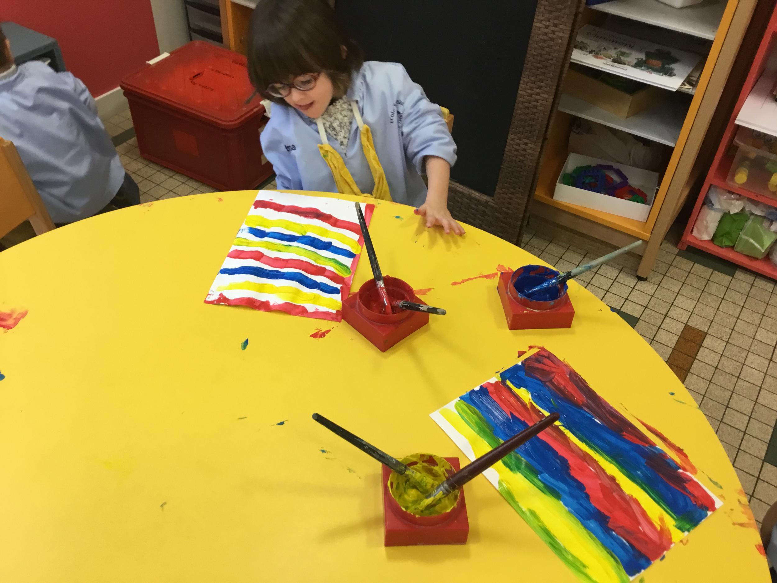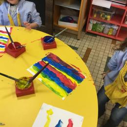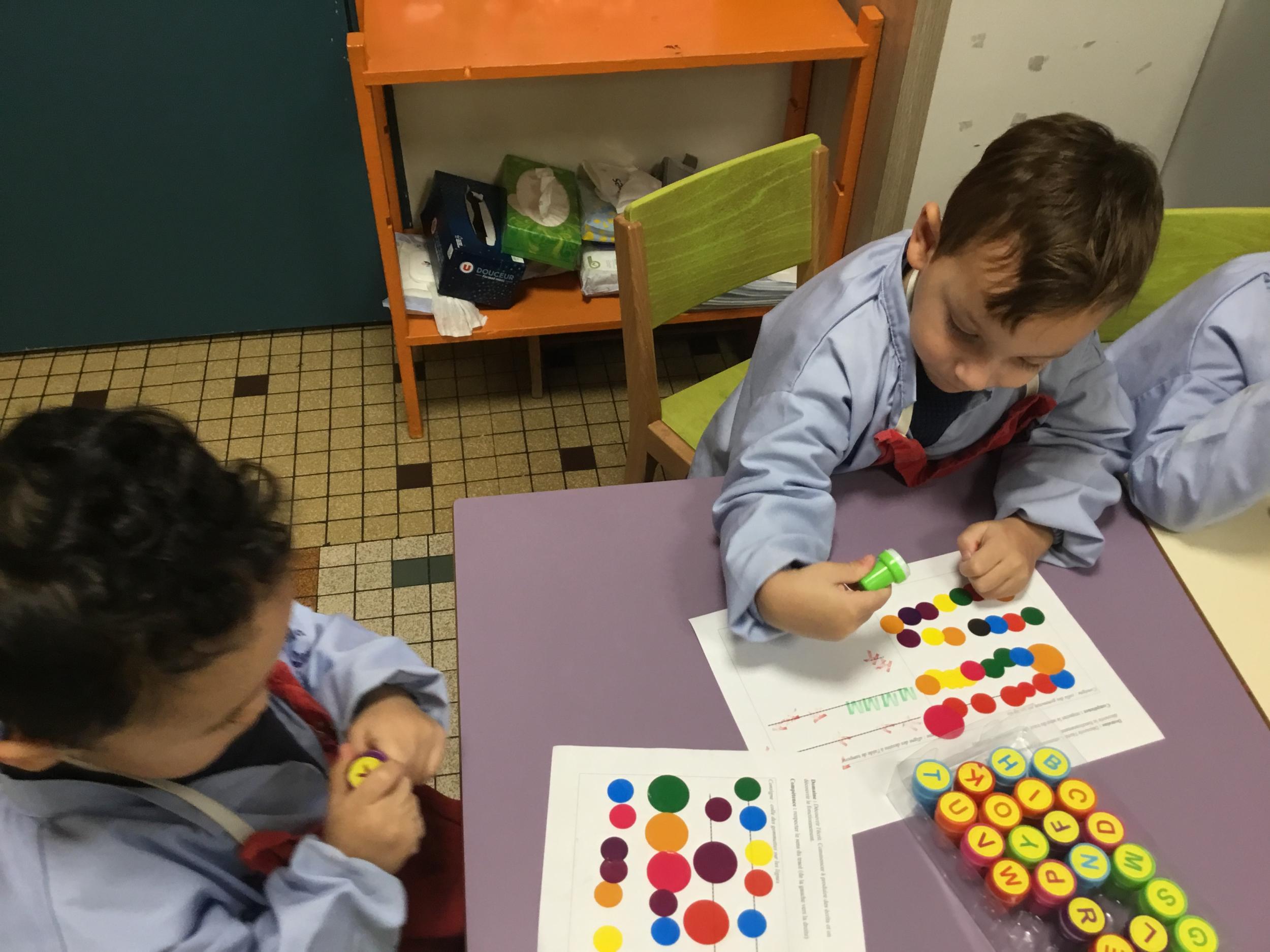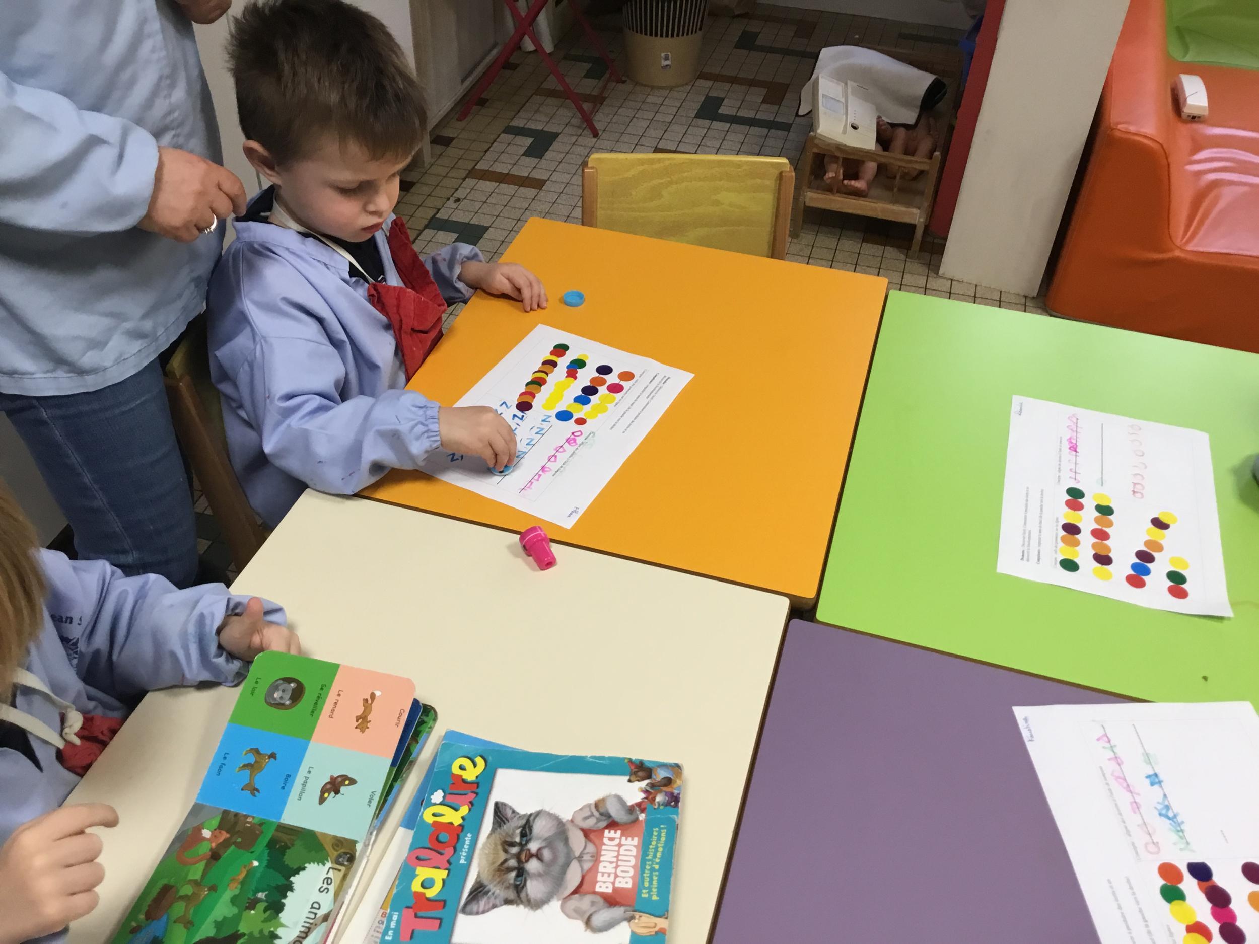 Les élèves ont réalisé une œuvre plastique en lien avec le trait horizontal et une œuvre de l’artiste Paul klee. En langage, ils ont joué à un jeu de cartes qui leur a permis de poser une question : j’ai …. Qui a…? Ils ont dû reconstituer la couverture du livre « Pas plus haut que trois pommes » à partir duquel nous avons travaillé sur la notion de « grand, petit et moyen »