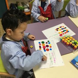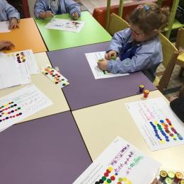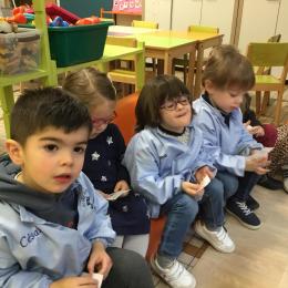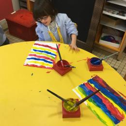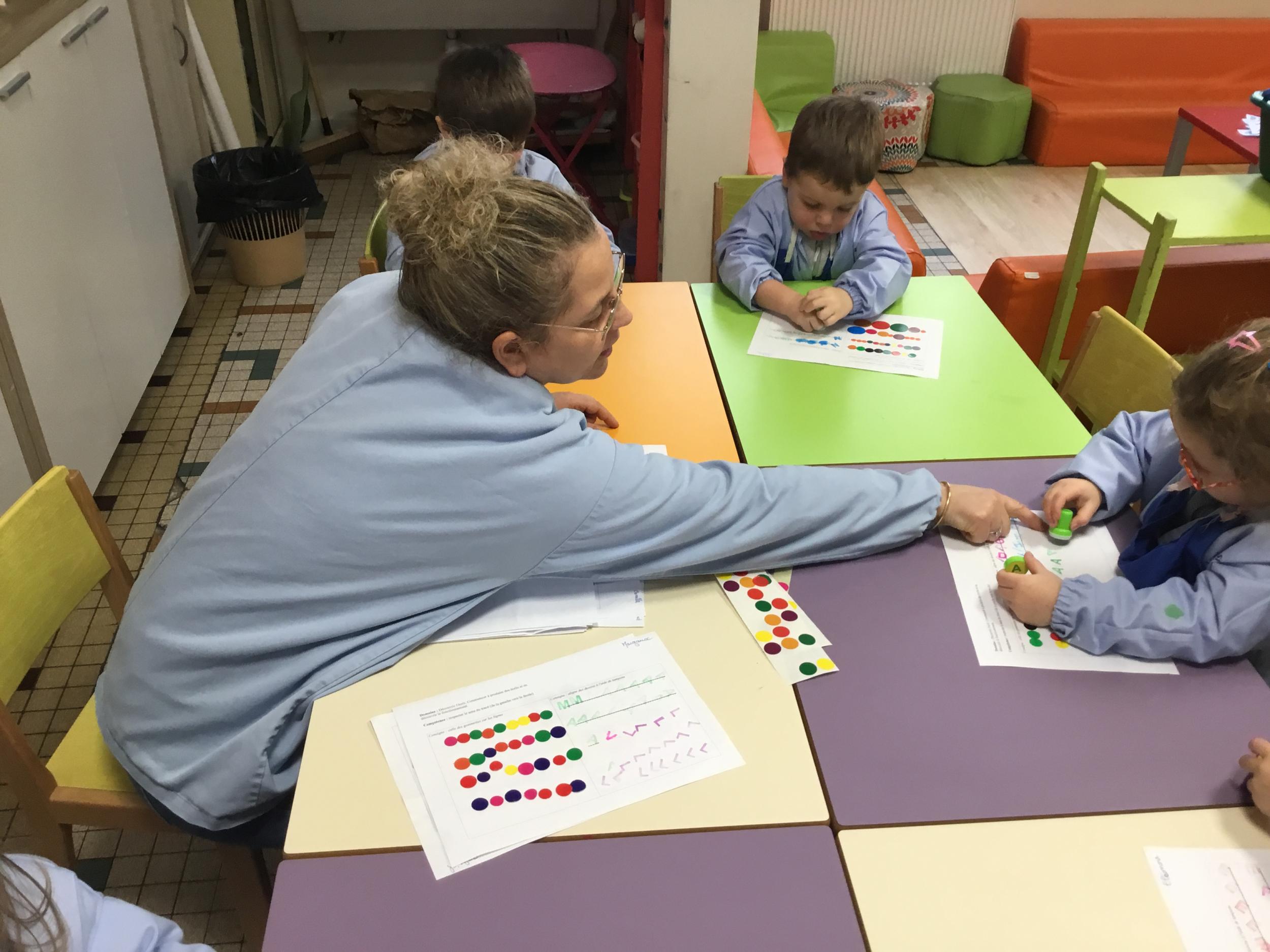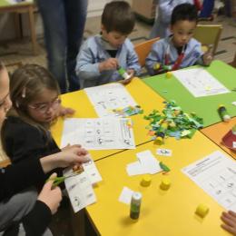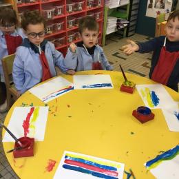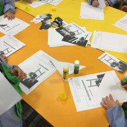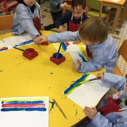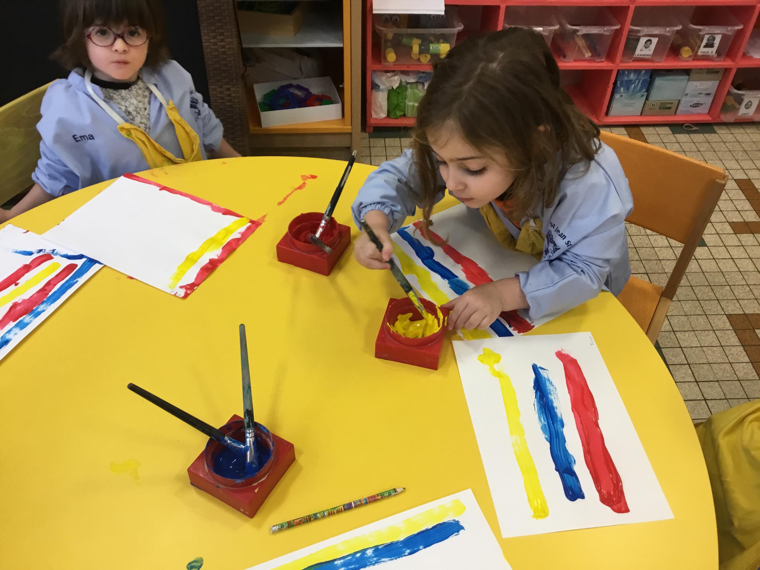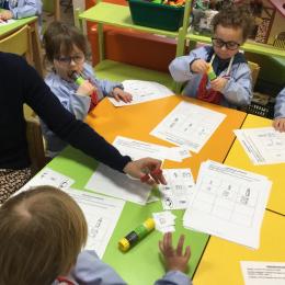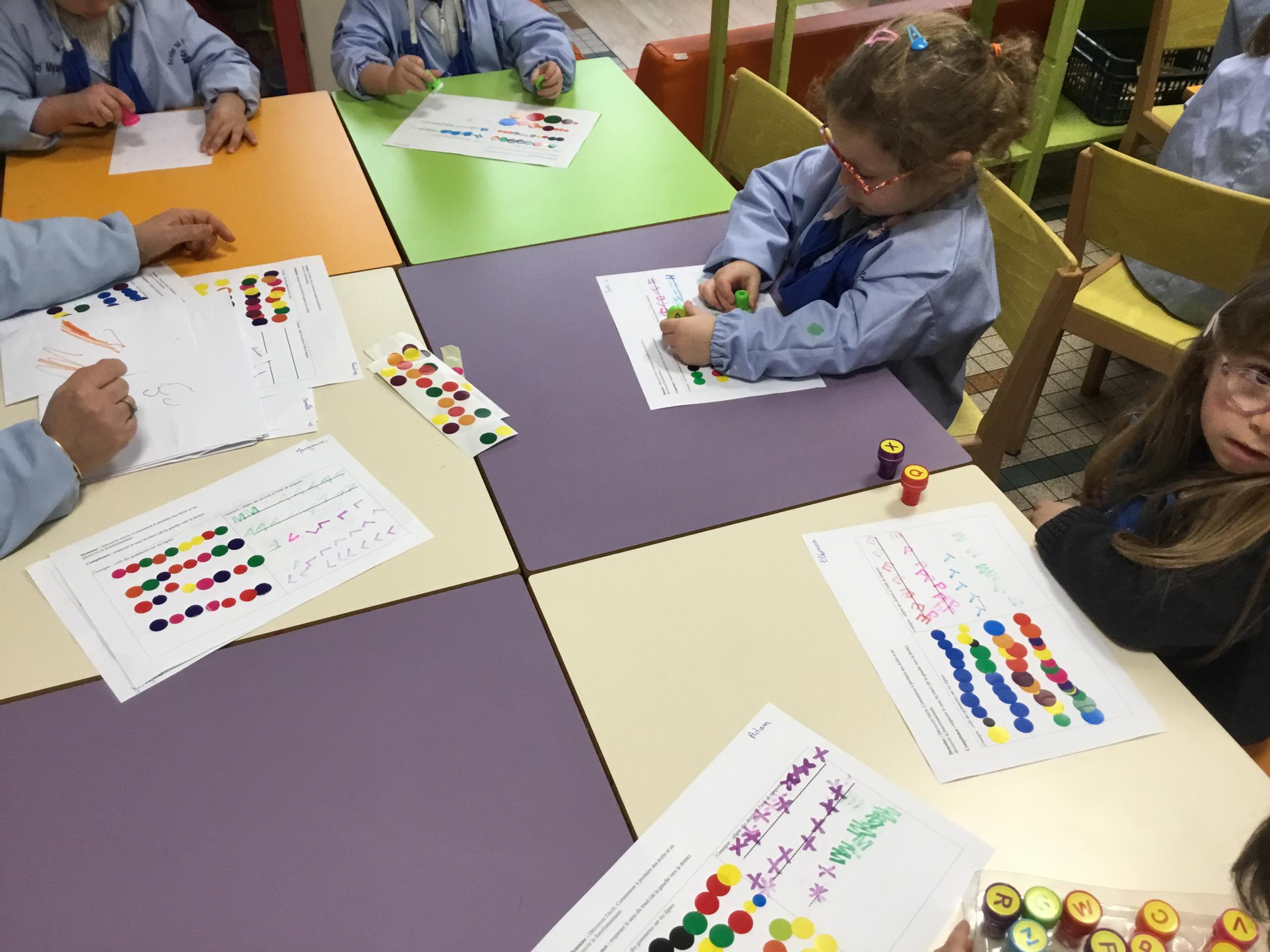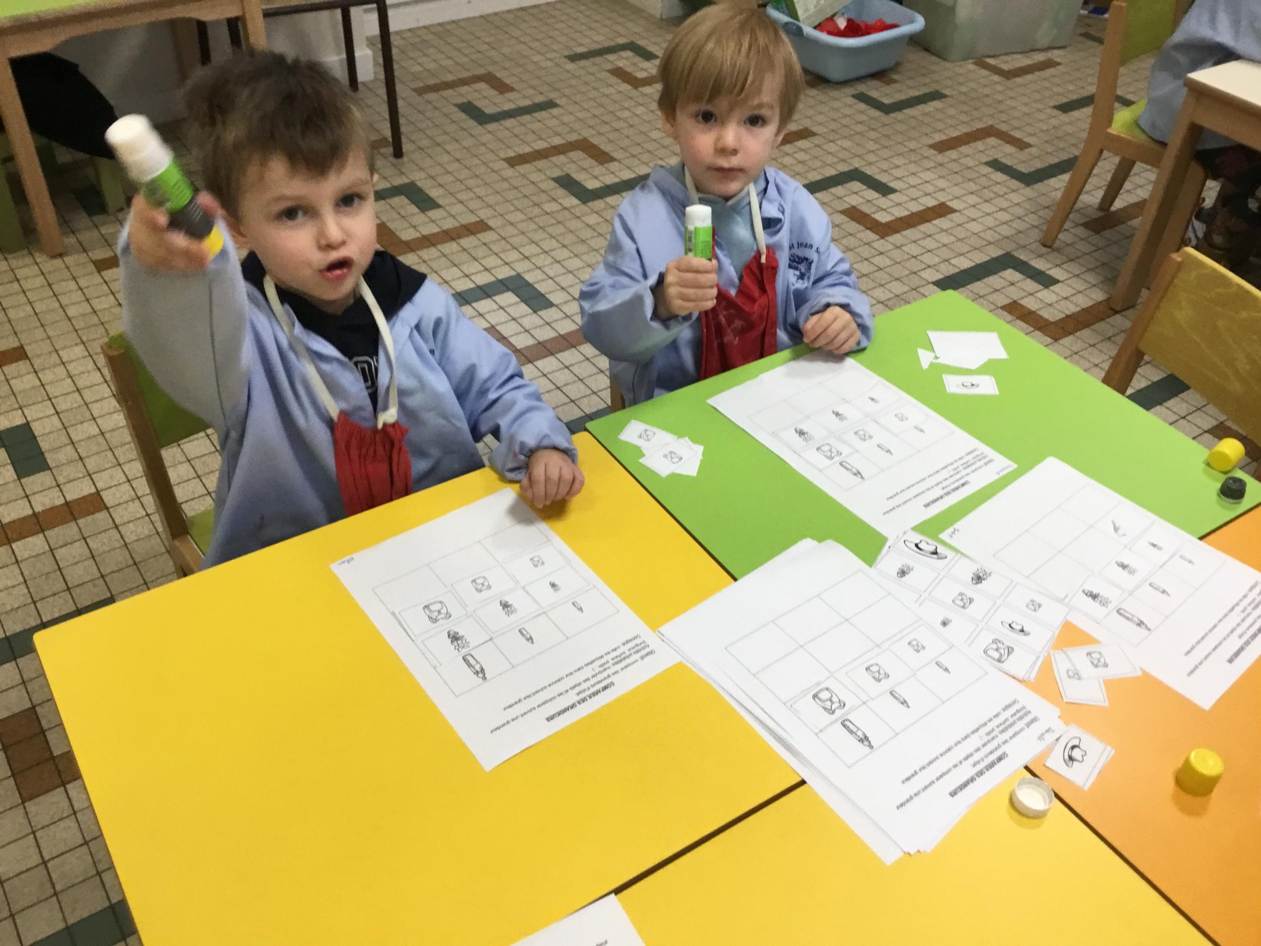 Les élèves ont réalisé une œuvre plastique en lien avec le trait horizontal et une œuvre de l’artiste Paul klee. En langage, ils ont joué à un jeu de cartes qui leur a permis de poser une question : j’ai …. Qui a…? Ils ont dû reconstituer la couverture du livre « Pas plus haut que trois pommes » à partir duquel nous avons travaillé sur la notion de « grand, petit et moyen »