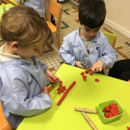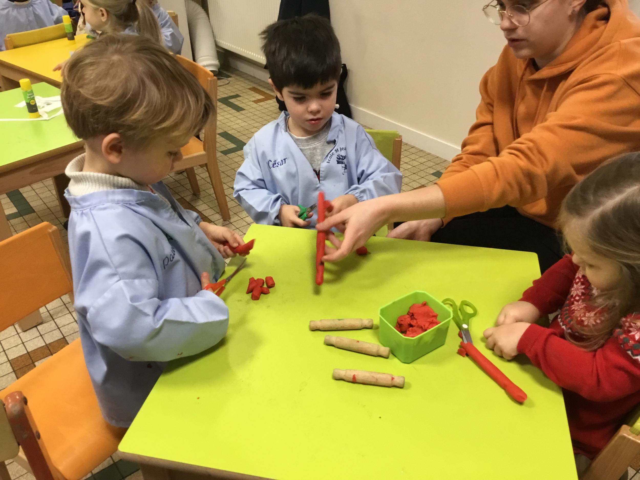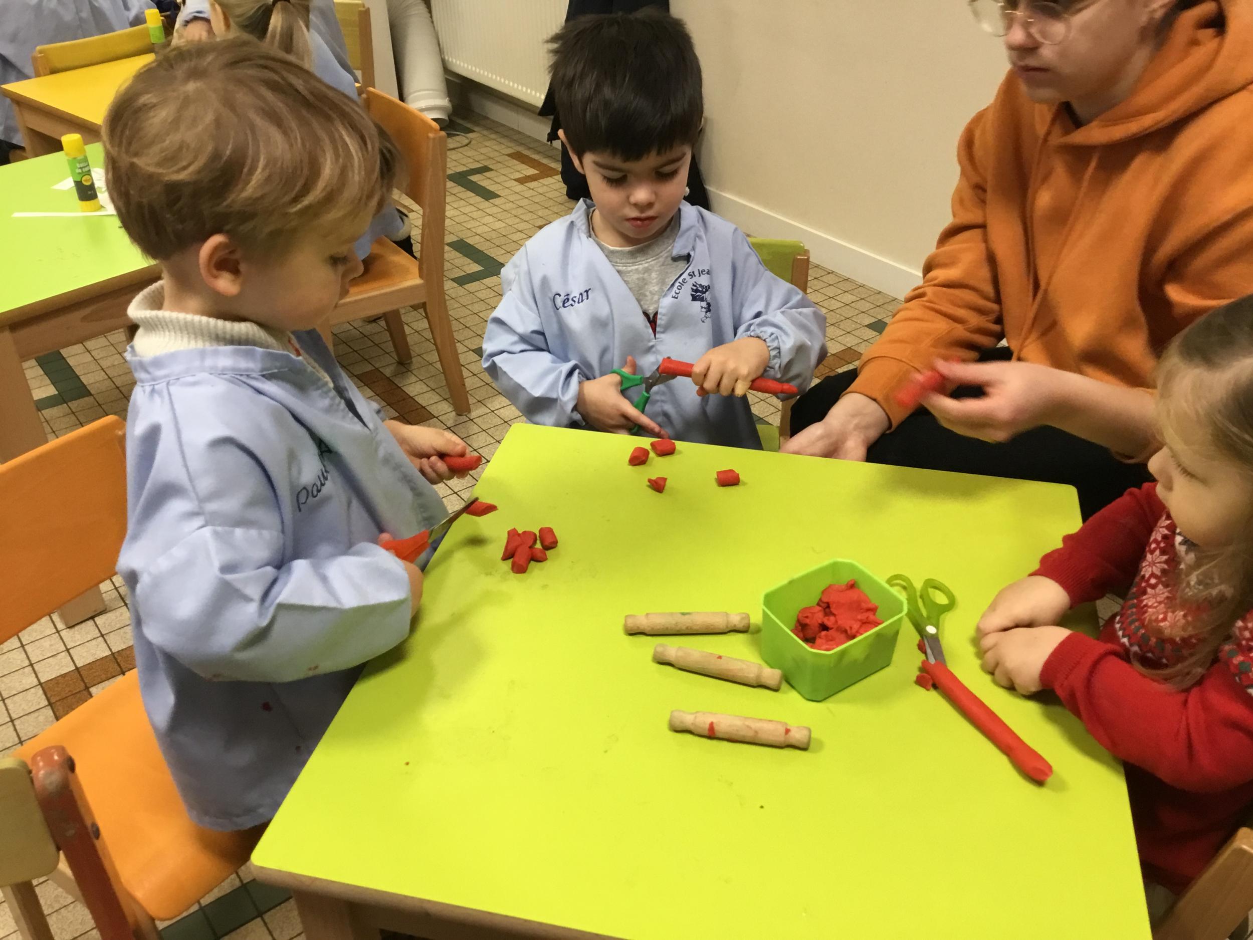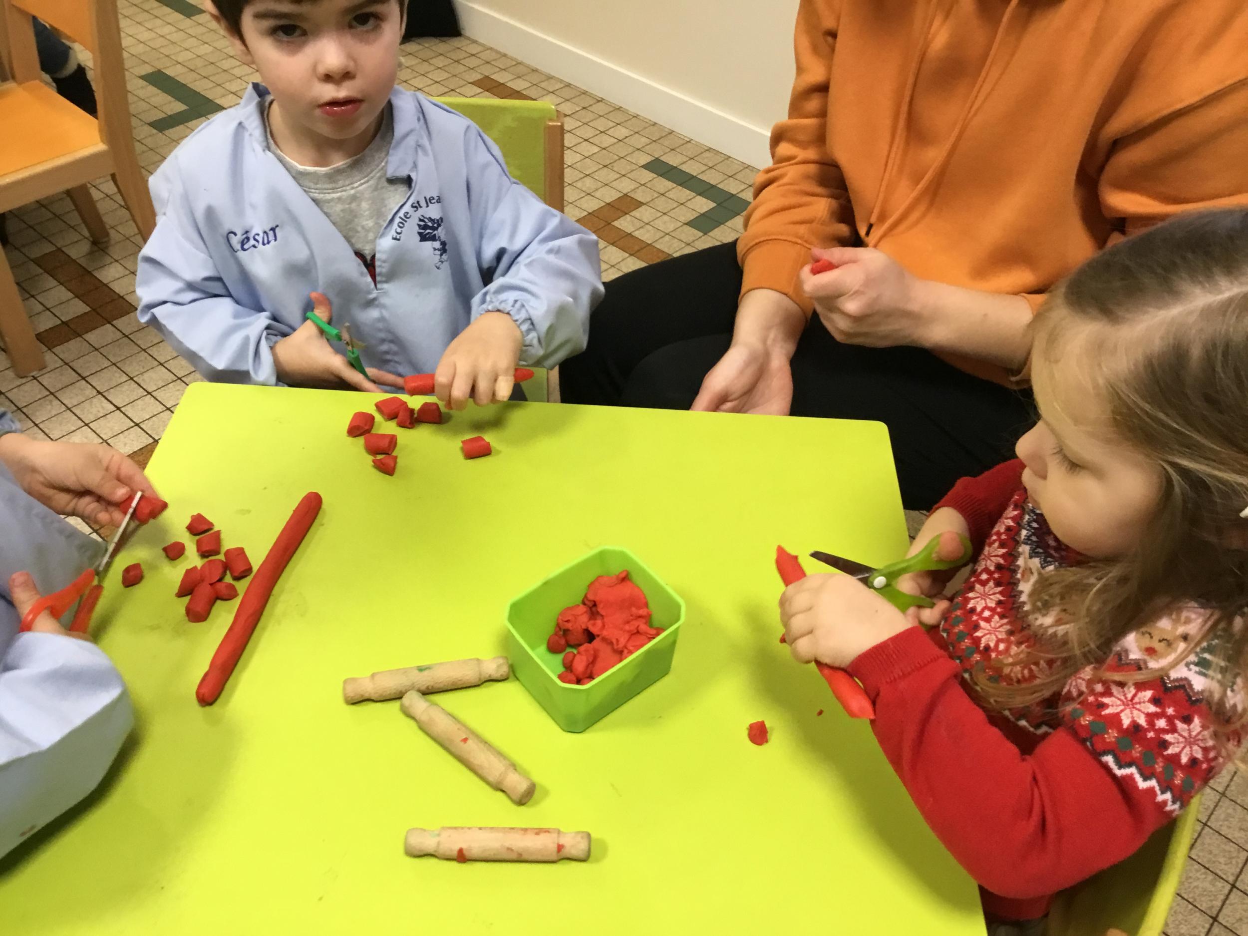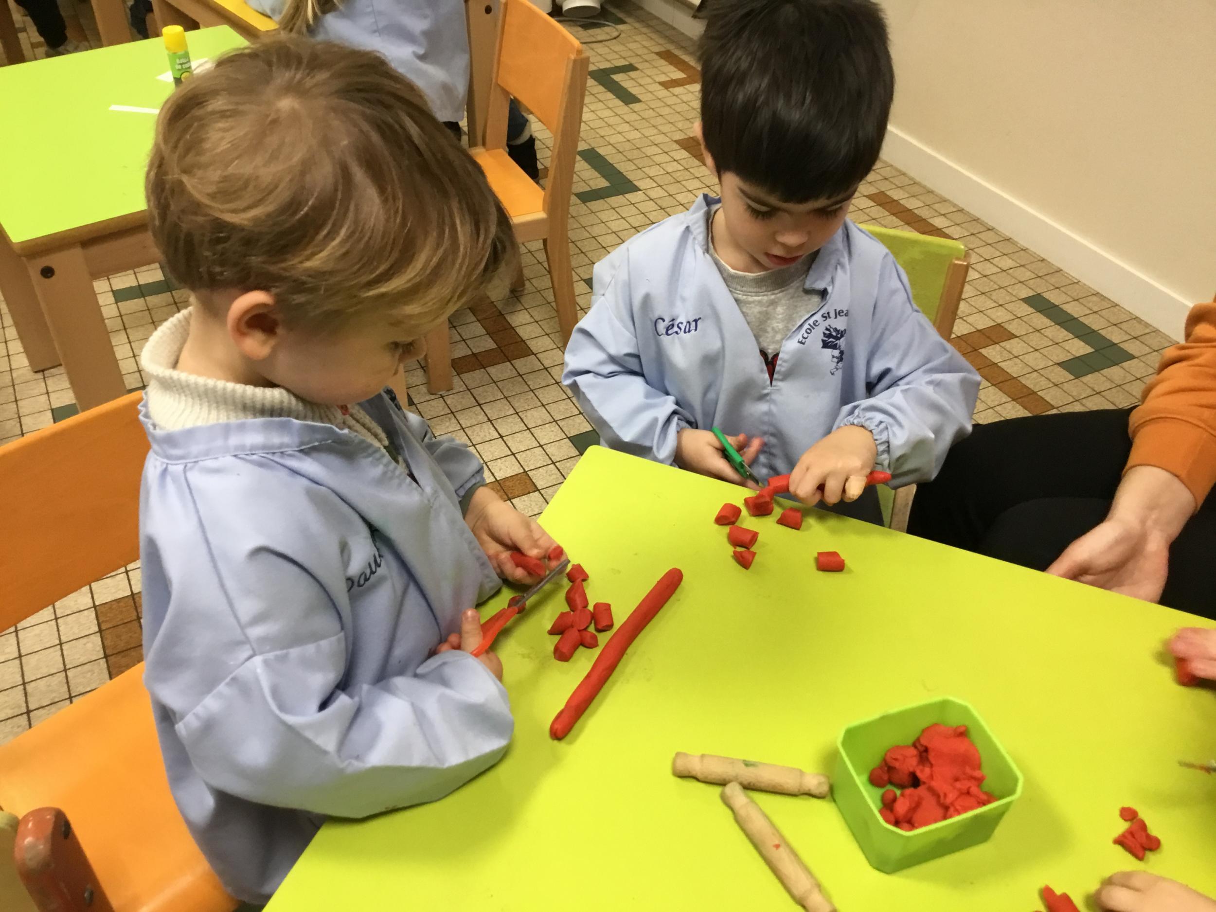 Petite et moyenne section 09/02/2023 Nous apprenons à bien tenir les ciseaux avec le découpage de colombins en pâte à modeler .